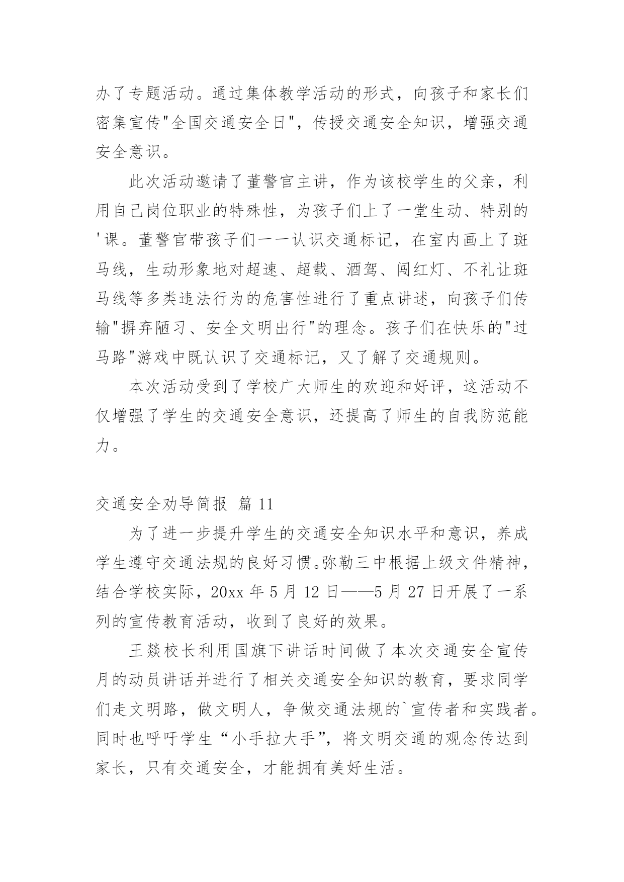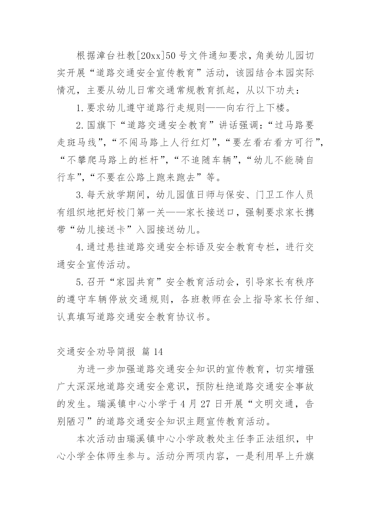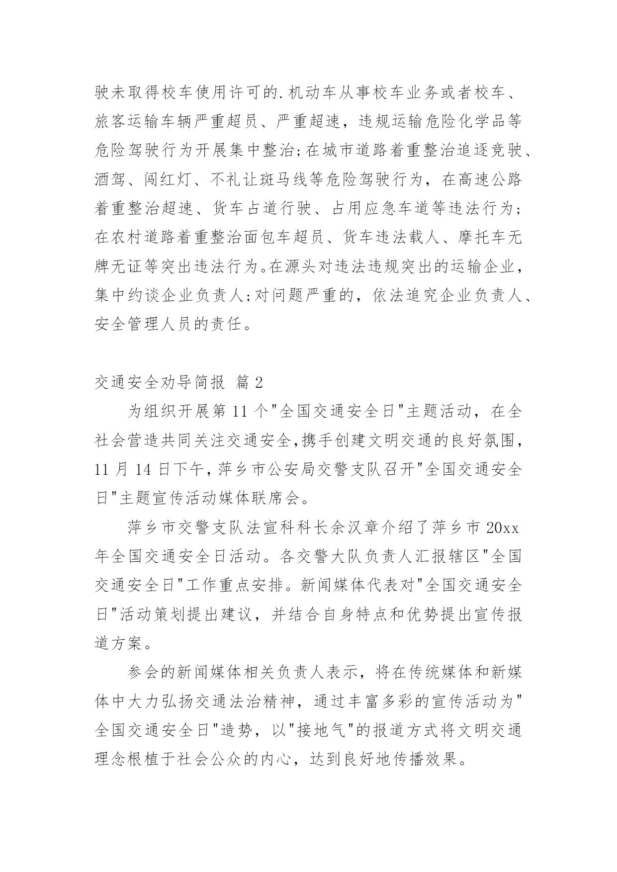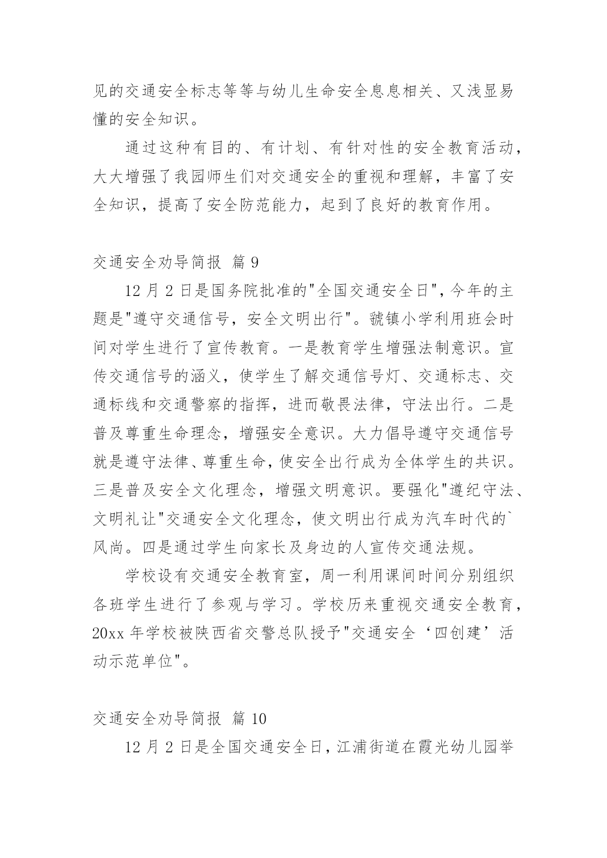 交通安全劝导简报在生活、工作和学习中,简报的使用频率呈上升趋势,简报一般都有固定的报头,包括简报的名称、期号、编发单位、发行日期、保密等级和编号。那要怎么写好简报呢?下面是小编精心整理的交通安全劝导简报范文,供大家参考借鉴,希望可以帮助到有需要的朋友。交通安全劝导简报篇1今年12月2日是我国第11个"全国交通安全日"。近日,公安部、中央文明办、教育部、司法部、交通运输部、国家安全生产监督管理总局联合下发方案,确定今年主题为"拒绝危险驾驶、安全文明出行",并将在全国开展相关活动。今年年初以来,成都女司机因"路怒"被打、占用应急车道延误伤者救治等涉及交通问题的社会事件相继发生,引发舆论热议。11月1日,《刑法修正案(九)》正式实施,将校车、旅客运输车辆严重超速、超员、非法运输危险化学品等严重危害公共安全的行为纳入危险驾驶罪。今年"全国交通安全日"将针对这些热点组织主题活动,进一步倡导通行规则意识、守法自律意识、社会责任意识、文明交通意识、公共道德意识,倡导抵制追逐竞驶、醉酒驾驶等构成危险驾驶罪的交通违法,抵制"路怒"、不礼让斑马线、占用应急车道等危险驾驶行为。根据方案要求,各地将进行联合部署,针对在道路上驾驶未取得校车使用许可的.机动车从事校车业务或者校车、旅客运输车辆严重超员、严重超速,违规运输危险化学品等危险驾驶行为开展集中整治;在城市道路着重整治追逐竞驶、酒驾、闯红灯、不礼让斑马线等危险驾驶行为,在高速公路着重整治超速、货车占道行驶、占用应急车道等违法行为;在农村道路着重整治面包车超员、货车违法载人、摩托车无牌无证等突出违法行为。在源头对违法违规突出的运输企业,集中约谈企业负责人;对问题严重的,依法追究企业负责人、安全管理人员的责任。交通安全劝导简报篇2为组织开展第11个"全国交通安全日"主题活动,在全社会营造共同关注交通安全,携手创建文明交通的良好氛围,11月14日下午,萍乡市公安局交警支队召开"全国交通安全日"主题宣传活动媒体联席会。萍乡市交警支队法宣科科长余汉章介绍了萍乡市20xx年全国交通安全日活动。各交警大队负责人汇报辖区"全国交通安全日"工作重点安排。新闻媒体代表对"全国交通安全日"活动策划提出建议,并结合自身特点和优势提出宣传报道方案。参会的新闻媒体相关负责人表示,将在传统媒体和新媒体中大力弘扬交通法治精神,通过丰富多彩的宣传活动为"全国交通安全日"造势,以"接地气"的报道方式将文明交通理念根植于社会公众的内心,达到良好地传播效果。每年的'"12.2"宣传都是公安交警部门的一项年度重点工作。交警支队相关负责人表示,今年将继承好传统,创造新形式,使20xx年全国交通安全日整体宣传声势更加宏大,覆盖面更广,策划更加周密,内容更加精良。交通安全劝导简报篇3为贯彻落实《关于转发20xx年辽宁省122"全国交通安全日"主题活动工作方案的通知》文件精神,紧密围绕"拒绝危险驾驶、安全文明出行"主题,朝阳市运输管理处开展122"全国交通安全日"主题活动,并制定活动方案。此次活动紧密结合《刑法修正案(九)》的有关内容实施,进一步倡导自觉抵制追逐竞驶、醉酒驾驶、客车严重超速、超员,拒绝开车打手机等危险驾驶行为,逐步形成良好的`文明交通社会风尚。活动包括三个方面的内容:一是大力开展主题教育宣传工作。结合"道路平安年"专项活动,加大驾校、企业安全驾驶培训力度,积极开展"文明交通"主题宣传,增强从业人员安全驾驶意识;二是集中开展冬季交通安全专项整治。市运输管理处将加大对营运车辆的动态监管,要求企业严格落实各项管理制度,对存在管理漏洞的企业要约谈其负责人,责令其加强管理;三是大力营造社会面宣传范围。各级运管机构和运输企业印制活动宣传标识、标语,充分利用客货站场大力宣传122"全国交通安全日"活动,传播文明交通正能量。交通安全劝导简报篇4为全面推动第11个"122全国交通安全日"宣传活动的开展,在全社会营造共同关注交通安全、携手创建文明交通的良好氛围,靖安县公安局交警大队结合今年"社会协同治理安全文明出行"主题深入中小学校开展形式多样的`宣传活动,取得较好成效。11月24日上午10时许,靖安县公安局交警大队法制科民警携带第11个"122全国交通安全日"宣传展板、课件、杂志等资料,联同靖安县电视台《法治靖安》节目记者一行深入靖安县第二小学,开展"122全国交通安全日"宣教活动。民警通过丰富多彩的LED显示屏公布主题、摆放宣传展板、课堂讲座、发放宣传杂志等形式,与学生们亲切互动,达到了良好的宣教效果。交通安全劝导简报篇5为扎实推进创建全国文明城市攻坚工作,近日,况场街道办事处组织交管办、安办、派出所、交警四中队、司法所对辖区内的来往车辆进行了交通安全大排查。主要以排查非法营运、超载车辆及无证驾驶为重点内容,共检查车辆13辆,其中摩托车7辆,