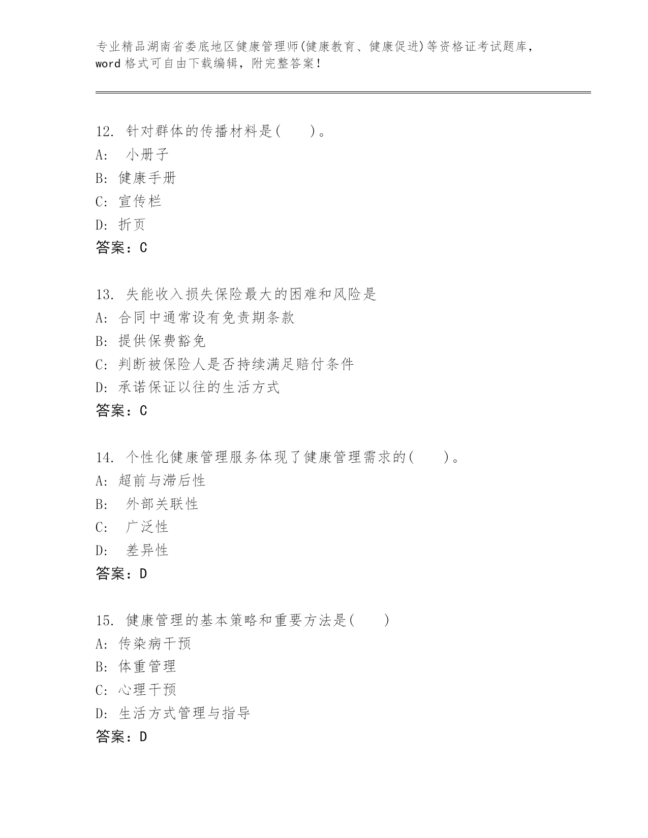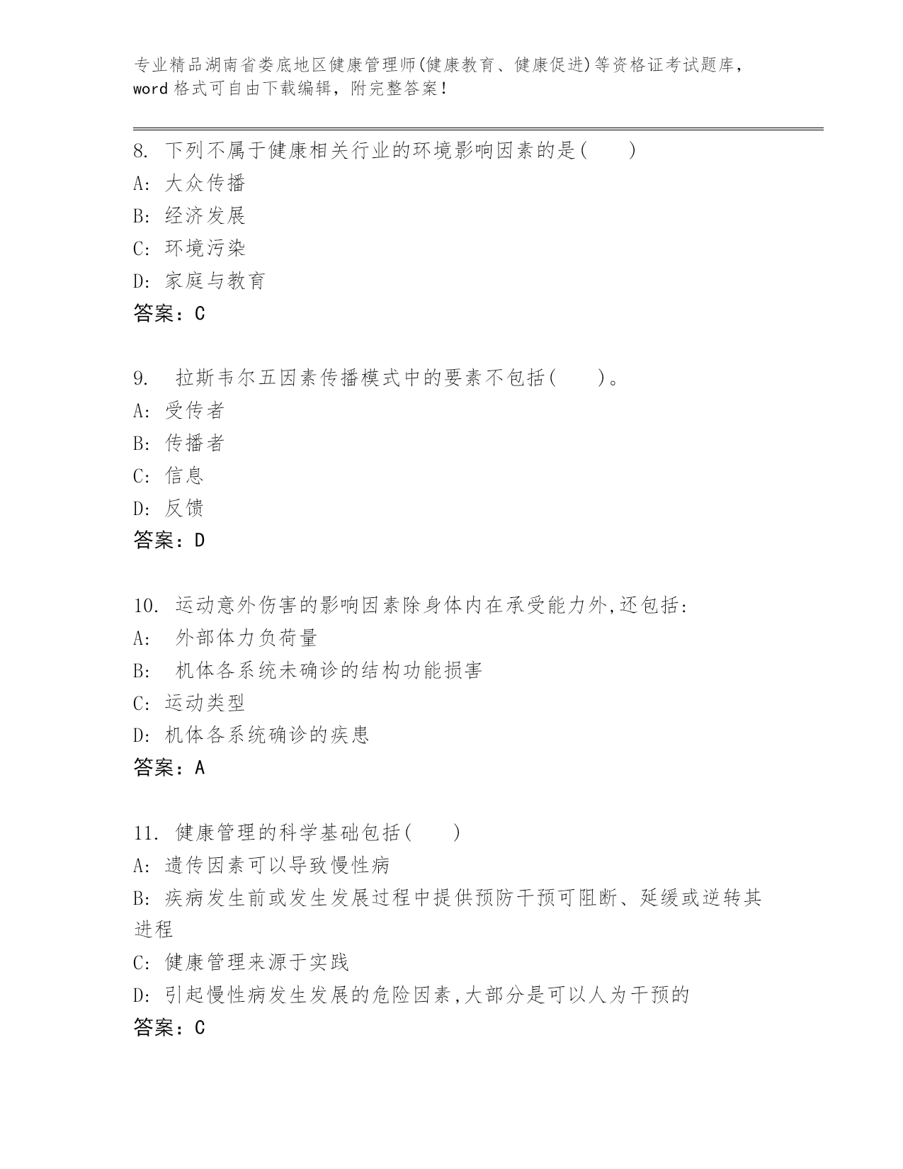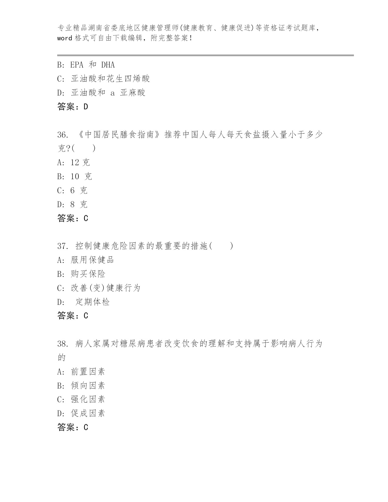 湖南省娄底地区健康管理师(健康教育、健康促进)等资格证考试真题参考答案