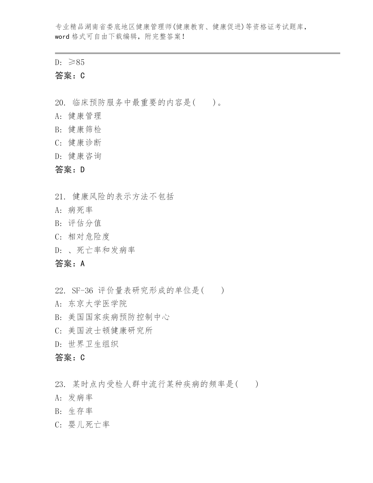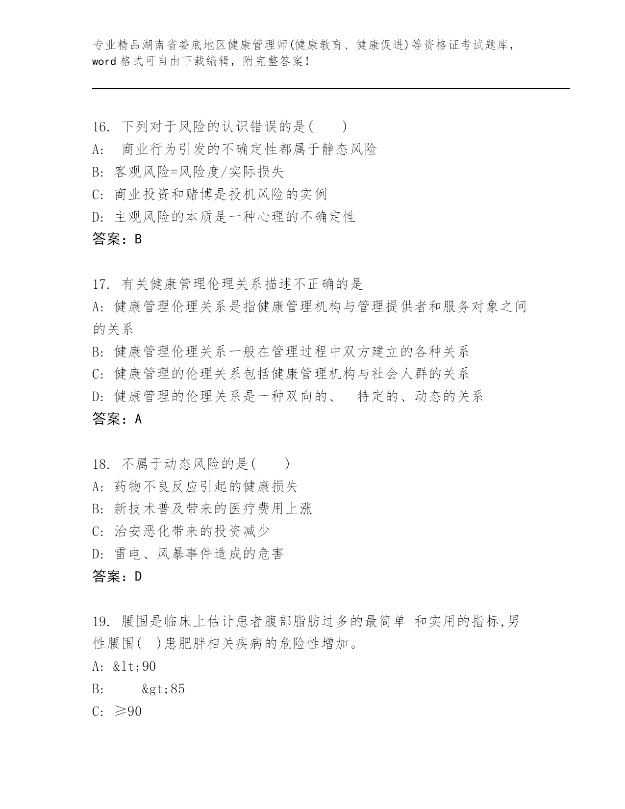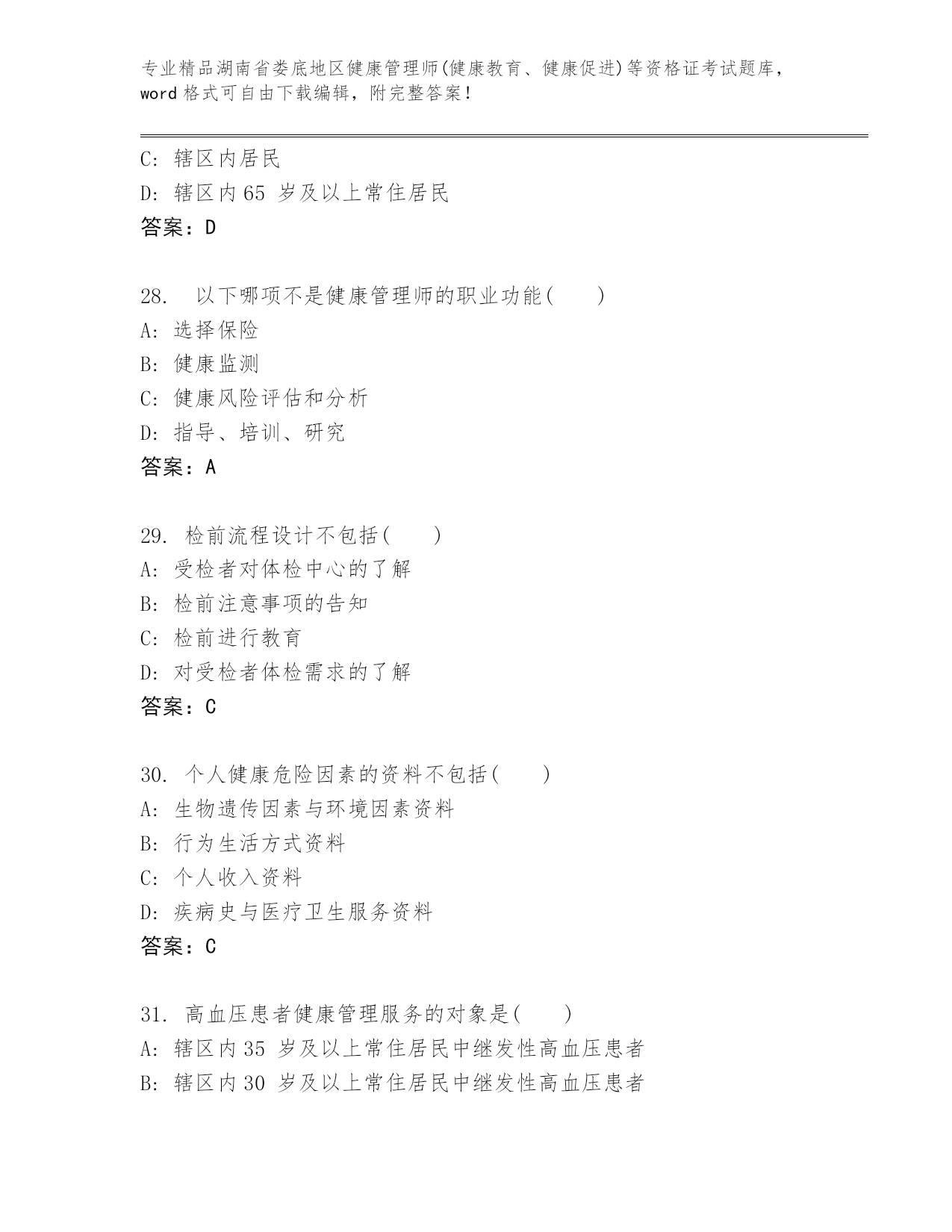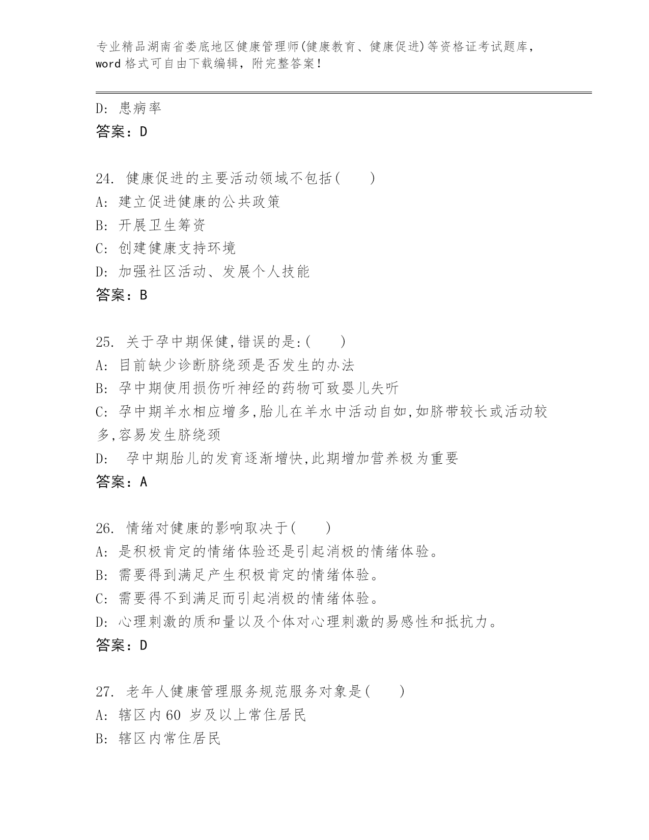 湖南省娄底地区健康管理师(健康教育、健康促进)等资格证考试真题参考答案