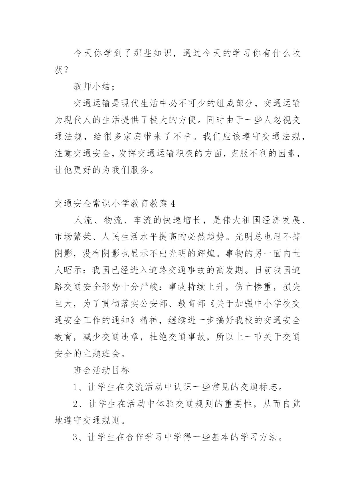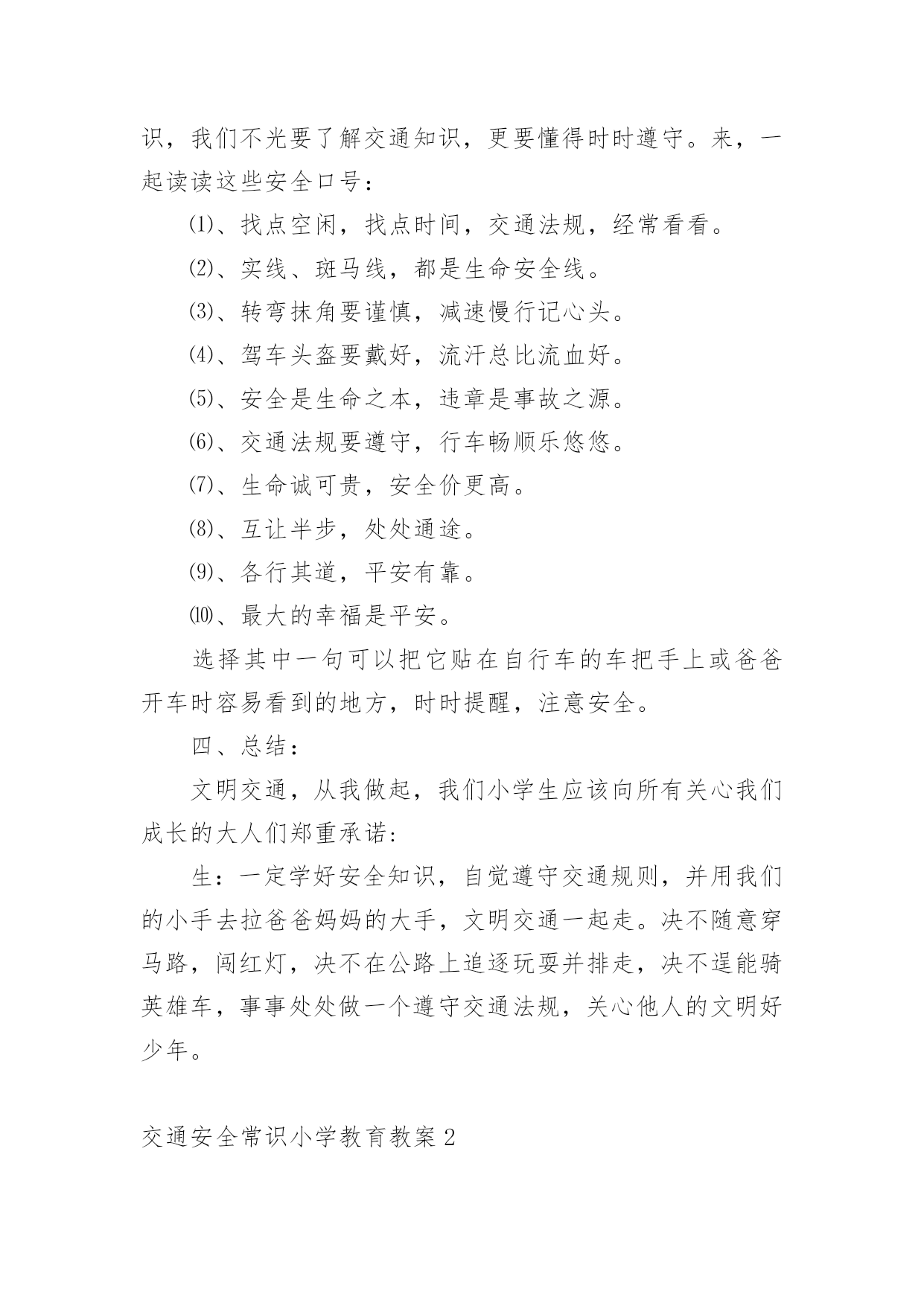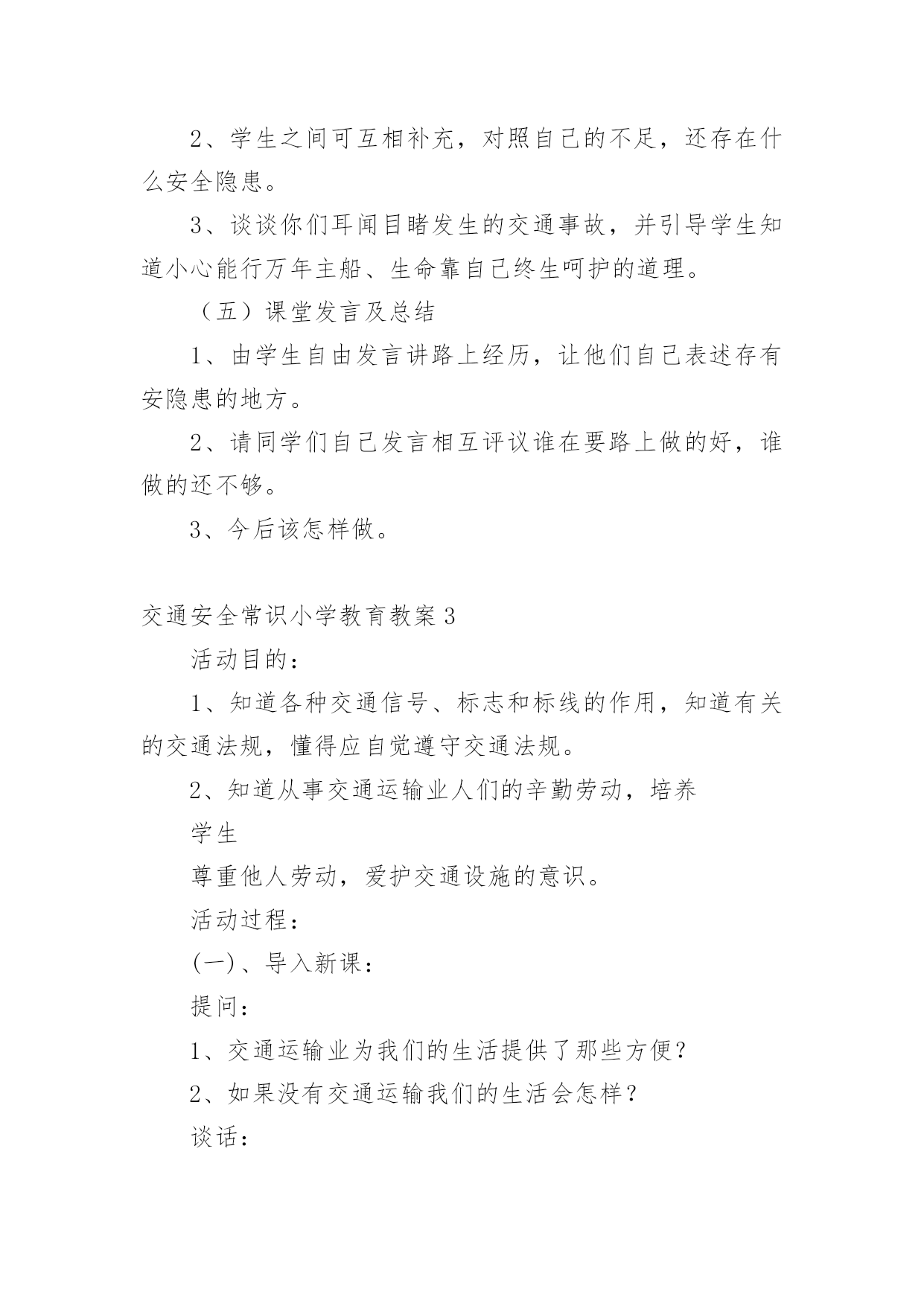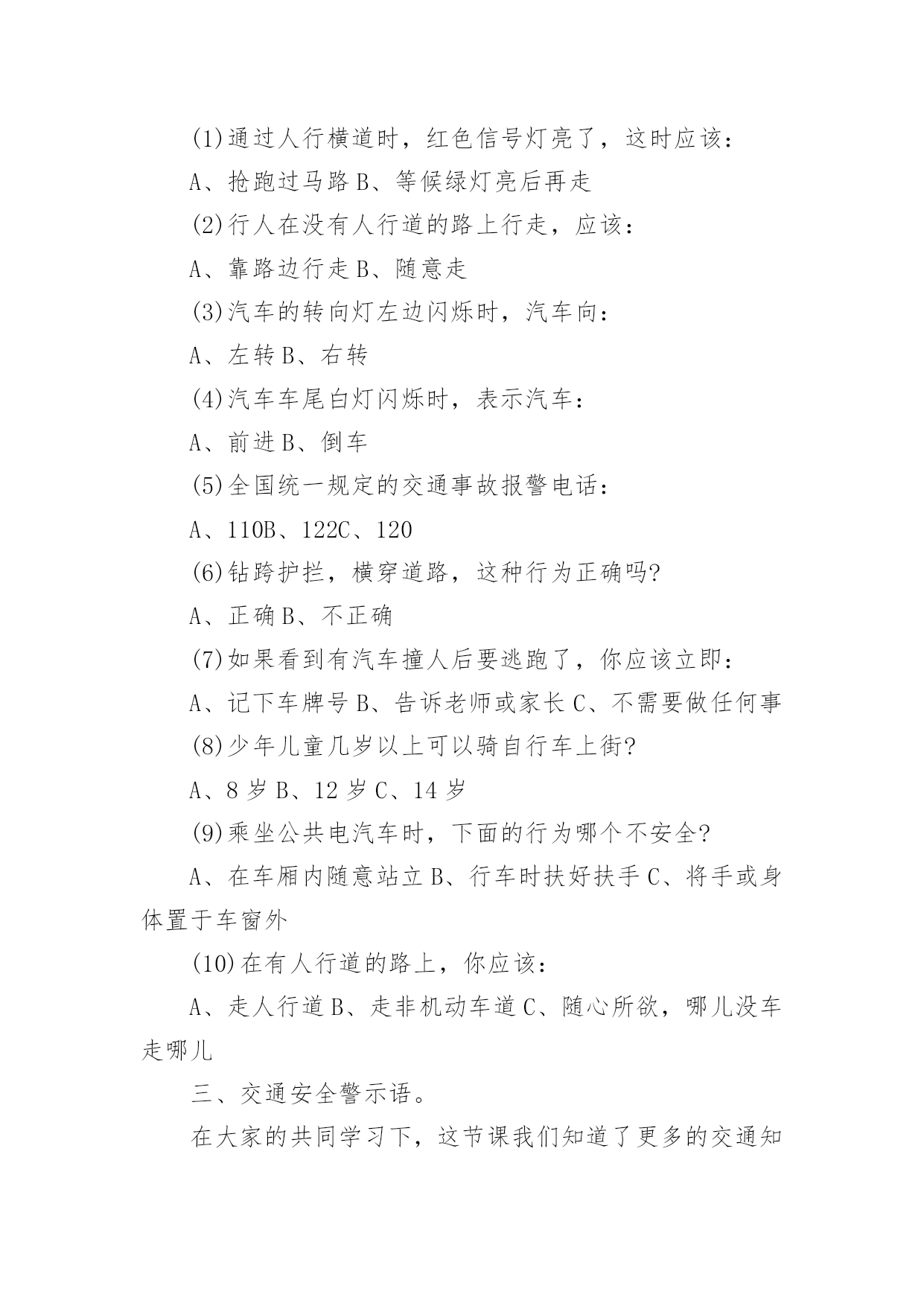 交通安全常识小学教育教案在教学工作者实际的教学活动中,常常要根据教学需要编写教案,借助教案可以让教学工作更科学化。写教案需要注意哪些格式呢?下面是小编为大家整理的交通安全常识小学教育教案,供大家参考借鉴,希望可以帮助到有需要的朋友。交通安全常识小学教育教案1教学目标:1、通过读新闻,看录像等方式引起学生对安全的重视。2、认知走路,骑自行车,乘车安全知识,并逐步养成自觉遵守交通规则的好习惯。3、知道安全交通的小常识4、让学生遵守安全,并向家人和朋友宣传交通安全教学过程:一、认识文明交通的重要性。1、教师导言:2、看图像3、看了刚才图像上的画面,想想,引发这些交通事故的原因是什么?4、再深究一下,为什么会违反?5、学生交流讨论:我们生活中有哪些交通不安全隐患呢?那么,如何降低交通事故对我们的危害呢?这就是我们今天学习的主题:保护生命安全出行二、学习交通小知识1、以小组为单位展开竞赛:说说走路,骑自行车,乘车安全知识。骑自行车九不准一、不在机动车道内骑自行车.二、自行车不逆向行驶.三、骑自行车时不带人.四、骑自行车不闯红灯.五、骑自行车不撑伞.六、骑自行车不攀扶其它车辆.七、骑自行车不双手离把.八、未满12周岁不骑车上路.九、骑自行车不突然强行猛拐交通安全五不坐1、不坐超载的机动车。2、不坐无牌无证、报废的'机动车。3、不坐非法营运机动车。4、不坐未经检验合格的机动车。5、不坐货运车辆、农用车辆、拖拉机2、交通安全三要:横过公路要一停二看三通过。3、认识交通标志,明白图标的含义。4、通过知识抢答,增强意识(1)通过人行横道时,红色信号灯亮了,这时应该:A、抢跑过马路B、等候绿灯亮后再走(2)行人在没有人行道的路上行走,应该:A、靠路边行走B、随意走(3)汽车的转向灯左边闪烁时,汽车向:A、左转B、右转(4)汽车车尾白灯闪烁时,表示汽车:A、前进B、倒车(5)全国统一规定的交通事故报警电话:A、110B、122C、120(6)钻跨护拦,横穿道路,这种行为正确吗?A、正确B、不正确(7)如果看到有汽车撞人后要逃跑了,你应该立即:A、记下车牌号B、告诉老师或家长C、不需要做任何事(8)少年儿童几岁以上可以骑自行车上街?A、8岁B、12岁C、14岁(9)乘坐公共电汽车时,下面的行为哪个不安全?A、在车厢内随意站立B、行车时扶好扶手C、将手或身体置于车窗外(10)在有人行道的路上,你应该:A、走人行道B、走非机动车道C、随心所欲,哪儿没车走哪儿三、交通安全警示语。在大家的共同学习下,这节课我们知道了更多的交通知识,我们不光要了解交通知识,更要懂得时时遵守。来,一起读读这些安全口号:⑴、找点空闲,找点时间,交通法规,经常看看。⑵、实线、斑马线,都是生命安全线。⑶、转弯抹角要谨慎,减速慢行记心头。⑷、驾车头盔要戴好,流汗总比流血好。⑸、安全是生命之本,违章是事故之源。⑹、交通法规要遵守,行车畅顺乐悠悠。⑺、生命诚可贵,安全价更高。⑻、互让半步,处处通途。⑼、各行其道,平安有靠。⑽、最大的幸福是平安。选择其中一句可以把它贴在自行车的车把手上或爸爸开车时容易看到的地方,时时提醒,注意安全。四、总结:文明交通,从我做起,我们小学生应该向所有关心我们成长的大人们郑重承诺:生:一定学好安全知识,自觉遵守交通规则,并用我们的小手去拉爸爸妈妈的大手,文明交通一起走。决不随意穿马路,闯红灯,决不在公路上追逐玩耍并排走,决不逞能骑英雄车,事事处处做一个遵守交通法规,关心他人的文明好少年。交通安全常识小学教育教案2教学目的1、通过学习使学生知道什么是道路交通,理解遵守道路交通意义和重要性,明确每个人都要牢固的树立安全意识;明白一个人的安全每天都是从零开始的。2、通过学习在日常生活中能以实际行动遵守交通规则,做安全的小使者。教学过程(一)上学放学路上。教师语:同学们你们每天上学、放学都要走马路;都有要经过“十字”路口和“三叉”路口,当你行进是都是否留心和注意过往的车辆;是否用心观察地形呢?下面就这个问题谈谈在日常生中应注意什么。(二)在路上要注意的问题。1、道路行驶要靠右行,都要配戴小黄帽,不能随心所欲忽左忽右,走路要眼看前方,排纵队,不能互相并排行走,更不能在路上追路、嬉戏。2、不能追逐车辆或向车上投掷物品,如:石子、泥团、饮料瓶等,不能随便搭乘过往的`车辆。3、回赤米坑小组的同学除了走公路外,还要沿河走2千米的山路,山路内侧靠山、外侧沿河,路面宽约2.5米,偶尔有运木头小型农用车、摩托车行使。所以家住赤米坑的林翠萍、王丽君等同学要特别小心,除了用眼外还要用耳,弯道处要先听再行,没有听到车声都要靠山边行走,雨天必须要派人来学校接。4、通过“十字”路口或“三叉”路口的同学,每次都要高度的警惕一定要做到“四个环节”即:一停、二看、三想、四通过。5、带领全班同学到校门