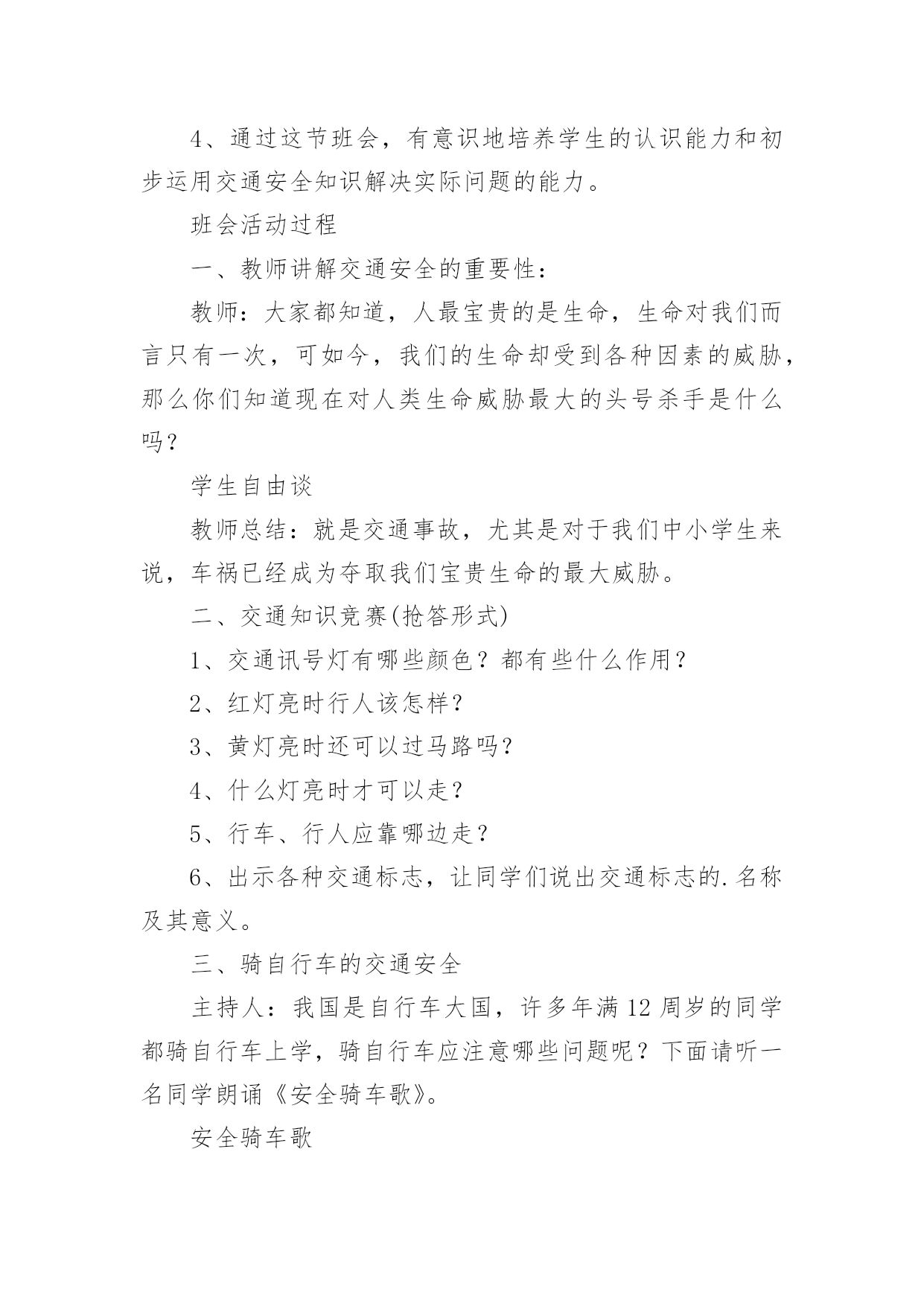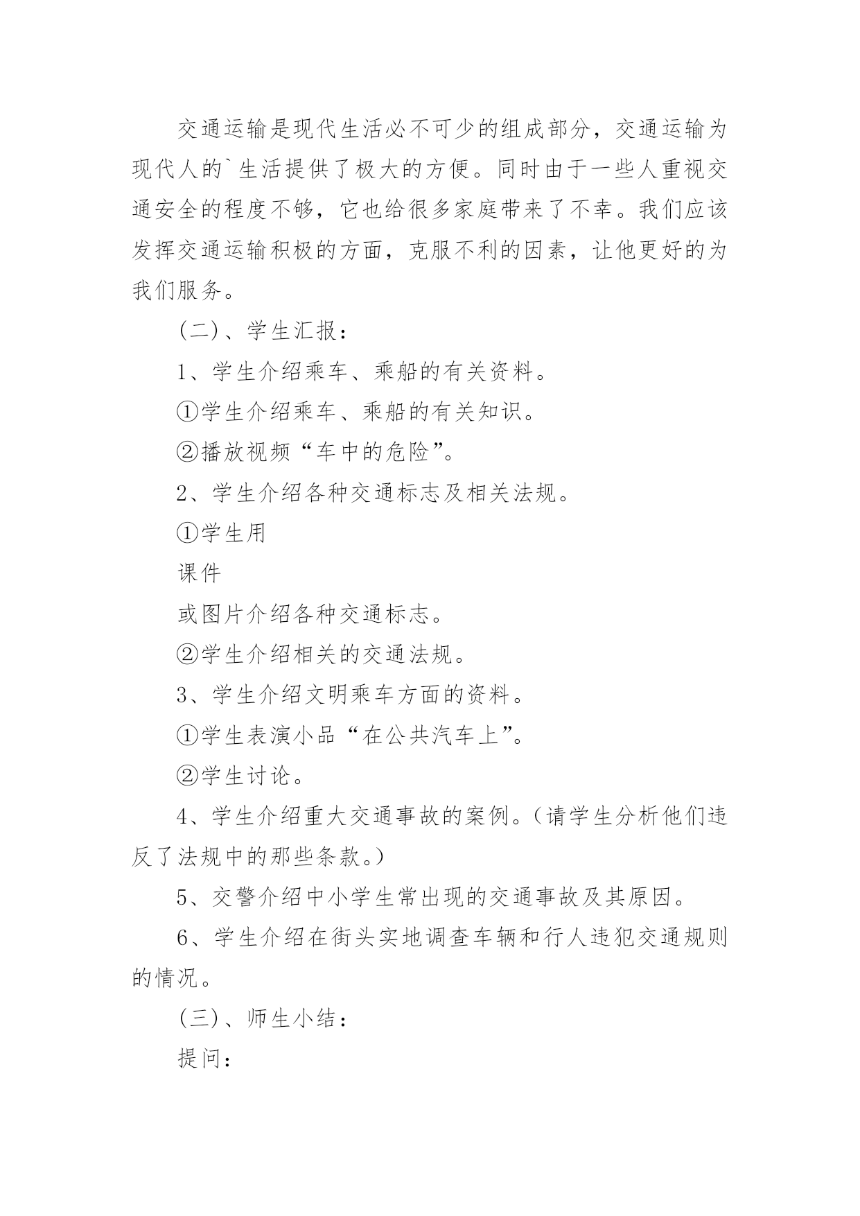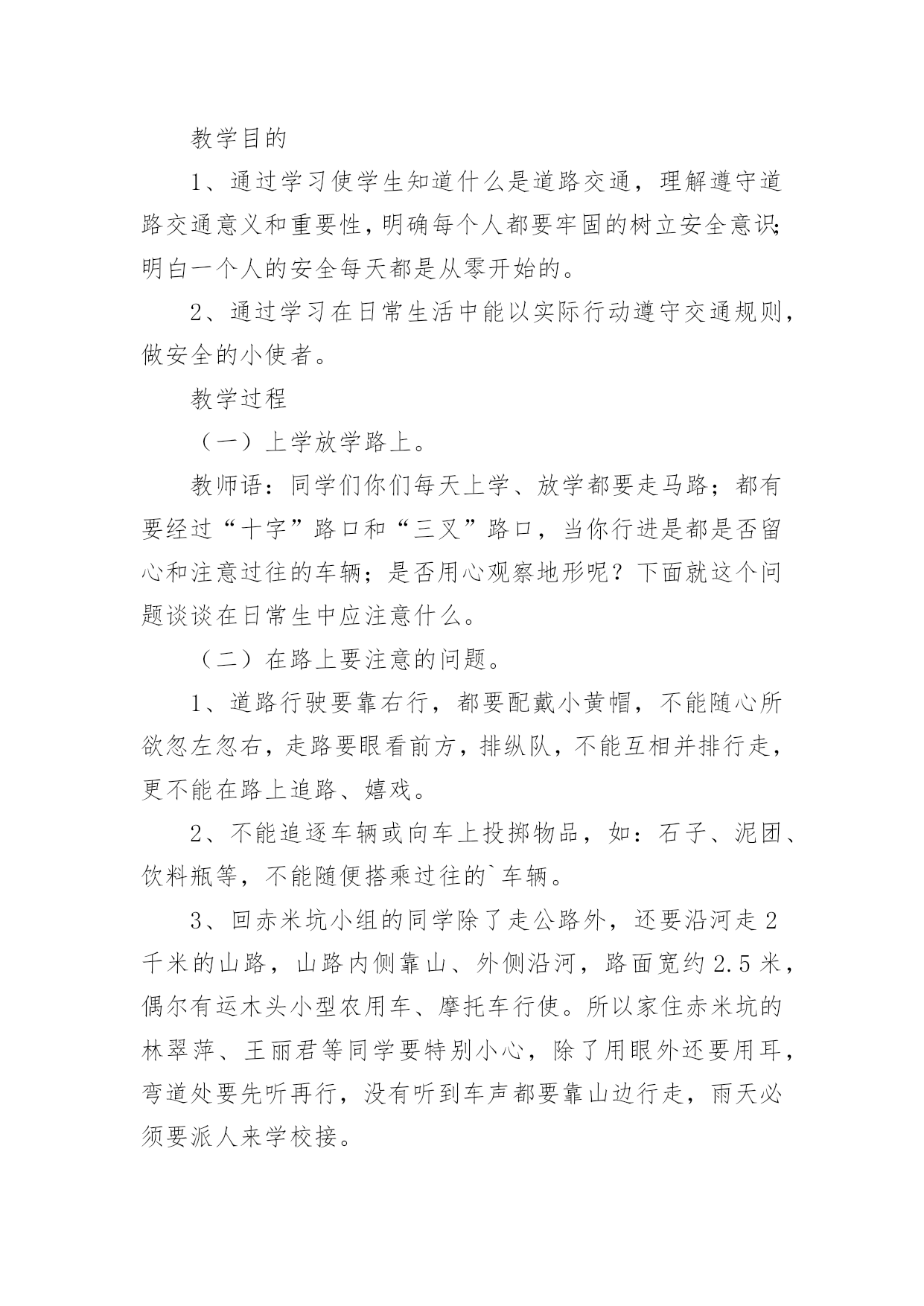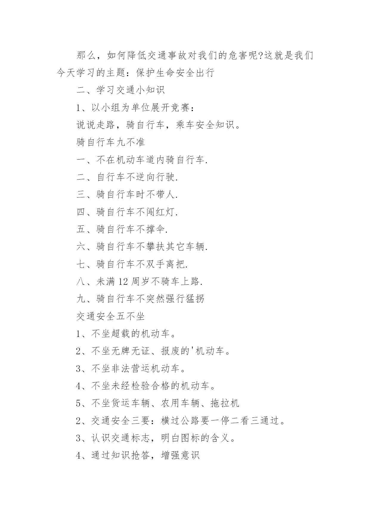 交通安全常识小学教育教案在教学工作者实际的教学活动中,常常要根据教学需要编写教案,借助教案可以让教学工作更科学化。写教案需要注意哪些格式呢?下面是小编为大家整理的交通安全常识小学教育教案,供大家参考借鉴,希望可以帮助到有需要的朋友。交通安全常识小学教育教案1教学目标:1、通过读新闻,看录像等方式引起学生对安全的重视。2、认知走路,骑自行车,乘车安全知识,并逐步养成自觉遵守交通规则的好习惯。3、知道安全交通的小常识4、让学生遵守安全,并向家人和朋友宣传交通安全教学过程:一、认识文明交通的重要性。1、教师导言:2、看图像3、看了刚才图像上的画面,想想,引发这些交通事故的原因是什么?4、再深究一下,为什么会违反?5、学生交流讨论:我们生活中有哪些交通不安全隐患呢?那么,如何降低交通事故对我们的危害呢?这就是我们今天学习的主题:保护生命安全出行二、学习交通小知识1、以小组为单位展开竞赛:说说走路,骑自行车,乘车安全知识。骑自行车九不准一、不在机动车道内骑自行车.二、自行车不逆向行驶.三、骑自行车时不带人.四、骑自行车不闯红灯.五、骑自行车不撑伞.六、骑自行车不攀扶其它车辆.七、骑自行车不双手离把.八、未满12周岁不骑车上路.九、骑自行车不突然强行猛拐交通安全五不坐1、不坐超载的机动车。2、不坐无牌无证、报废的'机动车。3、不坐非法营运机动车。4、不坐未经检验合格的机动车。5、不坐货运车辆、农用车辆、拖拉机2、交通安全三要:横过公路要一停二看三通过。3、认识交通标志,明白图标的含义。4、通过知识抢答,增强意识(1)通过人行横道时,红色信号灯亮了,这时应该:A、抢跑过马路B、等候绿灯亮后再走(2)行人在没有人行道的路上行走,应该:A、靠路边行走B、随意走(3)汽车的转向灯左边闪烁时,汽车向:A、左转B、右转(4)汽车车尾白灯闪烁时,表示汽车:A、前进B、倒车(5)全国统一规定的交通事故报警电话:A、110B、122C、120(6)钻跨护拦,横穿道路,这种行为正确吗?A、正确B、不正确(7)如果看到有汽车撞人后要逃跑了,你应该立即:A、记下车牌号B、告诉老师或家长C、不需要做任何事(8)少年儿童几岁以上可以骑自行车上街?A、8岁B、12岁C、14岁(9)乘坐公共电汽车时,下面的行为哪个不安全?A、在车厢内随意站立B、行车时扶好扶手C、将手或身体置于车窗外(10)在有人行道的路上,你应该:A、走人行道B、走非机动车道C、随心所欲,哪儿没车走哪儿三、交通安全警示语。在大家的共同学习下,这节课我们知道了更多的交通知识,我们不光要了解交通知识,更要懂得时时遵守。来,一起读读这些安全口号:⑴、找点空闲,找点时间,交通法规,经常看看。⑵、实线、斑马线,都是生命安全线。⑶、转弯抹角要谨慎,减速慢行记心头。⑷、驾车头盔要戴好,流汗总比流血好。⑸、安全是生命之本,违章是事故之源。⑹、交通法规要遵守,行车畅顺乐悠悠。⑺、生命诚可贵,安全价更高。⑻、互让半步,处处通途。⑼、各行其道,平安有靠。⑽、最大的幸福是平安。选择其中一句可以把它贴在自行车的车把手上或爸爸开车时容易看到的地方,时时提醒,注意安全。四、总结:文明交通,从我做起,我们小学生应该向所有关心我们成长的大人们郑重承诺:生:一定学好安全知识,自觉遵守交通规则,并用我们的小手去拉爸爸妈妈的大手,文明交通一起走。决不随意穿马路,闯红灯,决不在公路上追逐玩耍并排走,决不逞能骑英雄车,事事处处做一个遵守交通法规,关心他人的文明好少年。交通安全常识小学教育教案2教学目的1、通过学习使学生知道什么是道路交通,理解遵守道路交通意义和重要性,明确每个人都要牢固的树立安全意识;明白一个人的安全每天都是从零开始的。2、通过学习在日常生活中能以实际行动遵守交通规则,做安全的小使者。教学过程(一)上学放学路上。教师语:同学们你们每天上学、放学都要走马路;都有要经过“十字”路口和“三叉”路口,当你行进是都是否留心和注意过往的车辆;是否用心观察地形呢?下面就这个问题谈谈在日常生中应注意什么。(二)在路上要注意的问题。1、道路行驶要靠右行,都要配戴小黄帽,不能随心所欲忽左忽右,走路要眼看前方,排纵队,不能互相并排行走,更不能在路上追路、嬉戏。2、不能追逐车辆或向车上投掷物品,如:石子、泥团、饮料瓶等,不能随便搭乘过往的`车辆。3、回赤米坑小组的同学除了走公路外,还要沿河走2千米的山路,山路内侧靠山、外侧沿河,路面宽约2.5米,偶尔有运木头小型农用车、摩托车行使。所以家住赤米坑的林翠萍、王丽君等同学要特别小心,除了用眼外还要用耳,弯道处要先听再行,没有听到车声都要靠山边行走,雨天必须要派人来学校接。4、通过“十字”路口或“三叉”路口的同学,每次都要高度的警惕一定要做到“四个环节”即:一停、二看、三想、四通过。5、带领全班同学到校门