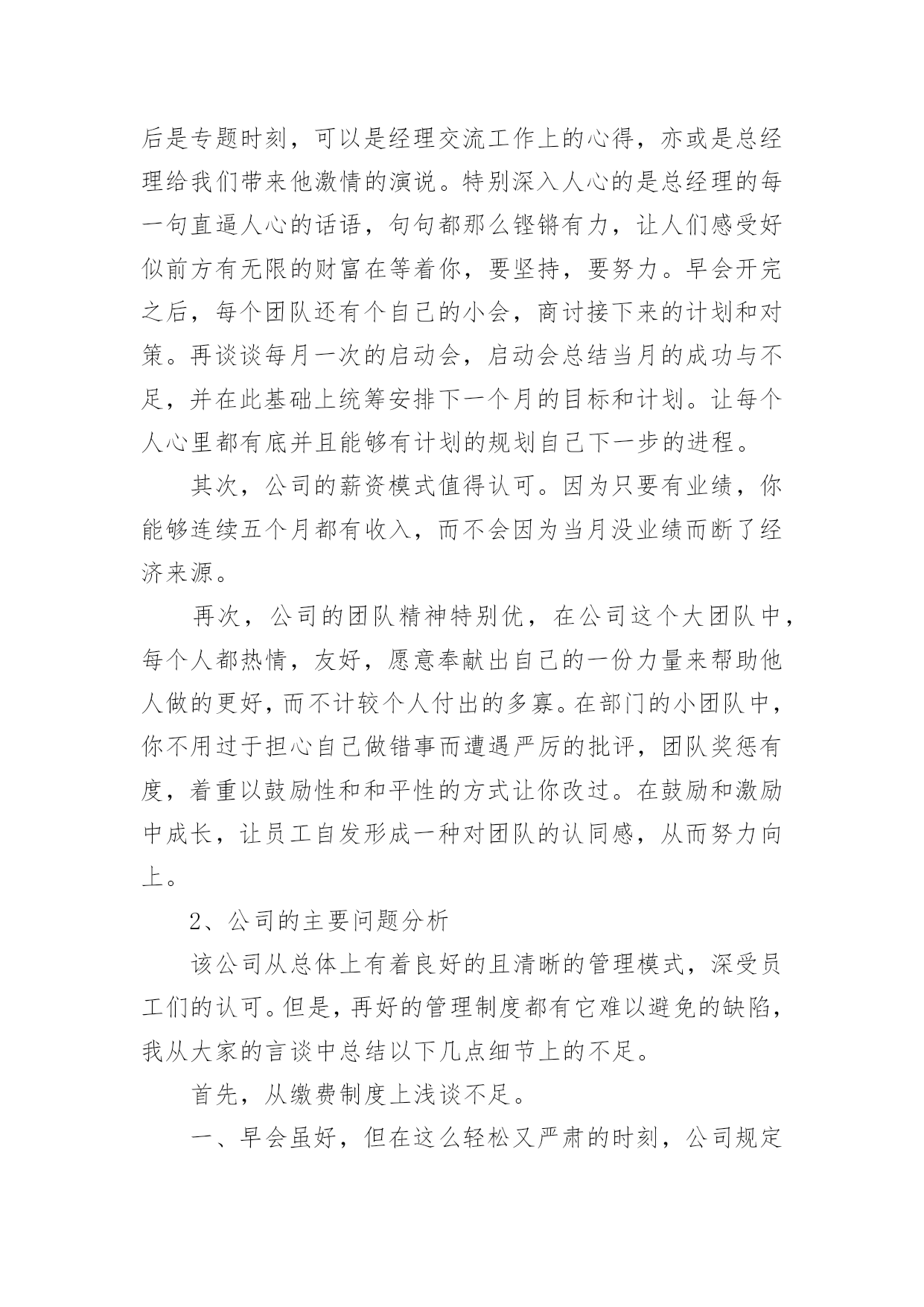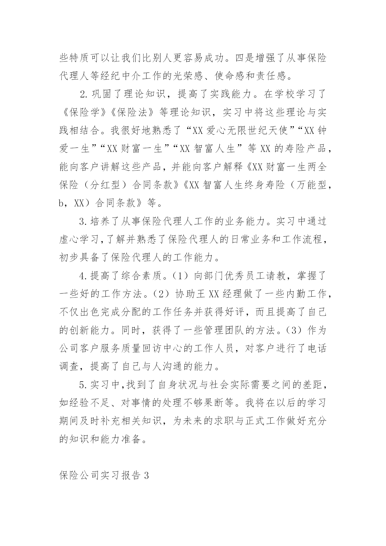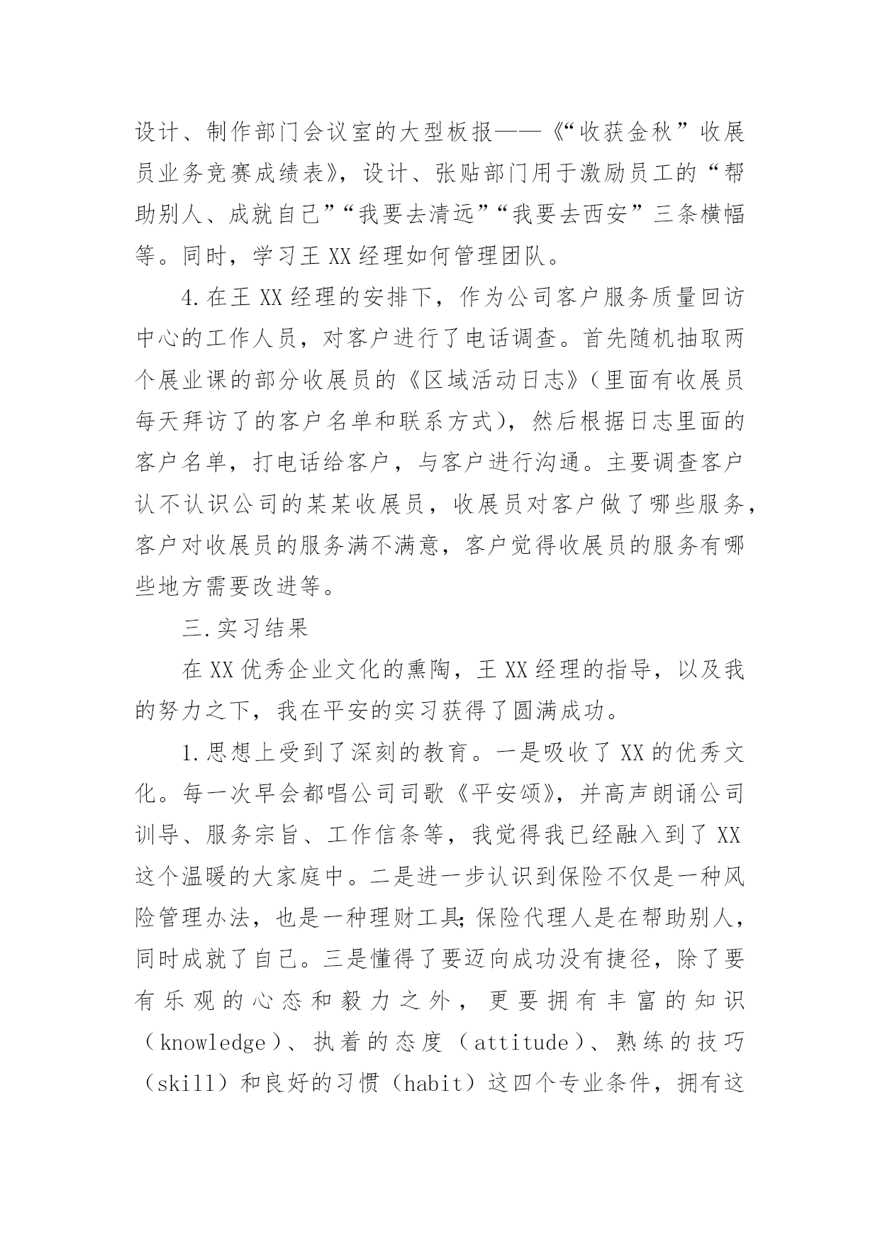 保险公司实习报告在不断进步的时代,报告有着举足轻重的地位,报告包含标题、正文、结尾等。相信许多人会觉得报告很难写吧,下面是小编为大家整理的保险公司实习报告,供大家参考借鉴,希望可以帮助到有需要的朋友。保险公司实习报告1一、实习单位概况生命人寿保险股份有限公司是一家国际化股份制专业寿险公司,公司以特色经营、特色发展、建立特色生命为经营思想,肩负“携手提升生命价值”的企业使命,秉持“内诚于心,外信于行”的核心价值观,奉行“以人为本、尊重生命”的经营理念,倡导求新、求变、求发展的经营作风。公司相继获得中国寿险行业十大最具影响力知名品牌、中国最具成长性保险公司、十大最值得信赖的寿险公司等荣誉称号,逐步确立了中国加入WTO后新兴寿险公司领军企业的地位。“求新、求变、求发展”是公司坚持不懈的经营作风,打造“特色生命”是公司发展的最终目标。生命人寿建立了覆盖全国重点省市区域的营销网络和多元化服务平台,目前共拥有800多个分支机构和服务网点(含在筹),超过13万人的管理和销售人员,为全国300多万客户提供包括人寿保险、意外险、健康险和养老保险在内的全方位风险保障解决方案和投资理财计划。二、实习过程与实习内容很荣幸在这个即将上市的大企业中以经理助理的身份实习半个月。在经理和主管的指导下,我收获了很多宝贵的经验财富。在这实习的过程中,累并快乐着。我的实习内容如下:首先,参加经理助理的岗前培训。这是一个正规化的企业,维持一天的培训让我感受到了公司浓厚的情感文化,经理主管们一整天都在忙碌着为我们准备开水点心以及午饭准备。他们的热情以及培训讲师澎湃的激情都深深的打动着我们。培训内容也让我们获益匪浅,那是一种励志性和激发性的培训,教你如何从不同的角度寻求自我定位,用激情战胜压力,走出逆境。其次,电话邀约客户参与公司欢庆十周年的活动。或许学生工作以及社会兼职的经验丰富了,打起电话来显得特别大胆和流利。加上声线较为甜美,能够随机应变解答客户的疑问,即便被拒绝被骂都能微笑的良好心态,所以我每次邀约的人数都是团队里较多的。由于打电话得到主管的认可,每次有新人来的时候,主管都会让他来凝听我的话术,学习我心态。很荣幸上级对自己的认可,从而更加努力和上进。再次,我们也会同人力资源般为自己的团队增员。我主要负责邀约海峡人才网寻找类似工作的待业人员,与电话邀约客户不同的是,电话增员的态度较为强势,好似自己就是人力资源的主管,能够给对方一份工作。然后在面试的过程中自己是一个引荐者,带领成应聘者到经理办公室面试,并送走面试完的成员。这期间自己和应聘人员有一个交谈时间,询问对方的姓名以及面试完的感受,再说说自己来到这个公司的一些体会,争取挽留人才。接着,在欢庆十周年活动期间协助活动的顺利展开。在这期间,我有过作为前台人员登记参会客户的资料,用微笑拉近与客户的距离,让客户感受自己的亲和力;有过作为礼仪小姐站在活动现场门口迎宾,并带领客户到达指定位置;有过作为负责活动现场场内秩序的维持人员。最后,我参与了公司的主持人培训。作为一个实习生,我很荣幸获得主管的认可以及推荐。此次培训不仅让我获得如何做好主持人的相关知识,更让我增加了对自己的几分自信。我感谢公司给我的每一个机会,也把握好每一个能够做的更好的机会。三、公司管理中的管理现状与主要问题分析1、公司的管理现状分析作为一个实习生,由于时间上的不足,尚不能充分了解公司的管理模式和企业文化。但就目前的接触而言,公司的管理现状我认为还是不错的。首先,公司的早会和启动会如同精神食粮般给带给员工无限的希望和斗志。其中,每逢周一、周三、周五的早会先由主持人向大家问好,然后我们激情的回应:好!我要发财!并整理的连击三掌;随后大家起立诵读公司司训,接着开始跳欢快并且舞动全身的晨操;跳完晨操大家相互与身边的人握手问好,交流感情的同时学会如何通过握手传达感情。随后是专题时刻,可以是经理交流工作上的心得,亦或是总经理给我们带来他激情的演说。特别深入人心的是总经理的每一句直逼人心的话语,句句都那么铿锵有力,让人们感受好似前方有无限的财富在等着你,要坚持,要努力。早会开完之后,每个团队还有个自己的小会,商讨接下来的计划和对策。再谈谈每月一次的启动会,启动会总结当月的成功与不足,并在此基础上统筹安排下一个月的目标和计划。让每个人心里都有底并且能够有计划的规划自己下一步的进程。其次,公司的薪资模式值得认可。因为只要有业绩,你能够连续五个月都有收入,而不会因为当月没业绩而断了经济来源。再次,公司的团队精神特别优,在公司这个大团队中,每个人都热情,友好,愿意奉献出自己的一份力量来帮助他人做的更好,而不计较个人付出的多寡。在部门的小团队中,你不用过于担心自己做错事而遭遇严厉的批评,团队奖惩有度,着重以鼓励性和和平性的方式让你改过。在鼓励和激励中成长,让员工自发形成