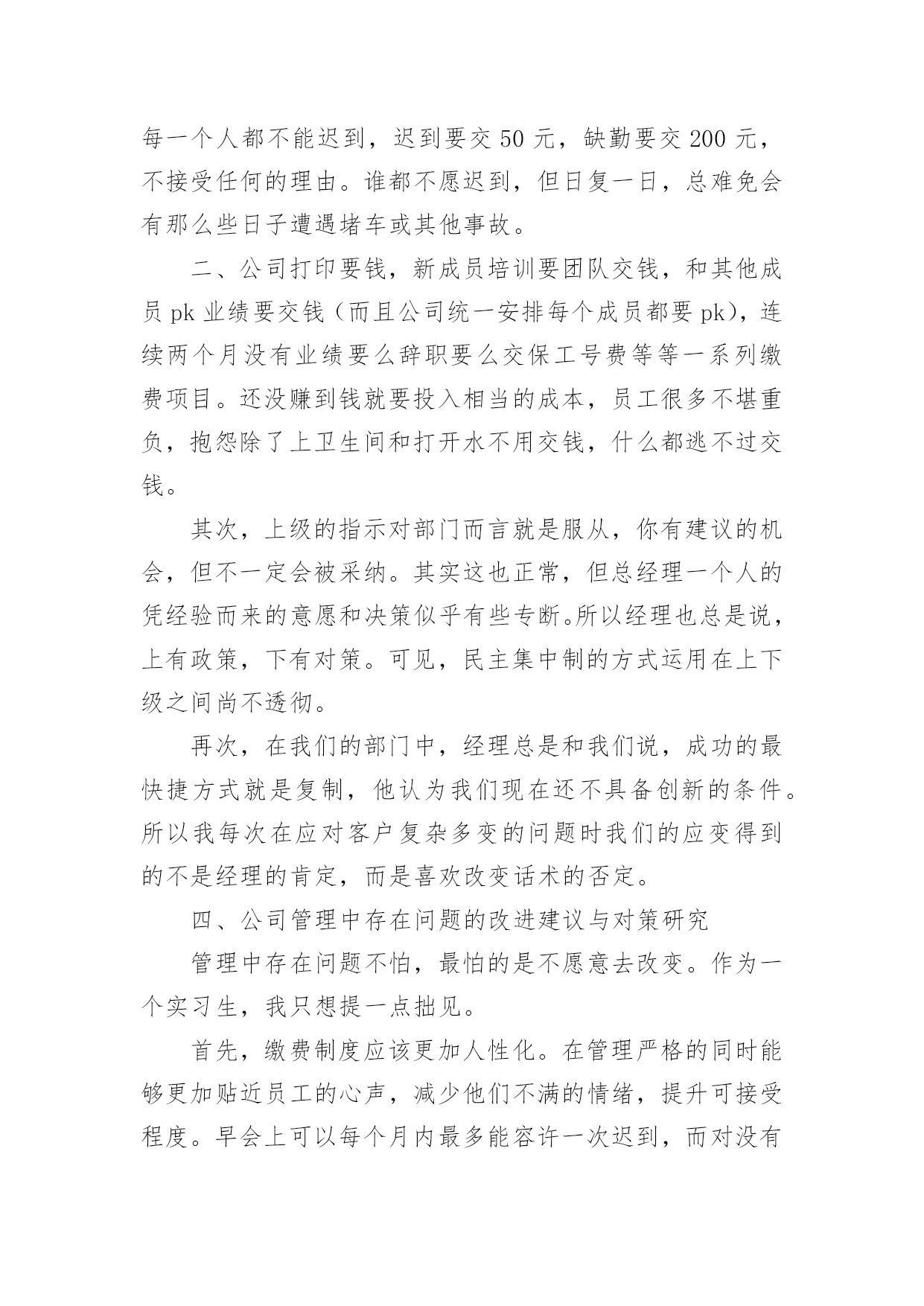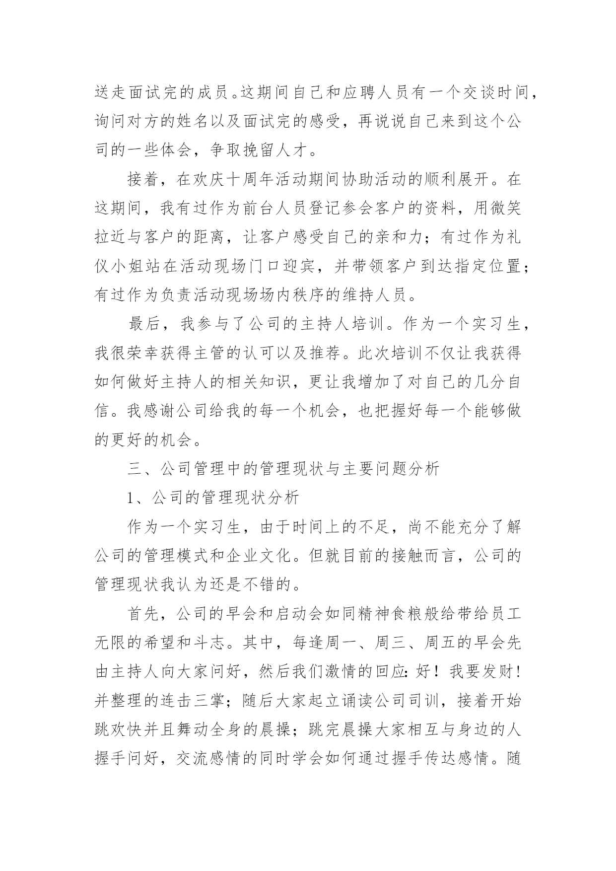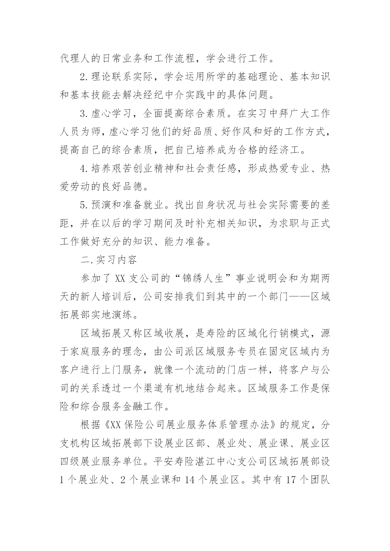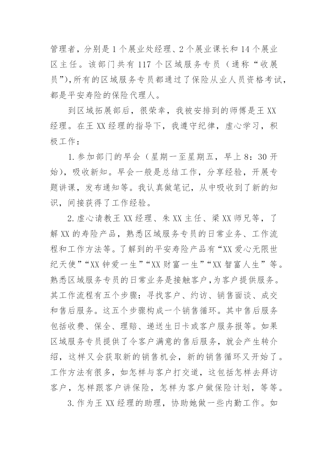 保险公司实习报告在不断进步的时代,报告有着举足轻重的地位,报告包含标题、正文、结尾等。相信许多人会觉得报告很难写吧,下面是小编为大家整理的保险公司实习报告,供大家参考借鉴,希望可以帮助到有需要的朋友。保险公司实习报告1一、实习单位概况生命人寿保险股份有限公司是一家国际化股份制专业寿险公司,公司以特色经营、特色发展、建立特色生命为经营思想,肩负“携手提升生命价值”的企业使命,秉持“内诚于心,外信于行”的核心价值观,奉行“以人为本、尊重生命”的经营理念,倡导求新、求变、求发展的经营作风。公司相继获得中国寿险行业十大最具影响力知名品牌、中国最具成长性保险公司、十大最值得信赖的寿险公司等荣誉称号,逐步确立了中国加入WTO后新兴寿险公司领军企业的地位。“求新、求变、求发展”是公司坚持不懈的经营作风,打造“特色生命”是公司发展的最终目标。生命人寿建立了覆盖全国重点省市区域的营销网络和多元化服务平台,目前共拥有800多个分支机构和服务网点(含在筹),超过13万人的管理和销售人员,为全国300多万客户提供包括人寿保险、意外险、健康险和养老保险在内的全方位风险保障解决方案和投资理财计划。二、实习过程与实习内容很荣幸在这个即将上市的大企业中以经理助理的身份实习半个月。在经理和主管的指导下,我收获了很多宝贵的经验财富。在这实习的过程中,累并快乐着。我的实习内容如下:首先,参加经理助理的岗前培训。这是一个正规化的企业,维持一天的培训让我感受到了公司浓厚的情感文化,经理主管们一整天都在忙碌着为我们准备开水点心以及午饭准备。他们的热情以及培训讲师澎湃的激情都深深的打动着我们。培训内容也让我们获益匪浅,那是一种励志性和激发性的培训,教你如何从不同的角度寻求自我定位,用激情战胜压力,走出逆境。其次,电话邀约客户参与公司欢庆十周年的活动。或许学生工作以及社会兼职的经验丰富了,打起电话来显得特别大胆和流利。加上声线较为甜美,能够随机应变解答客户的疑问,即便被拒绝被骂都能微笑的良好心态,所以我每次邀约的人数都是团队里较多的。由于打电话得到主管的认可,每次有新人来的时候,主管都会让他来凝听我的话术,学习我心态。很荣幸上级对自己的认可,从而更加努力和上进。再次,我们也会同人力资源般为自己的团队增员。我主要负责邀约海峡人才网寻找类似工作的待业人员,与电话邀约客户不同的是,电话增员的态度较为强势,好似自己就是人力资源的主管,能够给对方一份工作。然后在面试的过程中自己是一个引荐者,带领成应聘者到经理办公室面试,并送走面试完的成员。这期间自己和应聘人员有一个交谈时间,询问对方的姓名以及面试完的感受,再说说自己来到这个公司的一些体会,争取挽留人才。接着,在欢庆十周年活动期间协助活动的顺利展开。在这期间,我有过作为前台人员登记参会客户的资料,用微笑拉近与客户的距离,让客户感受自己的亲和力;有过作为礼仪小姐站在活动现场门口迎宾,并带领客户到达指定位置;有过作为负责活动现场场内秩序的维持人员。最后,我参与了公司的主持人培训。作为一个实习生,我很荣幸获得主管的认可以及推荐。此次培训不仅让我获得如何做好主持人的相关知识,更让我增加了对自己的几分自信。我感谢公司给我的每一个机会,也把握好每一个能够做的更好的机会。三、公司管理中的管理现状与主要问题分析1、公司的管理现状分析作为一个实习生,由于时间上的不足,尚不能充分了解公司的管理模式和企业文化。但就目前的接触而言,公司的管理现状我认为还是不错的。首先,公司的早会和启动会如同精神食粮般给带给员工无限的希望和斗志。其中,每逢周一、周三、周五的早会先由主持人向大家问好,然后我们激情的回应:好!我要发财!并整理的连击三掌;随后大家起立诵读公司司训,接着开始跳欢快并且舞动全身的晨操;跳完晨操大家相互与身边的人握手问好,交流感情的同时学会如何通过握手传达感情。随后是专题时刻,可以是经理交流工作上的心得,亦或是总经理给我们带来他激情的演说。特别深入人心的是总经理的每一句直逼人心的话语,句句都那么铿锵有力,让人们感受好似前方有无限的财富在等着你,要坚持,要努力。早会开完之后,每个团队还有个自己的小会,商讨接下来的计划和对策。再谈谈每月一次的启动会,启动会总结当月的成功与不足,并在此基础上统筹安排下一个月的目标和计划。让每个人心里都有底并且能够有计划的规划自己下一步的进程。其次,公司的薪资模式值得认可。因为只要有业绩,你能够连续五个月都有收入,而不会因为当月没业绩而断了经济来源。再次,公司的团队精神特别优,在公司这个大团队中,每个人都热情,友好,愿意奉献出自己的一份力量来帮助他人做的更好,而不计较个人付出的多寡。在部门的小团队中,你不用过于担心自己做错事而遭遇严厉的批评,团队奖惩有度,着重以鼓励性和和平性的方式让你改过。在鼓励和激励中成长,让员工自发形成