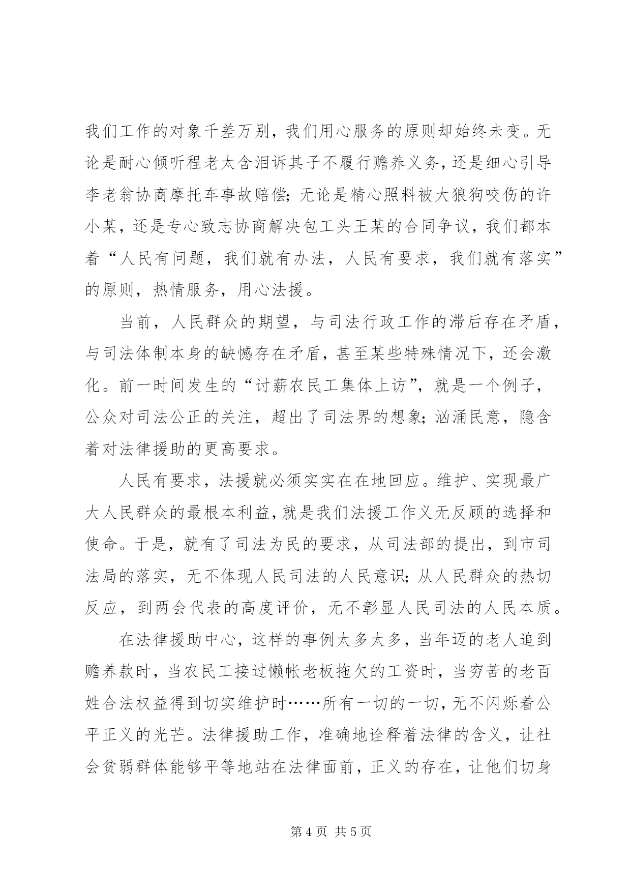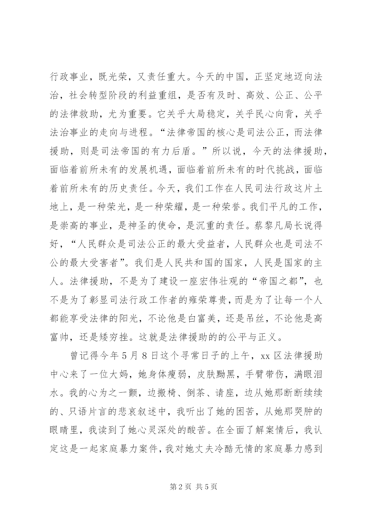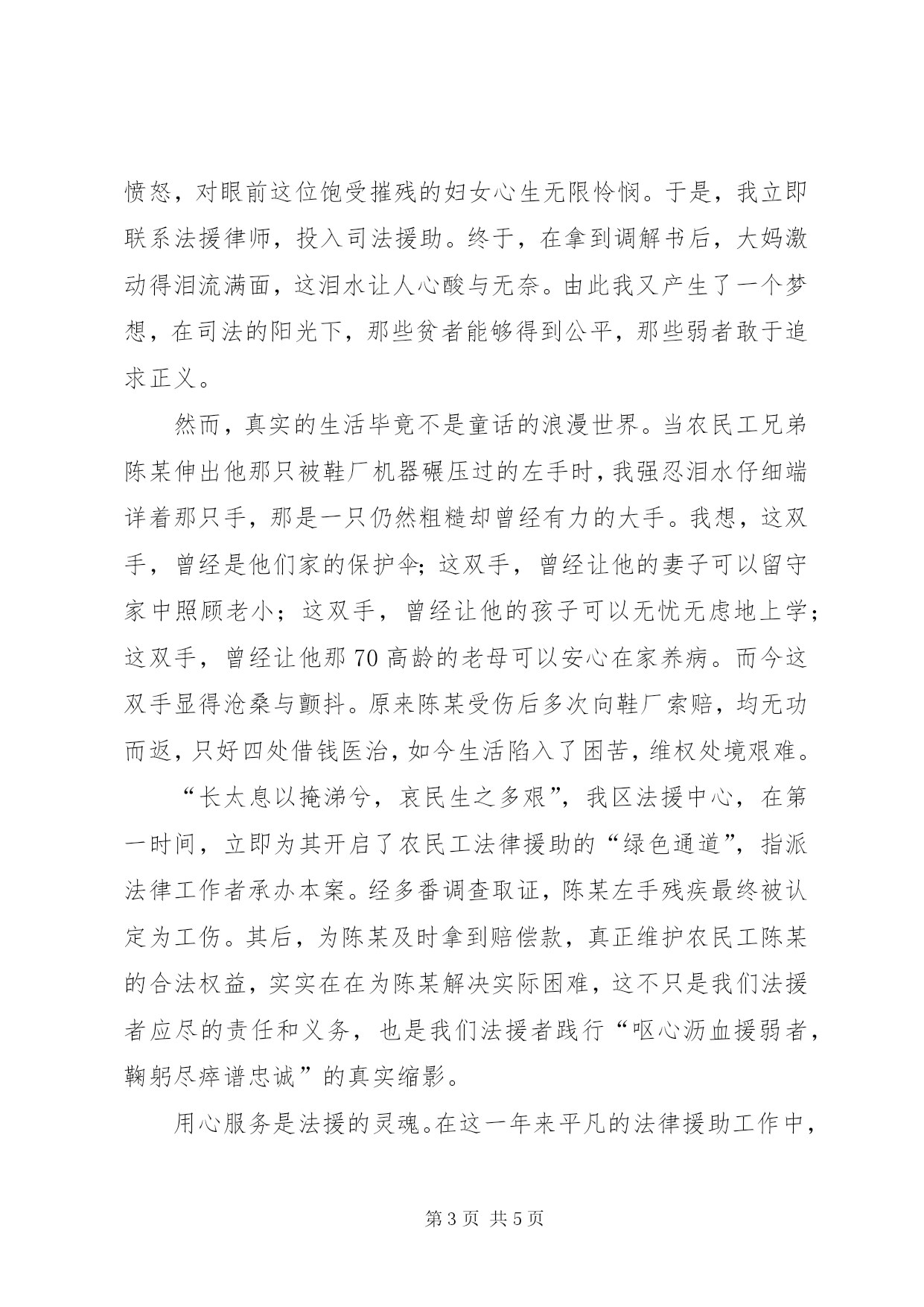 第PAGE\*Arabic\*MERGEFORMAT5页共NUMPAGES\*MERGEFORMAT5页司法核心价值观演讲呕心沥血援弱者,鞠躬尽瘁谱忠诚尊敬的各位领导、来宾,亲爱的同事们:大家好。我是来自xx区司法局的xx。今天我演讲的题目是《呕心沥血援弱者,鞠躬尽瘁谱忠诚》。法律援助,让贫弱者尽享阳光;法律援助,让人人平等地面对法律。如果每一个法援者,都将正义与爱心,凝聚在法律援助工作之中,就是执政为民。执政为民,正是我们法律援助工作的根本出发点和落脚点。法援中心,作为司法行政部门的一个职能机构,追求公平和正义、把准工作的出发点与落脚点,是我们永恒的主题。虽然参加法律援助工作刚一年多,我却深深地爱上了司法行政这片热土。注目那庄严高悬的共和国国徽,仰望那迎风飘动的五星红旗,一股神圣与自豪油然而生,同时我也感受到一丝敬畏、一份沉甸甸的责任。我曾经不止一次扪心自问,这种感受来自何方。是司法行政工作者名头的煊赫,还是法律本身的威严。最终我意识到,这些都不是,这神圣、自豪、敬畏与责任,来自于法律援助所担负的——人民的嘱托,人民的信任,人民的殷切期盼。也正因为对法律援助这种发自内心的向往,去年,我毅然选择并如愿当上了xx区司法局法律援助中心的一名新兵。一年多的法律援助工作经历,让我深切地体会到,人民司法行政事业,既光荣,又责任重大。今天的中国,正坚定地迈向法治,社会转型阶段的利益重组,是否有及时、高效、公正、公平的法律救助,尤为重要。它关乎大局稳定,关乎民心向背,关乎法治事业的走向与进程。“法律帝国的核心是司法公正,而法律援助,则是司法帝国的有力后盾。”所以说,今天的法律援助,面临着前所未有的发展机遇,面临着前所未有的时代挑战,面临着前所未有的历史责任。今天,我们工作在人民司法行政这片土地上,是一种荣光,是一种荣耀,是一种荣誉。我们平凡的工作,是崇高的事业,是神圣的使命,是沉重的责任。蔡黎凡局长说得好,“人民群众是司法公正的最大受益者,人民群众也是司法不公的最大受害者”。我们是人民共和国的国家,人民是国家的主人。法律援助,不是为了建设一座宏伟壮观的“帝国之都”,也不是为了彰显司法行政工作者的雍荣尊贵,而是为了让每一个人都能享受法律的阳光,不论他是白富美,还是吊丝,不论他是高富帅,还是矮穷挫。这就是法律援助的的公平与正义。曾记得今年5月8日这个寻常日子的上午,xx区法律援助中心来了一位大妈,她身体瘦弱,皮肤黝黑,手臂带伤,满眼泪水。我的心为之一颤,边搬椅、倒茶、请座,边从她那断断续续的、只语片言的悲哀叙述中,我听出了她的困苦,从她那哭肿的眼睛里,我读到了她心灵深处的酸苦。在全面了解案情后,我认定这是一起家庭暴力案件,我对她丈夫冷酷无情的家庭暴力感到愤怒,对眼前这位饱受摧残的妇女心生无限怜悯。于是,我立即联系法援律师,投入司法援助。终于,在拿到调解书后,大妈激动得泪流满面,这泪水让人心酸与无奈。由此我又产生了一个梦想,在司法的阳光下,那些贫者能够得到公平,那些弱者敢于追求正义。然而,真实的生活毕竟不是童话的浪漫世界。当农民工兄弟陈某伸出他那只被鞋厂机器碾压过的左手时,我强忍泪水仔细端详着那只手,那是一只仍然粗糙却曾经有力的大手。我想,这双手,曾经是他们家的保护伞;这双手,曾经让他的妻子可以留守家中照顾老小;这双手,曾经让他的孩子可以无忧无虑地上学;这双手,曾经让他那70高龄的老母可以安心在家养病。而今这双手显得沧桑与颤抖。原来陈某受伤后多次向鞋厂索赔,均无功而返,只好四处借钱医治,如今生活陷入了困苦,维权处境艰难。“长太息以掩涕兮,哀民生之多艰”,我区法援中心,在第一时间,立即为其开启了农民工法律援助的“绿色通道”,指派法律工作者承办本案。经多番调查取证,陈某左手残疾最终被认定为工伤。其后,为陈某及时拿到赔偿款,真正维护农民工陈某的合法权益,实实在在为陈某解决实际困难,这不只是我们法援者应尽的责任和义务,也是我们法援者践行“呕心沥血援弱者,鞠躬尽瘁谱忠诚”的真实缩影。用心服务是法援的灵魂。在这一年来平凡的法律援助工作中,我们工作的对象千差万别,我们用心服务的原则却始终未变。无论是耐心倾听程老太含泪诉其子不履行赡养义务,还是细心引导李老翁协商摩托车事故赔偿;无论是精心照料被大狼狗咬伤的许小某,还是专心致志协商解决包工头王某的合同争议,我们都本着“人民有问题,我们就有办法,人民有要求,我们就有落实”的原则,热情服务,用心法援。当前,人民群众的期望,与司法行政工作的滞后存在矛盾,与司法体制本身的缺憾存在矛盾,甚至某些特殊情况下,还会激化。前一时间发生的“讨薪农民工集体上访”,就是一个例子,公众对司法公正的关注,超出了司法界的想象;汹涌民意,隐含着对法律援助的更高要求。人民有要求,法援就必须实实在在地回应。维护、实现最广大