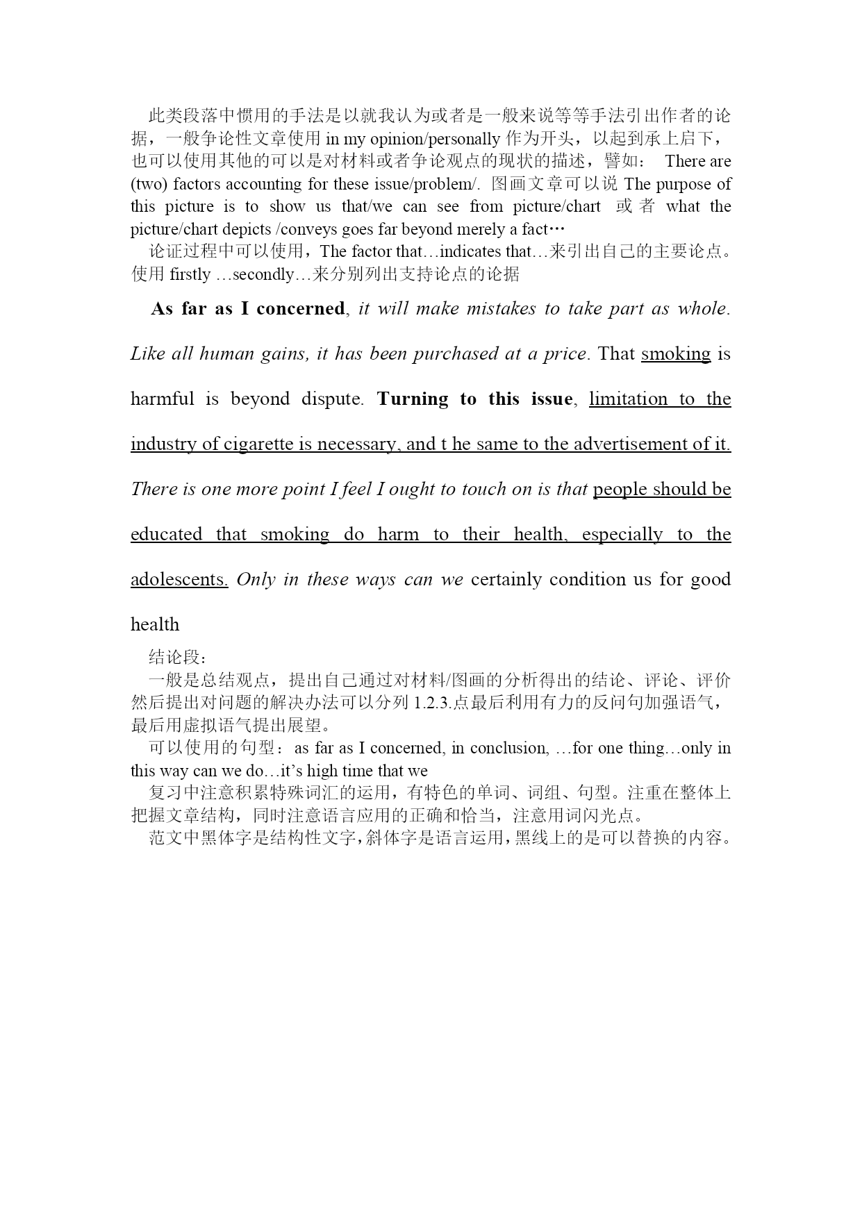 论证性文章模式(图表/画及其他的观点作文)Themajority/vastofpeoplewouldagreethatcigarettesmokinghascausedseriousproblems.Whenfacethethingpeople’sideasarenotcutfromthesamecloth.Butthetobaccocompaniesrespondtotheissuejusttheotherwayaroundthattheycontributegreatlytotheworldeconomybypayingtaxestothegovernmentandemployinghundredsofworkers.开头段:此段用于观点争论性文章的开头,正反两个观点要有侧重,一般先提正确,然后阐述错误观点的理由,为下一段展开论证做铺垫。基本句式:大多人认为…(themajority/vastofpeoplewouldagreethat…)人们对此观点不一(people’sideasarenotcutfromthesamecloth)反对方认为…(but反方respondtotheissuejusttheotherwayaround…),还可以运用的句子:Theybasetheirargumentsonthegroundsthat…划横线的地方是可以替换的,大多是名词或名词性动词以及材料或图画提供的关于争论双方的描述或其基本观点。单一观点的论证模式也可以使用这样的模式。但在句子的运用上注意一致性,Nowpeopleingrowingnumbersarecomingtorecognize对材料或者图画的事实:foronething/foronepicture,foranotherthing/picture,Inmyopinion/personally,disadvantageofsmokingoutweightheadvantages.Firstlysmokingisacauseofmanydiseases,forlungsespecially.Accordingtothesurvey,tobaccoconsumeraccountforthe20%oftheworldpopulation,andowingtosmoking,thereis3millionpeoplelosstheirlives.Fortunately,asthechartconveysthatgrossofcigaretteproductionhasbeenreducedfrom142billionin1994to141billionin1995.Obviously,peoplewanttodoeverythingpossibletomoderateitsseverity.Secondly,asithasbeenestimated,200billionUSdollarsislostduetosmokingeachyear.Tobaccoconsumptionisextremelywastefulofmoney.承接段:此类段落中惯用的手法是以就我认为或者是一般来说等等手法引出作者的论据,一般争论性文章使用inmyopinion/personally作为开头,以起到承上启下,也可以使用其他的可以是对材料或者争论观点的现状的描述,譬如:Thereare(two)factorsaccountingfortheseissue/problem/.图画文章可以说Thepurposeofthispictureistoshowusthat/wecanseefrompicture/chart或者whatthepicture/chartdepicts/conveysgoesfarbeyondmerelyafact…论证过程中可以使用,Thefactorthat…indicatesthat…来引出自己的主要论点。使用firstly…secondly…来分别列出支持论点的论据AsfarasIconcerned,itwillmakemistakestotakepartaswhole.Likeallhumangains,ithasbeenpurchasedataprice.Thatsmokingisharmfulisbeyonddispute.Turningtothisissue,limitationtotheindustryofcigaretteisnecessary,andthesametotheadvertisementofit.ThereisonemorepointIfeelIoughttotouchonisthatpeopleshouldbeeducate