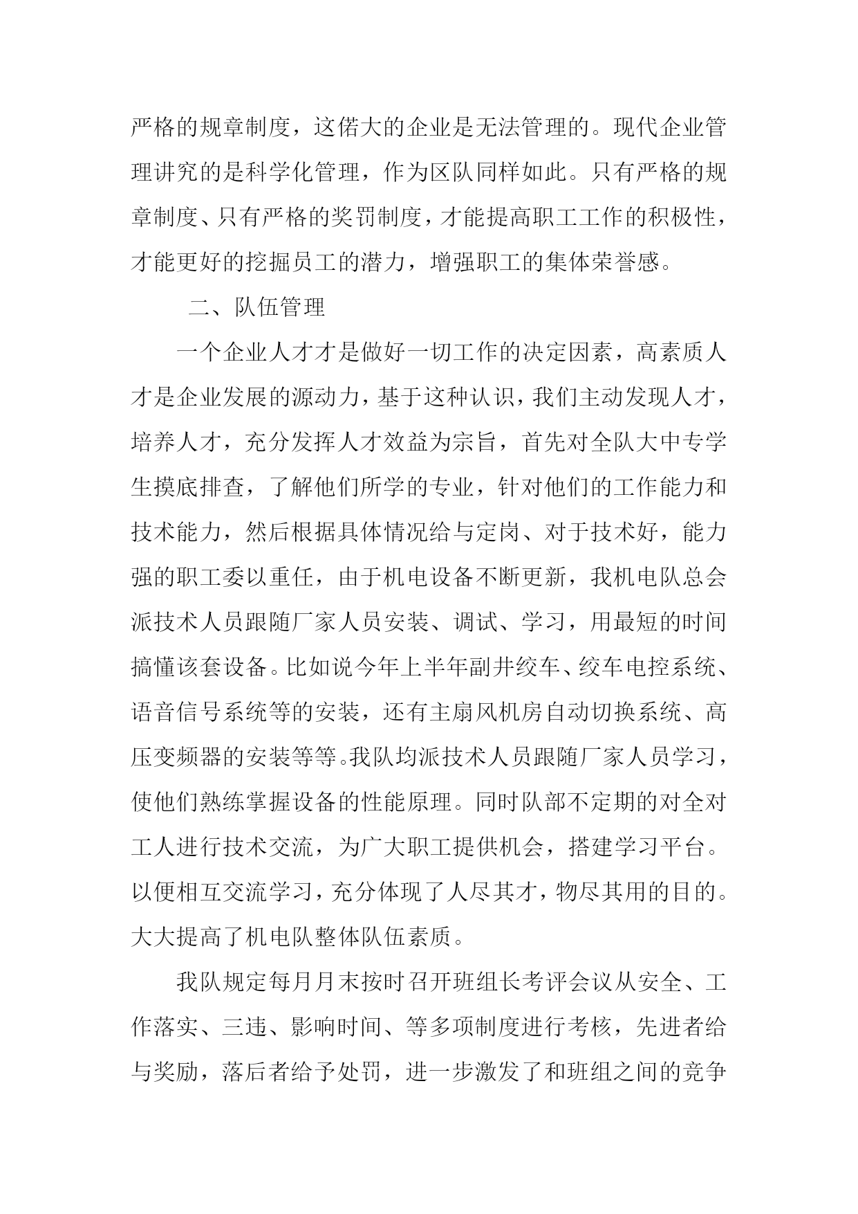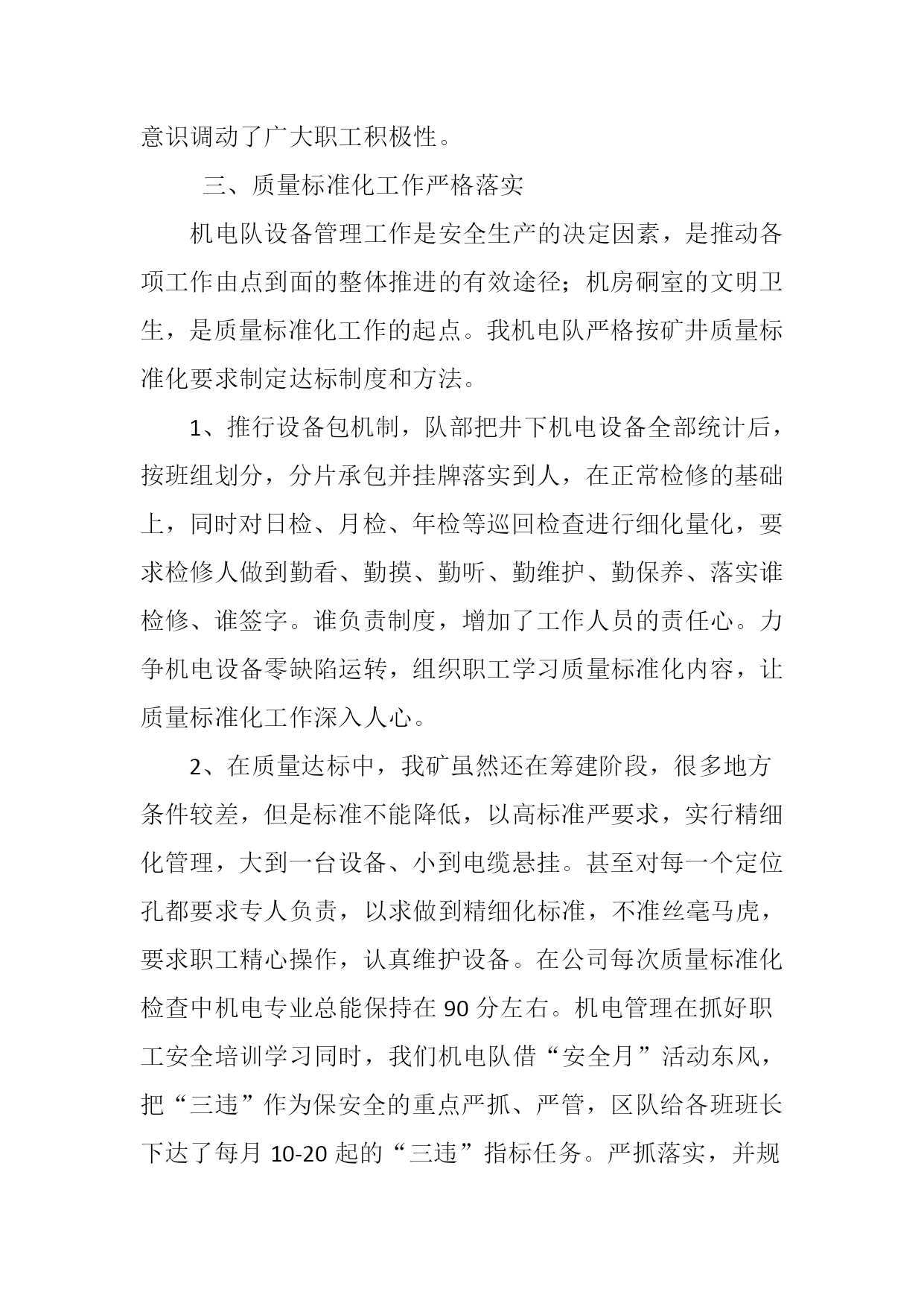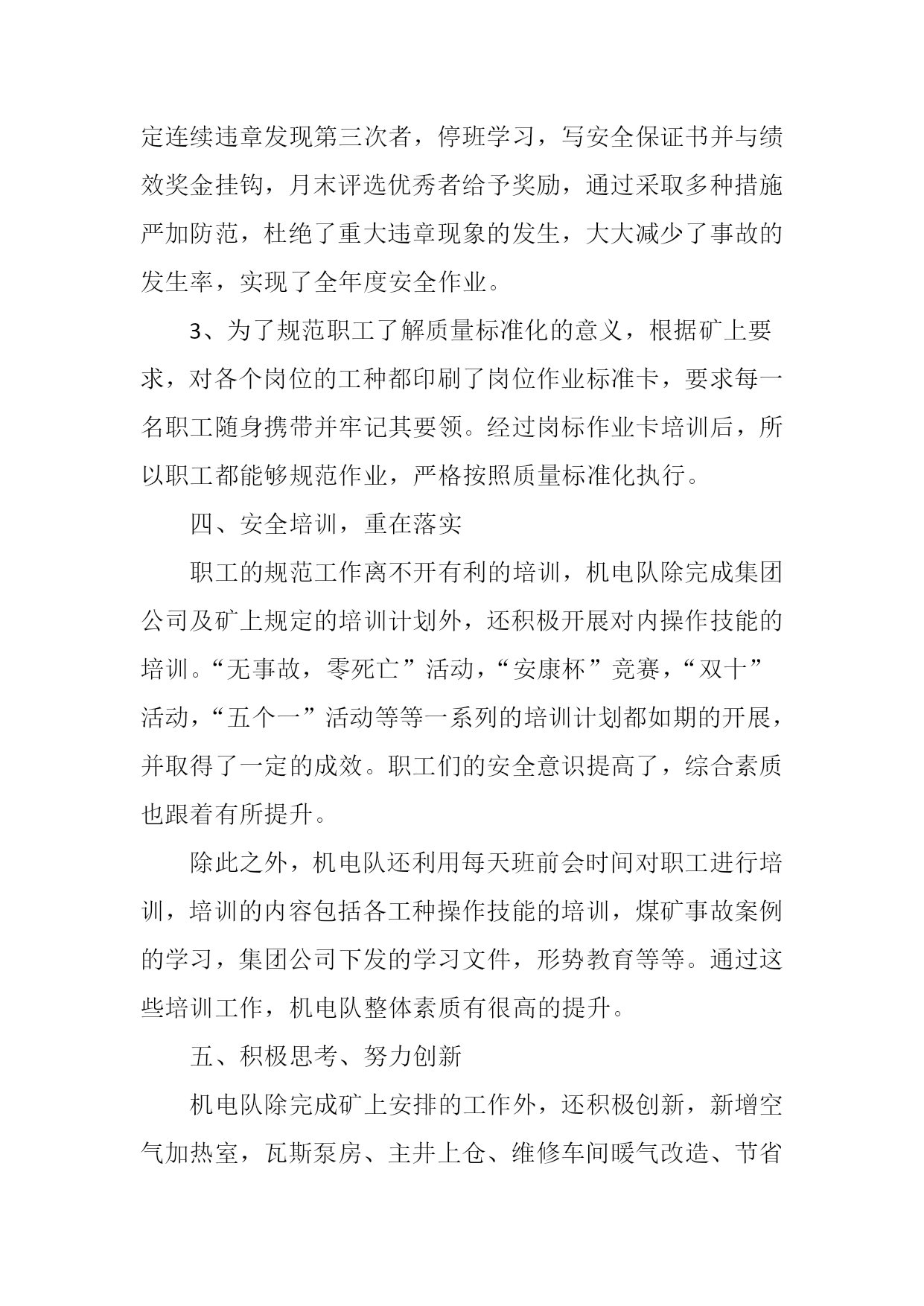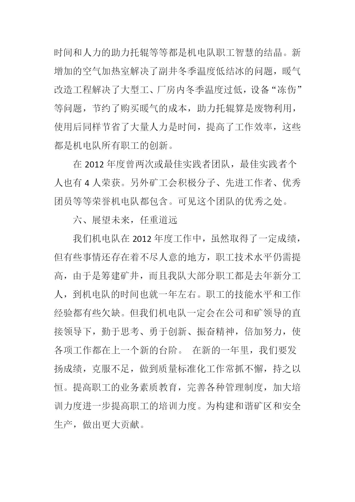 阜康一号煤矿机电队2012年度安全工作总结2012年我队认真贯彻执行焦煤集团以及一号煤矿领导指示精神,在矿领导的支持和各区队的相互配合下,为确保安全无事故,我机电队紧紧围绕“安全第一,预防为主,综合治理”的安全发展指导思想,要求管理人员和员工首先从思想上强化安全意识。在全队扎实开展安全教育活动,进一步提高安全生产管理水平,提高了工作效率,增强了员工的安全意识。现将本年度的工作情况作如下总结:一、全面施行奖惩并发管理,推动推动各项工作顺利开展自年初以来,全队上下严格实施精细化管理标准要求,结合本队实际,积极探索机电管理的新经验,新方法,在机电队管理方面全力推行“抓安全,铁面无私、抓质量,细致入微、抓消耗,斤斤计较、抓纪律,严惩不怠、抓生产,万无一失、抓创建,持之以恒”并制定奖罚制度、强化管理明确分工和班组长带头示范作用,以及职工培训,提高业务水平。由于工作的全面展开,促使机电管理工作走上了科学化、规范化的轨道,推动了几点管理工作不断深入完善。俗话说无规矩不成方圆,企业的管理也是如此,若没有严格的规章制度,这偌大的企业是无法管理的。现代企业管理讲究的是科学化管理,作为区队同样如此。只有严格的规章制度、只有严格的奖罚制度,才能提高职工工作的积极性,才能更好的挖掘员工的潜力,增强职工的集体荣誉感。二、队伍管理一个企业人才才是做好一切工作的决定因素,高素质人才是企业发展的源动力,基于这种认识,我们主动发现人才,培养人才,充分发挥人才效益为宗旨,首先对全队大中专学生摸底排查,了解他们所学的专业,针对他们的工作能力和技术能力,然后根据具体情况给与定岗、对于技术好,能力强的职工委以重任,由于机电设备不断更新,我机电队总会派技术人员跟随厂家人员安装、调试、学习,用最短的时间搞懂该套设备。比如说今年上半年副井绞车、绞车电控系统、语音信号系统等的安装,还有主扇风机房自动切换系统、高压变频器的安装等等。我队均派技术人员跟随厂家人员学习,使他们熟练掌握设备的性能原理。同时队部不定期的对全对工人进行技术交流,为广大职工提供机会,搭建学习平台。以便相互交流学习,充分体现了人尽其才,物尽其用的目的。大大提高了机电队整体队伍素质。我队规定每月月末按时召开班组长考评会议从安全、工作落实、三违、影响时间、等多项制度进行考核,先进者给与奖励,落后者给予处罚,进一步激发了和班组之间的竞争意识调动了广大职工积极性。三、质量标准化工作严格落实机电队设备管理工作是安全生产的决定因素,是推动各项工作由点到面的整体推进的有效途径;机房硐室的文明卫生,是质量标准化工作的起点。我机电队严格按矿井质量标准化要求制定达标制度和方法。1、推行设备包机制,队部把井下机电设备全部统计后,按班组划分,分片承包并挂牌落实到人,在正常检修的基础上,同时对日检、月检、年检等巡回检查进行细化量化,要求检修人做到勤看、勤摸、勤听、勤维护、勤保养、落实谁检修、谁签字。谁负责制度,增加了工作人员的责任心。力争机电设备零缺陷运转,组织职工学习质量标准化内容,让质量标准化工作深入人心。2、在质量达标中,我矿虽然还在筹建阶段,很多地方条件较差,但是标准不能降低,以高标准严要求,实行精细化管理,大到一台设备、小到电缆悬挂。甚至对每一个定位孔都要求专人负责,以求做到精细化标准,不准丝毫马虎,要求职工精心操作,认真维护设备。在公司每次质量标准化检查中机电专业总能保持在90分左右。机电管理在抓好职工安全培训学习同时,我们机电队借“安全月”活动东风,把“三违”作为保安全的重点严抓、严管,区队给各班班长下达了每月10-20起的“三违”指标任务。严抓落实,并规定连续违章发现第三次者,停班学习,写安全保证书并与绩效奖金挂钩,月末评选优秀者给予奖励,通过采取多种措施严加防范,杜绝了重大违章现象的发生,大大减少了事故的发生率,实现了全年度安全作业。3、为了规范职工了解质量标准化的意义,根据矿上要求,对各个岗位的工种都印刷了岗位作业标准卡,要求每一名职工随身携带并牢记其要领。经过岗标作业卡培训后,所以职工都能够规范作业,严格按照质量标准化执行。四、安全培训,重在落实职工的规范工作离不开有利的培训,机电队除完成集团公司及矿上规定的培训计划外,还积极开展对内操作技能的培训。“无事故,零死亡”活动,“安康杯”竞赛,“双十”活动,“五个一”活动等等一系列的培训计划都如期的开展,并取得了一定的成效。职工们的安全意识提高了,综合素质也跟着有所提升。除此之外,机电队还利用每天班前会时间对职工进行培训,培训的内容包括各工种操作技能的培训,煤矿事故案例的学习,集团公司下发的学习文件,形势教育等等。通过这些培训工作,机电队整体素质有很高的提升。五、积极思考、努力创新机电队除完成矿上安排的工作外,还积极创新