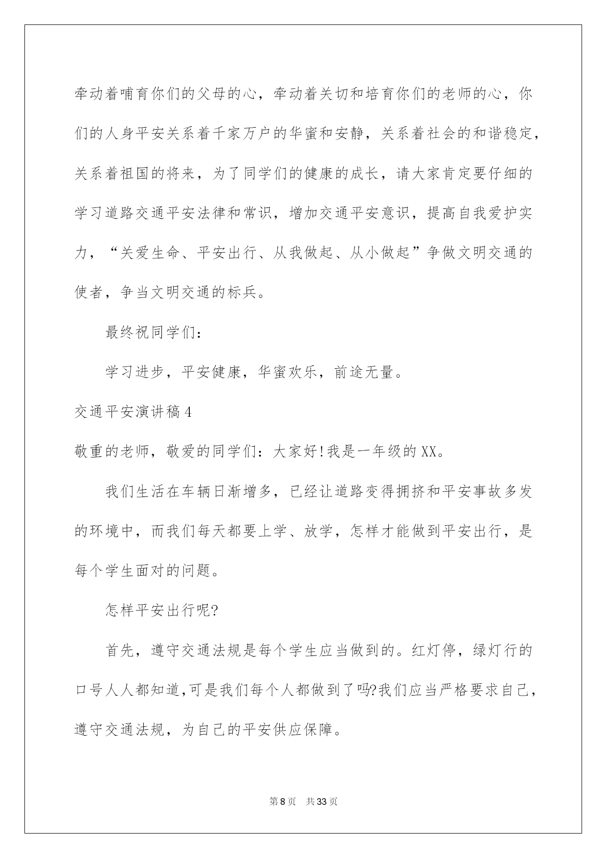 第PAGE\*Arabic\*MERGEFORMAT33页共NUMPAGES\*Arabic\*MERGEFORMAT33页第PAGE\*MERGEFORMAT33页共NUMPAGES\*MERGEFORMAT33页第PAGE\*MERGEFORMAT33页共NUMPAGES\*MERGEFORMAT33页第PAGE\*MERGEFORMAT33页共NUMPAGES\*MERGEFORMAT33页第PAGE\*MERGEFORMAT33页共NUMPAGES\*MERGEFORMAT33页第PAGE\*MERGEFORMAT33页共NUMPAGES\*MERGEFORMAT33页第PAGE\*MERGEFORMAT33页共NUMPAGES\*MERGEFORMAT33页第PAGE\*MERGEFORMAT33页共NUMPAGES\*MERGEFORMAT33页第PAGE\*MERGEFORMAT33页共NUMPAGES\*MERGEFORMAT33页第PAGE\*MERGEFORMAT33页共NUMPAGES\*MERGEFORMAT33页第PAGE\*MERGEFORMAT33页共NUMPAGES\*MERGEFORMAT33页2022交通安全演讲稿交通平安演讲稿15篇演讲稿的写法比较敏捷,可以依据会议的内容、一件事事后的感想、须要等状况而有所区分。在现在的社会生活中,演讲稿在我们的视野里出现的频率越来越高,信任很多人会觉得演讲稿很难写吧,以下是我整理的交通平安演讲稿,仅供参考,欢迎大家阅读。交通平安演讲稿1各位领导、各位同行,大家好:生命是珍贵的,生命属于我们只有一次。举世震惊的汶川大地震,近七万人在瞬间被夺走了生命,天府之国上演了妻离子散,家破人亡,的惨烈一幕,共和国下半旗,整个世界都在默哀。那些失去父母的孩子,那些晚年丧子的老人,那些撕心裂肺的哭喊,无不见证一个事实——活着,是多么华蜜啊!在这突发的灾难面前,人们起先再一次谛视生命的价值和意义。平安,不仅是华蜜,更是责任。对自己的生命负责,对他人的生命负责。当居高不下的交通事故,已经成为生命的一大杀手时,我要在这大声呼喊:平安就是生命,责任重于泰山!在全国交通事故统计表里,记载了这样一组数据:xx年交通事故死亡98738人,受伤469911人!xx年交通事故死亡89455人,受伤431139人!死亡人数骇人动目,哪一年都超过了汶川大地震。再翻开我的笔记本,是我怀着沉重的心情登记的这些名人:宏大的战士——雷锋,死于车祸!人民的好公仆——孔繁森,也死于车祸!大家宠爱的荧屏新秀——洛桑,同样死于车祸!车祸!车祸!车祸!车祸让多少人诀别了人世!车祸给多少家庭带来了残缺!车祸让我们的生活覆盖着阴影!几年前的一天,大家或许还没有遗忘,在我市千岛湖发生了一起震惊全国的特大交通事故.一辆满载乘客的大客车翻入了千岛湖,造成了12人死亡,21人受伤.抢救现场,一俱俱冰凉的尸体,让人惨不忍睹;他们中间有年过花甲的老人,有天真烂漫的小孩,甚至有的还怀着几个月身孕……死难者告辞了人世,他们或许还没有完成自己的人生目标,或许还没有实现自己的生活幻想!更凄惨的是,他们的家人,他们的父老乡亲,他们的亲朋好友,将为之难过落泪,将为之哀思欲绝,他们心中的阴影将久久挥之不去……作为一名驾培行业的职员,我在思索:假如我是一名司机,我要时刻牢记平安二字,车轮一动就要想到群众;我会把交通法铭刻在心中,绝不酒后驾驶!绝不超载超速;绝不抢道抢行!绝不……假如我是一名教练,我更会把平安刻在心里,挂在嘴角,落实在行动中。因为教练的社会责任更大更重。一批又一批的驾驶新手,离开驾校,走向社会,走向交通行列;这些新手,能否成为平安驾驶的能手,在很大程度上,取决于我们的教练。我们严格要求自己,更要严格要求学员。教练是学员技术上的教育员,行车时的平安员。学员是教练的镜子,什么样的教练,培育出什么样的学员。教练象播种机,我们要培育的是香花,而不是毒草;教练是工程师,我们要培育的是驾驶能手,决不是公路杀手,教练要传授的不仅仅是驾驶技术,更重要的是,传授平安意识,传授以人为本,平安第一的理念。地震无法避开,而交通事故是可以预防的。多少交通事故,是因为驾驶员疏忽大意所至,是因为驾驶员违章驾驶而酿成。从历年交通事故分析中可以看出,因驾驶人缘由肇事率达90%以上,其中30%以上的驾驶员为低年资驾驶员。今年浙江省51起特大交通事故全系驾驶人违法造成。由此可见,驾校的任务是多么严峻,教练的责任是多么重大!我们所从事的工作虽然没有抗震救灾那么紧迫,没有抗震救灾那么可歌可泣,但我们从事的是比抗震救