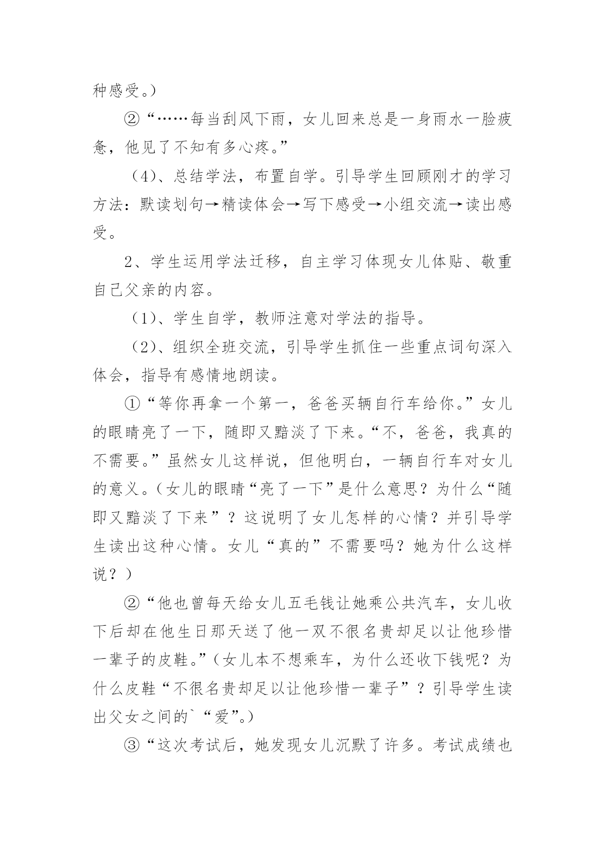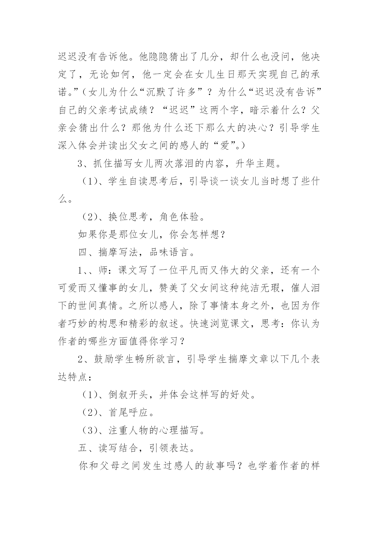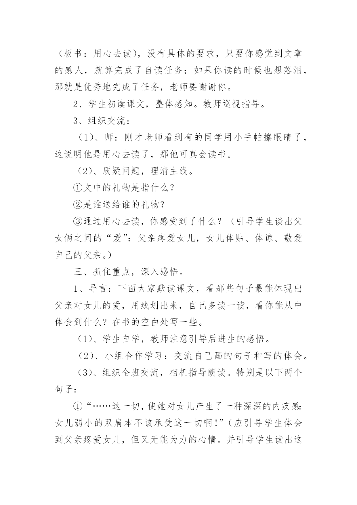 《礼物》课件设计《礼物》教学设计学习目标:1、正确、流利、有感情地朗读课文。2、理解课文内容,体会文中父亲疼爱女儿,女儿敬爱、体贴父亲的真挚情感。3、通过边读边想,体会人物的内心。4、认识倒叙的叙述顺序。教学重点:课堂体现“以读为本”,引导学生正确、流利、有感情地朗读课文。在品读中感悟父亲疼爱女儿,女儿敬爱、体谅父亲的真挚情感。教学难点:引导学生通过边朗读边思考,体会人物的内心。教学过程:一、谈话导课。上节课我们学习了一篇富含哲理的诗歌——《微笑》,给你留下了哪些最为深刻的印象?今天来学习一篇极为真挚感人的文章《礼物》。二、以情激情,整体感知。1、师:文章确实很感人。同学们知道吗?我自己第一次读这个故事的时候就控制不住泪水,中间多次停下来,因为泪水就在眼眶中打转儿。现在大家也用心去读这篇文章(板书:用心去读),没有具体的要求,只要你感觉到文章的感人,就算完成了自读任务;如果你读的时候也想落泪,那就是优秀地完成了任务,老师要谢谢你。2、学生初读课文,整体感知。教师巡视指导。3、组织交流:(1)、师:刚才老师看到有的同学用小手帕擦眼睛了,这说明他是用心去读了,那他可真会读书。(2)、质疑问题,理清主线。①文中的礼物是指什么?②是谁送给谁的礼物?③通过用心去读,你感受到了什么?(引导学生谈出父女俩之间的“爱”:父亲疼爱女儿,女儿体贴、体谅、敬爱自己的父亲。)三、抓住重点,深入感悟。1、导言:下面大家默读课文,看那些句子最能体现出父亲对女儿的爱,用线划出来,自己多读一读,看你能从中体会到什么?在书的空白处写一些。(1)、学生自学,教师注意引导后进生的感悟。(2)、小组合作学习:交流自己画的句子和写的体会。(3)、组织全班交流,相机指导朗读。特别是以下两个句子:①“……这一切,使她对女儿产生了一种深深的内疚感:女儿弱小的双肩本不该承受这一切啊!”(应引导学生体会到父亲疼爱女儿,但又无能为力的心情。并引导学生读出这种感受。)②“……每当刮风下雨,女儿回来总是一身雨水一脸疲惫,他见了不知有多心疼。”(4)、总结学法,布置自学。引导学生回顾刚才的学习方法:默读划句→精读体会→写下感受→小组交流→读出感受。2、学生运用学法迁移,自主学习体现女儿体贴、敬重自己父亲的内容。(1)、学生自学,教师注意对学法的指导。(2)、组织全班交流,引导学生抓住一些重点词句深入体会,指导有感情地朗读。①“等你再拿一个第一,爸爸买辆自行车给你。”女儿的眼睛亮了一下,随即又黯淡了下来。“不,爸爸,我真的不需要。”虽然女儿这样说,但他明白,一辆自行车对女儿的意义。(女儿的眼睛“亮了一下”是什么意思?为什么“随即又黯淡了下来”?这说明了女儿怎样的心情?并引导学生读出这种心情。女儿“真的”不需要吗?她为什么这样说?)②“他也曾每天给女儿五毛钱让她乘公共汽车,女儿收下后却在他生日那天送了他一双不很名贵却足以让他珍惜一辈子的皮鞋。”(女儿本不想乘车,为什么还收下钱呢?为什么皮鞋“不很名贵却足以让他珍惜一辈子”?引导学生读出父女之间的`“爱”。)③“这次考试后,她发现女儿沉默了许多。考试成绩也迟迟没有告诉他。他隐隐猜出了几分,却什么也没问,他决定了,无论如何,他一定会在女儿生日那天实现自己的承诺。”(女儿为什么“沉默了许多”?为什么“迟迟没有告诉”自己的父亲考试成绩?“迟迟”这两个字,暗示着什么?父亲会猜出什么?那他为什么还下那么大的决心?引导学生深入体会并读出父女之间的感人的“爱”。)3、抓住描写女儿两次落泪的内容,升华主题。(1)、学生自读思考后,引导谈一谈女儿当时想了些什么。(2)、换位思考,角色体验。如果你是那位女儿,你会怎样想?四、揣摩写法,品味语言。1、、师:课文写了一位平凡而又伟大的父亲,还有一个可爱而又懂事的女儿,赞美了父女间这种纯洁无瑕,催人泪下的世间真情。之所以感人,除了事情本身之外,也因为作者巧妙的构思和精彩的叙述。快速浏览课文,思考:你认为作者的哪些方面值得你学习?2、鼓励学生畅所欲言,引导学生揣摩文章以下几个表达特点:(1)、倒叙开头,并体会这样写的好处。(2)、首尾呼应。(3)、注重人物的心理描写。五、读写结合,引领表达。你和父母之间发生过感人的故事吗?也学着作者的样子写一写。注意写好人物的心理活动。
