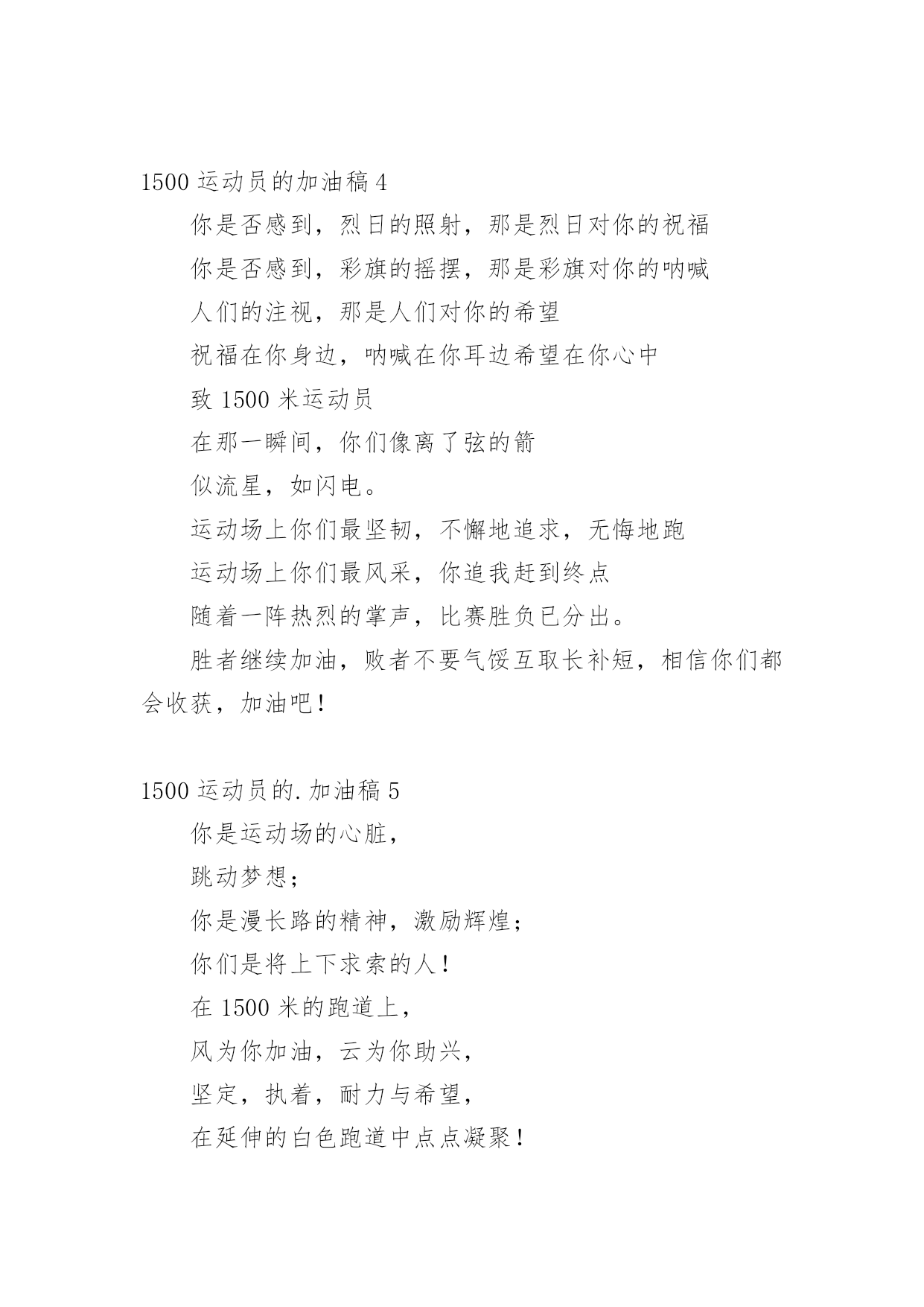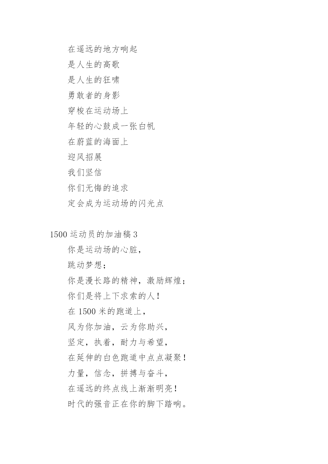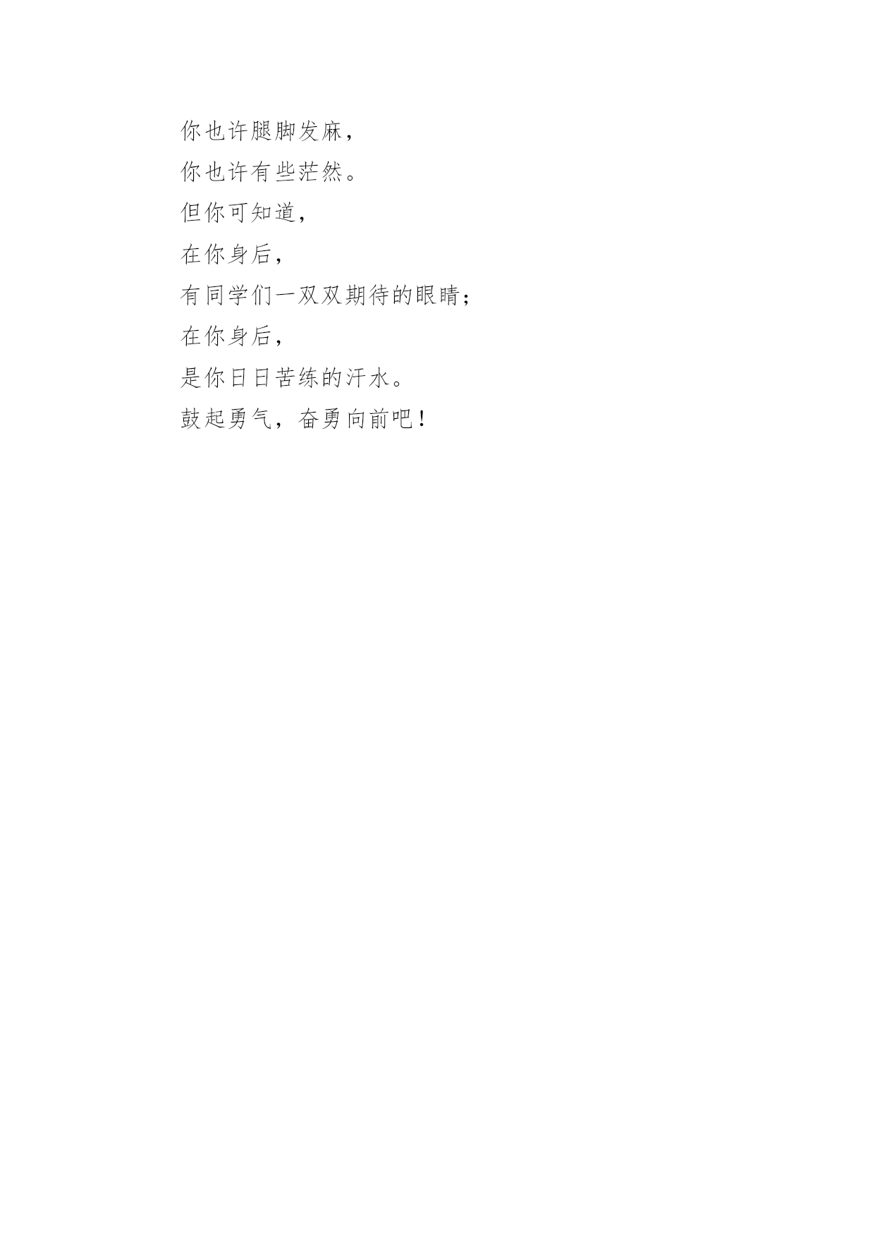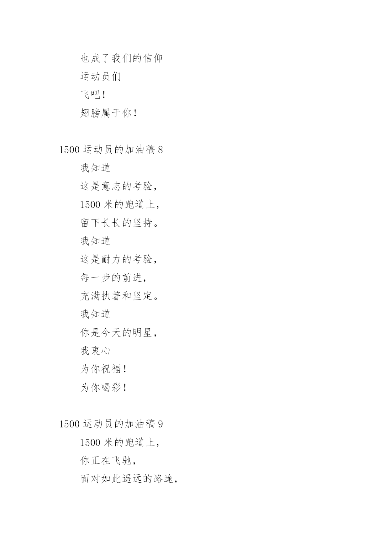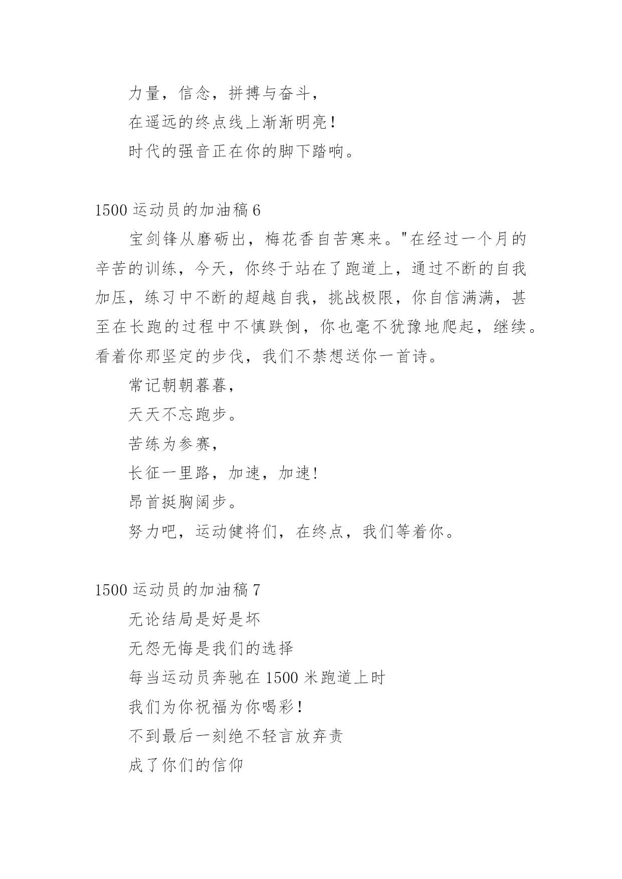 1500运动员的加油稿在现实社会中,我们需要用到加油稿的情形越来越多,借助加油稿可以活跃气氛,催人奋进。写起加油稿来就毫无头绪?以下是小编帮大家整理的1500运动员的加油稿,欢迎阅读与收藏。1500运动员的加油稿1成功从未成功的人们认为成功最甜蜜要领略仙洒的滋味须经过最痛若的寻觅沉醉在成功里的胜利者谁也说不清胜利的确切含义只有失败者失去听觉的耳朵里才迸出遥远的凯旋歌如此痛切而清晰!1500运动员的加油稿2致勇敢者心中的呐喊在遥远的地方响起是人生的高歌是人生的狂啸勇敢者的身影穿梭在运动场上年轻的心鼓成一张白帆在蔚蓝的海面上迎风招展我们坚信你们无悔的追求定会成为运动场的闪光点1500运动员的加油稿3你是运动场的心脏,跳动梦想;你是漫长路的精神,激励辉煌;你们是将上下求索的人!在1500米的跑道上,风为你加油,云为你助兴,坚定,执着,耐力与希望,在延伸的白色跑道中点点凝聚!力量,信念,拼搏与奋斗,在遥远的终点线上渐渐明亮!时代的强音正在你的脚下踏响。1500运动员的加油稿4你是否感到,烈日的照射,那是烈日对你的祝福你是否感到,彩旗的摇摆,那是彩旗对你的呐喊人们的注视,那是人们对你的希望祝福在你身边,呐喊在你耳边希望在你心中致1500米运动员在那一瞬间,你们像离了弦的箭似流星,如闪电。运动场上你们最坚韧,不懈地追求,无悔地跑运动场上你们最风采,你追我赶到终点随着一阵热烈的掌声,比赛胜负已分出。胜者继续加油,败者不要气馁互取长补短,相信你们都会收获,加油吧!1500运动员的.加油稿5你是运动场的心脏,跳动梦想;你是漫长路的精神,激励辉煌;你们是将上下求索的人!在1500米的跑道上,风为你加油,云为你助兴,坚定,执着,耐力与希望,在延伸的白色跑道中点点凝聚!力量,信念,拼搏与奋斗,在遥远的终点线上渐渐明亮!时代的强音正在你的脚下踏响。1500运动员的加油稿6宝剑锋从磨砺出,梅花香自苦寒来。"在经过一个月的辛苦的训练,今天,你终于站在了跑道上,通过不断的自我加压,练习中不断的超越自我,挑战极限,你自信满满,甚至在长跑的过程中不慎跌倒,你也毫不犹豫地爬起,继续。看着你那坚定的步伐,我们不禁想送你一首诗。常记朝朝暮暮,天天不忘跑步。苦练为参赛,长征一里路,加速,加速!昂首挺胸阔步。努力吧,运动健将们,在终点,我们等着你。1500运动员的加油稿7无论结局是好是坏无怨无悔是我们的选择每当运动员奔驰在1500米跑道上时我们为你祝福为你喝彩!不到最后一刻绝不轻言放弃责成了你们的信仰也成了我们的信仰运动员们飞吧!翅膀属于你!1500运动员的加油稿8我知道这是意志的考验,1500米的跑道上,留下长长的坚持。我知道这是耐力的考验,每一步的前进,充满执著和坚定。我知道你是今天的明星,我衷心为你祝福!为你喝彩!1500运动员的加油稿91500米的跑道上,你正在飞驰,面对如此遥远的路途,你也许腿脚发麻,你也许有些茫然。但你可知道,在你身后,有同学们一双双期待的眼睛;在你身后,是你日日苦练的汗水。鼓起勇气,奋勇向前吧!
