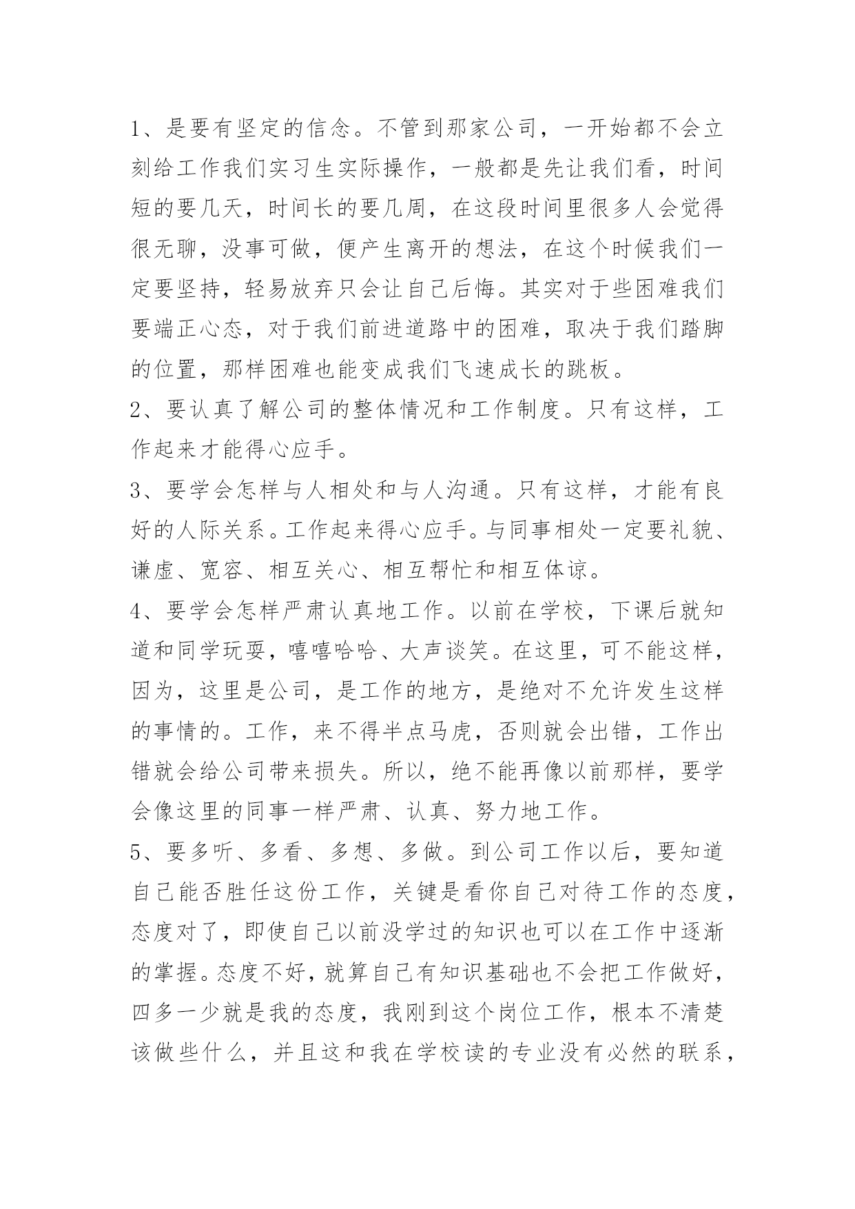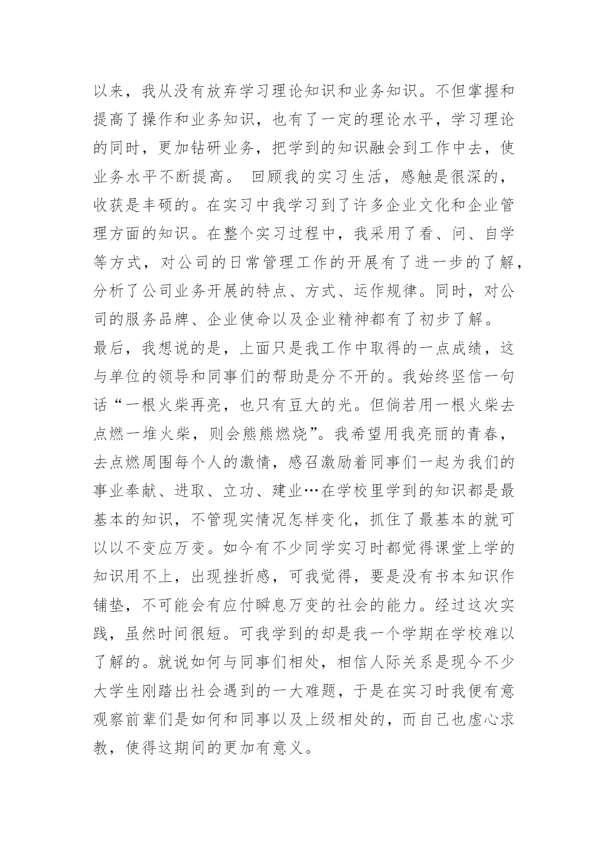 机械实结或体会机械实结或体会机械实结或体会范文通过机械实习,我了解许多课本上很难理解的许多知识。机械的传动构造,一些机器部件的构造原理等等,了解了许多常用工具。通过电工技术实习,我得到了很大的收获,这些都是平时在课堂理论学习中无法学到的,我主要的收获有以下方面.掌握了几种基本的电工工具的使用了解了电动机传动和点动控制、顺序控制、逆反转控制的概念和原理,掌握了交流继电器的原理和接线方法;掌握了西门子plc一些简单编程.本次实习,培养了我动手实践能力和细心严谨的作风。为以后的工作打下坚实的基础。六个月的实习期虽然很短,却使我懂得了很多。不仅是进行了一次良好的校外实习,还学会了在工作中如何与人相处,知道干什么,怎么干,按照规定的程序来完成工作任务。同时对冰箱这方面也有了实际操作和了解,为我以后更好的发展奠定了基础。并且在那里经过半个月的培训让我知道对一个企业而言,得控则强,失控则弱,无控则乱。企业经营好比一湖清水,管理规范好比千里长堤。水从堤转,才能因而得福,如果大堤本身千疮百孔,水就会破堤而出为祸一方。军中无法,等于自败,企业无规,等于自乱。经过这几个月实习下来,使我受益良多,具体的实践体会如下:1、是要有坚定的信念。不管到那家公司,一开始都不会立刻给工作我们实习生实际操作,一般都是先让我们看,时间短的要几天,时间长的要几周,在这段时间里很多人会觉得很无聊,没事可做,便产生离开的想法,在这个时候我们一定要坚持,轻易放弃只会让自己后悔。其实对于些困难我们要端正心态,对于我们前进道路中的困难,取决于我们踏脚的位置,那样困难也能变成我们飞速成长的跳板。2、要认真了解公司的整体情况和工作制度。只有这样,工作起来才能得心应手。3、要学会怎样与人相处和与人沟通。只有这样,才能有良好的人际关系。工作起来得心应手。与同事相处一定要礼貌、谦虚、宽容、相互关心、相互帮忙和相互体谅。4、要学会怎样严肃认真地工作。以前在学校,下课后就知道和同学玩耍,嘻嘻哈哈、大声谈笑。在这里,可不能这样,因为,这里是公司,是工作的地方,是绝对不允许发生这样的事情的。工作,来不得半点马虎,否则就会出错,工作出错就会给公司带来损失。所以,绝不能再像以前那样,要学会像这里的同事一样严肃、认真、努力地工作。5、要多听、多看、多想、多做。到公司工作以后,要知道自己能否胜任这份工作,关键是看你自己对待工作的态度,态度对了,即使自己以前没学过的知识也可以在工作中逐渐的掌握。态度不好,就算自己有知识基础也不会把工作做好,四多一少就是我的态度,我刚到这个岗位工作,根本不清楚该做些什么,并且这和我在学校读的专业没有必然的联系,刚开始我觉得很头痛,可经过工作过程中多看别人怎样做,多听别人怎样说,多想自己应该怎样做,然后自己亲自动手去多做,终于在短短几天里对工作有了一个较系统的认识,慢慢的自己也可以完成相关的工作了,光用嘴巴去说是不行的,所以,我们今后不管干什么都要端正自己的态度,这样才能把事情做好。6、要学会虚心,因为只有虚心请教才能真正学到东西,也只有虚心请教才可使自己进步快。总得来说在实习期间,虽然很辛苦,但是,在这艰苦的工作中,我却学到了不少东西,也受到了很大的启发。我明白,今后的工作还会遇到许多新的东西,这些东西会给我带来新的体验和新的体会。因此,我坚信:只要我用心去发掘,勇敢地去尝试,一定会能更大的收获和启发的。三年的大学生活是我人生中美好的回忆,我迈步向前的时候不会忘记回首凝望曾经的岁月。转眼间,我已经开始实习已有半年之久。但工作中我重新对我们现在相处的社会有了新的了解。通过实习,我得到了一次较全面的、系统的锻炼,也学到了许多书本上所学不到的知识和技能。工作以来,在单位领导的精心培育和教导下,通过自身的不断努力,无论是思想上、学习上还是工作上,都取得了长足的发展和巨大的收获。思想上,积极参加政治学习,坚持四项基本原则,拥护党的各项方针政策,自觉遵守各项法规。在工作上,对工作热情,任劳任怨,责任心强,具有良好的组织交际能力,出色完成各项工作,得到了大家的一致好评。学习上,自从参加工作以来,我从没有放弃学习理论知识和业务知识。不但掌握和提高了操作和业务知识,也有了一定的理论水平,学习理论的同时,更加钻研业务,把学到的知识融会到工作中去,使业务水平不断提高。回顾我的实习生活,感触是很深的,收获是丰硕的。在实习中我学习到了许多企业文化和企业管理方面的知识。在整个实习过程中,我采用了看、问、自学等方式,对公司的日常管理工作的开展有了进一步的了解,分析了公司业务开展的特点、方式、运作规律。同时,对公司的服务品牌、企业使命以及企业精神都有了初步了解。最后,我想说的是,上面只是我工作中取得的一点成绩,这与单位的领导和同事们的帮助是分不开的。我始终坚信一句话“一根火柴再亮,也只有豆大的光。但倘