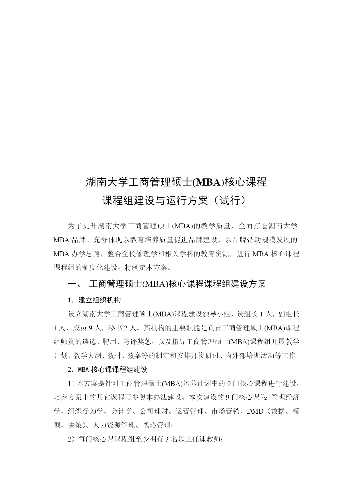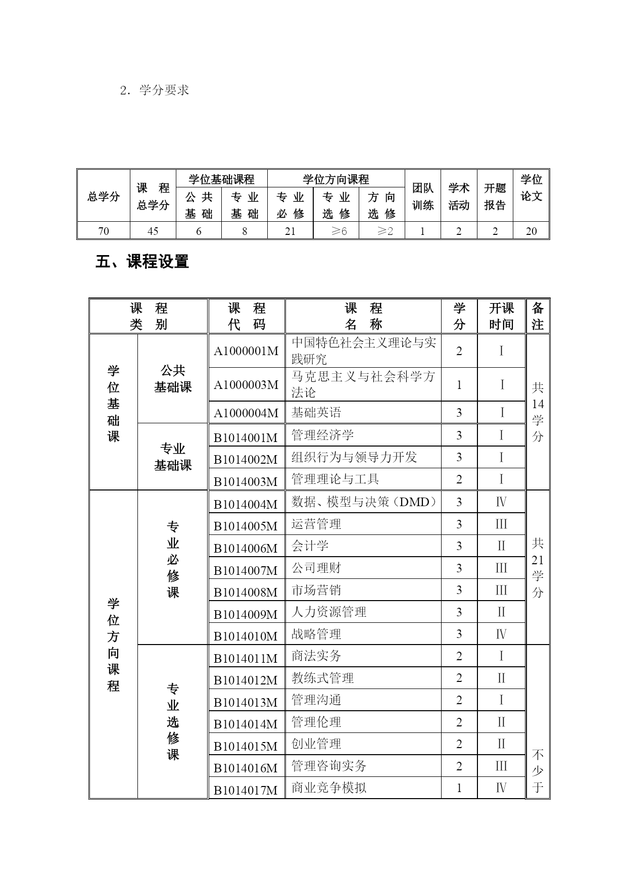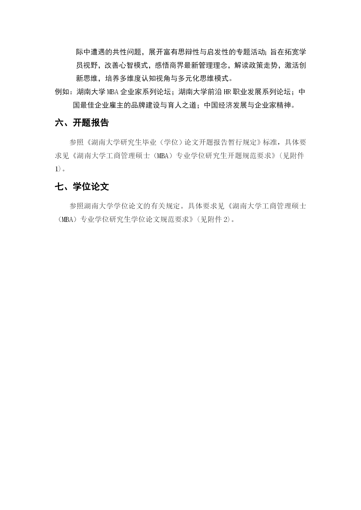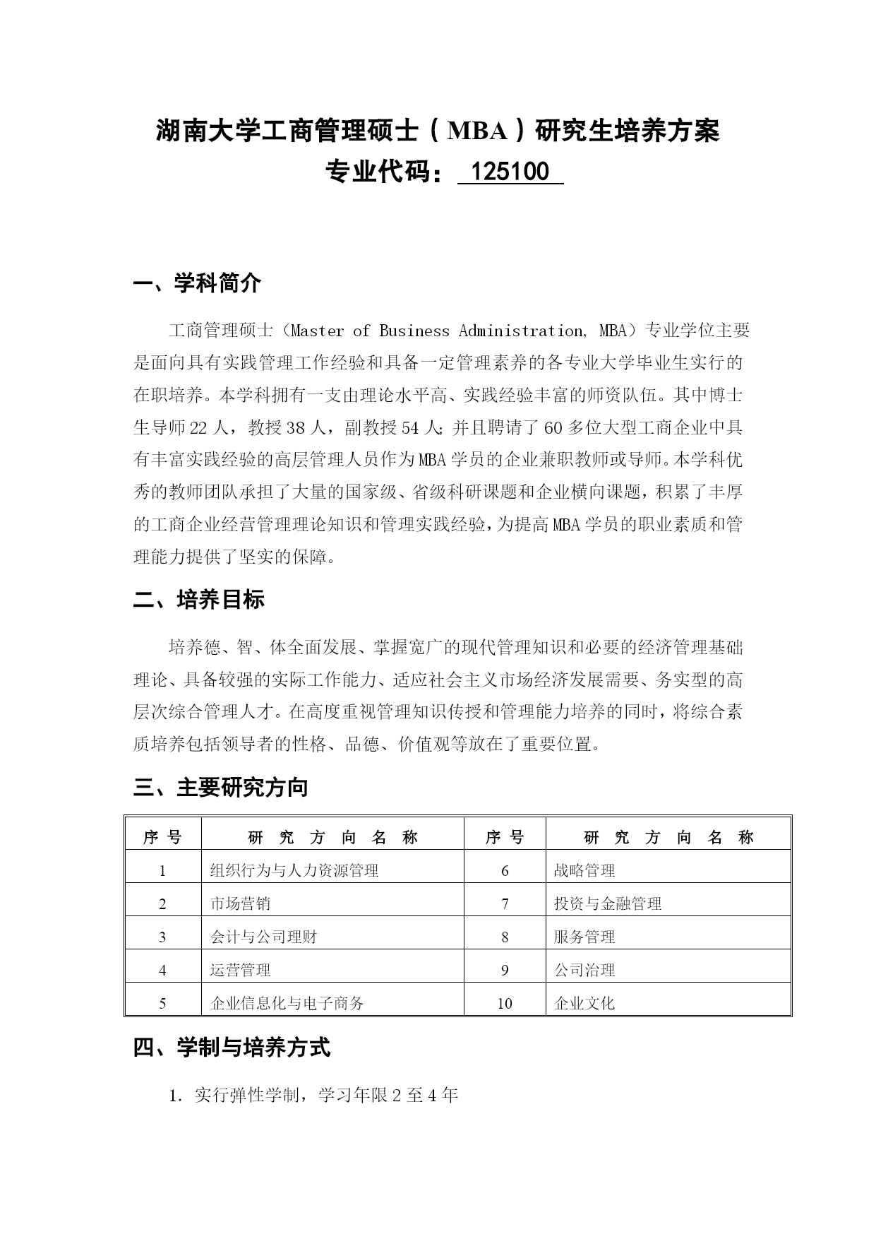 湖南大学工商管理硕士研究生培养方案(完整版)(文档可以直接使用,也可根据实际需要修改使用,可编辑欢迎下载)湖南大学工商管理硕士(MBA)研究生培养方案专业代码:125100一、学科简介工商管理硕士(MasterofBusinessAdministration,MBA)专业学位主要是面向具有实践管理工作经验和具备一定管理素养的各专业大学毕业生实行的在职培养。本学科拥有一支由理论水平高、实践经验丰富的师资队伍。其中博士生导师22人,教授38人,副教授54人;并且聘请了60多位大型工商企业中具有丰富实践经验的高层管理人员作为MBA学员的企业兼职教师或导师。本学科优秀的教师团队承担了大量的国家级、省级科研课题和企业横向课题,积累了丰厚的工商企业经营管理理论知识和管理实践经验,为提高MBA学员的职业素质和管理能力提供了坚实的保障。二、培养目标培养德、智、体全面发展、掌握宽广的现代管理知识和必要的经济管理基础理论、具备较强的实际工作能力、适应社会主义市场经济发展需要、务实型的高层次综合管理人才。在高度重视管理知识传授和管理能力培养的同时,将综合素质培养包括领导者的性格、品德、价值观等放在了重要位置。三、主要研究方向序号研究方向名称序号研究方向名称1组织行为与人力资源管理6战略管理2市场营销7投资与金融管理3会计与公司理财8服务管理4运营管理9公司治理5企业信息化与电子商务10企业文化四、学制与培养方式1.实行弹性学制,学习年限2至4年2.学分要求总学分课程总学分学位基础课程学位方向课程团队训练学术活动开题报告学位论文公共基础专业基础专业必修专业选修方向选修70456821≥6≥212220五、课程设置课程类别课程代码课程名称学分开课时间备注学位基础课公共基础课A1000001M中国特色社会主义理论与实践研究2Ⅰ共14学分A1000003M马克思主义与社会科学方法论1ⅠA1000004M基础英语3Ⅰ专业基础课B1014001M管理经济学3ⅠB1014002M组织行为与领导力开发3ⅠB1014003M管理理论与工具2Ⅰ学位方向课程专业必修课B1014004M数据、模型与决策(DMD)3Ⅳ共21学分B1014005M运营管理3ⅢB1014006M会计学3ⅡB1014007M公司理财3ⅢB1014008M市场营销3ⅢB1014009M人力资源管理3ⅡB1014010M战略管理3Ⅳ专业选修课B1014011M商法实务2Ⅰ不少于6学分B1014012M教练式管理2ⅡB1014013M管理沟通2ⅠB1014014M管理伦理2ⅡB1014015M创业管理2ⅡB1014016M管理咨询实务2ⅢB1014017M商业竞争模拟1ⅣB1014018M国学与管理思想2ⅣB1014019M财务报告阅读与分析2Ⅲ--ⅣB1014020M管理信息系统2Ⅲ(续上表):课程类别课程代码课程名称学分开课时间备注方向选修课(1)电子商务与运营管理方向不少于2学分B1014021M商务智能2Ⅲ--ⅣB1014022M物流与供应链管理2Ⅲ--ⅣB1014023M项目管理2Ⅲ--Ⅳ(2)组织行为与人力资源管理方向B1014024M劳动关系2Ⅲ--ⅣB1014025M组织设计与组织发展2Ⅲ--ⅣB1014026M职业发展管理2Ⅲ--ⅣB1014027M绩效与薪酬管理2Ⅲ--Ⅳ(3)市场营销方向B1014028M市场营销策划2Ⅲ--ⅣB1014029M市场研究2Ⅲ--ⅣB1014030M消费者行为学2Ⅲ--ⅣB1014031M客户关系管理2Ⅲ--Ⅳ(4)财务分析与管理控制方向B1014032M纳税筹划2Ⅲ--ⅣB1014033M内控与成本管理2Ⅲ--ⅣB1014034M管理审计2Ⅲ--Ⅳ(5)金融管理方向B1014035M金融市场与金融机构2Ⅲ--ⅣB1014036M金融工程理论与实务2Ⅲ--ⅣB1014037M国际金融管理2Ⅲ--ⅣB1014038M投资学2Ⅲ--Ⅳ(6)服务管理方向B1014039M服务营销管理2Ⅲ--ⅣB1014040M质量管理与服务运营2Ⅲ--ⅣB1014041M服务技术与效率管理2Ⅲ--Ⅳ注:1.团队训练。团队训练必须在开题前完成;“外聘专家”是指具有硕士学位及以上学历或具有高级职并在企业或政府、事业单位居于高层管理职务的现任管理者。2.专业方向论坛。讲座与论坛主题的选择多依据企业界新热点,企业管理实际中遭遇的共性问题,展开富有思辩性与启发性的专题活动;旨在拓宽学员视野,改善心智模式,感悟商界最新管理理念,解读政策走势,激活创新思维,培养多维度认知视角与多元化思维模式。例如:湖南大学M