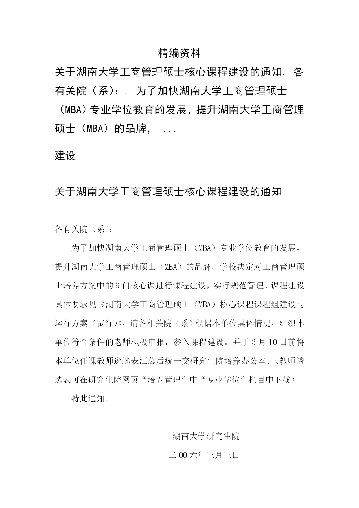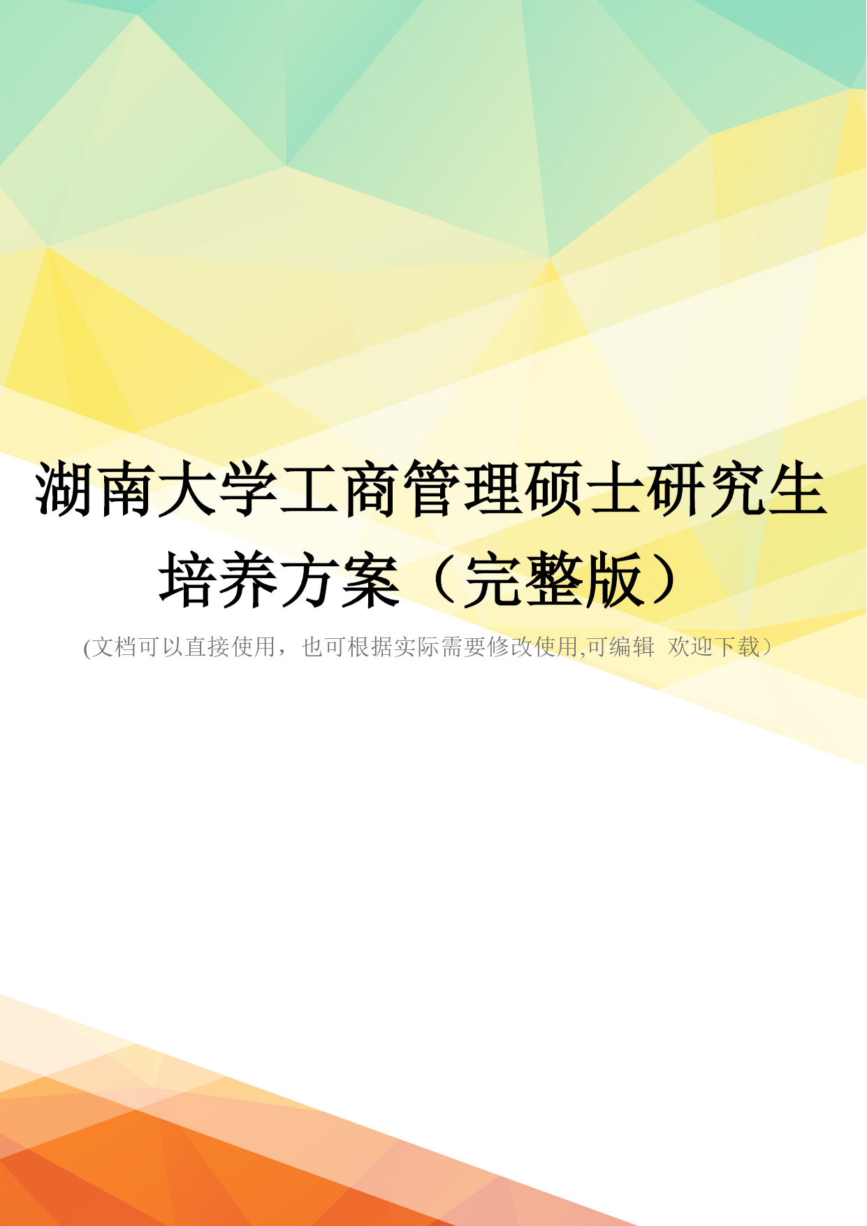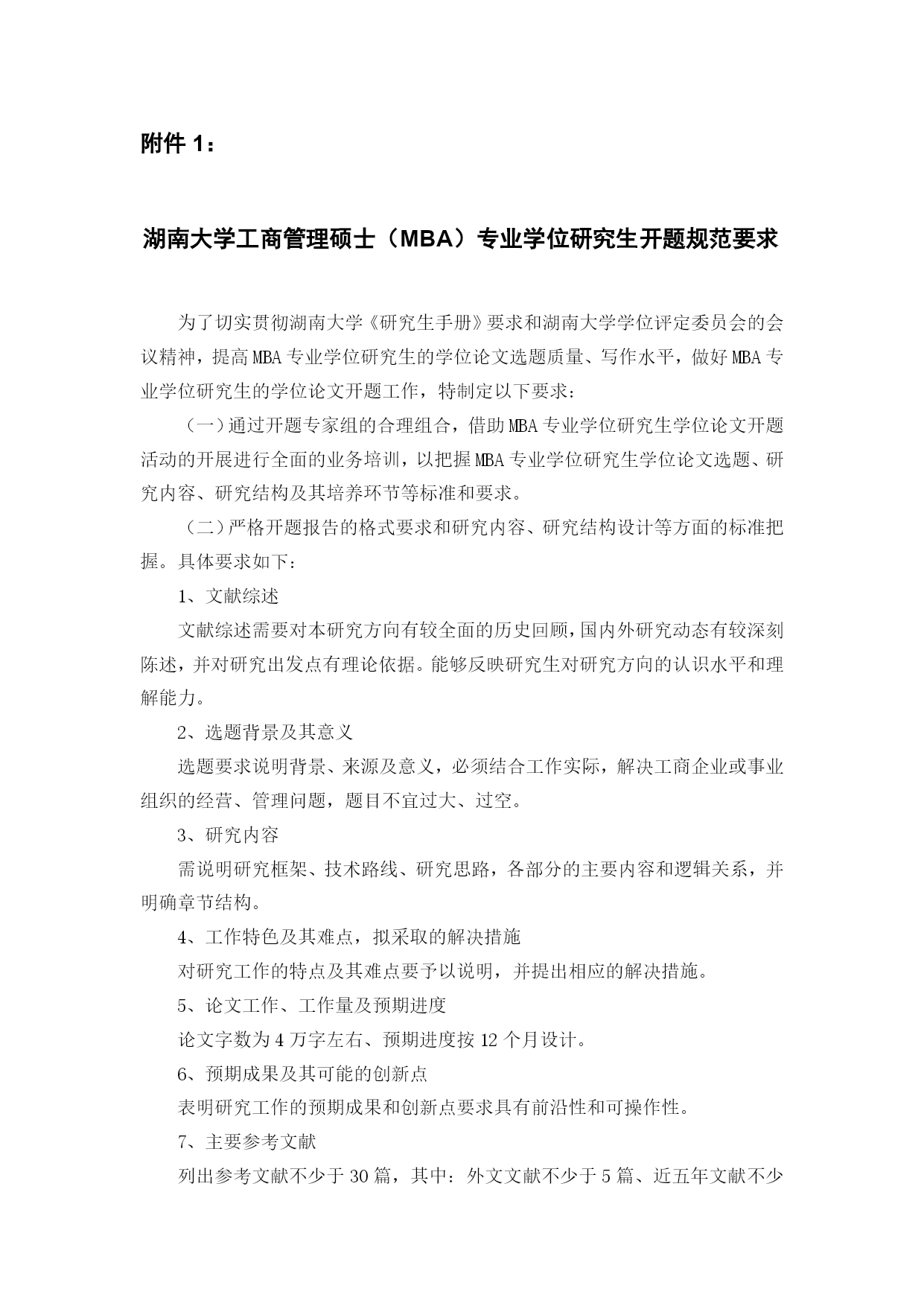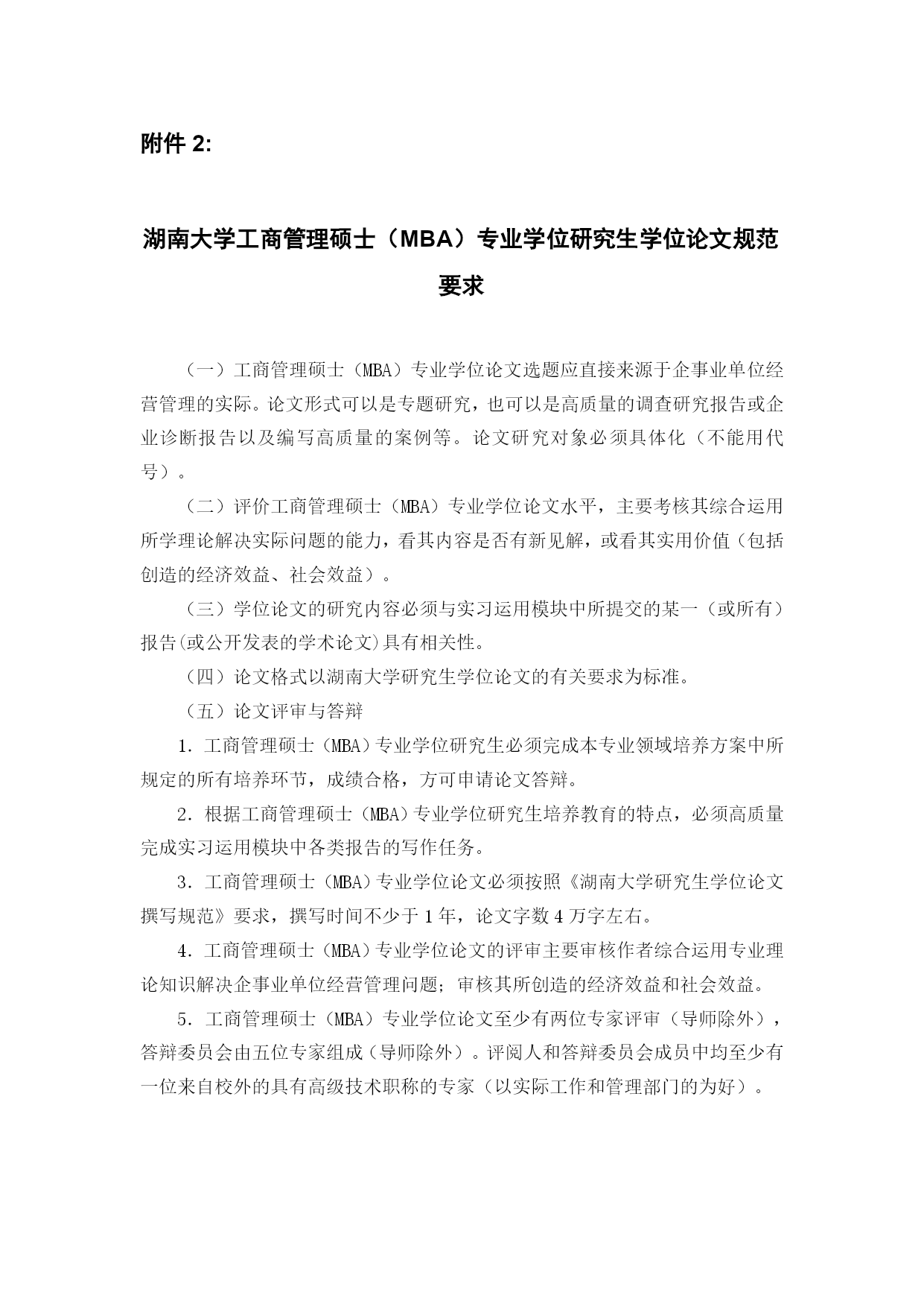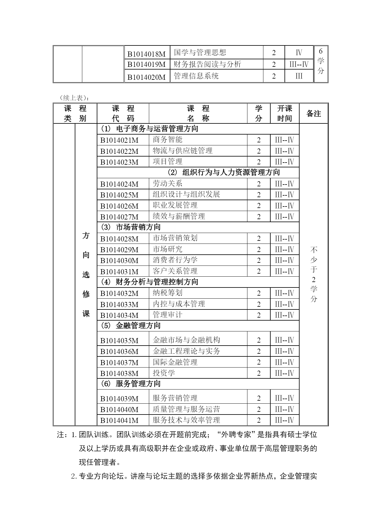 湖南大学工商管理硕士研究生培养方案(完整版)(文档可以直接使用,也可根据实际需要修改使用,可编辑欢迎下载)湖南大学工商管理硕士(MBA)研究生培养方案专业代码:125100一、学科简介工商管理硕士(MasterofBusinessAdministration,MBA)专业学位主要是面向具有实践管理工作经验和具备一定管理素养的各专业大学毕业生实行的在职培养。本学科拥有一支由理论水平高、实践经验丰富的师资队伍。其中博士生导师22人,教授38人,副教授54人;并且聘请了60多位大型工商企业中具有丰富实践经验的高层管理人员作为MBA学员的企业兼职教师或导师。本学科优秀的教师团队承担了大量的国家级、省级科研课题和企业横向课题,积累了丰厚的工商企业经营管理理论知识和管理实践经验,为提高MBA学员的职业素质和管理能力提供了坚实的保障。二、培养目标培养德、智、体全面发展、掌握宽广的现代管理知识和必要的经济管理基础理论、具备较强的实际工作能力、适应社会主义市场经济发展需要、务实型的高层次综合管理人才。在高度重视管理知识传授和管理能力培养的同时,将综合素质培养包括领导者的性格、品德、价值观等放在了重要位置。三、主要研究方向序号研究方向名称序号研究方向名称1组织行为与人力资源管理6战略管理2市场营销7投资与金融管理3会计与公司理财8服务管理4运营管理9公司治理5企业信息化与电子商务10企业文化四、学制与培养方式1.实行弹性学制,学习年限2至4年2.学分要求总学分课程总学分学位基础课程学位方向课程团队训练学术活动开题报告学位论文公共基础专业基础专业必修专业选修方向选修70456821≥6≥212220五、课程设置课程类别课程代码课程名称学分开课时间备注学位基础课公共基础课A1000001M中国特色社会主义理论与实践研究2Ⅰ共14学分A1000003M马克思主义与社会科学方法论1ⅠA1000004M基础英语3Ⅰ专业基础课B1014001M管理经济学3ⅠB1014002M组织行为与领导力开发3ⅠB1014003M管理理论与工具2Ⅰ学位方向课程专业必修课B1014004M数据、模型与决策(DMD)3Ⅳ共21学分B1014005M运营管理3ⅢB1014006M会计学3ⅡB1014007M公司理财3ⅢB1014008M市场营销3ⅢB1014009M人力资源管理3ⅡB1014010M战略管理3Ⅳ专业选修课B1014011M商法实务2Ⅰ不少于6学分B1014012M教练式管理2ⅡB1014013M管理沟通2ⅠB1014014M管理伦理2ⅡB1014015M创业管理2ⅡB1014016M管理咨询实务2ⅢB1014017M商业竞争模拟1ⅣB1014018M国学与管理思想2ⅣB1014019M财务报告阅读与分析2Ⅲ--ⅣB1014020M管理信息系统2Ⅲ(续上表):课程类别课程代码课程名称学分开课时间备注方向选修课(1)电子商务与运营管理方向不少于2学分B1014021M商务智能2Ⅲ--ⅣB1014022M物流与供应链管理2Ⅲ--ⅣB1014023M项目管理2Ⅲ--Ⅳ(2)组织行为与人力资源管理方向B1014024M劳动关系2Ⅲ--ⅣB1014025M组织设计与组织发展2Ⅲ--ⅣB1014026M职业发展管理2Ⅲ--ⅣB1014027M绩效与薪酬管理2Ⅲ--Ⅳ(3)市场营销方向B1014028M市场营销策划2Ⅲ--ⅣB1014029M市场研究2Ⅲ--ⅣB1014030M消费者行为学2Ⅲ--ⅣB1014031M客户关系管理2Ⅲ--Ⅳ(4)财务分析与管理控制方向B1014032M纳税筹划2Ⅲ--ⅣB1014033M内控与成本管理2Ⅲ--ⅣB1014034M管理审计2Ⅲ--Ⅳ(5)金融管理方向B1014035M金融市场与金融机构2Ⅲ--ⅣB1014036M金融工程理论与实务2Ⅲ--ⅣB1014037M国际金融管理2Ⅲ--ⅣB1014038M投资学2Ⅲ--Ⅳ(6)服务管理方向B1014039M服务营销管理2Ⅲ--ⅣB1014040M质量管理与服务运营2Ⅲ--ⅣB1014041M服务技术与效率管理2Ⅲ--Ⅳ注:1.团队训练。团队训练必须在开题前完成;“外聘专家”是指具有硕士学位及以上学历或具有高级职并在企业或政府、事业单位居于高层管理职务的现任管理者。2.专业方向论坛。讲座与论坛主题的选择多依据企业界新热点,企业管理实际中遭遇的共性问题,展开富有思辩性与启发性的专题活动;旨在拓宽学员视野,改善心智模式,感悟商界最新管理理念,解读政策走势,激活创新思维,培养多维度认知视角与多元化思维模式。例如:湖南大学M