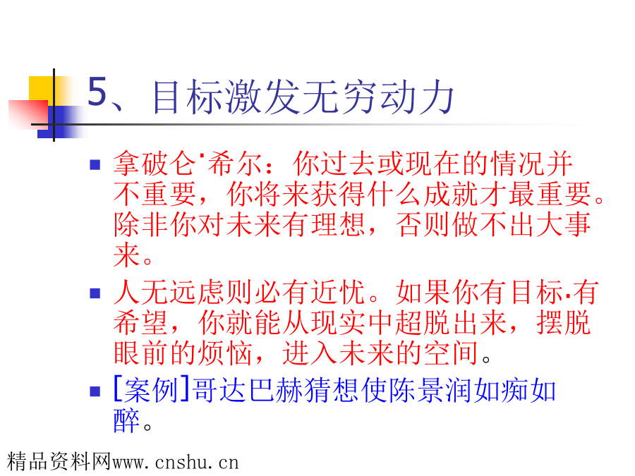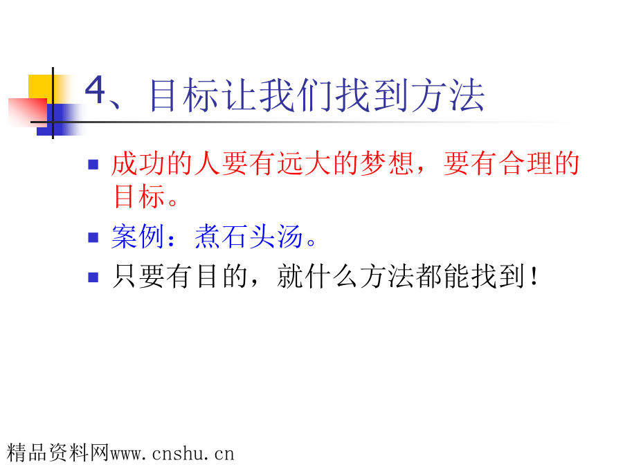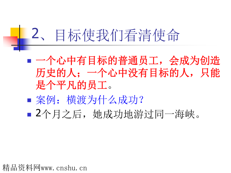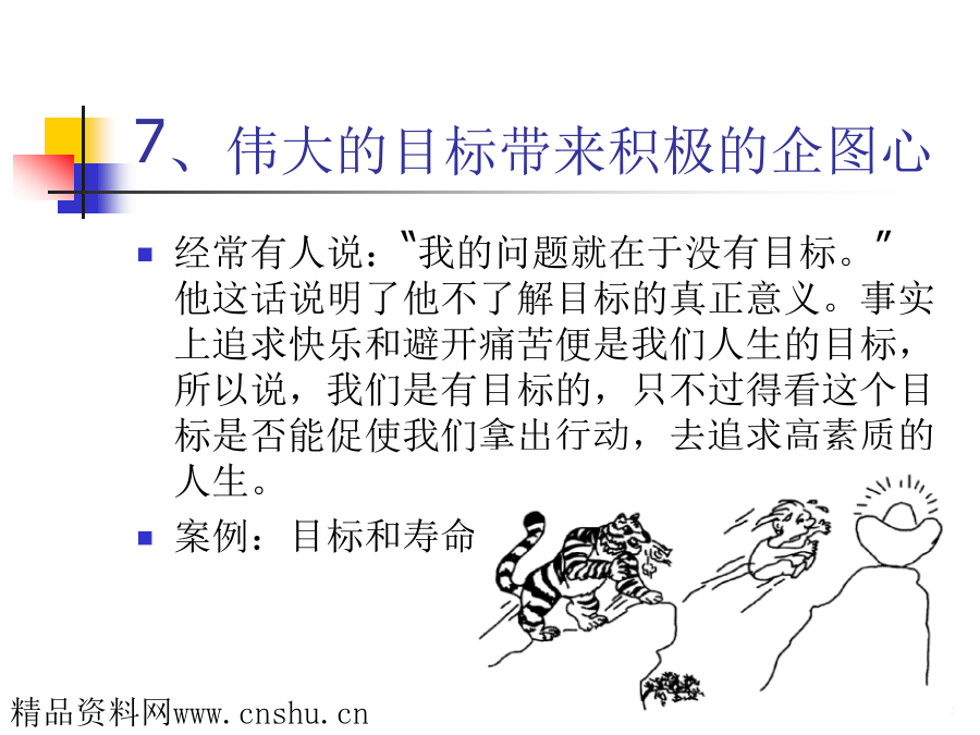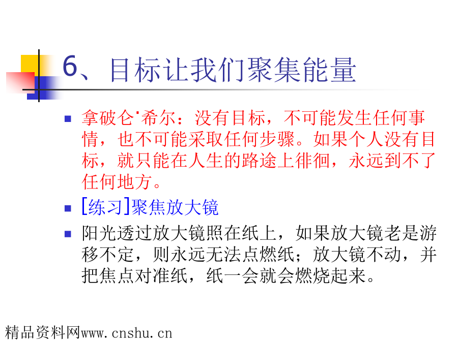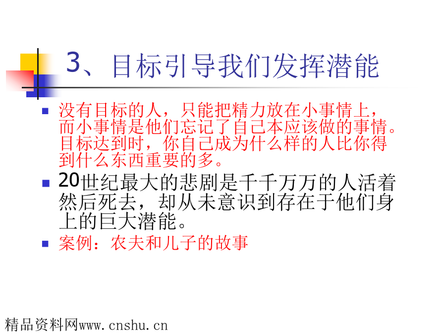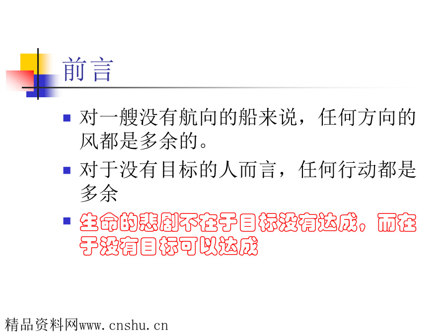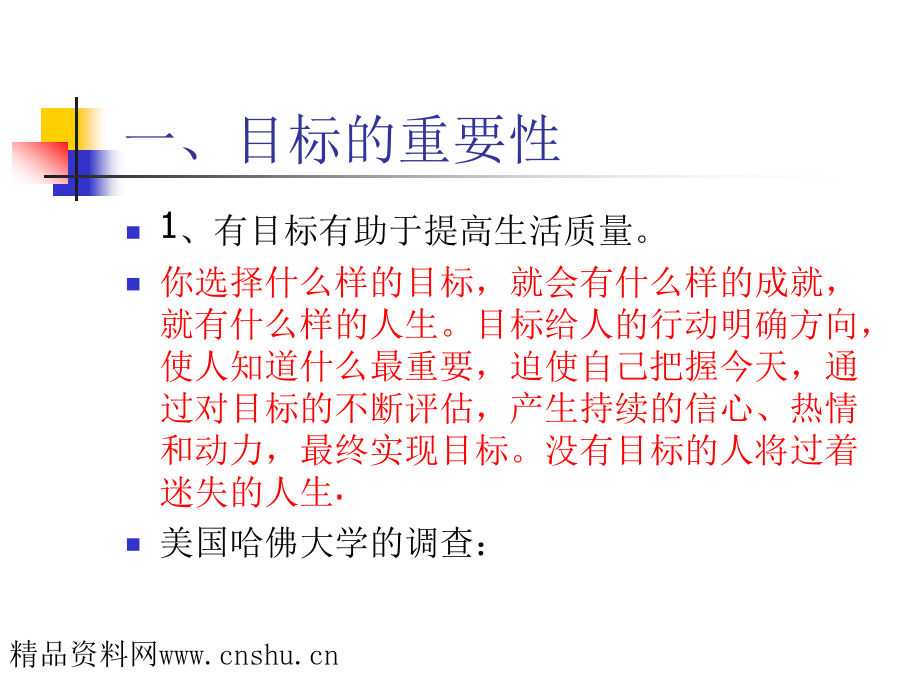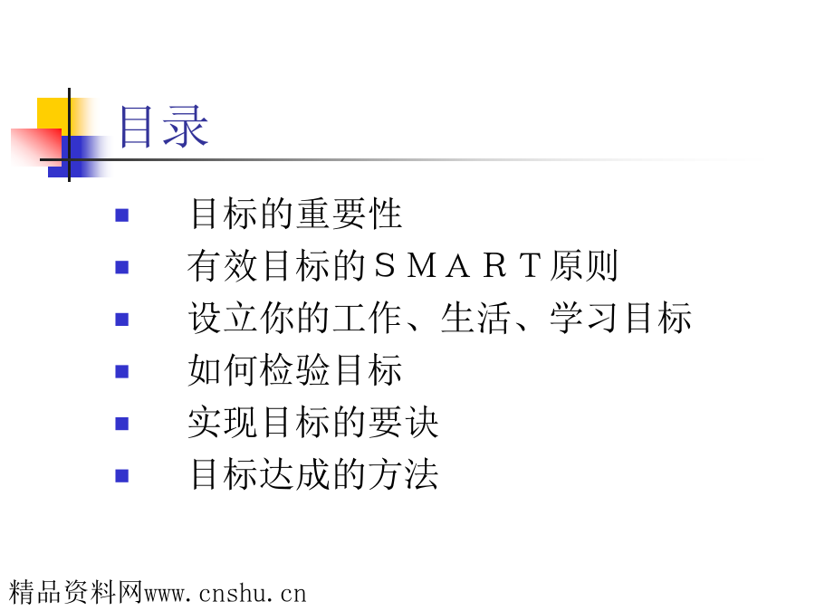 第一讲目标管理前言目录一、目标的重要性2、目标使我们看清使命3、目标引导我们发挥潜能4、目标让我们找到方法5、目标激发无穷动力6、目标让我们聚集能量7、伟大的目标带来积极的企图心8、清晰的目标让人们享受过程,并快速达到目标9、实现目标就是成功人们为什么不设定目标人类因为梦想才伟大练习二、有效目标的SMART原则2、什么才是一个有效的目标3、不要自我设限4、订出超越自我的目标5、找到足够的理由三、设定你的工作、学习、生活目标步骤一:在空白的纸上写下一切有关于你自己的个人发展目标,这包括体能上的、情绪上的、心灵上的和知识上的。你希望有个什么样的身体状况?你想学些什么(譬如哪一国的语言)?你想学会速读吗?你希望不再意志消沉或杞人忧天吗?你希望去跟曾经和你闹别扭的人讲和吗?你希望在信仰上更加深入吗?你在写这些目标时别禁制脑中所想,它们可以是一周或一年内达成的短期目标,也可以是二十年内达成的长期目标,你要一直不停地写上五分钟。像个孩子一样,别管所想的在旁人的眼中看来是否可笑,就是照实地写下来,因为有时候一个怪异的想法就可能把你带向伟大的人生。步骤二:此刻你已经有了一张令你动心的个人发展目标,接下来便是给每个目标订下完成的时间表,你不必管这个目标是不是能够完成,只要订出所有目标完成的时间架构即可。记住,有完成的时间才叫目标,否则那只能算是梦。当你把这些目标订下了完成的期限,你的脑神经系统便会不知不觉地把你带向实现目标的方向。如果你决定那个目标要在一年之内完成,那么就在它的后面写个“一”字;如果你决定那个目标要在三年之内完成,那么就在它的后面写个“三”字。以此类推,一直把目标写到二十年。步骤三:现在从一年之内的目标中挑出自认为最重要的一个,这个目标若是能够在这一年中完成的话,将会使你极为快乐和振奋,同时也会让你觉得投资的极为值得。你要花两分钟的时间,写下为什么要下定决心把这个目标在一年之内完成?为什么这个目标你认为这么重要?完成后你将会有什么收获?如果没有完成你将会有什么样的损失?这些理由是否有足够让你去完成的说服力?如果没有的话,那就另外找个更好的目标或更好的理由。2、事业经济的目标步骤一:写下你所希望的未来事业、经济状况,到底你希望拥有什么样规模的财富?你希望能达到什么样的地位?现在就请你花五分钟写下价值一百万美元的目标吧!步骤二:现在你也写下了一切有关于你事业及经济的目标,接下来便是为这些目标订出想要完成的时间表。如果你决心在一年之内完成的目标,那就在其后写个“一”字;如果你决心在二年或三年之内完成的目标,那就在其后写个“二”或“三”字。其他的就等而类推地写下去。做这个步骤时你要记得,别去管这些目标是不是真能达成,也别管每个目标所订的期限是否合理,只要你有决心要在所订的期限里完成就是了。步骤三:在这些目标中挑出你决心在一年之内完成的,然后在它的后面写下你为什么要在一年之内完成它的原因。你要尽可能列出必须的原因,让这些原因真是推动你、振奋你的动力来源。如果这些原因还不足以让你动心,还不足以使你拿出积极的行动,那么你最好换个更好的目标或找些更好的理由。步骤一:请花五分钟写下人生中希望有的、希望做的以及希望经历的,步骤二及三:再一次请你检查一下所写下的每一个目标,从里面挑出一年之中最希望完成的一个目标,然后用两分钟写下为什么要完成的充分理由。同样地,这些理由必须能够打动你去实现这个目标,如果理由不够充分的话,那就请你换个更好的目标吧!4、恭喜你完成目标,跨出了成功路上非常重要的一步注意个人目标与公司目标结合4.我的资源有哪些?我有什么东西可以作为资源?我有哪些个人持质?哪些人可以帮助我?我拥有哪些角色模式?我的预算有多少?5.我能够开始并维持这个成果目标吗?我可以直接做哪些事情来实现我的成果目标?有哪些事情由我控制?而又有哪些事情不由我控制?我可以做哪些事情来说服和影响他人帮助我?6.较宽泛的成果目标是什么?我需要什么时候并做出何种努力才能实现这个成果目标?我需要投入多少资金才能实现这个成果目标?要实现这个成果目标,还有谁会受到影响,他们对此会有何感受?我现在所处的环境有何优势?我怎样才能保持现状中较为有利的情形呢?7.这个成果目标与我相符吗?这个成果目标符合我的身份吗?我感到这个成果目标前后一致吗?这是我们的处事方式吗?8.这个成果目标怎样与其他成果目标融合在一起呢?这部分对较大的成果目标会有什么贡献呢?为了克服障碍.有哪些较小的成果目标需要实现呢?9.行动计划是什么?由谁来负责?有哪些人参与?参与者将扮演什么角色?需要让哪些人知道相关信息?注意事项:集中你的资源,一般地说,你的资源可以分为以下五大类1)你具有什么东西?建筑物和计算机设备等。2)什么人可以帮助你?你的下属、高层经理人、咨询师、顾客、供应