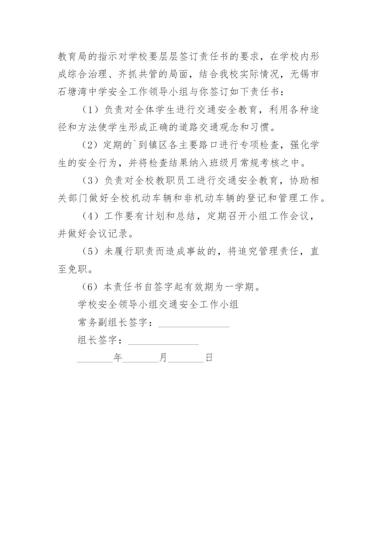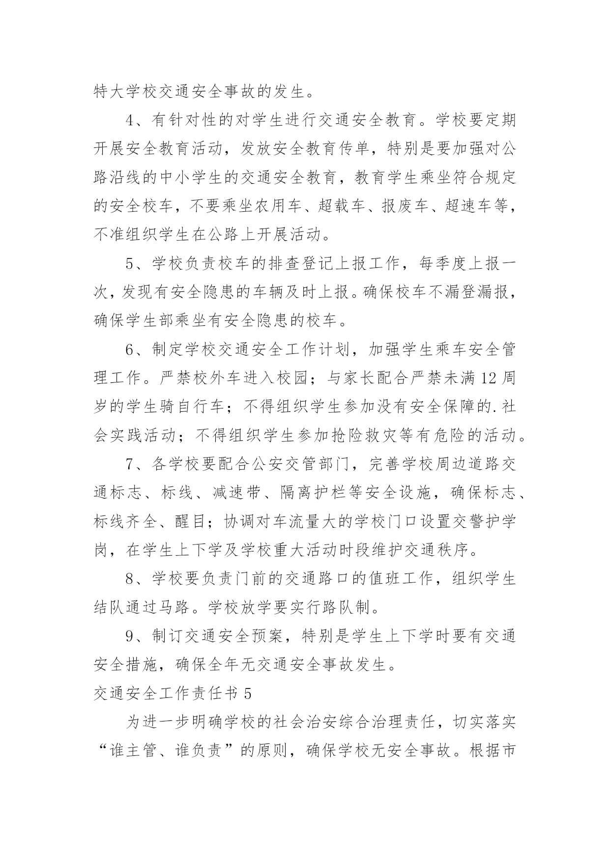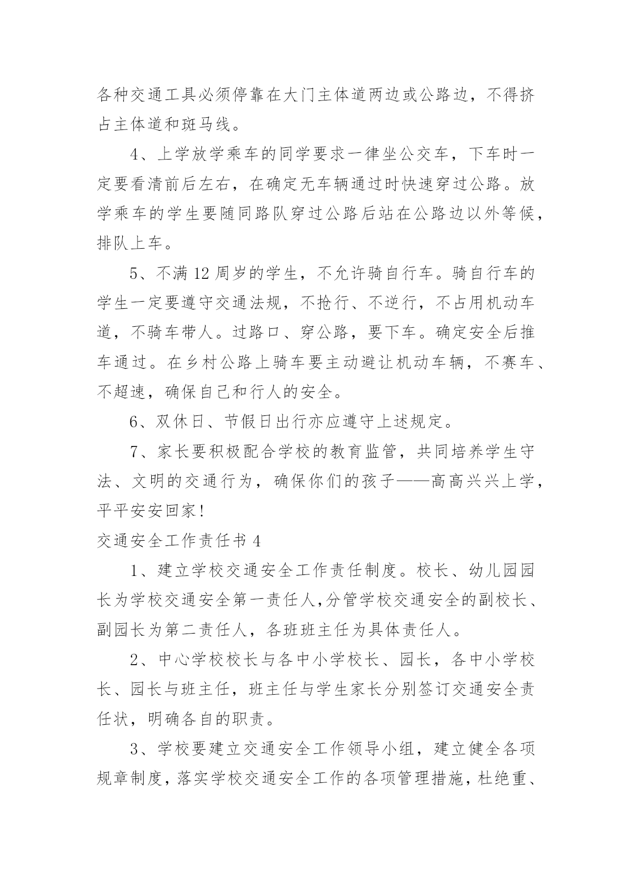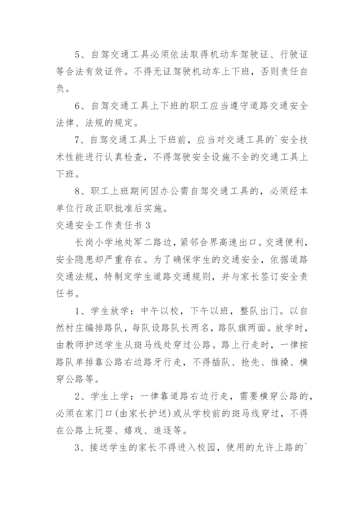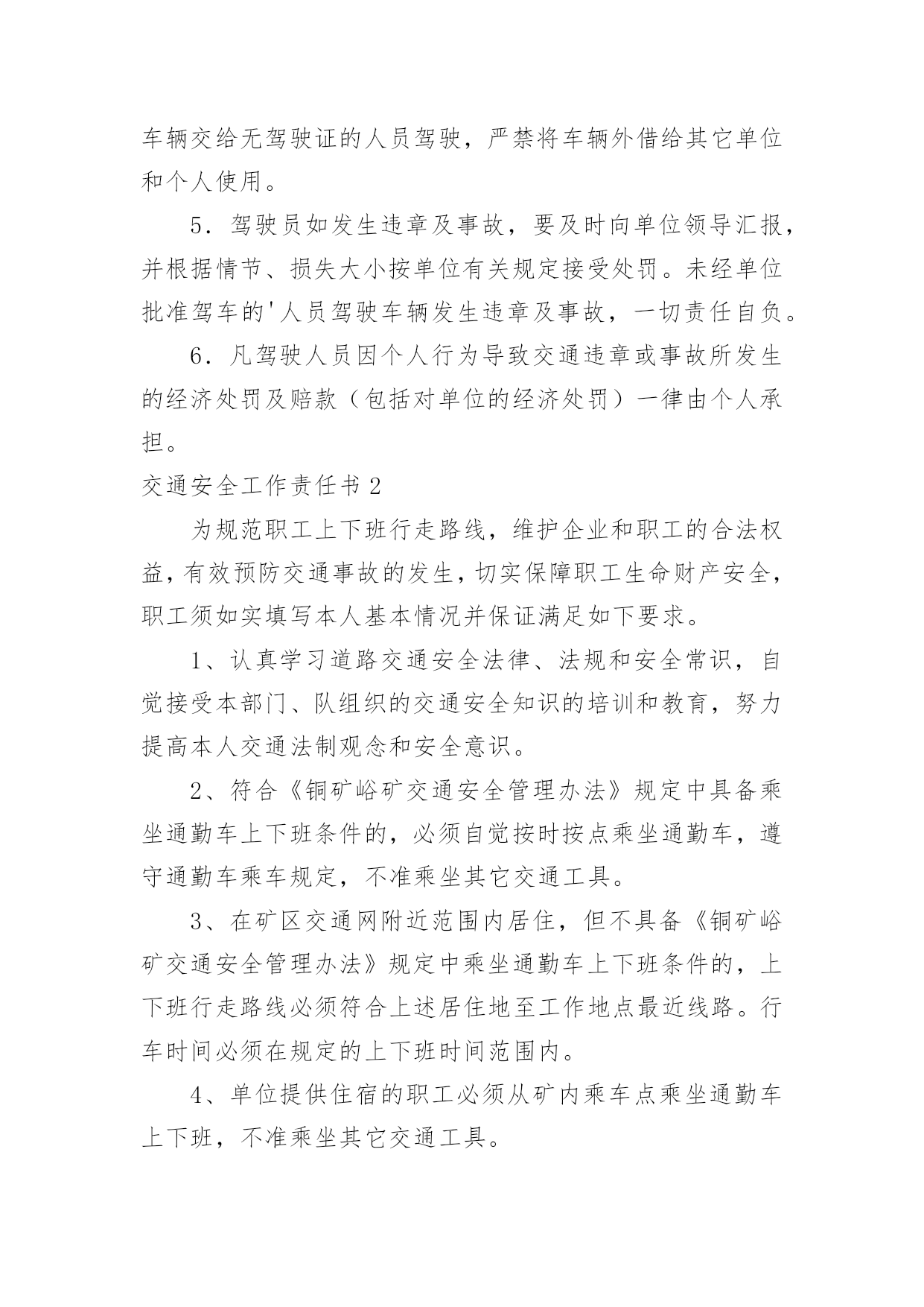 交通安全工作责任书交通安全工作责任书在快速变化和不断变革的今天,责任书的使用频率逐渐增多,签订责任书可以有效增强我们的责任意识。拟起责任书来就毫无头绪?下面是小编收集整理的交通安全工作责任书,欢迎阅读,希望大家能够喜欢。交通安全工作责任书1为进一步提高驾驶人员交通安全意识,减少交通事故,保证机关工作的正常进行,特签定如下协议:1.严格遵守交通规则,讲究交通公德和职业道德,文明驾驶、礼貌行车,服从交通民警的指挥。按时参加交通法规学习和交通管理部门组织的活动,驾驶证按时进行年审。2.加强车辆日常维修、保养工作,做到出车前、途中、收车后仔细检查车辆,发现问题及时修理,确保车辆车况良好。不准驾驶机件失灵的车辆。车辆按时进行年审。3.驾驶人员接到单位领导的派车通知后,到办公室领取派车单,即可出车。不得擅自开公车办私事,未经批准开公车外出造成一切损失及引发的民事、刑事纠纷,由本人负责。4、行车途中严格遵守道路交通法规及安全操作规程,杜绝交通违章。严禁酒后开车,严禁违章超速行驶,严禁将车辆交给无驾驶证的人员驾驶,严禁将车辆外借给其它单位和个人使用。5.驾驶员如发生违章及事故,要及时向单位领导汇报,并根据情节、损失大小按单位有关规定接受处罚。未经单位批准驾车的'人员驾驶车辆发生违章及事故,一切责任自负。6.凡驾驶人员因个人行为导致交通违章或事故所发生的经济处罚及赔款(包括对单位的经济处罚)一律由个人承担。交通安全工作责任书2为规范职工上下班行走路线,维护企业和职工的合法权益,有效预防交通事故的发生,切实保障职工生命财产安全,职工须如实填写本人基本情况并保证满足如下要求。1、认真学习道路交通安全法律、法规和安全常识,自觉接受本部门、队组织的交通安全知识的培训和教育,努力提高本人交通法制观念和安全意识。2、符合《铜矿峪矿交通安全管理办法》规定中具备乘坐通勤车上下班条件的,必须自觉按时按点乘坐通勤车,遵守通勤车乘车规定,不准乘坐其它交通工具。3、在矿区交通网附近范围内居住,但不具备《铜矿峪矿交通安全管理办法》规定中乘坐通勤车上下班条件的,上下班行走路线必须符合上述居住地至工作地点最近线路。行车时间必须在规定的上下班时间范围内。4、单位提供住宿的职工必须从矿内乘车点乘坐通勤车上下班,不准乘坐其它交通工具。5、自驾交通工具必须依法取得机动车驾驶证、行驶证等合法有效证件。不得无证驾驶机动车上下班,否则责任自负。6、自驾交通工具上下班的职工应当遵守道路交通安全法律、法规的规定。7、自驾交通工具上下班前,应当对交通工具的`安全技术性能进行认真检查,不得驾驶安全设施不全的交通工具上下班。8、职工上班期间因办公需自驾交通工具的,必须经本单位行政正职批准后实施。交通安全工作责任书3长岗小学地处军二路边,紧邻合界高速出口。交通便利,安全隐患却严重存在。为了确保学生的交通安全,依据道路交通法规,特制定学生道路交通规则,并与家长签订安全责任书。1、学生放学:中午以校,下午以班,整队出门。以自然村庄编排路队,每队设路队长两名,路队旗两面。放学时,由教师护送学生从斑马线处穿过公路。路上行走时,一律按路队单排靠公路右边路牙行走,不得插队、抢先、推搡、横穿公路等。2、学生上学:一律靠道路右边行走,需要横穿公路的,必须在家门口(由家长护送)或从学校前的斑马线穿过,不得在公路上玩耍、嬉戏、追逐等。3、接送学生的家长不得进入校园,使用的允许上路的`各种交通工具必须停靠在大门主体道两边或公路边,不得挤占主体道和斑马线。4、上学放学乘车的同学要求一律坐公交车,下车时一定要看清前后左右,在确定无车辆通过时快速穿过公路。放学乘车的学生要随同路队穿过公路后站在公路边以外等候,排队上车。5、不满12周岁的学生,不允许骑自行车。骑自行车的学生一定要遵守交通法规,不抢行、不逆行,不占用机动车道,不骑车带人。过路口、穿公路,要下车。确定安全后推车通过。在乡村公路上骑车要主动避让机动车辆,不赛车、不超速,确保自己和行人的安全。6、双休日、节假日出行亦应遵守上述规定。7、家长要积极配合学校的教育监管,共同培养学生守法、文明的交通行为,确保你们的孩子——高高兴兴上学,平平安安回家!交通安全工作责任书41、建立学校交通安全工作责任制度。校长、幼儿园园长为学校交通安全第一责任人,分管学校交通安全的副校长、副园长为第二责任人,各班班主任为具体责任人。2、中心学校校长与各中小学校长、园长,各中小学校长、园长与班主任,班主任与学生家长分别签订交通安全责任状,明确各自的职责。3、学校要建立交通安全工作领导小组,建立健全各项规章制度,落实学校交通安全工作的各项管理措施,杜绝重、特大学校交通安全事故的发生。4、有针对性的对学生进行交通安全教育。学校要定期开展安全教育活动,发放安全教育传单,特别是要加强对公路沿线的中小学