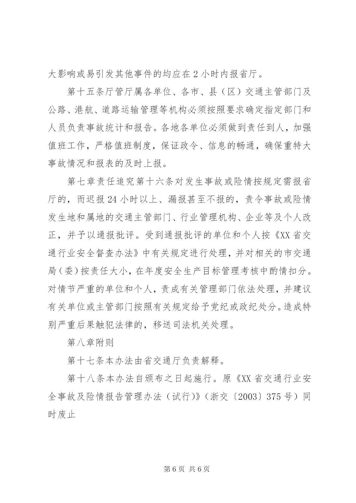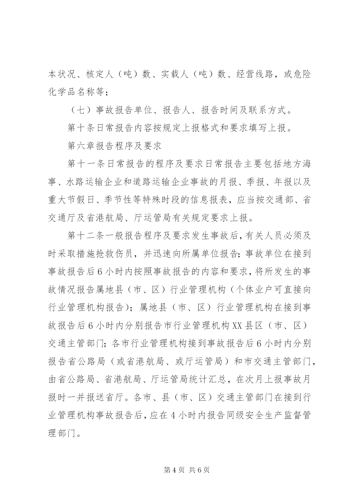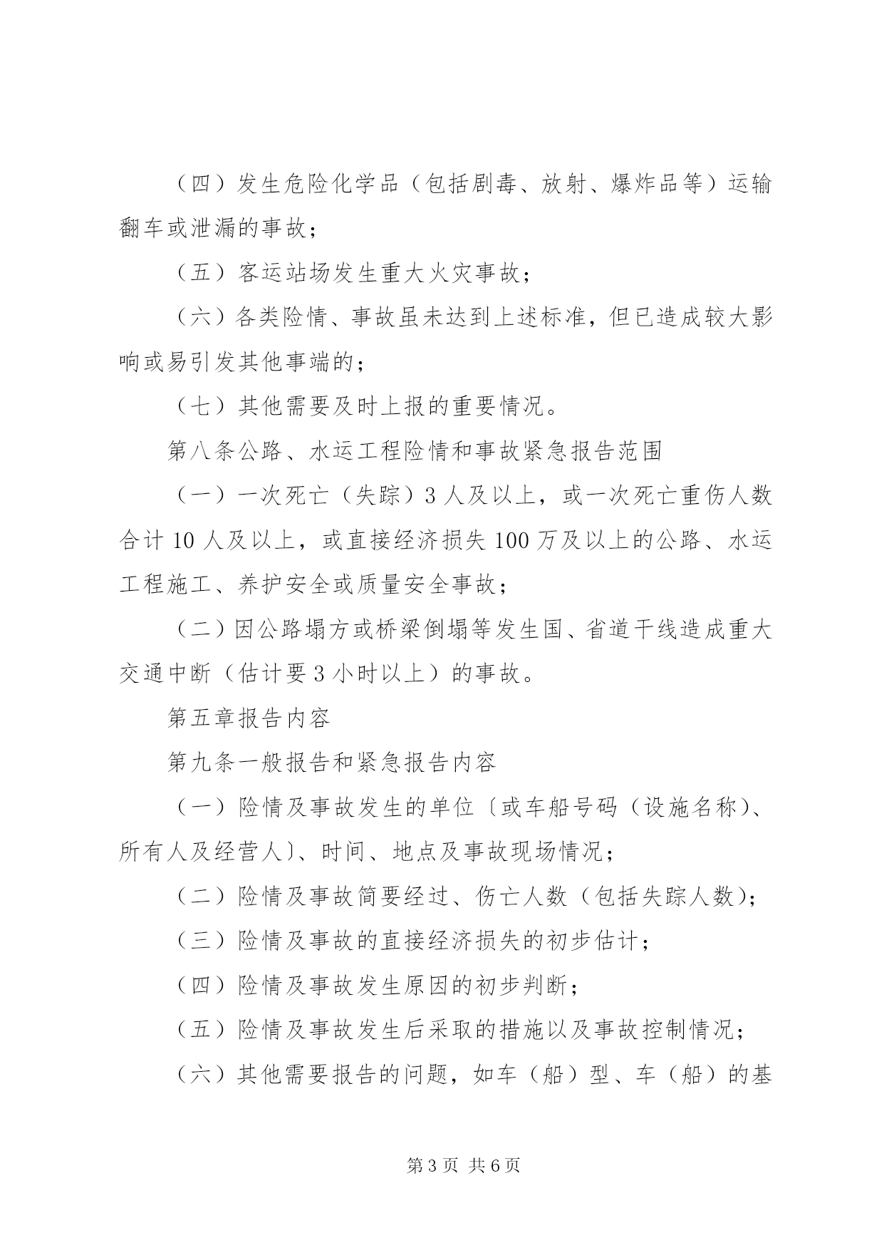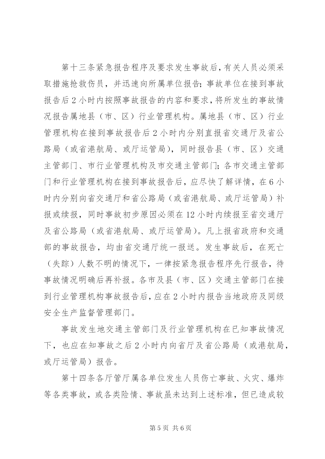 第PAGE\*Arabic\*MERGEFORMAT6页共NUMPAGES\*MERGEFORMAT6页XX省交通行业安全事故及险情报告管理办法(2004年11月15日省交通厅浙交〔2004〕493号印发)第一章总则第一条为及时、准确、全面反映全省交通行业安全情况,妥善处理交通行业安全中的事故及险情,做好交通行业安全管理工作,根据国家和省有关规定,结合我省交通实际,制定本办法。第二条本办法适用范围是全省交通行业中发生的安全事故及险情或自然灾害事故。第三条本办法适用对象是本省范围内各级交通主管部门及其行业管理机构,以及各运输(港口)业户、公路水路工程施工、养护等单位和个人。在浙外省相关单位的事故及险情报告参照本办法。第二章日常报告范围第四条日常报告指根据国家、部、省及行业管理部门要求需上报的月报、季报或年报,以及重大节假日、季节性等特殊时段的信息报表等。第三章一般报告范围第五条遇险人数1至4人,或一次死亡(失踪)1至2人,或一次重伤3-9人的事故,或无人员伤亡但直接经济损失50万以上100万以下的道路、水路运输事故,或重大公路、水运工程安全事故,或重大车(船)火灾事故,或因发生公路塌方等造成国、省道交通中断情况(估计在3小时以内的),或涉及1至4人的旅客集体中毒事件。第四章紧急报告范围第六条水运交通险情及事故紧急报告范围(一)遇险人数5人及以上,或一次死亡(失踪)3人及以上,或死亡(失踪)重伤人数合计10人及以上的水运交通事故;(二)涉及5人及以上旅客集体中毒事件;(三)涉及外籍人员(包括港、澳、台)死亡运输的事故;(四)客船、客滚船、客渡船、油船、化学品运输船、沿海5000吨以上货船发生碰撞、触礁、火灾等严重危及船舶安全或造成严重污染水域的事故和险情;(五)港、站、码头等发生重大火灾事故;(六)各类险情、事故虽未达到上述标准,但已造成较大影响或易引发其他事端的;(七)其他需要及时上报的重要情况。第七条道路运输行车安全险情及事故紧急报告范围(一)一次死亡(失踪)3人及以上,或一次死亡重伤人数合计10人及以上,或造成直接经济损失100万以上的运输事故;(二)涉及5人及以上旅客集体中毒事件;(三)涉及外籍人员(包括港、澳、台)死亡的运输事故;(四)发生危险化学品(包括剧毒、放射、爆炸品等)运输翻车或泄漏的事故;(五)客运站场发生重大火灾事故;(六)各类险情、事故虽未达到上述标准,但已造成较大影响或易引发其他事端的;(七)其他需要及时上报的重要情况。第八条公路、水运工程险情和事故紧急报告范围(一)一次死亡(失踪)3人及以上,或一次死亡重伤人数合计10人及以上,或直接经济损失100万及以上的公路、水运工程施工、养护安全或质量安全事故;(二)因公路塌方或桥梁倒塌等发生国、省道干线造成重大交通中断(估计要3小时以上)的事故。第五章报告内容第九条一般报告和紧急报告内容(一)险情及事故发生的单位〔或车船号码(设施名称)、所有人及经营人〕、时间、地点及事故现场情况;(二)险情及事故简要经过、伤亡人数(包括失踪人数);(三)险情及事故的直接经济损失的初步估计;(四)险情及事故发生原因的初步判断;(五)险情及事故发生后采取的措施以及事故控制情况;(六)其他需要报告的问题,如车(船)型、车(船)的基本状况、核定人(吨)数、实载人(吨)数、经营线路,或危险化学品名称等;(七)事故报告单位、报告人、报告时间及联系方式。第十条日常报告内容按规定上报格式和要求填写上报。第六章报告程序及要求第十一条日常报告的程序及要求日常报告主要包括地方海事、水路运输企业和道路运输企业事故的月报、季报、年报以及重大节假日、季节性等特殊时段的信息报表,应当按交通部、省交通厅及省港航局、厅运管局有关规定要求上报。第十二条一般报告程序及要求发生事故后,有关人员必须及时采取措施抢救伤员,并迅速向所属单位报告;事故单位在接到事故报告后6小时内按照事故报告的内容和要求,将所发生的事故情况报告属地县(市、区)行业管理机构(个体业户可直接向行业管理机构报告);属地县(市、区)行业管理机构在接到事故报告后6小时内分别报告市行业管理机构XX县区(市、区)交通主管部门;各市行业管理机构接到事故报告后6小时内分别报告省公路局(或省港航局、或厅运管局)和市交通主管部门,由省公路局、省港航局、厅运管局统计汇总,在次月上报事故月报时一并报送省厅。各市、县(市、区)交通主管部门在接到行业管理机构事故报告后,应在4小时内报告同级安全生产监督管理部门。第十三条紧急报告程序及要求发生事故后,有关人员必须采取措施抢救伤员,并迅速向所属单位报告;事故单位在接到事故报告后2小时内按照事故报告的内容和要求,将所发生的事故情况报告属地县(市、区)行业管理机构。属地县(市、区)行业管理机构在接到事故报