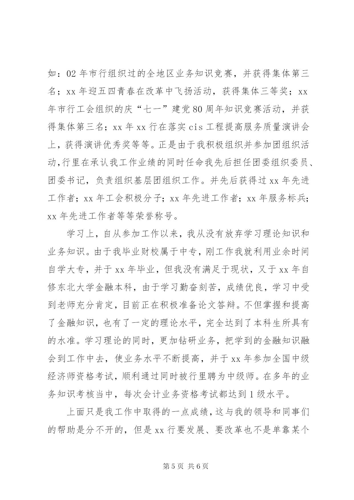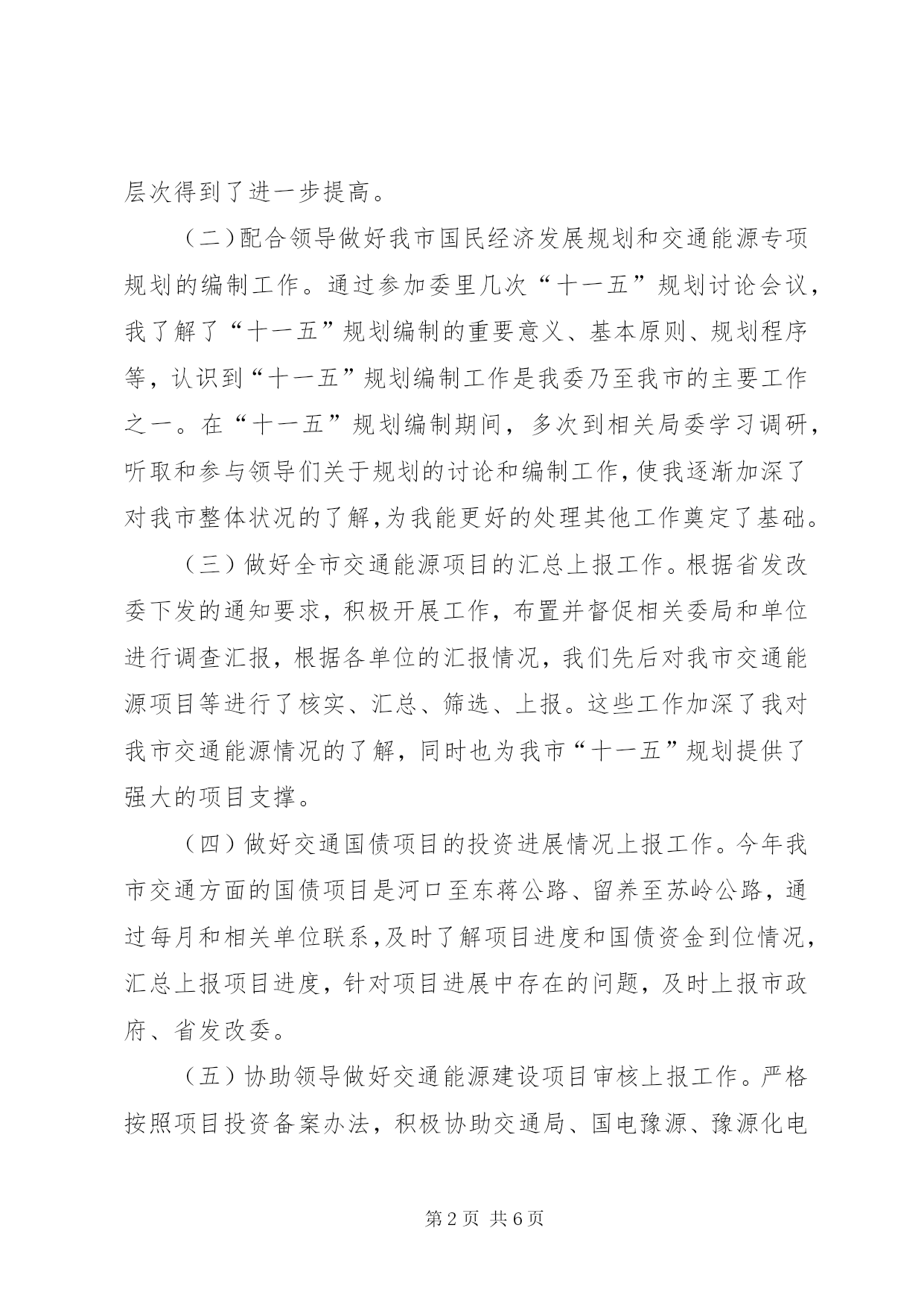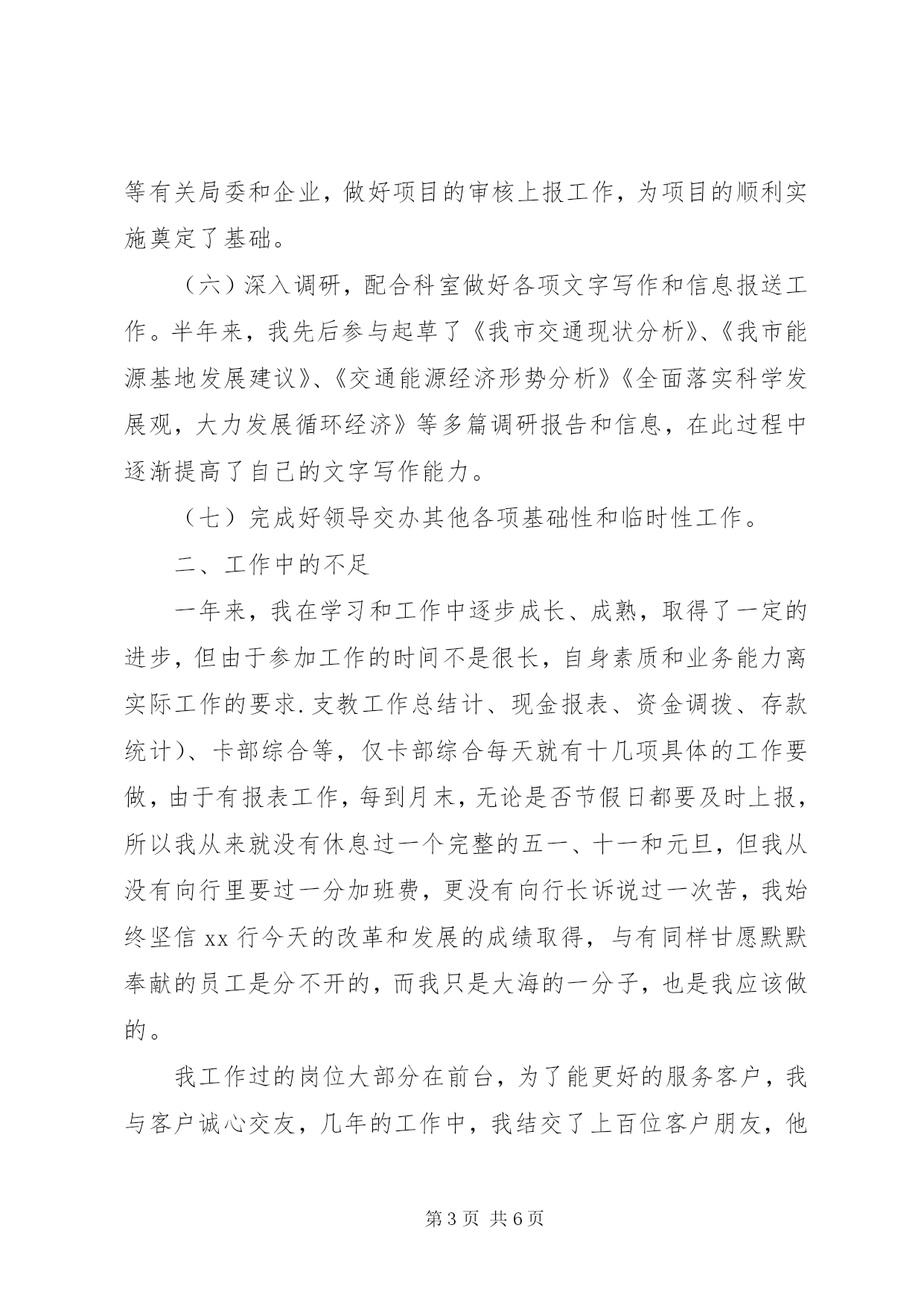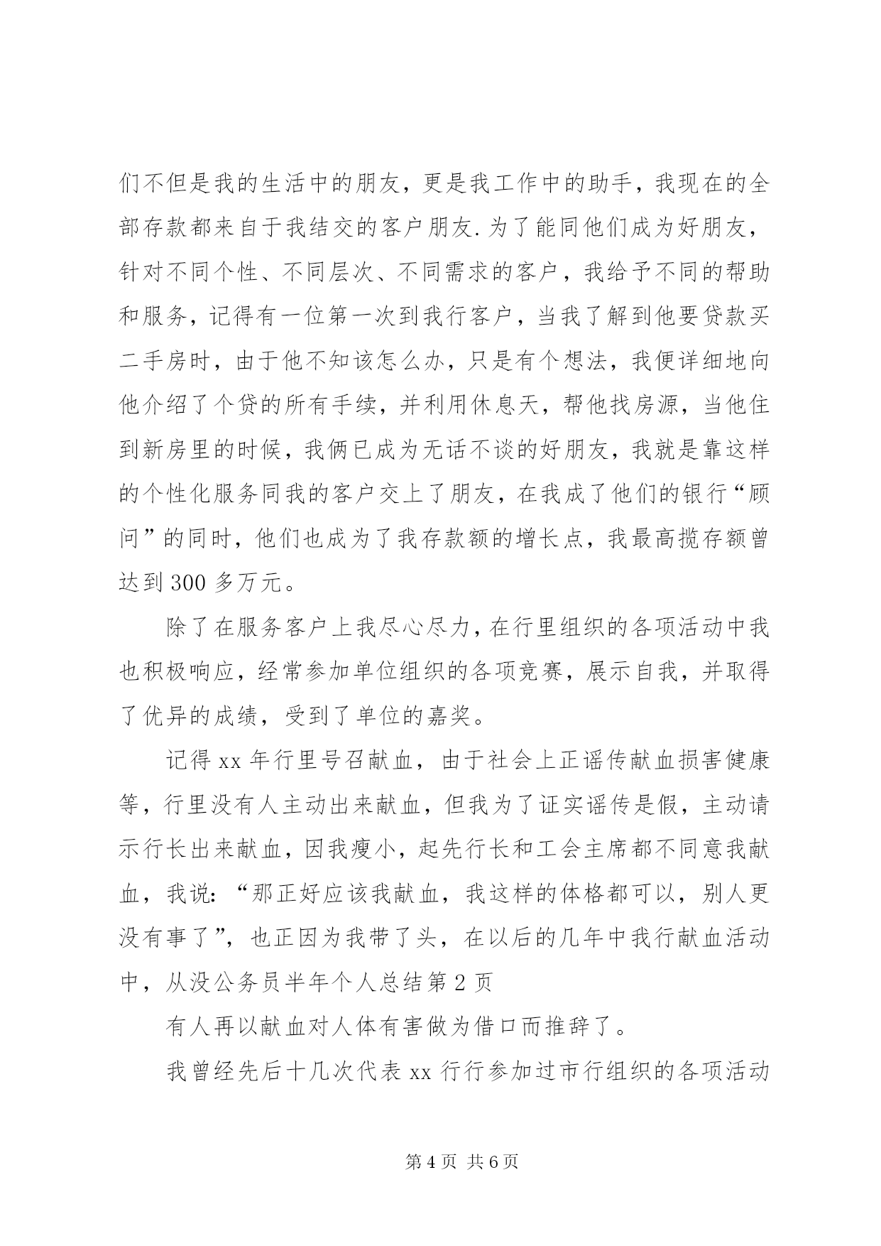 第PAGE\*Arabic\*MERGEFORMAT6页共NUMPAGES\*MERGEFORMAT6页公务员半年个人总结公务员半年个人总结个人工作总结一年来,在领导的培养帮助、同志们的关心支持下我逐步完成了从校园到机关、从大学生到公务员这种环境和角色的双重转变和适应,较为圆满地完成了自己所承担的各项工作任务,个人思想政治素质和业务工作能力都取得了一定的进步,为今后的工作和学习打下了良好的基础,静心回顾这一年的工作生活,收获颇丰。现将我这一年来的学习工作情况总结如下:一、认真完成各项工作(一)加强学习,提高素质首先,积极参加委内组织的各项学习活动,认真学习了宏观经济知识、商务礼仪、企业投资项目备案、核准暂行管理办法、行政许可法等内容,并注重自学,进一步提高了自己的理论水平与政治素质。其次,在业务学习方面,我虚心向身边的同事请教,通过多看多听多想多问多做,努力使自己在尽短的时间内熟悉工作环境和内容,积累自己的业务知识。此外,根据组织安排参加了公务员初任培训。在为期一周的培训生活中,通过公务员宗旨和行为规范的教育以及公文写作的学习,为我更好的投入工作打下了良好基础,使我的知识储备和层次得到了进一步提高。(二)配合领导做好我市国民经济发展规划和交通能源专项规划的编制工作。通过参加委里几次“十一五”规划讨论会议,我了解了“十一五”规划编制的重要意义、基本原则、规划程序等,认识到“十一五”规划编制工作是我委乃至我市的主要工作之一。在“十一五”规划编制期间,多次到相关局委学习调研,听取和参与领导们关于规划的讨论和编制工作,使我逐渐加深了对我市整体状况的了解,为我能更好的处理其他工作奠定了基础。(三)做好全市交通能源项目的汇总上报工作。根据省发改委下发的通知要求,积极开展工作,布置并督促相关委局和单位进行调查汇报,根据各单位的汇报情况,我们先后对我市交通能源项目等进行了核实、汇总、筛选、上报。这些工作加深了我对我市交通能源情况的了解,同时也为我市“十一五”规划提供了强大的项目支撑。(四)做好交通国债项目的投资进展情况上报工作。今年我市交通方面的国债项目是河口至东蒋公路、留养至苏岭公路,通过每月和相关单位联系,及时了解项目进度和国债资金到位情况,汇总上报项目进度,针对项目进展中存在的问题,及时上报市政府、省发改委。(五)协助领导做好交通能源建设项目审核上报工作。严格按照项目投资备案办法,积极协助交通局、国电豫源、豫源化电等有关局委和企业,做好项目的审核上报工作,为项目的顺利实施奠定了基础。(六)深入调研,配合科室做好各项文字写作和信息报送工作。半年来,我先后参与起草了《我市交通现状分析》、《我市能源基地发展建议》、《交通能源经济形势分析》《全面落实科学发展观,大力发展循环经济》等多篇调研报告和信息,在此过程中逐渐提高了自己的文字写作能力。(七)完成好领导交办其他各项基础性和临时性工作。二、工作中的不足一年来,我在学习和工作中逐步成长、成熟,取得了一定的进步,但由于参加工作的时间不是很长,自身素质和业务能力离实际工作的要求.支教工作总结计、现金报表、资金调拨、存款统计)、卡部综合等,仅卡部综合每天就有十几项具体的工作要做,由于有报表工作,每到月末,无论是否节假日都要及时上报,所以我从来就没有休息过一个完整的五一、十一和元旦,但我从没有向行里要过一分加班费,更没有向行长诉说过一次苦,我始终坚信xx行今天的改革和发展的成绩取得,与有同样甘愿默默奉献的员工是分不开的,而我只是大海的一分子,也是我应该做的。我工作过的岗位大部分在前台,为了能更好的服务客户,我与客户诚心交友,几年的工作中,我结交了上百位客户朋友,他们不但是我的生活中的朋友,更是我工作中的助手,我现在的全部存款都来自于我结交的客户朋友.为了能同他们成为好朋友,针对不同个性、不同层次、不同需求的客户,我给予不同的帮助和服务,记得有一位第一次到我行客户,当我了解到他要贷款买二手房时,由于他不知该怎么办,只是有个想法,我便详细地向他介绍了个贷的所有手续,并利用休息天,帮他找房源,当他住到新房里的时候,我俩已成为无话不谈的好朋友,我就是靠这样的个性化服务同我的客户交上了朋友,在我成了他们的银行“顾问”的同时,他们也成为了我存款额的增长点,我最高揽存额曾达到300多万元。除了在服务客户上我尽心尽力,在行里组织的各项活动中我也积极响应,经常参加单位组织的各项竞赛,展示自我,并取得了优异的成绩,受到了单位的嘉奖。记得xx年行里号召献血,由于社会上正谣传献血损害健康等,行里没有人主动出来献血,但我为了证实谣传是假,主动请示行长出来献血,因我瘦小,起先行长和工会主席都不同意我献血,我说:“那正好应该我献血,我这样的体格都可以,别人更没有事了”,也正因为我带了头,在以后的几年中我行献