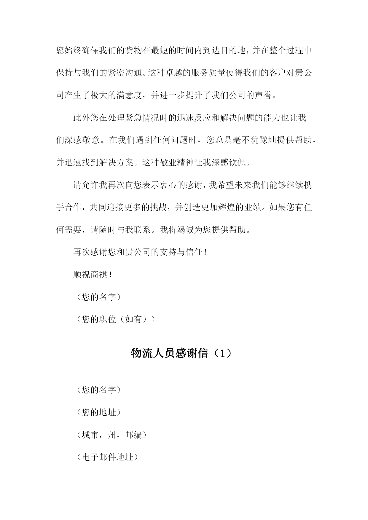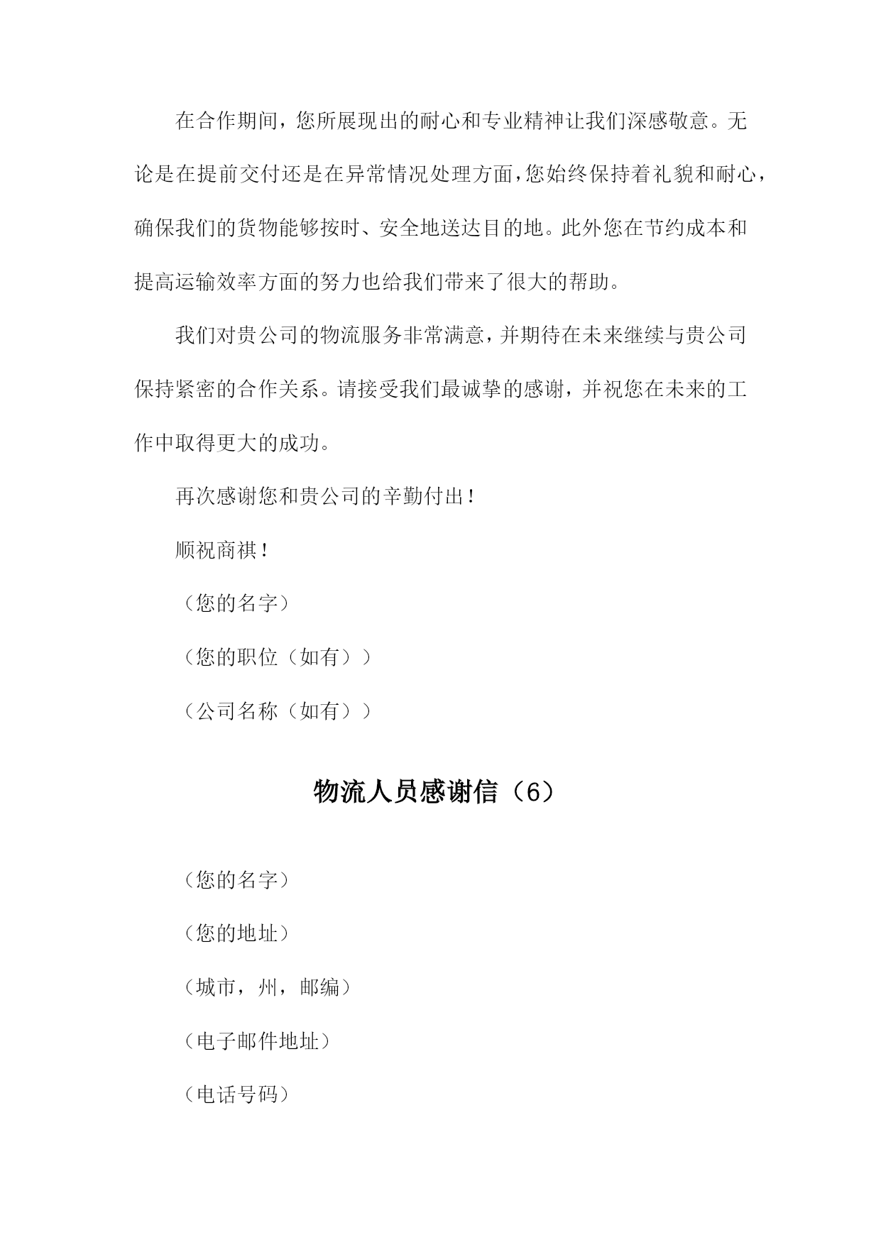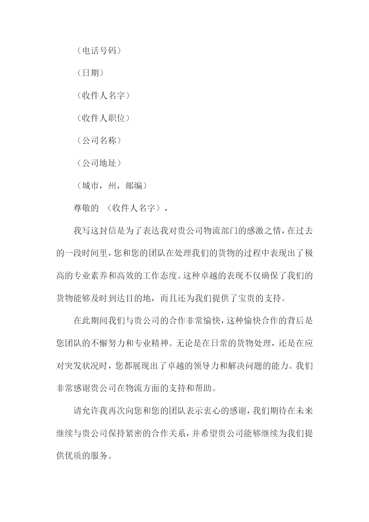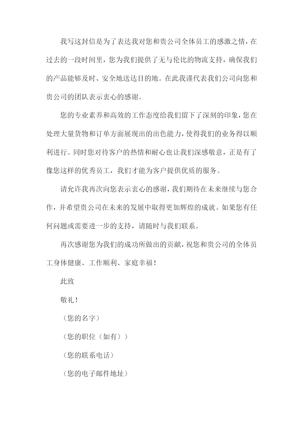 物流人员感谢信(您的名字)(您的地址)(城市,州,邮编)(电子邮件地址)(电话号码)(日期)(收件人名字)(收件人职位)(公司名称)(公司地址)(城市,州,邮编)尊敬的(收件人名字),我写这封信是为了表达我对贵公司物流部门的感激之情,在过去的一段时间里,您和您的团队在处理我们的货物的过程中表现出了极高的专业素养和高效的工作态度。我非常感谢您为确保我们产品按时、安全地送达而付出的辛勤努力。在整个物流过程中,您所展现出的耐心和专业水平让我印象深刻。您始终确保我们的货物在最短的时间内到达目的地,并在整个过程中保持与我们的紧密沟通。这种卓越的服务质量使得我们的客户对贵公司产生了极大的满意度,并进一步提升了我们公司的声誉。此外您在处理紧急情况时的迅速反应和解决问题的能力也让我们深感敬意。在我们遇到任何问题时,您总是毫不犹豫地提供帮助,并迅速找到解决方案。这种敬业精神让我深感钦佩。请允许我再次向您表示衷心的感谢,我希望未来我们能够继续携手合作,共同迎接更多的挑战,并创造更加辉煌的业绩。如果您有任何需要,请随时与我联系。我将竭诚为您提供帮助。再次感谢您和贵公司的支持与信任!顺祝商祺!(您的名字)(您的职位(如有))物流人员感谢信(1)(您的名字)(您的地址)(城市,州,邮编)(电子邮件地址)(电话号码)(日期)(收件人名字)(收件人职位)(公司名称)(公司地址)(城市,州,邮编)尊敬的(收件人名字),我写这封信是为了表达我对贵公司物流部门的感激之情,在过去的一段时间里,您和您的团队在处理我们的货物的过程中表现出了极高的专业素养和高效的工作态度。这种卓越的表现不仅确保了我们的货物能够及时到达目的地,而且还为我们提供了宝贵的支持。在此期间我们与贵公司的合作非常愉快,这种愉快合作的背后是您团队的不懈努力和专业精神。无论是在日常的货物处理,还是在应对突发状况时,您都展现出了卓越的领导力和解决问题的能力。我们非常感谢贵公司在物流方面的支持和帮助。请允许我再次向您和您的团队表示衷心的感谢,我们期待在未来继续与贵公司保持紧密的合作关系,并希望贵公司能够继续为我们提供优质的服务。如果您有任何问题或需要进一步的信息,请随时与我们联系。我们非常愿意与您进行进一步的交流和合作。再次感谢您和您的团队的辛勤工作,祝您和您的团队一切顺利!此致敬礼!(您的名字)(您的职位(如有))物流人员感谢信(2)(您的名字)(您的地址)(城市,州,邮编)(日期)(收件人名字)(收件人职位)(公司名称)(公司地址)(城市,州,邮编)亲爱的(收件人名字),我写这封信是为了表达我对您和贵公司全体员工的感激之情,在过去的一段时间里,您为我们提供了无与伦比的物流支持,确保我们的产品能够及时、安全地送达目的地。在此我谨代表我们公司向您和贵公司的团队表示衷心的感谢。您的专业素养和高效的工作态度给我们留下了深刻的印象,您在处理大量货物和订单方面展现出的出色能力,使得我们的业务得以顺利进行。同时您对待客户的热情和耐心也让我们深感敬意,正是有了像您这样的优秀员工,我们才能为客户提供优质的服务。请允许我再次向您表示衷心的感谢,我们期待在未来继续与您合作,并希望贵公司在未来的发展中取得更加辉煌的成就。如果您有任何问题或需要进一步的支持,请随时与我们联系。再次感谢您为我们的成功所做出的贡献,祝您和贵公司的全体员工身体健康、工作顺利、家庭幸福!此致敬礼!(您的名字)(您的职位(如有))(您的联系电话)(您的电子邮件地址)物流人员感谢信(3)(您的名字)(您的地址)(城市,州,邮编)(电子邮件地址)(电话号码)(日期)(收件人名字)(收件人职位)(公司名称)(公司地址)(城市,州,邮编)尊敬的(收件人名字),我写这封信是为了表达我对贵公司物流部门的感激之情,在过去的一段时间里,您和您的团队在处理我们的货物的过程中表现出了极高的专业素养和高效的工作态度。在此我要向您表示衷心的感谢。在合作期间,您所展现出的耐心和专业精神让我们深感敬意。无论是处理复杂的物流问题还是及时处理我们的货物,您都确保了我们的货物能够按时、安全地送达目的地。对此我非常感激。此外您在与其他部门保持良好沟通和协作方面也做得非常出色。这种团队合作精神确保了我们整个团队的工作效率得到了很大的提高。我们非常感谢您的付出和努力。请允许我再次向您表示衷心的感谢,如果有任何需要我们协助的地方,请随时与我们联系。我们期待在未来继续与贵公司合作,共同取得更多的成功。再次感谢您和贵公司的支持与信任!顺祝商祺!(您的名字)(您的职位(如有))物流人员感谢信(4)(您的名字)(您的地址)(城市,