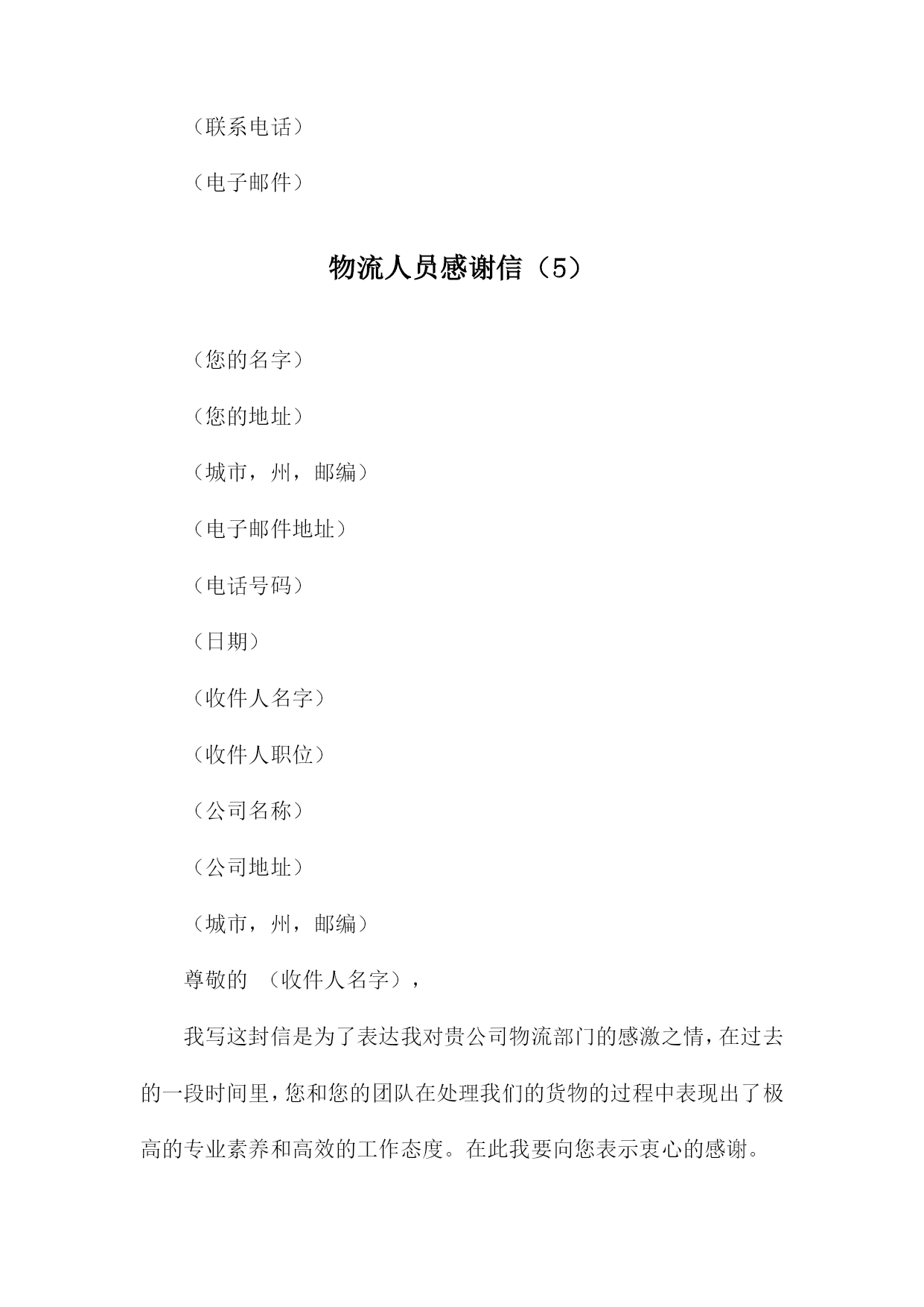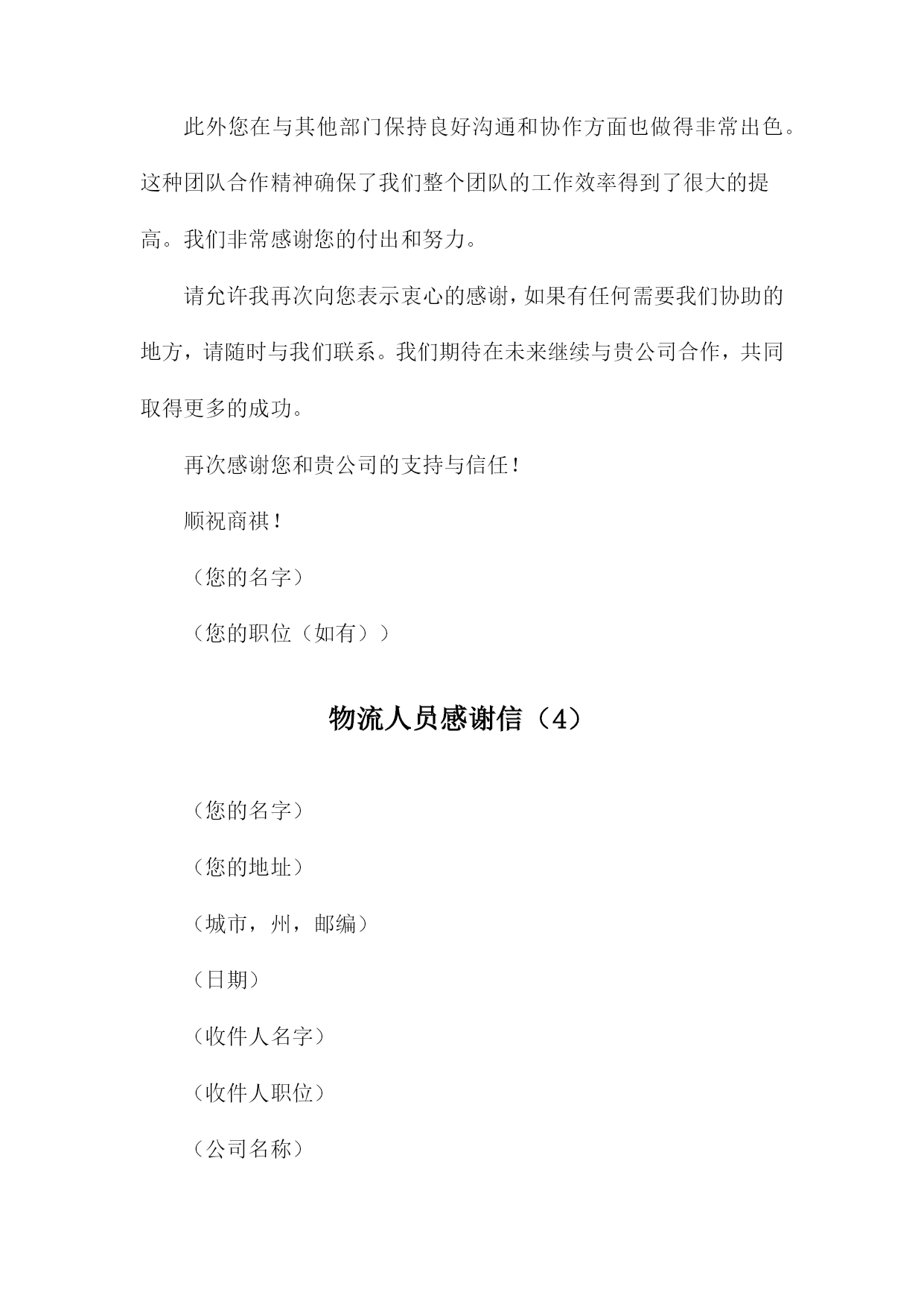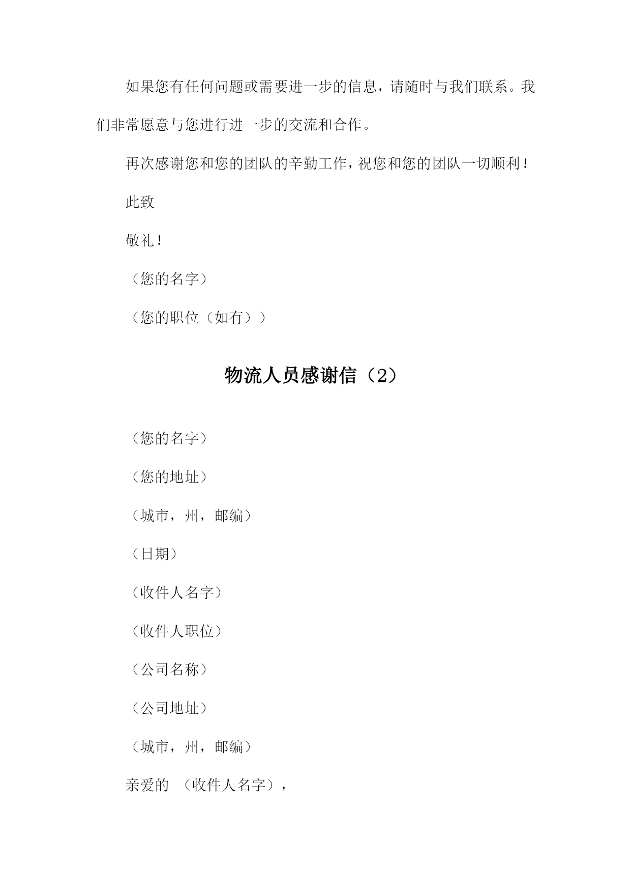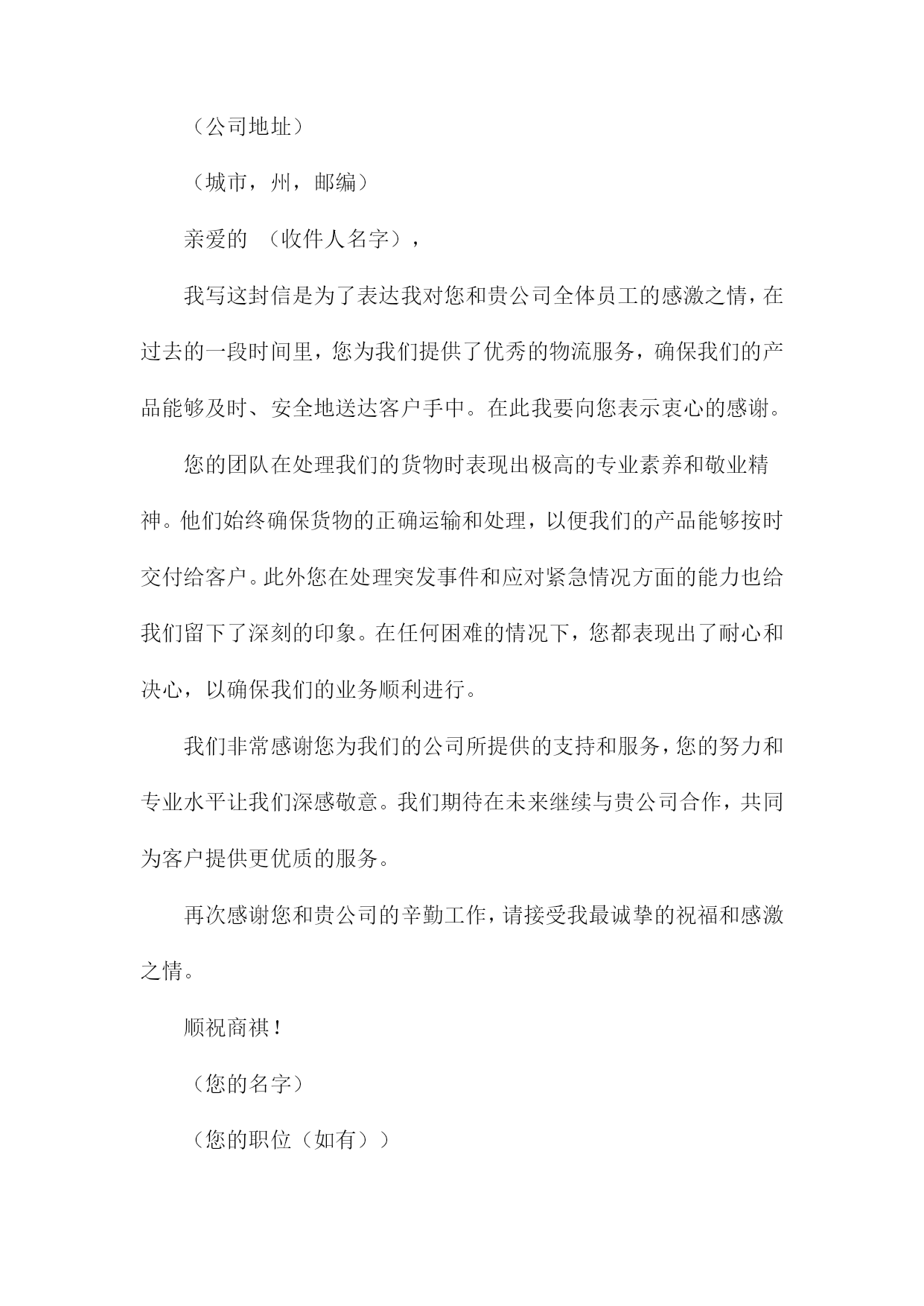 物流人员感谢信(您的名字)(您的地址)(城市,州,邮编)(电子邮件地址)(电话号码)(日期)(收件人名字)(收件人职位)(公司名称)(公司地址)(城市,州,邮编)尊敬的(收件人名字),我写这封信是为了表达我对贵公司物流部门的感激之情,在过去的一段时间里,您和您的团队在处理我们的货物的过程中表现出了极高的专业素养和高效的工作态度。我非常感谢您为确保我们产品按时、安全地送达而付出的辛勤努力。在整个物流过程中,您所展现出的耐心和专业水平让我印象深刻。您始终确保我们的货物在最短的时间内到达目的地,并在整个过程中保持与我们的紧密沟通。这种卓越的服务质量使得我们的客户对贵公司产生了极大的满意度,并进一步提升了我们公司的声誉。此外您在处理紧急情况时的迅速反应和解决问题的能力也让我们深感敬意。在我们遇到任何问题时,您总是毫不犹豫地提供帮助,并迅速找到解决方案。这种敬业精神让我深感钦佩。请允许我再次向您表示衷心的感谢,我希望未来我们能够继续携手合作,共同迎接更多的挑战,并创造更加辉煌的业绩。如果您有任何需要,请随时与我联系。我将竭诚为您提供帮助。再次感谢您和贵公司的支持与信任!顺祝商祺!(您的名字)(您的职位(如有))物流人员感谢信(1)(您的名字)(您的地址)(城市,州,邮编)(电子邮件地址)(电话号码)(日期)(收件人名字)(收件人职位)(公司名称)(公司地址)(城市,州,邮编)尊敬的(收件人名字),我写这封信是为了表达我对贵公司物流部门的感激之情,在过去的一段时间里,您和您的团队在处理我们的货物的过程中表现出了极高的专业素养和高效的工作态度。这种卓越的表现不仅确保了我们的货物能够及时到达目的地,而且还为我们提供了宝贵的支持。在此期间我们与贵公司的合作非常愉快,这种愉快合作的背后是您团队的不懈努力和专业精神。无论是在日常的货物处理,还是在应对突发状况时,您都展现出了卓越的领导力和解决问题的能力。我们非常感谢贵公司在物流方面的支持和帮助。请允许我再次向您和您的团队表示衷心的感谢,我们期待在未来继续与贵公司保持紧密的合作关系,并希望贵公司能够继续为我们提供优质的服务。如果您有任何问题或需要进一步的信息,请随时与我们联系。我们非常愿意与您进行进一步的交流和合作。再次感谢您和您的团队的辛勤工作,祝您和您的团队一切顺利!此致敬礼!(您的名字)(您的职位(如有))物流人员感谢信(2)(您的名字)(您的地址)(城市,州,邮编)(日期)(收件人名字)(收件人职位)(公司名称)(公司地址)(城市,州,邮编)亲爱的(收件人名字),我写这封信是为了表达我对您和贵公司全体员工的感激之情,在过去的一段时间里,您为我们提供了无与伦比的物流支持,确保我们的产品能够及时、安全地送达目的地。在此我谨代表我们公司向您和贵公司的团队表示衷心的感谢。您的专业素养和高效的工作态度给我们留下了深刻的印象,您在处理大量货物和订单方面展现出的出色能力,使得我们的业务得以顺利进行。同时您对待客户的热情和耐心也让我们深感敬意,正是有了像您这样的优秀员工,我们才能为客户提供优质的服务。请允许我再次向您表示衷心的感谢,我们期待在未来继续与您合作,并希望贵公司在未来的发展中取得更加辉煌的成就。如果您有任何问题或需要进一步的支持,请随时与我们联系。再次感谢您为我们的成功所做出的贡献,祝您和贵公司的全体员工身体健康、工作顺利、家庭幸福!此致敬礼!(您的名字)(您的职位(如有))(您的联系电话)(您的电子邮件地址)物流人员感谢信(3)(您的名字)(您的地址)(城市,州,邮编)(电子邮件地址)(电话号码)(日期)(收件人名字)(收件人职位)(公司名称)(公司地址)(城市,州,邮编)尊敬的(收件人名字),我写这封信是为了表达我对贵公司物流部门的感激之情,在过去的一段时间里,您和您的团队在处理我们的货物的过程中表现出了极高的专业素养和高效的工作态度。在此我要向您表示衷心的感谢。在合作期间,您所展现出的耐心和专业精神让我们深感敬意。无论是处理复杂的物流问题还是及时处理我们的货物,您都确保了我们的货物能够按时、安全地送达目的地。对此我非常感激。此外您在与其他部门保持良好沟通和协作方面也做得非常出色。这种团队合作精神确保了我们整个团队的工作效率得到了很大的提高。我们非常感谢您的付出和努力。请允许我再次向您表示衷心的感谢,如果有任何需要我们协助的地方,请随时与我们联系。我们期待在未来继续与贵公司合作,共同取得更多的成功。再次感谢您和贵公司的支持与信任!顺祝商祺!(您的名字)(您的职位(如有))物流人员感谢信(4)(您的名字)(您的地址)(城市,
