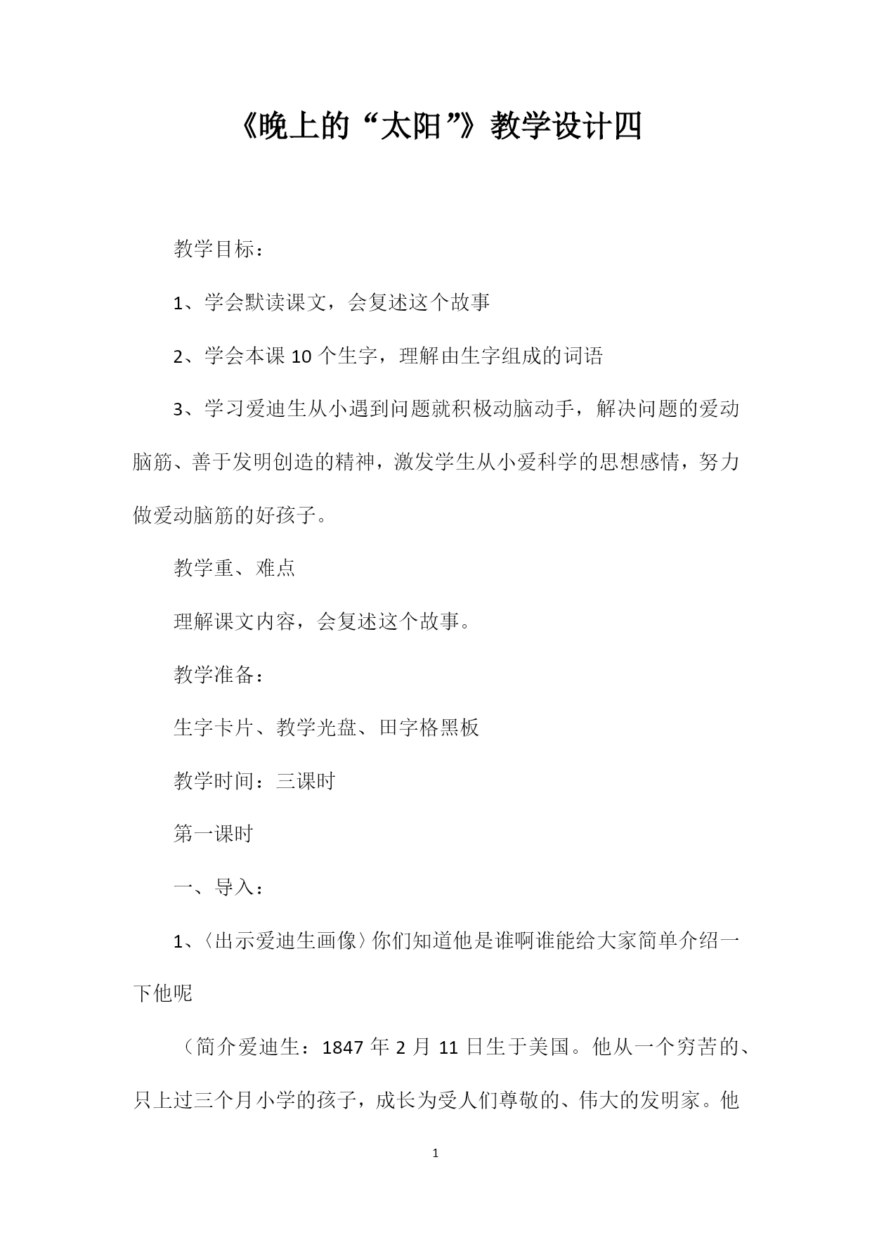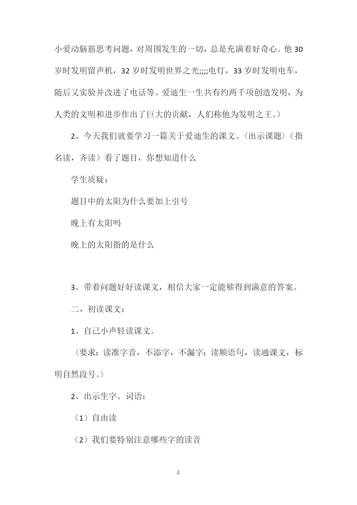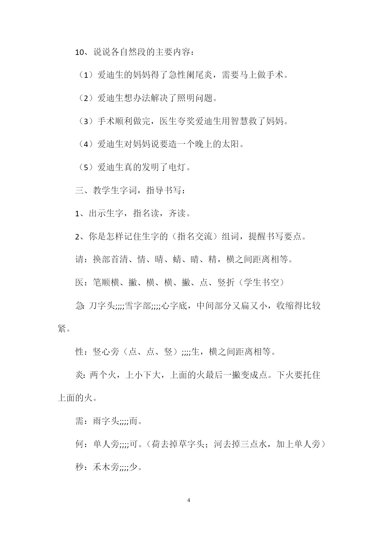 PAGEPAGE5《晚上的“太阳”》教学设计四教学目标:1、学会默读课文,会复述这个故事2、学会本课10个生字,理解由生字组成的词语3、学习爱迪生从小遇到问题就积极动脑动手,解决问题的爱动脑筋、善于发明创造的精神,激发学生从小爱科学的思想感情,努力做爱动脑筋的好孩子。教学重、难点理解课文内容,会复述这个故事。教学准备:生字卡片、教学光盘、田字格黑板教学时间:三课时第一课时一、导入:1、〈出示爱迪生画像〉你们知道他是谁啊谁能给大家简单介绍一下他呢(简介爱迪生:1847年2月11日生于美国。他从一个穷苦的、只上过三个月小学的孩子,成长为受人们尊敬的、伟大的发明家。他小爱动脑筋思考问题,对周围发生的一切,总是充满着好奇心。他30岁时发明留声机,32岁时发明世界之光;;;;电灯,33岁时发明电车,随后又实验并改进了电话等。爱迪生一生共有约两千项创造发明,为人类的文明和进步作出了巨大的贡献,人们称他为发明之王。)2、今天我们就要学习一篇关于爱迪生的课文。〈出示课题〉(指名读,齐读)看了题目,你想知道什么学生质疑:题目中的太阳为什么要加上引号晚上有太阳吗晚上的太阳指的是什么3、带着问题好好读课文,相信大家一定能够得到满意的答案。二、初读课文:1、自己小声轻读课文。〈要求:读准字音,不添字,不漏字;读顺语句,读通课文,标明自然段号。〉2、出示生字、词语:(1)自由读(2)我们要特别注意哪些字的读音(3)开火车读、指名读、齐读、〈请来医生急性阑尾炎需要无可奈何一分一秒挡手简易〉〈犹豫手术痛苦发明焦急呻吟自豪智慧一本正经〉3、你读懂了哪个词语的意思(学生交流、教师指导)一分一秒:一分钟一秒钟,意思是时间渐渐地过去。挡手:挡住了手。无可奈何:没有任何的办法。简易:简单而容易的。[犹豫:拿不定主意。呻吟:因为痛苦而发出声音。4、全文一共有几个自然段(5个)5、分自然段指名读读文。师生评议。6、默读课文,勾画出文中不理解的词语。7、讨论交流。8、再读课文,把你认为难读的多读几遍。9、指导朗读长句。妈妈,要是晚上也有太阳该多好哇,我要造一个晚上的lsquo;太阳rsquo;。这些灯围一圈挡手哇!10、说说各自然段的主要内容:(1)爱迪生的妈妈得了急性阑尾炎,需要马上做手术。(2)爱迪生想办法解决了照明问题。(3)手术顺利做完,医生夸奖爱迪生用智慧救了妈妈。(4)爱迪生对妈妈说要造一个晚上的太阳。(5)爱迪生真的发明了电灯。三、教学生字词,指导书写:1、出示生字,指名读,齐读。2、你是怎样记住生字的(指名交流)组词,提醒书写要点。请:换部首清、情、晴、蜻、睛、精,横之间距离相等。医:笔顺横、撇、横、横、撇、点、竖折(学生书空)急:刀字头;;;;雪字部;;;;心字底,中间部分又扁又小,收缩得比较紧。性:竖心旁(点、点、竖);;;;生,横之间距离相等。炎:两个火,上小下大,上面的火最后一撇变成点。下火要托住上面的火。需:雨字头;;;;而。何:单人旁;;;;可。(荷去掉草字头;河去掉三点水,加上单人旁)秒:禾木旁;;;;少。挡:当加提手旁。当下面的部分要写得舒展,和上面的小字头各占一半。简:竹字头;;;;间。3、学生描红、仿影、临写,教师巡视指导。四、作业设计:1、熟读课文2、完成〈习字册〉