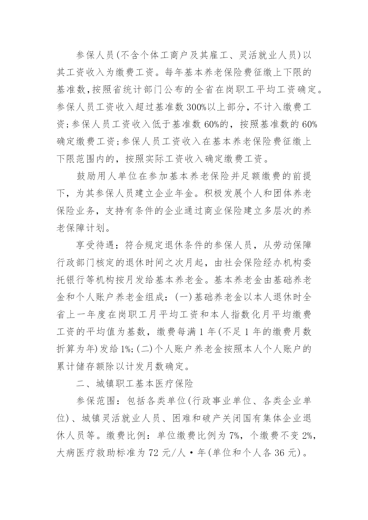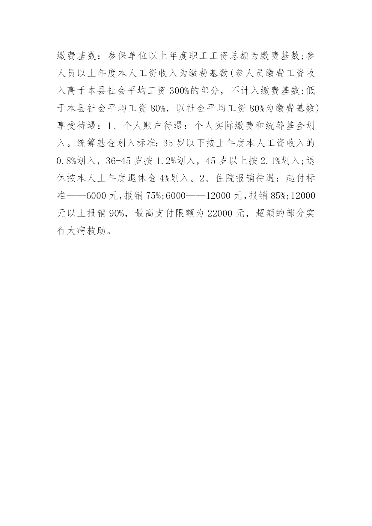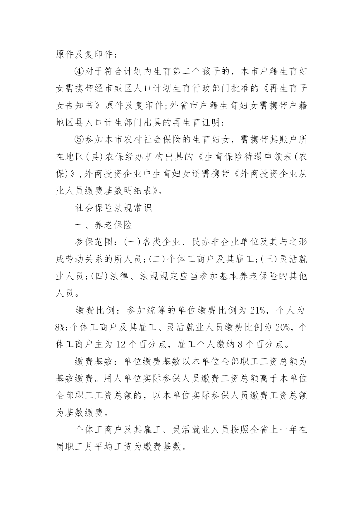 异地生育保险报销条件异地生育保险报销条件导语:生育,作为许多家庭的必经道路,为家庭带来希望的同时确也让广大妇女承受了很多风险。下面小编为你整理的异地生育保险报销条件,希望对你有所帮助!1、本人有效身份证原件及复印件(第二代身份证正、反面复印件);2、《独生子女证》或《独生子女光荣证》原件及复印件;3、尚未办理《独生子女光荣证》的,需携带结婚证和夫妻双方户口簿(集体户口的,携带户籍所在地公安部门出具的户籍证明)原件及复印件,外省市户籍生育妇女还需携带《上海市流动人口一孩生育服务登记证明》或户籍地乡(镇)人民政府、街道办事处以上机构出具的一孩生育服务证明;4、医疗机构出具的《生育医学证明》原件及复印件;5、本人在本市开立的实名制银行结算账户卡(折)原件及复印件;6、根据个人的不同情况,还需分别携带下列材料:①对于委托他人办理的,需携带委托书和被委托人身份证原件及复印件(第二代身份证正、反面复印件);②对于在外省市生育的妇女,需携带县级以上医院出具的注明产妇生育情况(难产或顺产)的出院小结和小孩《出生医学证明》原件及复印件;③对于男方为军人的,需携带《士兵证》或《军官证》原件及复印件;④对于符合计划内生育第二个孩子的,本市户籍生育妇女需携带经市或区人口计划生育行政部门批准的《再生育子女告知书》原件及复印件;外省市户籍生育妇女需携带户籍地区县人口计生部门出具的再生育证明;⑤参加本市农村社会保险的生育妇女,需携带其账户所在地区(县)农保经办机构出具的《生育保险待遇申领表(农保)》,外商投资企业中生育妇女还需携带《外商投资企业从业人员缴费基数明细表》。社会保险法规常识一、养老保险参保范围:(一)各类企业、民办非企业单位及其与之形成劳动关系的所人员;(二)个体工商户及其雇工;(三)灵活就业人员;(四)法律、法规规定应当参加基本养老保险的其他人员。缴费比例:参加统筹的单位缴费比例为21%,个人为8%;个体工商户及其雇工、灵活就业人员缴费比例为20%,个体工商户主为12个百分点,雇工个人缴纳8个百分点。缴费基数:单位缴费基数以本单位全部职工工资总额为基数缴费。用人单位实际参保人员缴费工资总额高于本单位全部职工工资总额的,以本单位实际参保人员缴费工资总额为基数缴费。个体工商户及其雇工、灵活就业人员按照全省上一年在岗职工月平均工资为缴费基数。参保人员(不含个体工商户及其雇工、灵活就业人员)以其工资收入为缴费工资。每年基本养老保险费征缴上下限的基准数,按照省统计部门公布的全省在岗职工平均工资确定。参保人员工资收入超过基准数300%以上部分,不计入缴费工资;参保人员工资收入低于基准数60%的,按照基准数的60%确定缴费工资;参保人员工资收入在基本养老保险费征缴上下限范围内的,按照实际工资收入确定缴费工资。鼓励用人单位在参加基本养老保险并足额缴费的前提下,为其参保人员建立企业年金。积极发展个人和团体养老保险业务,支持有条件的企业通过商业保险建立多层次的养老保障计划。享受待遇:符合规定退休条件的参保人员,从劳动保障行政部门核定的退休时间之次月起,由社会保险经办机构委托银行等机构按月发给基本养老金。基本养老金由基础养老金和个人账户养老金组成:(一)基础养老金以本人退休时全省上一年度在岗职工月平均工资和本人指数化月平均缴费工资的平均值为基数,缴费每满1年(不足1年的缴费月数折算为年)发给1%;(二)个人账户养老金按照本人个人账户的累计储存额除以计发月数确定。二、城镇职工基本医疗保险参保范围:包括各类单位(行政事业单位、各类企业单位)、城镇灵活就业人员、困难和破产关闭国有集体企业退休人员等。缴费比例:单位缴费比例为7%,个缴费不变2%,大病医疗救助标准为72元/人·年(单位和个人各36元)。缴费基数:参保单位以上年度职工工资总额为缴费基数;参人员以上年度本人工资收入为缴费基数(参人员缴费工资收入高于本县社会平均工资300%的部分,不计入缴费基数;低于本县社会平均工资80%,以社会平均工资80%为缴费基数)享受待遇:1、个人账户待遇:个人实际缴费和统筹基金划入。统筹基金划入标准:35岁以下按上年度本人工资收入的0.8%划入,36-45岁按1.2%划入,45岁以上按2.1%划入;退休按本人上年度退休金4%划入。2、住院报销待遇:起付标准——6000元,报销75%;6000——12000元,报销85%;12000元以上报销90%,最高支付限额为22000元,超额的部分实行大病救助。