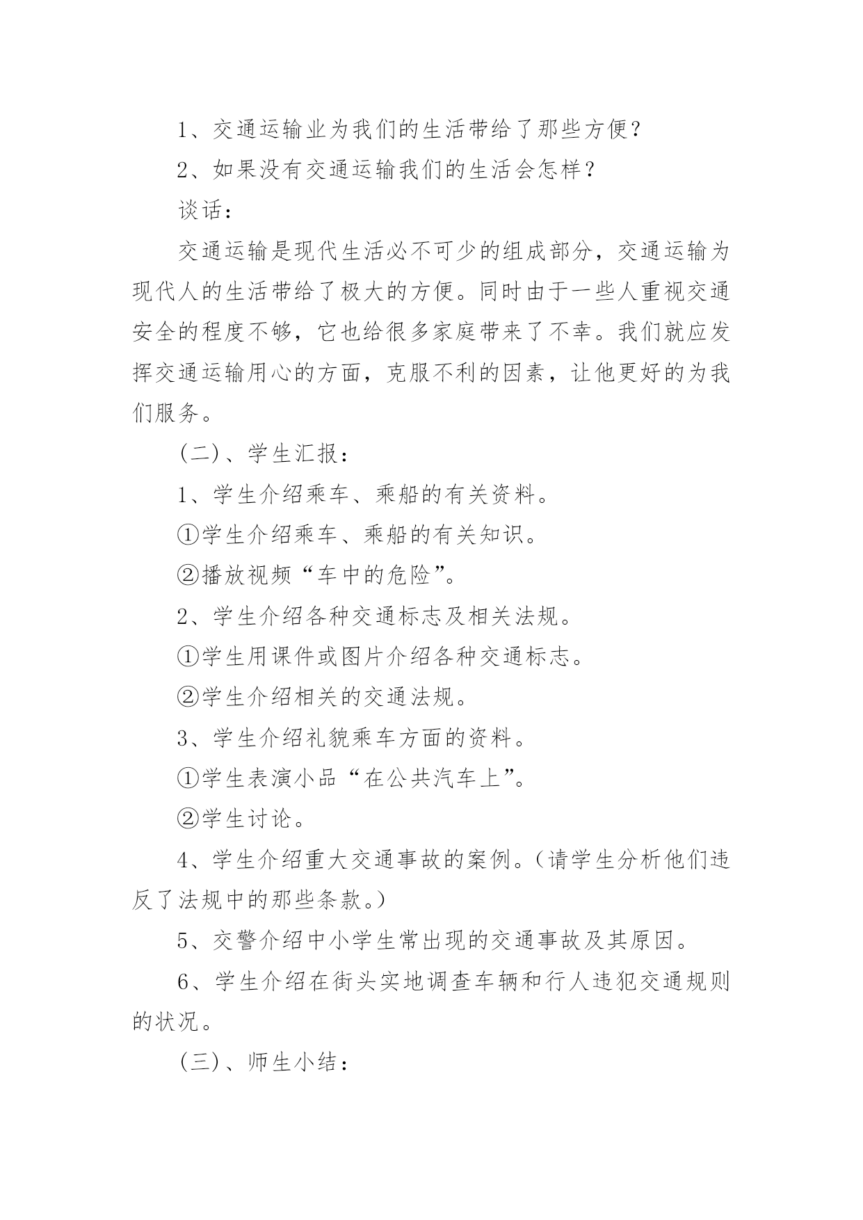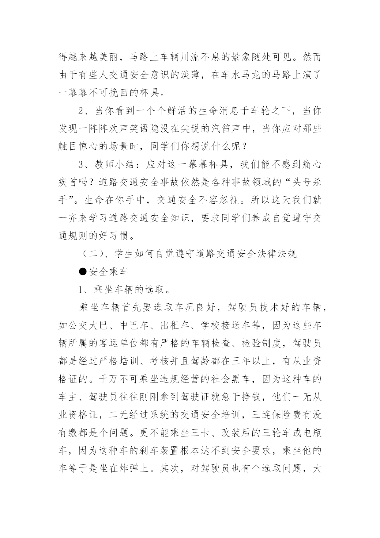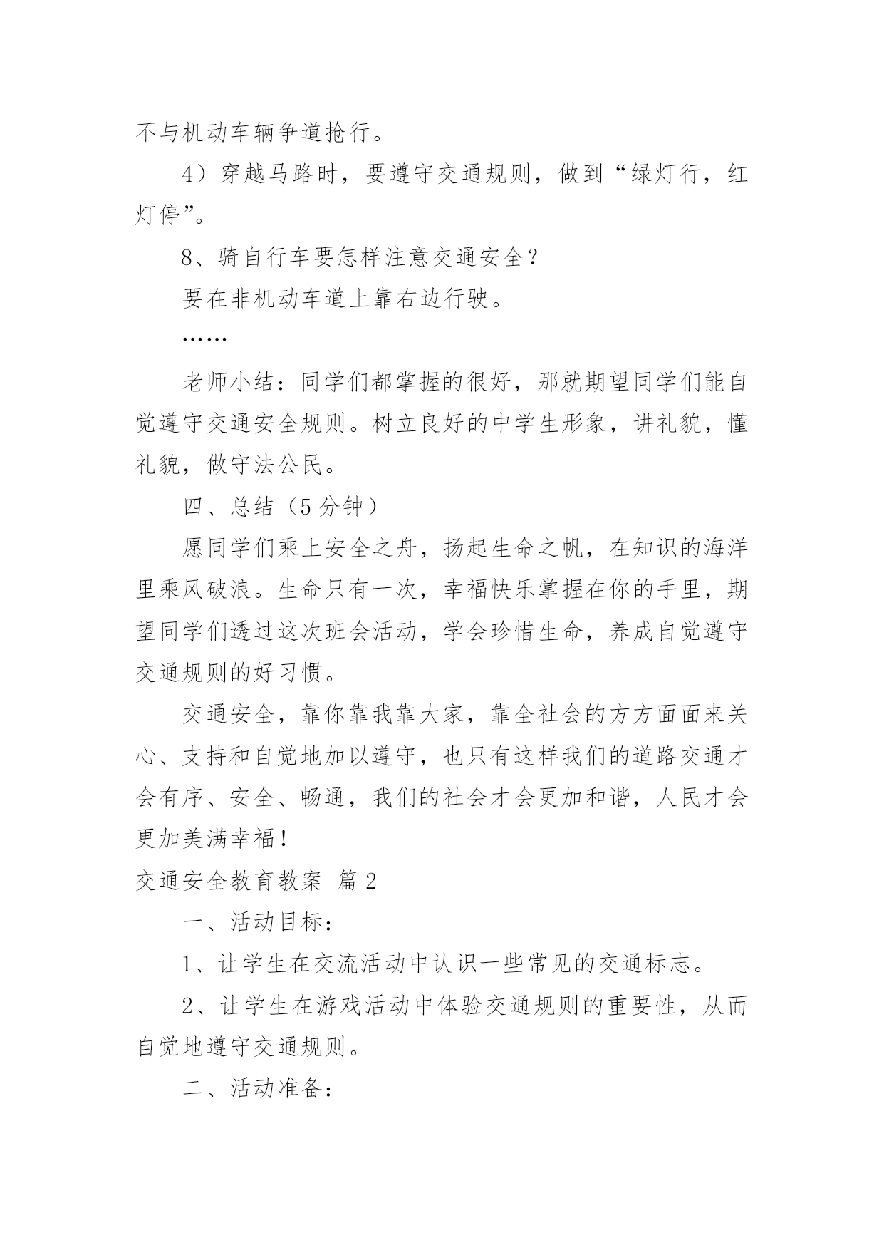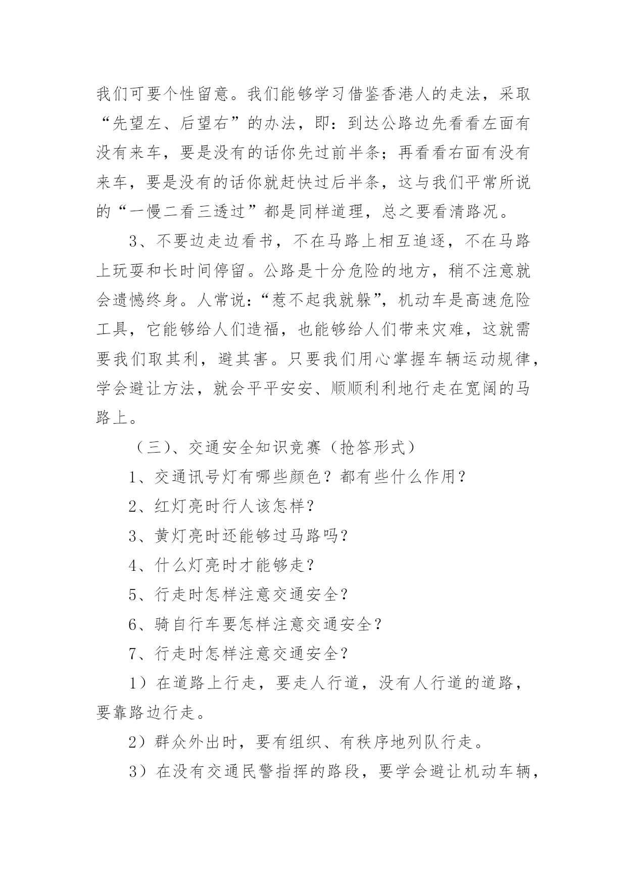 交通安全教育教案交通安全教育教案四篇作为一名无私奉献的老师,就有可能用到教案,教案有助于顺利而有效地开展教学活动。那么什么样的教案才是好的呢?下面是小编为大家收集的交通安全教育教案4篇,希望能够帮助到大家。交通安全教育教案篇1一、教学目的1、透过教师的讲、同学间的讨论等形式引起同学们对交通安全的重视。2、掌握走路、乘车、骑车等交通安全常识,明确平时日常生活中怎样做才能保证交通安全。3、透过交通安全知识有奖竞答等互动,激发学生的学习兴趣。二、教学重点:重视交通安全,掌握走路、乘车、骑车等交通安全知识。教学难点:关于走路、乘车、骑车等交通安全知识。三、班会程序(一)、课题导入1、播放路面一连串因为不安注意交通安全而导致的杯具。教师讲述:随着经济的日益发展,我们大地球母亲已变得越来越美丽,马路上车辆川流不息的景象随处可见。然而由于有些人交通安全意识的淡薄,在车水马龙的马路上演了一幕幕不可挽回的杯具。2、当你看到一个个鲜活的生命消息于车轮之下,当你发现一阵阵欢声笑语隐没在尖锐的汽笛声中,当你应对那些触目惊心的场景时,同学们你想说什么呢?3、教师小结:应对这一幕幕杯具,我们能不感到痛心疾首吗?道路交通安全事故依然是各种事故领域的“头号杀手”。生命在你手中,交通安全不容忽视。所以这天我们就一齐来学习道路交通安全知识,要求同学们养成自觉遵守交通规则的好习惯。(二)、学生如何自觉遵守道路交通安全法律法规●安全乘车1、乘坐车辆的选取。乘坐车辆首先要选取车况良好,驾驶员技术好的车辆,如公交大巴、中巴车、出租车、学校接送车等,因为这些车辆所属的客运单位都有严格的车辆检查、检验制度,驾驶员都是经过严格培训、考核并且驾龄都在三年以上,有从业资格证的。千万不可乘坐违规经营的社会黑车,因为这种车的车主、驾驶员往往刚刚拿到驾驶证就急于挣钱,他们一无从业资格证,二无经过系统的交通安全培训,三连保险费有没有缴都是个问题。更不能乘坐三卡、改装后的三轮车或电瓶车,因为这种车的刹车装置根本达不到安全要求,乘坐他的车等于是坐在炸弹上。其次,对驾驶员也有个选取问题,大家尽可能不要乘坐饮酒驾驶人开的车,更不能乘坐醉酒人开的车。另外,如果你的父母会开车,你就应用心劝导父母,为了家庭安全、幸福,千万不可酒后驾车。2、乘车途中的安全。乘坐汽车后不要将头、手伸出窗外,以防车辆与车辆交会时发生危险。不要向车外抛洒物品和吐痰,不要在车辆行驶途中与驾驶员闲谈,不要在车上嬉笑打闹。在大人后面乘坐二轮摩托车时要戴好安全头盔,坐摩托车、电瓶车、自行车都要正向骑坐而不要侧坐,不要把脚往轮胎里面伸,以防跌落或轧伤。●安全骑车1、骑自行车(包括电动自行车,下同)不能走机动车道。因为法律规定:“机动车、非机动车、行人实行分道通行”。你走机动车道违反法律,既然法律没有给你在机动车道内的通行权,你就不要在机动车道行驶,如果你硬要走机动车道,往往容易导致交通事故发生。2、骑自行车不要逆向行驶。因为法律规定:“机动车、非机动车实行右侧通行”。你逆向行驶的话,就可能与对面行驶车辆发生碰撞。3、骑自行车不要直穿十字路口。需要穿过十字路口,就应根据道路标线,按“右侧通行”原则从非机动车道内绕道而行。还有,驾驶自行车、电动自行车、三轮车横过机动车道应当下车推行,包括过人行横道线自行车也就应下车推行。4、骑自行车不要成群结队、揪肩搭背、嬉笑打闹、双手离把。自行车转弯时,尽可能伸出你的左、右手,示意你要转弯的.方向。因为此刻道路上的机动车实在太多,加上部分驾驶员的超速行驶,我们已来不得半点疏忽和麻痹。个性是没有划分机动车道、非机动车道和人行道的道路上,机动车在道路中间通行,非机动车和行人应当在道路两侧通行,更要注意骑车安全。在此刻的道路上,要保证骑车安全也不是一件容易的事情,请千万不可再做出成群结队、揪肩搭背、嬉笑打闹、双手离把的危险动作来,否则就有可能为自己的卤莽行为承担后果。5、经常对自己所骑车辆进行检查维修,确保车况良好。上学、放学骑车时注意检查车辆,重点检查车辆的制动、车铃是否完好,该修的修,该换的换,不要让不安全隐患留给自己。●安全走路1、分道行走,自觉靠右。所谓右侧通行,是指在道路上行进方向的右侧通行。在城区或其他有人行横道线的地方,横过道路必须要走在人行横道线内,因为这是法律赋予行人绝对通行权的地方,必须要充分利用,并按照红灯停、绿灯行的规则通行。如有车辆要强行闯向人行横道线时,你可伸出左、右手示意它减速慢行,千万不可犹豫不决。2、不盲目横穿。横过公路其实是一件很危险的事情,许多汽车与行人发生的碰撞事故,极大多数是在行人横穿公路时发生的。我们明白,汽车不是说停就停得下来的,所以我们可要个性留意。我们能够学习借鉴香港人的走法,采取“先望左、后望右”的办法,即:到达公路边先看看左面有没有来车,要是没有的话你