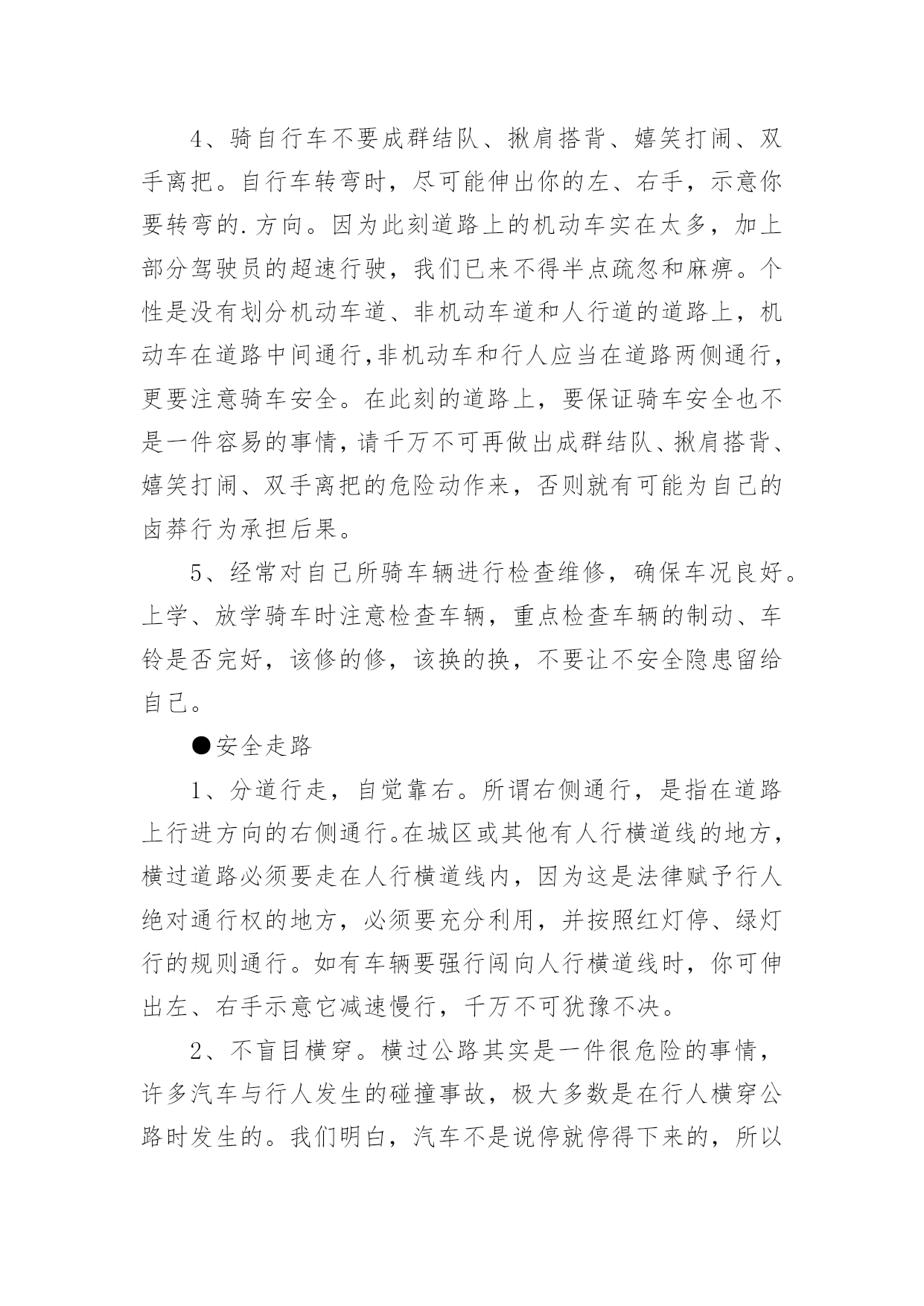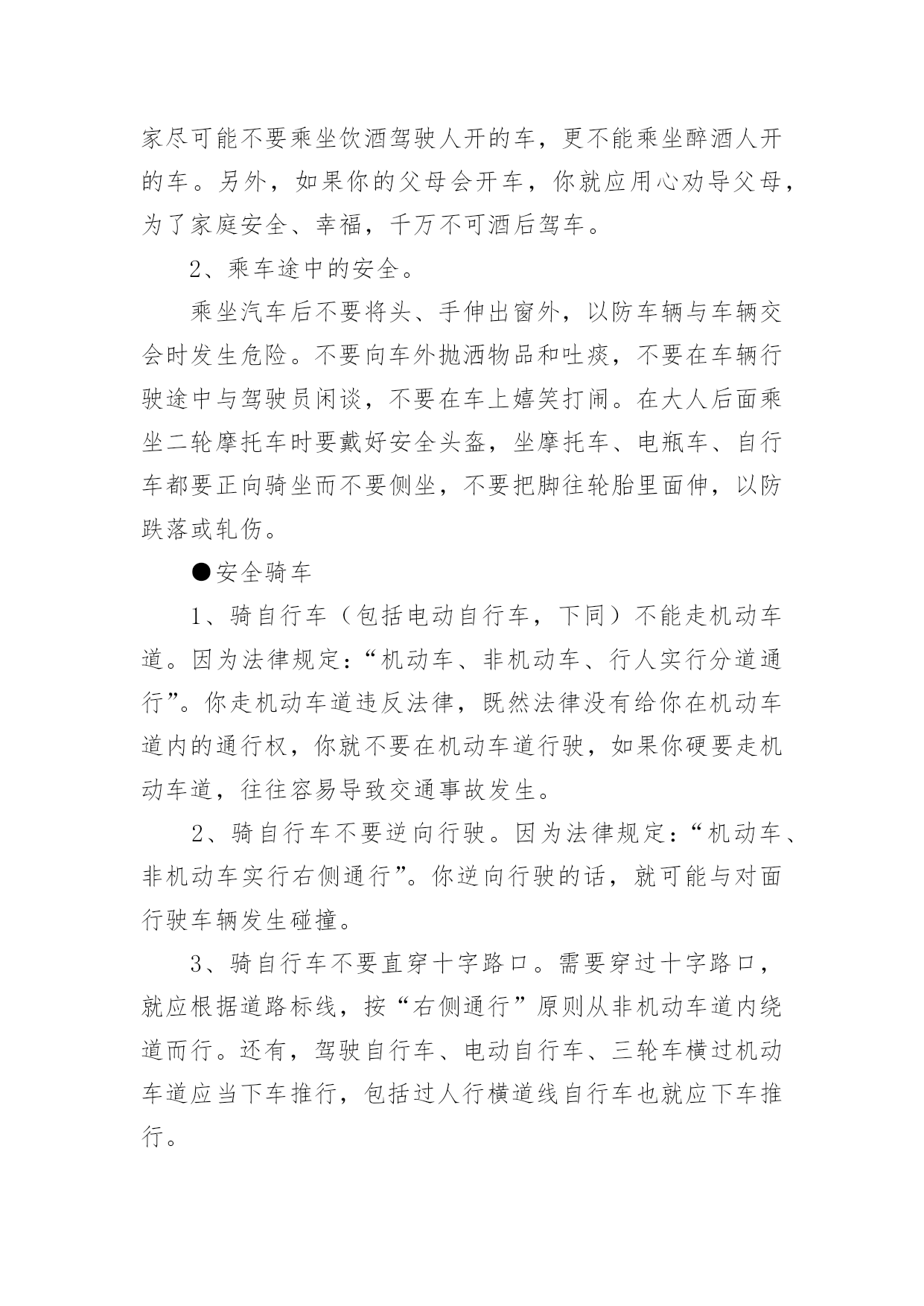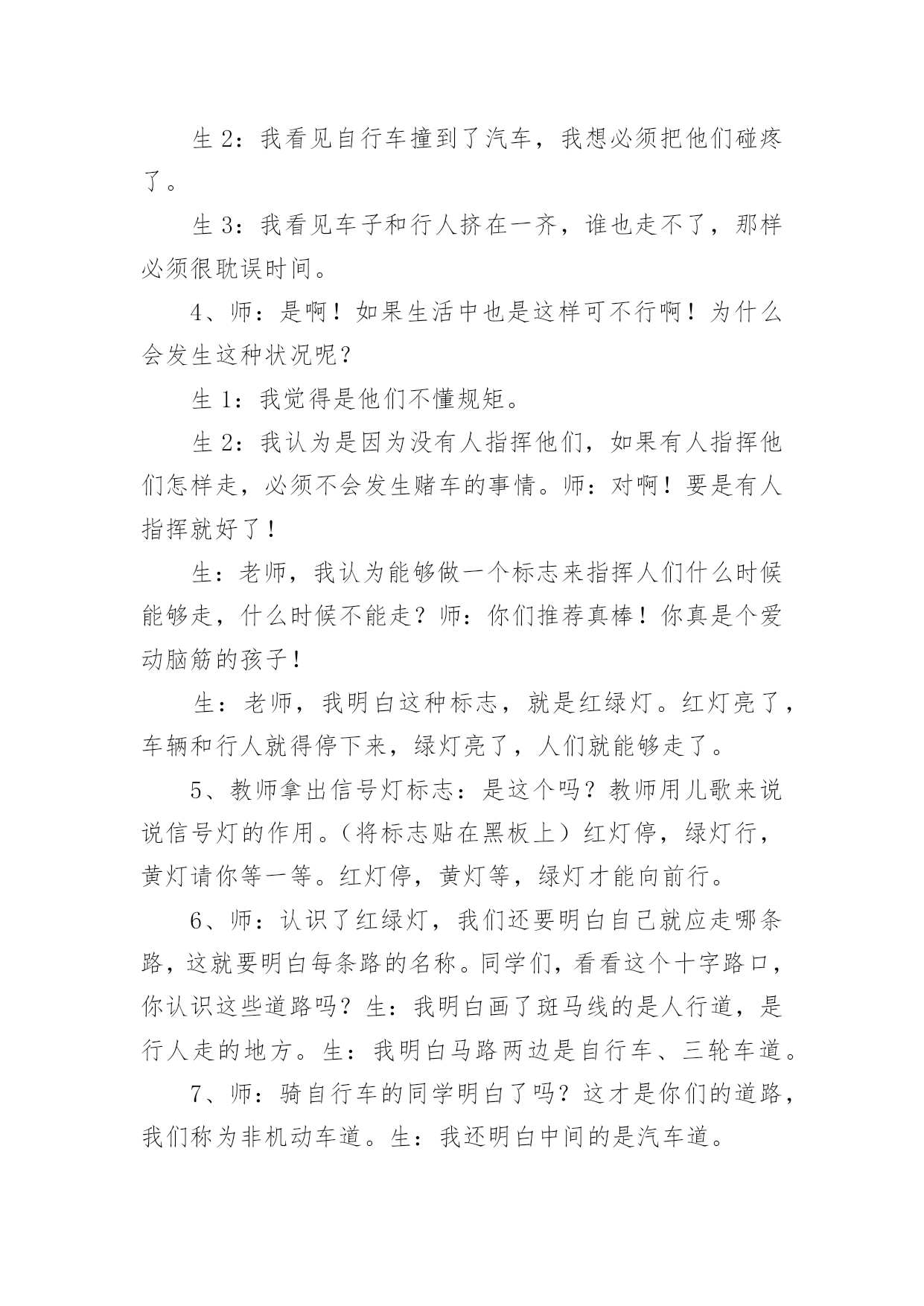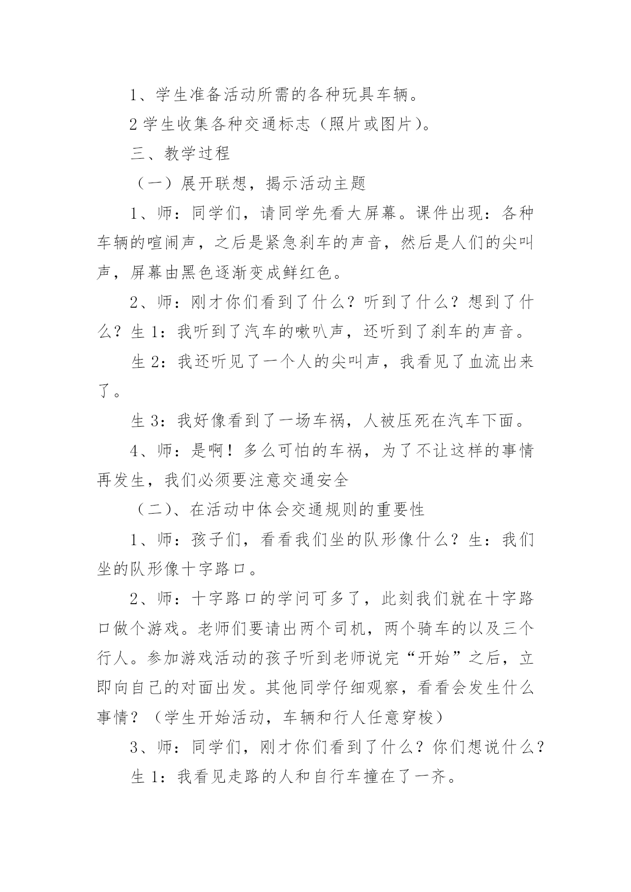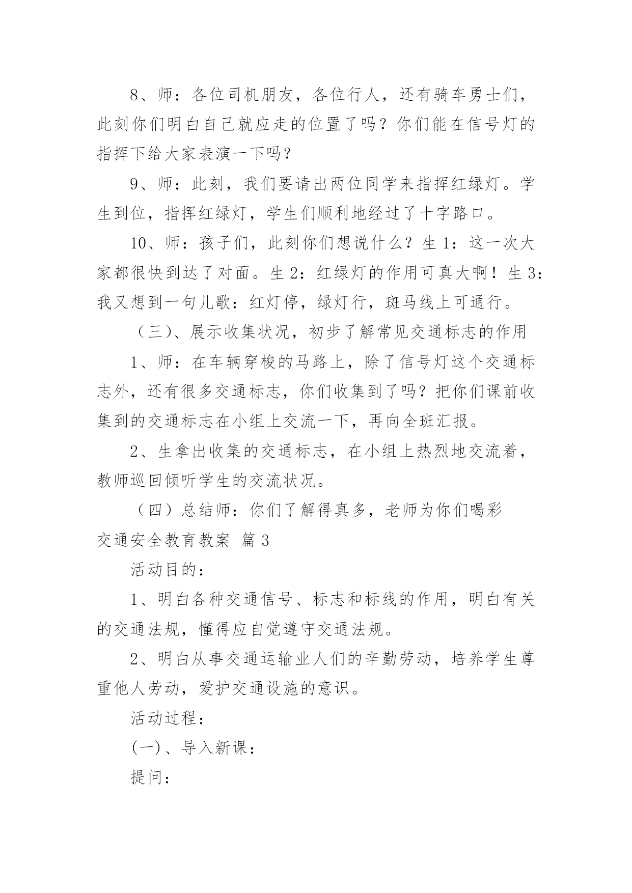 交通安全教育教案交通安全教育教案四篇作为一名无私奉献的老师,就有可能用到教案,教案有助于顺利而有效地开展教学活动。那么什么样的教案才是好的呢?下面是小编为大家收集的交通安全教育教案4篇,希望能够帮助到大家。交通安全教育教案篇1一、教学目的1、透过教师的讲、同学间的讨论等形式引起同学们对交通安全的重视。2、掌握走路、乘车、骑车等交通安全常识,明确平时日常生活中怎样做才能保证交通安全。3、透过交通安全知识有奖竞答等互动,激发学生的学习兴趣。二、教学重点:重视交通安全,掌握走路、乘车、骑车等交通安全知识。教学难点:关于走路、乘车、骑车等交通安全知识。三、班会程序(一)、课题导入1、播放路面一连串因为不安注意交通安全而导致的杯具。教师讲述:随着经济的日益发展,我们大地球母亲已变得越来越美丽,马路上车辆川流不息的景象随处可见。然而由于有些人交通安全意识的淡薄,在车水马龙的马路上演了一幕幕不可挽回的杯具。2、当你看到一个个鲜活的生命消息于车轮之下,当你发现一阵阵欢声笑语隐没在尖锐的汽笛声中,当你应对那些触目惊心的场景时,同学们你想说什么呢?3、教师小结:应对这一幕幕杯具,我们能不感到痛心疾首吗?道路交通安全事故依然是各种事故领域的“头号杀手”。生命在你手中,交通安全不容忽视。所以这天我们就一齐来学习道路交通安全知识,要求同学们养成自觉遵守交通规则的好习惯。(二)、学生如何自觉遵守道路交通安全法律法规●安全乘车1、乘坐车辆的选取。乘坐车辆首先要选取车况良好,驾驶员技术好的车辆,如公交大巴、中巴车、出租车、学校接送车等,因为这些车辆所属的客运单位都有严格的车辆检查、检验制度,驾驶员都是经过严格培训、考核并且驾龄都在三年以上,有从业资格证的。千万不可乘坐违规经营的社会黑车,因为这种车的车主、驾驶员往往刚刚拿到驾驶证就急于挣钱,他们一无从业资格证,二无经过系统的交通安全培训,三连保险费有没有缴都是个问题。更不能乘坐三卡、改装后的三轮车或电瓶车,因为这种车的刹车装置根本达不到安全要求,乘坐他的车等于是坐在炸弹上。其次,对驾驶员也有个选取问题,大家尽可能不要乘坐饮酒驾驶人开的车,更不能乘坐醉酒人开的车。另外,如果你的父母会开车,你就应用心劝导父母,为了家庭安全、幸福,千万不可酒后驾车。2、乘车途中的安全。乘坐汽车后不要将头、手伸出窗外,以防车辆与车辆交会时发生危险。不要向车外抛洒物品和吐痰,不要在车辆行驶途中与驾驶员闲谈,不要在车上嬉笑打闹。在大人后面乘坐二轮摩托车时要戴好安全头盔,坐摩托车、电瓶车、自行车都要正向骑坐而不要侧坐,不要把脚往轮胎里面伸,以防跌落或轧伤。●安全骑车1、骑自行车(包括电动自行车,下同)不能走机动车道。因为法律规定:“机动车、非机动车、行人实行分道通行”。你走机动车道违反法律,既然法律没有给你在机动车道内的通行权,你就不要在机动车道行驶,如果你硬要走机动车道,往往容易导致交通事故发生。2、骑自行车不要逆向行驶。因为法律规定:“机动车、非机动车实行右侧通行”。你逆向行驶的话,就可能与对面行驶车辆发生碰撞。3、骑自行车不要直穿十字路口。需要穿过十字路口,就应根据道路标线,按“右侧通行”原则从非机动车道内绕道而行。还有,驾驶自行车、电动自行车、三轮车横过机动车道应当下车推行,包括过人行横道线自行车也就应下车推行。4、骑自行车不要成群结队、揪肩搭背、嬉笑打闹、双手离把。自行车转弯时,尽可能伸出你的左、右手,示意你要转弯的.方向。因为此刻道路上的机动车实在太多,加上部分驾驶员的超速行驶,我们已来不得半点疏忽和麻痹。个性是没有划分机动车道、非机动车道和人行道的道路上,机动车在道路中间通行,非机动车和行人应当在道路两侧通行,更要注意骑车安全。在此刻的道路上,要保证骑车安全也不是一件容易的事情,请千万不可再做出成群结队、揪肩搭背、嬉笑打闹、双手离把的危险动作来,否则就有可能为自己的卤莽行为承担后果。5、经常对自己所骑车辆进行检查维修,确保车况良好。上学、放学骑车时注意检查车辆,重点检查车辆的制动、车铃是否完好,该修的修,该换的换,不要让不安全隐患留给自己。●安全走路1、分道行走,自觉靠右。所谓右侧通行,是指在道路上行进方向的右侧通行。在城区或其他有人行横道线的地方,横过道路必须要走在人行横道线内,因为这是法律赋予行人绝对通行权的地方,必须要充分利用,并按照红灯停、绿灯行的规则通行。如有车辆要强行闯向人行横道线时,你可伸出左、右手示意它减速慢行,千万不可犹豫不决。2、不盲目横穿。横过公路其实是一件很危险的事情,许多汽车与行人发生的碰撞事故,极大多数是在行人横穿公路时发生的。我们明白,汽车不是说停就停得下来的,所以我们可要个性留意。我们能够学习借鉴香港人的走法,采取“先望左、后望右”的办法,即:到达公路边先看看左面有没有来车,要是没有的话你