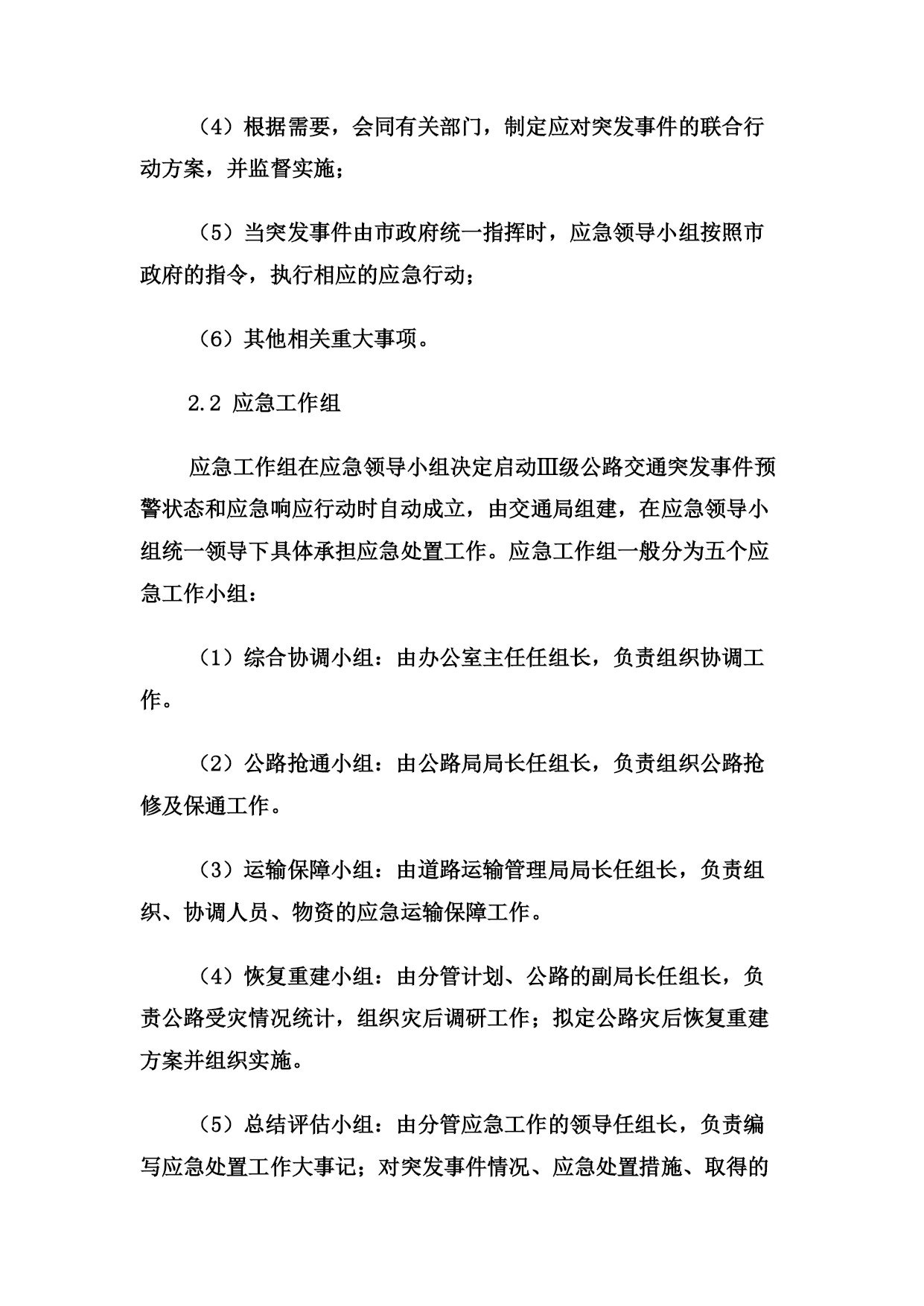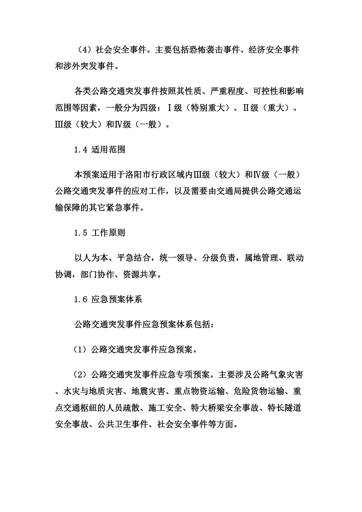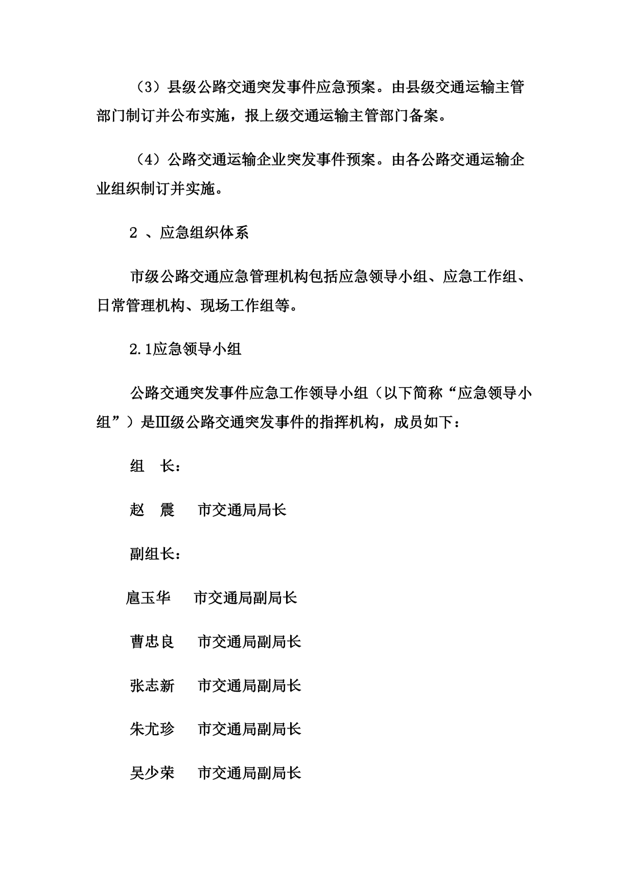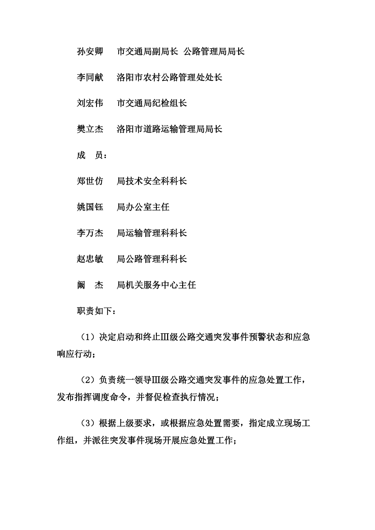 关于印发《洛阳市交通局公路交通突发事件应急预案》的通知各县(市、区)交通局,局属有关单位:根据中华人民共和国交通运输部《公路交通突发事件应急预案》(交公路发〔2009〕226号)和上级的要求,市交通局制订了《洛阳市交通局公路交通突发事件应急预案》,现印发给你们,请遵照执行。附件:《洛阳市交通局公路交通突发事件应急预案》洛阳市交通局二○○九年十二月二十日洛阳市交通局公路交通突发事件应急预案1、总则1.1编制目的为切实加强公路交通突发事件的应急管理工作,建立完善应急管理体制和机制,提高突发事件预防和应对能力,控制、减轻和消除公路交通突发事件引起的严重社会危害,及时恢复公路交通正常运行,保障公路畅通,增强应急保障能力,制定本预案。1.2编制依据依据《中华人民共和国突发事件应对法》、《中华人民共和国公路法》、《中华人民共和国道路运输条例》等法律法规,《交通运输部公路交通突发事件应急预案》及国家相关专项预案和部门预案制订本预案。1.3分类分级本预案所称公路交通突发事件是指由下列突发事件引发的造成或者可能造成公路以及重要客运枢纽出现中断、阻塞、重大人员伤亡、大量人员需要疏散、重大财产损失、生态环境破坏和严重社会危害,以及由于社会经济异常波动造成重要物资、旅客运输紧张需要交通运输部门提供应急运输保障的紧急事件。(1)自然灾害。主要包括水旱灾害、气象灾害、地震灾害、地质灾害、生物灾害和森林火灾等。(2)公路交通运输生产事故。主要包括交通事故、公路工程建设事故、危险货物运输事故。(3)公共卫生事件。主要包括传染病疫情、群体性不明原因疾病、食品安全和职业危害、动物疫情,以及其他严重影响公众健康和生命安全的事件。(4)社会安全事件。主要包括恐怖袭击事件、经济安全事件和涉外突发事件。各类公路交通突发事件按照其性质、严重程度、可控性和影响范围等因素,一般分为四级:Ⅰ级(特别重大)、Ⅱ级(重大)、Ⅲ级(较大)和Ⅳ级(一般)。1.4适用范围本预案适用于洛阳市行政区域内Ⅲ级(较大)和Ⅳ级(一般)公路交通突发事件的应对工作,以及需要由交通局提供公路交通运输保障的其它紧急事件。1.5工作原则以人为本、平急结合,统一领导、分级负责,属地管理、联动协调,部门协作、资源共享。1.6应急预案体系公路交通突发事件应急预案体系包括:(1)公路交通突发事件应急预案。(2)公路交通突发事件应急专项预案。主要涉及公路气象灾害、水灾与地质灾害、地震灾害、重点物资运输、危险货物运输、重点交通枢纽的人员疏散、施工安全、特大桥梁安全事故、特长隧道安全事故、公共卫生事件、社会安全事件等方面。(3)县级公路交通突发事件应急预案。由县级交通运输主管部门制订并公布实施,报上级交通运输主管部门备案。(4)公路交通运输企业突发事件预案。由各公路交通运输企业组织制订并实施。2、应急组织体系市级公路交通应急管理机构包括应急领导小组、应急工作组、日常管理机构、现场工作组等。2.1应急领导小组公路交通突发事件应急工作领导小组(以下简称“应急领导小组”)是Ⅲ级公路交通突发事件的指挥机构,成员如下:组长:赵震市交通局局长副组长:扈玉华市交通局副局长曹忠良市交通局副局长张志新市交通局副局长朱尤珍市交通局副局长吴少荣市交通局副局长孙安卿市交通局副局长公路管理局局长李同献洛阳市农村公路管理处处长刘宏伟市交通局纪检组长樊立杰洛阳市道路运输管理局局长成员:郑世仿局技术安全科科长姚国钰局办公室主任李万杰局运输管理科科长赵忠敏局公路管理科科长阚杰局机关服务中心主任职责如下:(1)决定启动和终止Ⅲ级公路交通突发事件预警状态和应急响应行动;(2)负责统一领导Ⅲ级公路交通突发事件的应急处置工作,发布指挥调度命令,并督促检查执行情况;(3)根据上级要求,或根据应急处置需要,指定成立现场工作组,并派往突发事件现场开展应急处置工作;(4)根据需要,会同有关部门,制定应对突发事件的联合行动方案,并监督实施;(5)当突发事件由市政府统一指挥时,应急领导小组按照市政府的指令,执行相应的应急行动;(6)其他相关重大事项。2.2应急工作组应急工作组在应急领导小组决定启动Ⅲ级公路交通突发事件预警状态和应急响应行动时自动成立,由交通局组建,在应急领导小组统一领导下具体承担应急处置工作。应急工作组一般分为五个应急工作小组:(1)综合协调小组:由办公室主任任组长,负责组织协调工作。(2)公路抢通小组:由公路局局长任组长,负责组织公路抢修及保通工作。(3)运输保障小组:由道路运输管理局局长任组长,负责组织、协调人员、物资的应急运输保障工作。(4)恢复重建小组:由分管计划、公路的副局长任组长,负责公路受灾情况统计,组织灾后