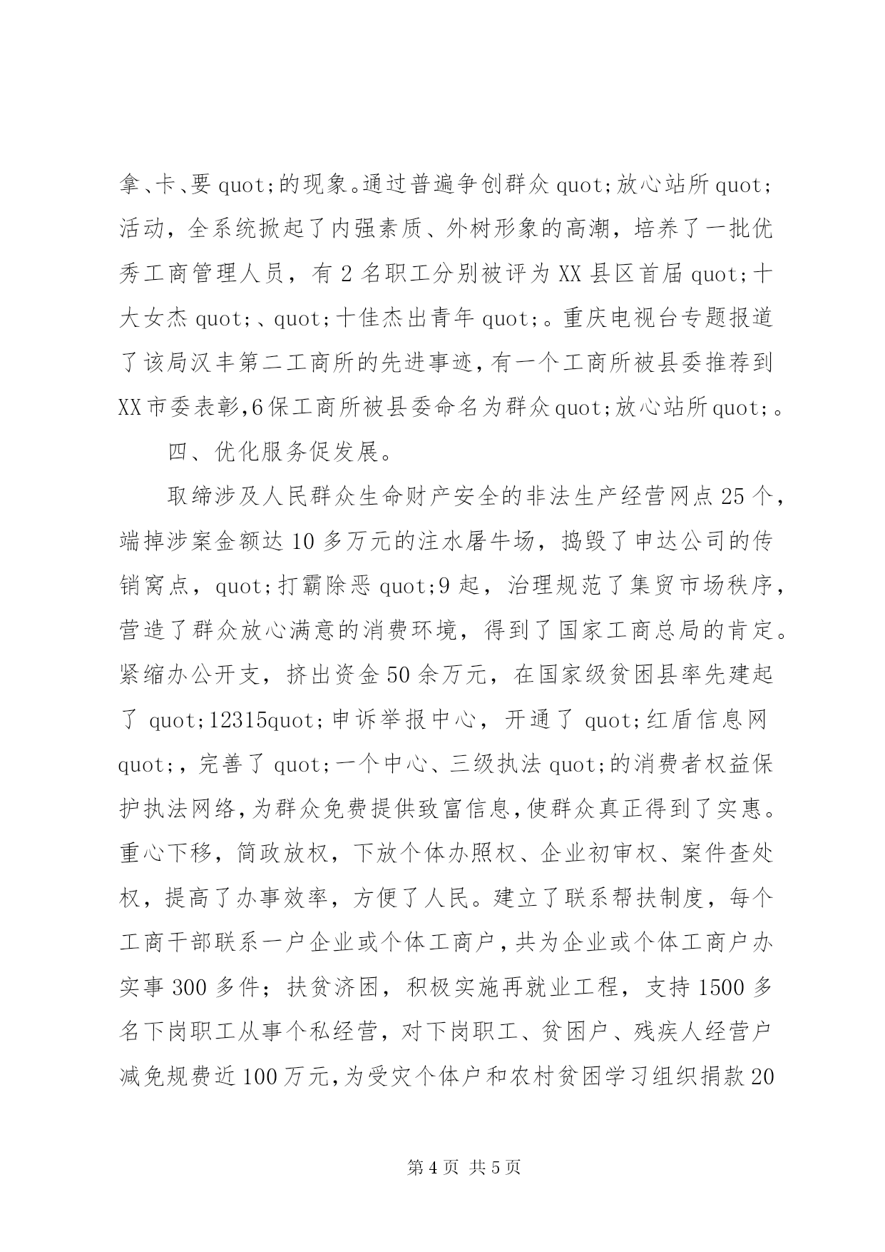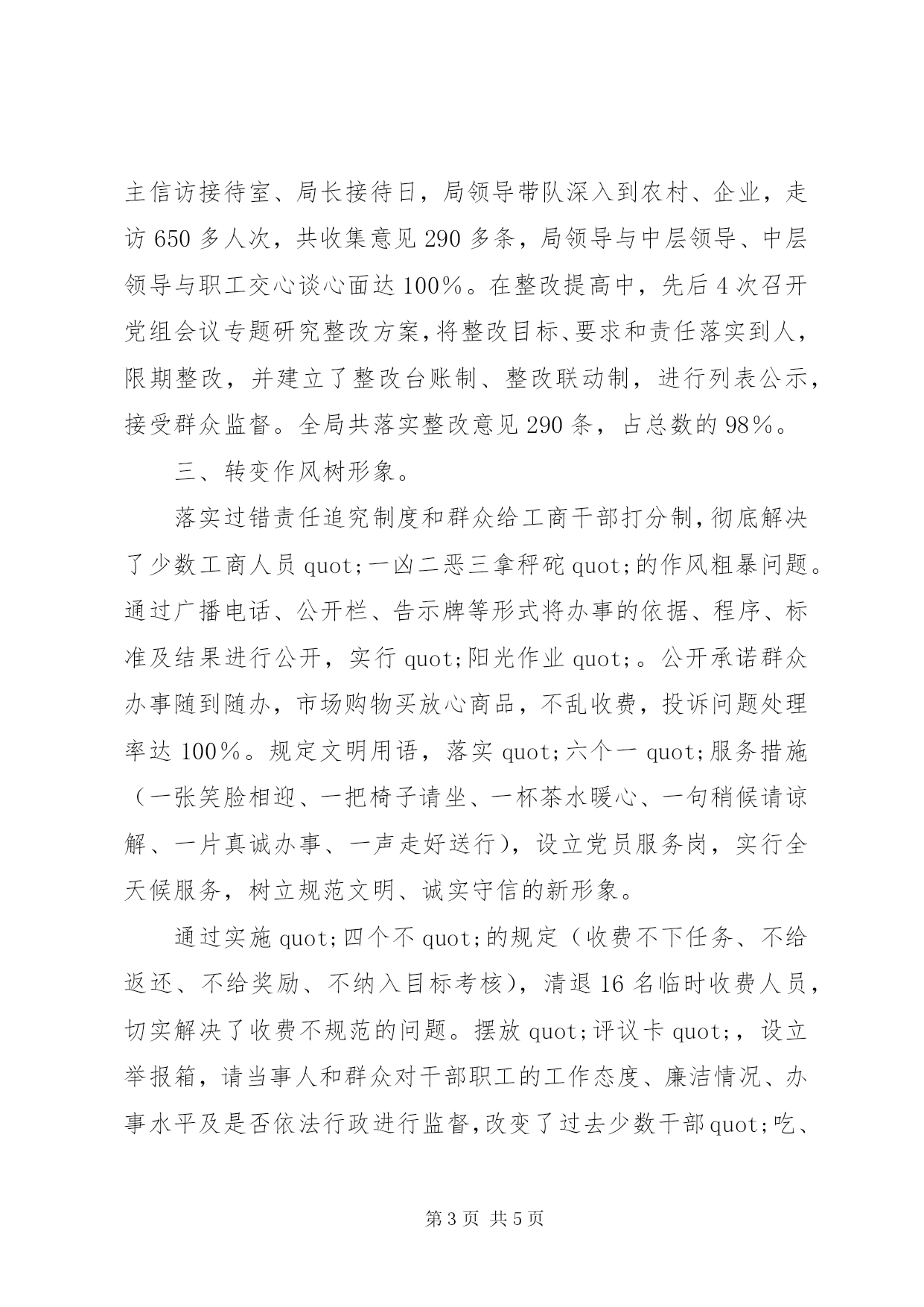 第PAGE\*Arabic\*MERGEFORMAT5页共NUMPAGES\*MERGEFORMAT5页工商局先进事迹材料范文x县工商局辖17个工商所,quot;学教quot;对象225人,其中党员119人。该局把开展quot;学教quot;活动作为提高干部职工素质、解决自身问题的机遇,学习用真功,整改动真格,为民倾真情,作风有了新的改进,服务有了新的加强,工作有了新的起色。quot;学教quot;活动开展以来,全局已查处违章案件1500多件,登记企业和个体工商户3568户,被国家工商总局授予quot;全国粮食市场管理先进集体quot;称号,获市工商行政管理局目标考核一等奖,被XX县区县委命名为quot;最佳文明单位quot;。一、强化领导抓落实。局党组一班人以quot;学教quot;活动统揽工作全局,将quot;学教quot;任务与业务工作同部署、同考核、同奖惩。该局成立了由局长牵头的领导小组,抽调了6名骨干组成专门工作班子,全系统17个督导组深入各所跟班作业、quot;住督指导quot;,同时聘请了33名服务对象作为义务监督员,形成了内有动力、外有压力的quot;学教quot;工作格局。根据市、县党委的安排部署,结合行业实际,制定了既保质保量完成quot;规定动作quot;,又抓好富有特色的quot;自选动作quot;的实施方案。该局先后召开16次会议对quot;学教quot;工作进行了专题研究,6名局领导挂片联系工商所,并将问题多、矛盾突出的科、室、所作为自己的quot;责任田quot;,抓点示范。局党组书记郑朝兵学习培训当领头,整改落实走前头,解决问题在下头。53岁的局党组成员、纪检组长徐守谦主动申请退居二线,但quot;学教quot;工作仍坚守在第一线。建立了quot;学教quot;工作责任制度、局所联动制度、督查督办制度、阶段效果分析制度等,确保quot;学教quot;活动有序开展。有一名所长因对quot;学教quot;活动认识不足、措施不力而被免去职务。二、严格标准求实效。在宣传发动中,该局共印发宣传材料1000余份,学习材料300多套,召开动员大会25场,组织全局职工及1200多名服务对象、社会各界人士参与工商系统的quot;学教quot;活动,营造了良好的quot;学教quot;活动氛围。在学习培训中,聘请了3名专家进行了9堂专题讲座,局领导亲自讲课辅导,集中学习学习时间达10天,自学达20天,并组织了3个方面专题的讨论交流,广大干部职工学习积极性高涨,由quot;要我学quot;变成了quot;我要学quot;,事迹材料《(工商局)先进事迹材料》。岳溪工商所蔡海鹰同志因生小孩住院未能参加学习培训,刚出院就拖着虚弱的身子主动请所领导为其补课。该局在对照检查中,先后召开了30多次座谈会,听取了3500多名个体户、私营业主、下岗职工、离退休干部的意见,发出《征求意见书》6300余份,设立quot;学教quot;活动意见箱20个、举报电话20部,建立主信访接待室、局长接待日,局领导带队深入到农村、企业,走访650多人次,共收集意见290多条,局领导与中层领导、中层领导与职工交心谈心面达100%。在整改提高中,先后4次召开党组会议专题研究整改方案,将整改目标、要求和责任落实到人,限期整改,并建立了整改台账制、整改联动制,进行列表公示,接受群众监督。全局共落实整改意见290条,占总数的98%。三、转变作风树形象。落实过错责任追究制度和群众给工商干部打分制,彻底解决了少数工商人员quot;一凶二恶三拿秤砣quot;的作风粗暴问题。通过广播电话、公开栏、告示牌等形式将办事的依据、程序、标准及结果进行公开,实行quot;阳光作业quot;。公开承诺群众办事随到随办,市场购物买放心商品,不乱收费,投诉问题处理率达100%。规定文明用语,落实quot;六个一quot;服务措施(一张笑脸相迎、一把椅子请坐、一杯茶水暖心、一句稍候请谅解、一片真诚办事、一声走好送行),设立党员服务岗,实行全天候服务,树立规范文明、诚实守信的新形象。通过实施quot;四个不quot;的规定(收费不下任务、不给返还、不给奖励、不纳入目标考核),清退16名临时收费人员,切实解决了收费不规范的问题。摆放quot;评议卡quot;,设立举报箱,请当事人和群众对干部职工的工作态度、廉洁情况、办事水平及是否依法行政进行监督,改变了过去少数干部quot;吃、拿、卡、要quot;的现象。通过普遍争创群众quot;放心站所quot;活动,全系统掀起了内强素质、外树形象的高潮,培养了一批优秀工商管理人员,有2名职工分别被评为XX县区首届quot;十大女杰quot;、quot;十佳杰出青年quot;。重庆电视台专题报道了该局汉丰第二工商所的先进事迹