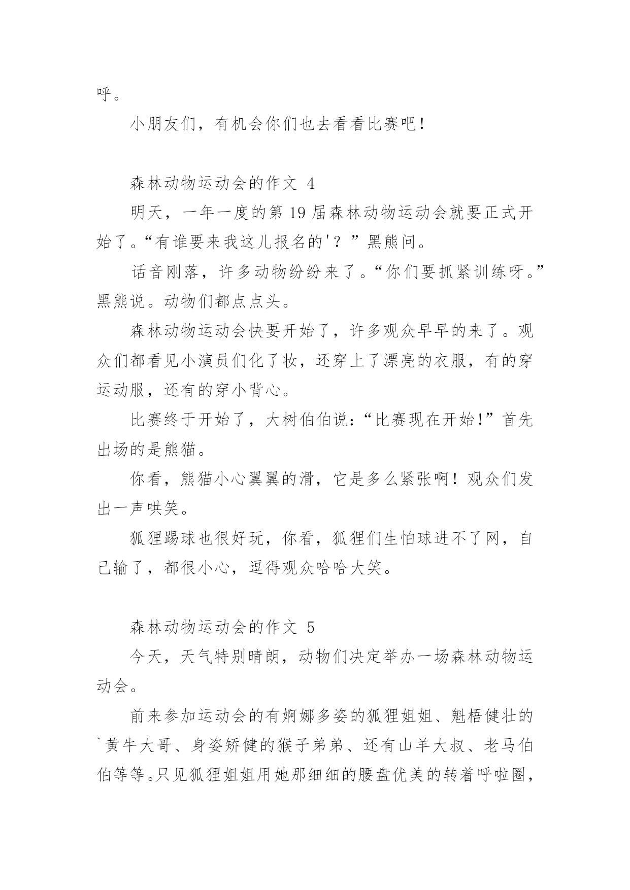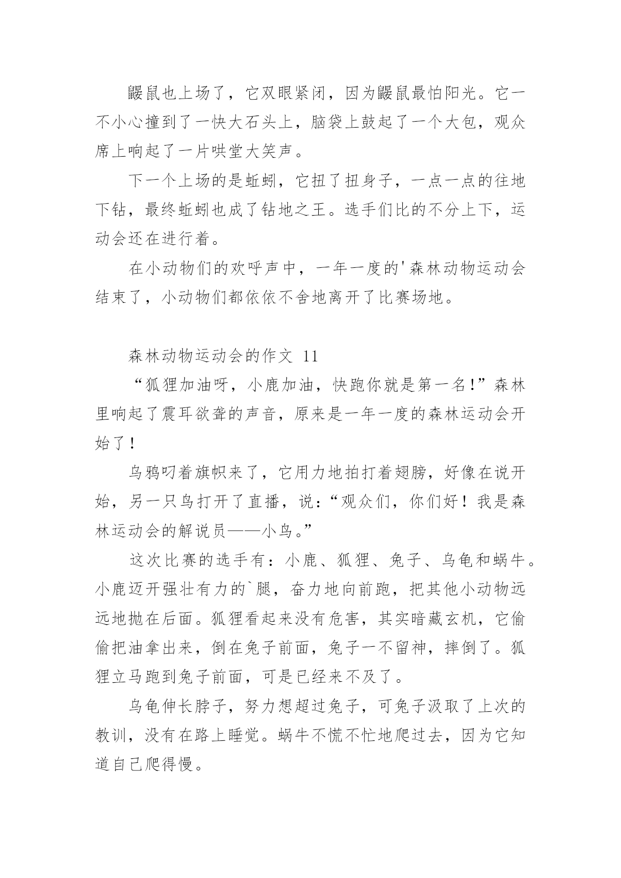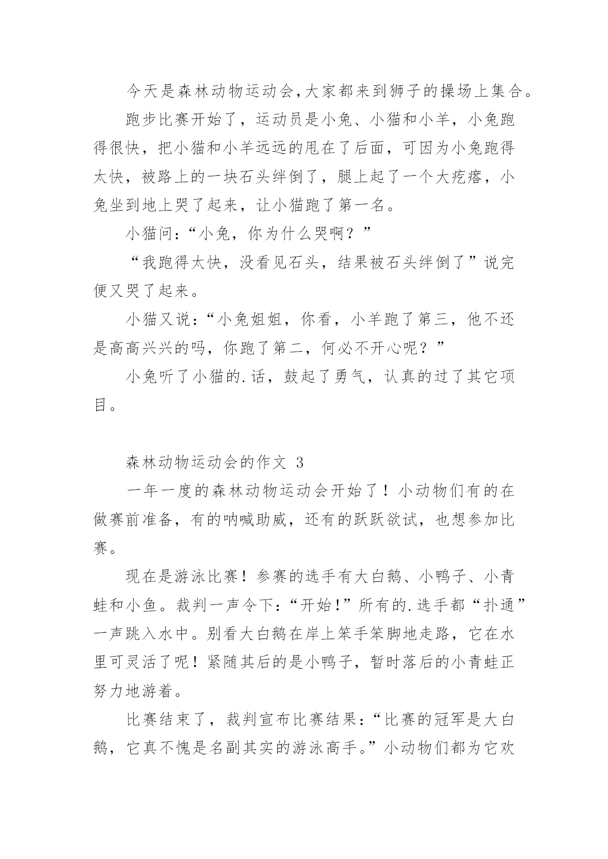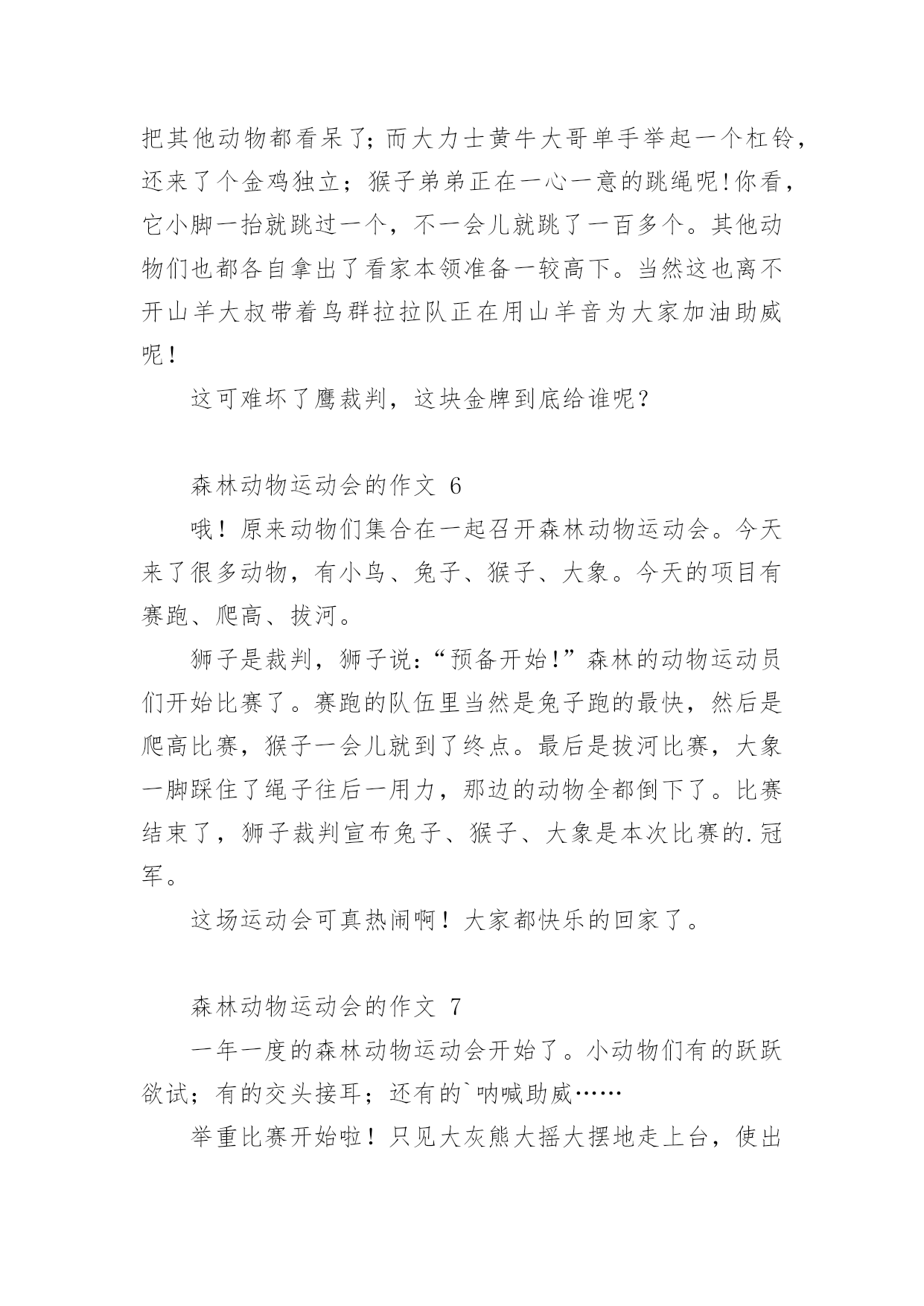 森林动物运动会的作文森林动物运动会的作文(精选53篇)无论在学习、工作或是生活中,大家对作文都再熟悉不过了吧,作文一定要做到主题集中,围绕同一主题作深入阐述,切忌东拉西扯,主题涣散甚至无主题。那么问题来了,到底应如何写一篇优秀的作文呢?以下是小编精心整理的森林动物运动会的作文,希望对大家有所帮助。森林动物运动会的作文1森林里一年一度的运动会开幕了,那只自以为是的猎豹对雪豹说:“老雪呀,我是称号‘十年速度王’的猎豹,你不是我的对手。之前的跑步比赛中,猎豹经常是跑步比赛第一,雪豹经常是第二,这回比赛是最后一期了,猎豹、雪豹都很努力的训练过,大象一开枪,两豹同排名老一,慢慢地雪豹暂时领先,猎豹赶紧冲上去,又打了平手,雪豹使劲地跑,速度又增加了许多,雪豹与猎豹之间隔着5米,连后面的'金钱豹也追上了猎豹,到了终点,雪豹成为了森林动物运动会的跑步比赛冠军,这回雪豹老一,金钱豹老二,猎豹老三。这就是森林动物运动会,胜利者以前都是失败者,失败者以前都是胜利者。森林动物运动会的作文2今天是森林动物运动会,大家都来到狮子的操场上集合。跑步比赛开始了,运动员是小兔、小猫和小羊,小兔跑得很快,把小猫和小羊远远的甩在了后面,可因为小兔跑得太快,被路上的一块石头绊倒了,腿上起了一个大疙瘩,小兔坐到地上哭了起来,让小猫跑了第一名。小猫问:“小兔,你为什么哭啊?”“我跑得太快,没看见石头,结果被石头绊倒了”说完便又哭了起来。小猫又说:“小兔姐姐,你看,小羊跑了第三,他不还是高高兴兴的吗,你跑了第二,何必不开心呢?”小兔听了小猫的.话,鼓起了勇气,认真的过了其它项目。森林动物运动会的作文3一年一度的森林动物运动会开始了!小动物们有的在做赛前准备,有的呐喊助威,还有的跃跃欲试,也想参加比赛。现在是游泳比赛!参赛的选手有大白鹅、小鸭子、小青蛙和小鱼。裁判一声令下:“开始!”所有的.选手都“扑通”一声跳入水中。别看大白鹅在岸上笨手笨脚地走路,它在水里可灵活了呢!紧随其后的是小鸭子,暂时落后的小青蛙正努力地游着。比赛结束了,裁判宣布比赛结果:“比赛的冠军是大白鹅,它真不愧是名副其实的游泳高手。”小动物们都为它欢呼。小朋友们,有机会你们也去看看比赛吧!森林动物运动会的作文4明天,一年一度的第19届森林动物运动会就要正式开始了。“有谁要来我这儿报名的'?”黑熊问。话音刚落,许多动物纷纷来了。“你们要抓紧训练呀。”黑熊说。动物们都点点头。森林动物运动会快要开始了,许多观众早早的来了。观众们都看见小演员们化了妆,还穿上了漂亮的衣服,有的穿运动服,还有的穿小背心。比赛终于开始了,大树伯伯说:“比赛现在开始!”首先出场的是熊猫。你看,熊猫小心翼翼的滑,它是多么紧张啊!观众们发出一声哄笑。狐狸踢球也很好玩,你看,狐狸们生怕球进不了网,自己输了,都很小心,逗得观众哈哈大笑。森林动物运动会的作文5今天,天气特别晴朗,动物们决定举办一场森林动物运动会。前来参加运动会的有婀娜多姿的狐狸姐姐、魁梧健壮的`黄牛大哥、身姿矫健的猴子弟弟、还有山羊大叔、老马伯伯等等。只见狐狸姐姐用她那细细的腰盘优美的转着呼啦圈,把其他动物都看呆了;而大力士黄牛大哥单手举起一个杠铃,还来了个金鸡独立;猴子弟弟正在一心一意的跳绳呢!你看,它小脚一抬就跳过一个,不一会儿就跳了一百多个。其他动物们也都各自拿出了看家本领准备一较高下。当然这也离不开山羊大叔带着鸟群拉拉队正在用山羊音为大家加油助威呢!这可难坏了鹰裁判,这块金牌到底给谁呢?森林动物运动会的作文6哦!原来动物们集合在一起召开森林动物运动会。今天来了很多动物,有小鸟、兔子、猴子、大象。今天的项目有赛跑、爬高、拔河。狮子是裁判,狮子说:“预备开始!”森林的动物运动员们开始比赛了。赛跑的队伍里当然是兔子跑的最快,然后是爬高比赛,猴子一会儿就到了终点。最后是拔河比赛,大象一脚踩住了绳子往后一用力,那边的动物全都倒下了。比赛结束了,狮子裁判宣布兔子、猴子、大象是本次比赛的.冠军。这场运动会可真热闹啊!大家都快乐的回家了。森林动物运动会的作文7一年一度的森林动物运动会开始了。小动物们有的跃跃欲试;有的交头接耳;还有的`呐喊助威……举重比赛开始啦!只见大灰熊大摇大摆地走上台,使出全身的力量,“嘿”的一声举起了一根树枝,他自以为自己做的很好,就得意地四处张望。瞧这边,大象不慌不忙地走上前来,用鼻子卷起一根长长的木头,“呀”的一声举到比自己头顶还要高的地方。“这大象可真厉害!”小动物们纷纷鼓掌。小蚂蚁顶着大米粒,在台上转了一圈。“这米粒怎么会转呢?”台下的观众议论起来。山羊裁判说:“小蚂蚁胜利,因为他能举起比他身体重好几倍的东西,这是其它选手做不到的。”观众们纷纷为蚂蚁鼓掌。森林动物运动会的作文8今天的天气晴朗,森林里迎来了一年一度的运动会,到处洋溢着欢乐的气氛!今年的.参赛