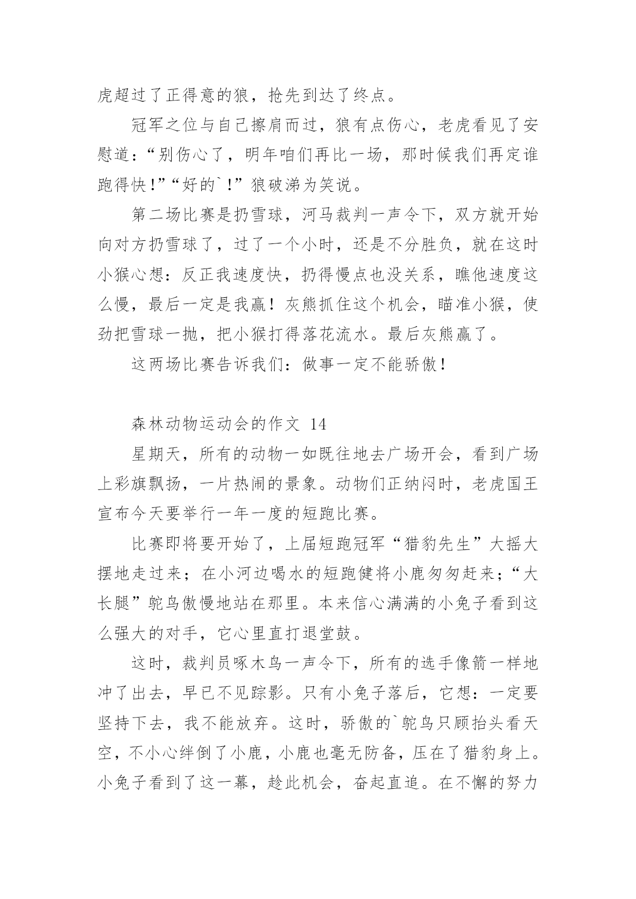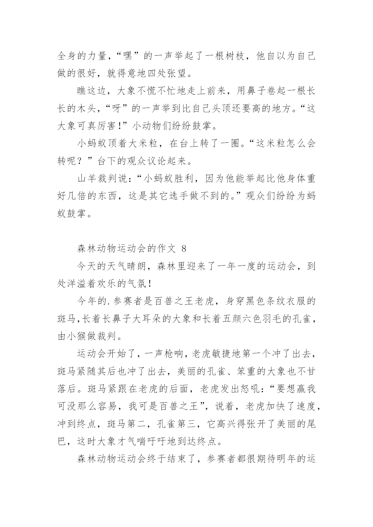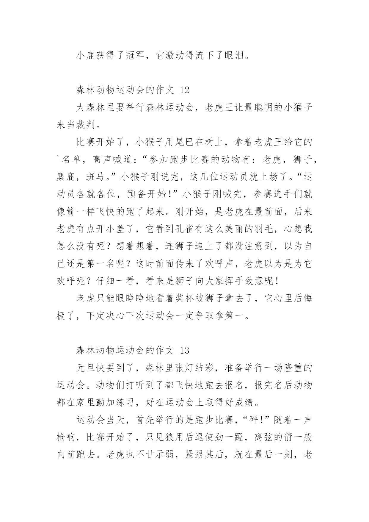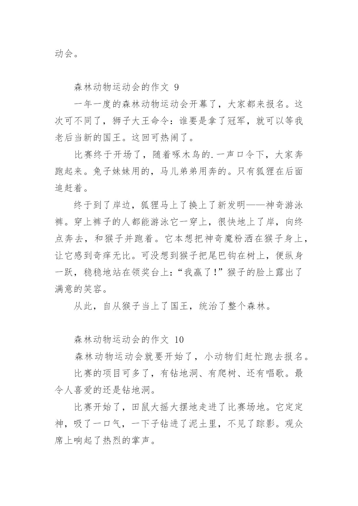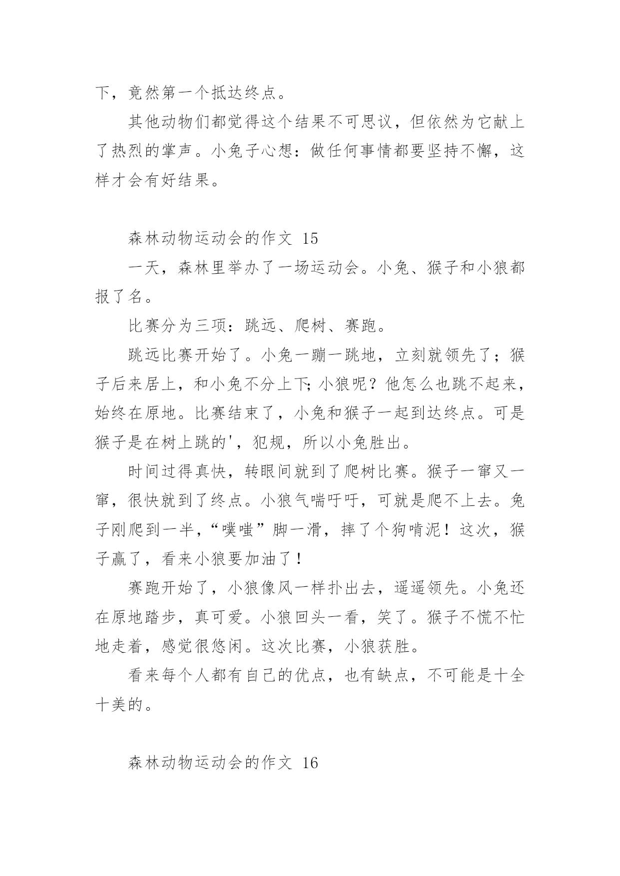 森林动物运动会的作文森林动物运动会的作文(精选53篇)无论在学习、工作或是生活中,大家对作文都再熟悉不过了吧,作文一定要做到主题集中,围绕同一主题作深入阐述,切忌东拉西扯,主题涣散甚至无主题。那么问题来了,到底应如何写一篇优秀的作文呢?以下是小编精心整理的森林动物运动会的作文,希望对大家有所帮助。森林动物运动会的作文1森林里一年一度的运动会开幕了,那只自以为是的猎豹对雪豹说:“老雪呀,我是称号‘十年速度王’的猎豹,你不是我的对手。之前的跑步比赛中,猎豹经常是跑步比赛第一,雪豹经常是第二,这回比赛是最后一期了,猎豹、雪豹都很努力的训练过,大象一开枪,两豹同排名老一,慢慢地雪豹暂时领先,猎豹赶紧冲上去,又打了平手,雪豹使劲地跑,速度又增加了许多,雪豹与猎豹之间隔着5米,连后面的'金钱豹也追上了猎豹,到了终点,雪豹成为了森林动物运动会的跑步比赛冠军,这回雪豹老一,金钱豹老二,猎豹老三。这就是森林动物运动会,胜利者以前都是失败者,失败者以前都是胜利者。森林动物运动会的作文2今天是森林动物运动会,大家都来到狮子的操场上集合。跑步比赛开始了,运动员是小兔、小猫和小羊,小兔跑得很快,把小猫和小羊远远的甩在了后面,可因为小兔跑得太快,被路上的一块石头绊倒了,腿上起了一个大疙瘩,小兔坐到地上哭了起来,让小猫跑了第一名。小猫问:“小兔,你为什么哭啊?”“我跑得太快,没看见石头,结果被石头绊倒了”说完便又哭了起来。小猫又说:“小兔姐姐,你看,小羊跑了第三,他不还是高高兴兴的吗,你跑了第二,何必不开心呢?”小兔听了小猫的.话,鼓起了勇气,认真的过了其它项目。森林动物运动会的作文3一年一度的森林动物运动会开始了!小动物们有的在做赛前准备,有的呐喊助威,还有的跃跃欲试,也想参加比赛。现在是游泳比赛!参赛的选手有大白鹅、小鸭子、小青蛙和小鱼。裁判一声令下:“开始!”所有的.选手都“扑通”一声跳入水中。别看大白鹅在岸上笨手笨脚地走路,它在水里可灵活了呢!紧随其后的是小鸭子,暂时落后的小青蛙正努力地游着。比赛结束了,裁判宣布比赛结果:“比赛的冠军是大白鹅,它真不愧是名副其实的游泳高手。”小动物们都为它欢呼。小朋友们,有机会你们也去看看比赛吧!森林动物运动会的作文4明天,一年一度的第19届森林动物运动会就要正式开始了。“有谁要来我这儿报名的'?”黑熊问。话音刚落,许多动物纷纷来了。“你们要抓紧训练呀。”黑熊说。动物们都点点头。森林动物运动会快要开始了,许多观众早早的来了。观众们都看见小演员们化了妆,还穿上了漂亮的衣服,有的穿运动服,还有的穿小背心。比赛终于开始了,大树伯伯说:“比赛现在开始!”首先出场的是熊猫。你看,熊猫小心翼翼的滑,它是多么紧张啊!观众们发出一声哄笑。狐狸踢球也很好玩,你看,狐狸们生怕球进不了网,自己输了,都很小心,逗得观众哈哈大笑。森林动物运动会的作文5今天,天气特别晴朗,动物们决定举办一场森林动物运动会。前来参加运动会的有婀娜多姿的狐狸姐姐、魁梧健壮的`黄牛大哥、身姿矫健的猴子弟弟、还有山羊大叔、老马伯伯等等。只见狐狸姐姐用她那细细的腰盘优美的转着呼啦圈,把其他动物都看呆了;而大力士黄牛大哥单手举起一个杠铃,还来了个金鸡独立;猴子弟弟正在一心一意的跳绳呢!你看,它小脚一抬就跳过一个,不一会儿就跳了一百多个。其他动物们也都各自拿出了看家本领准备一较高下。当然这也离不开山羊大叔带着鸟群拉拉队正在用山羊音为大家加油助威呢!这可难坏了鹰裁判,这块金牌到底给谁呢?森林动物运动会的作文6哦!原来动物们集合在一起召开森林动物运动会。今天来了很多动物,有小鸟、兔子、猴子、大象。今天的项目有赛跑、爬高、拔河。狮子是裁判,狮子说:“预备开始!”森林的动物运动员们开始比赛了。赛跑的队伍里当然是兔子跑的最快,然后是爬高比赛,猴子一会儿就到了终点。最后是拔河比赛,大象一脚踩住了绳子往后一用力,那边的动物全都倒下了。比赛结束了,狮子裁判宣布兔子、猴子、大象是本次比赛的.冠军。这场运动会可真热闹啊!大家都快乐的回家了。森林动物运动会的作文7一年一度的森林动物运动会开始了。小动物们有的跃跃欲试;有的交头接耳;还有的`呐喊助威……举重比赛开始啦!只见大灰熊大摇大摆地走上台,使出全身的力量,“嘿”的一声举起了一根树枝,他自以为自己做的很好,就得意地四处张望。瞧这边,大象不慌不忙地走上前来,用鼻子卷起一根长长的木头,“呀”的一声举到比自己头顶还要高的地方。“这大象可真厉害!”小动物们纷纷鼓掌。小蚂蚁顶着大米粒,在台上转了一圈。“这米粒怎么会转呢?”台下的观众议论起来。山羊裁判说:“小蚂蚁胜利,因为他能举起比他身体重好几倍的东西,这是其它选手做不到的。”观众们纷纷为蚂蚁鼓掌。森林动物运动会的作文8今天的天气晴朗,森林里迎来了一年一度的运动会,到处洋溢着欢乐的气氛!今年的.参赛