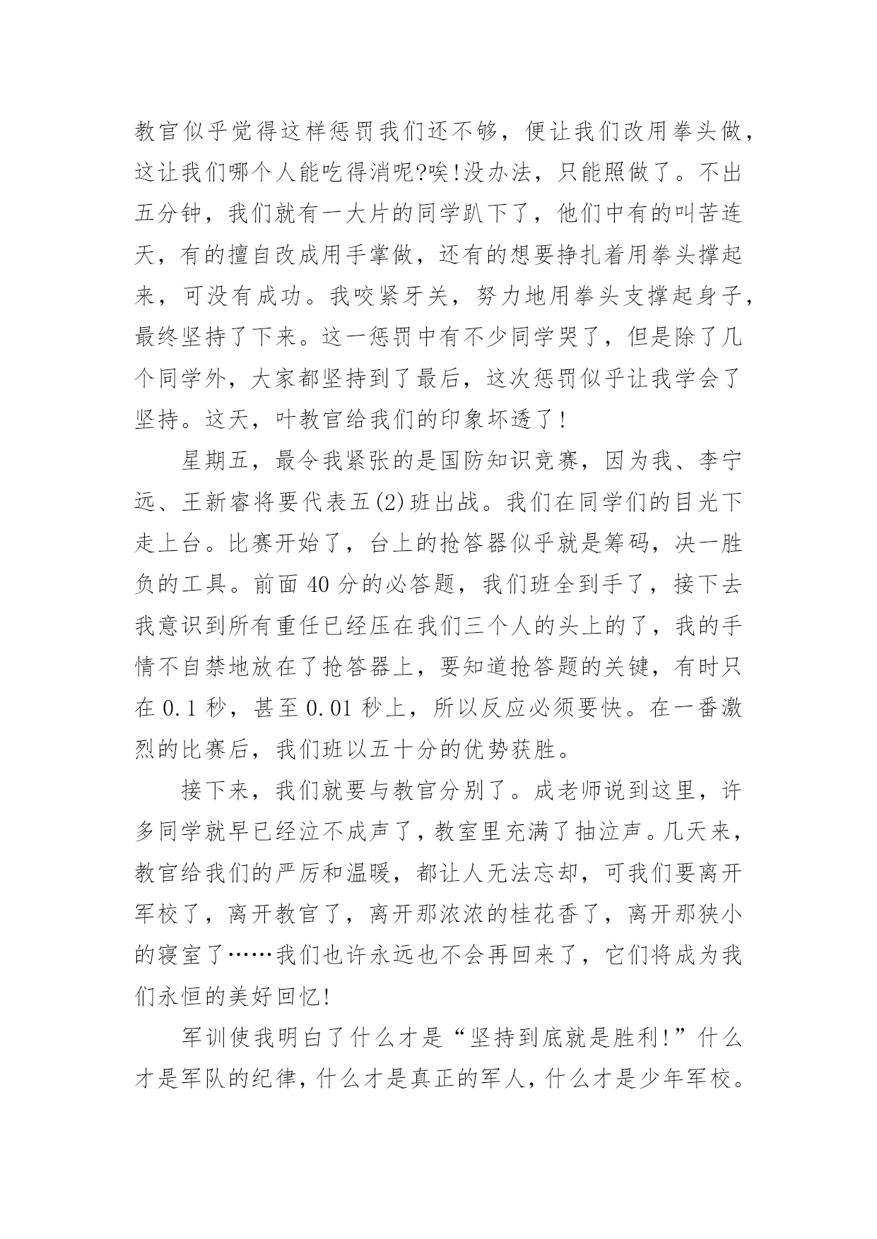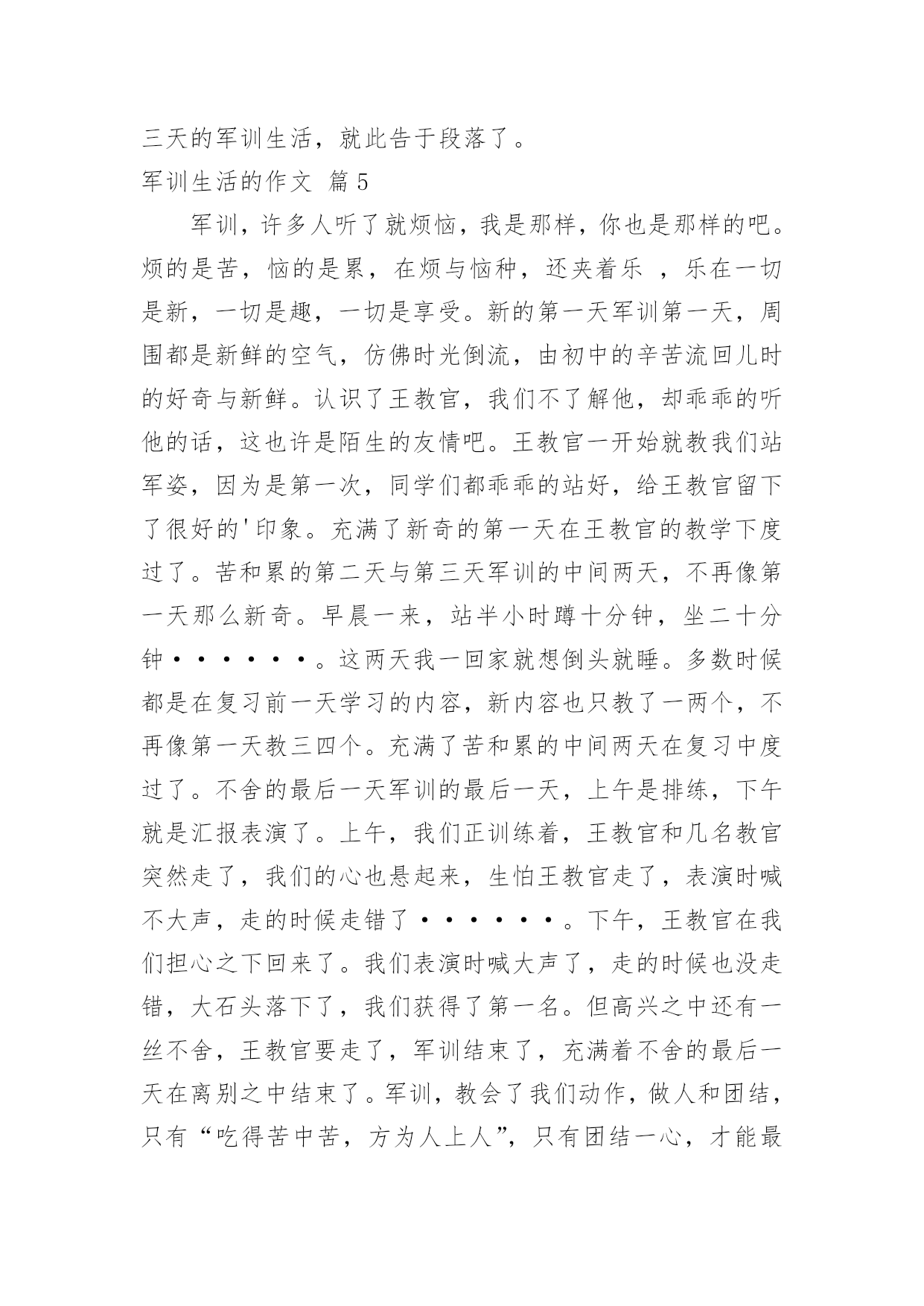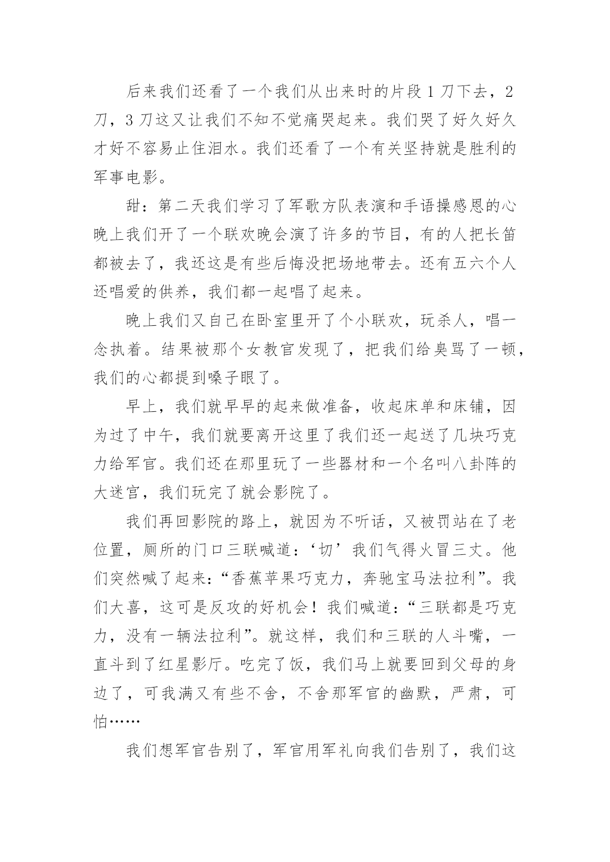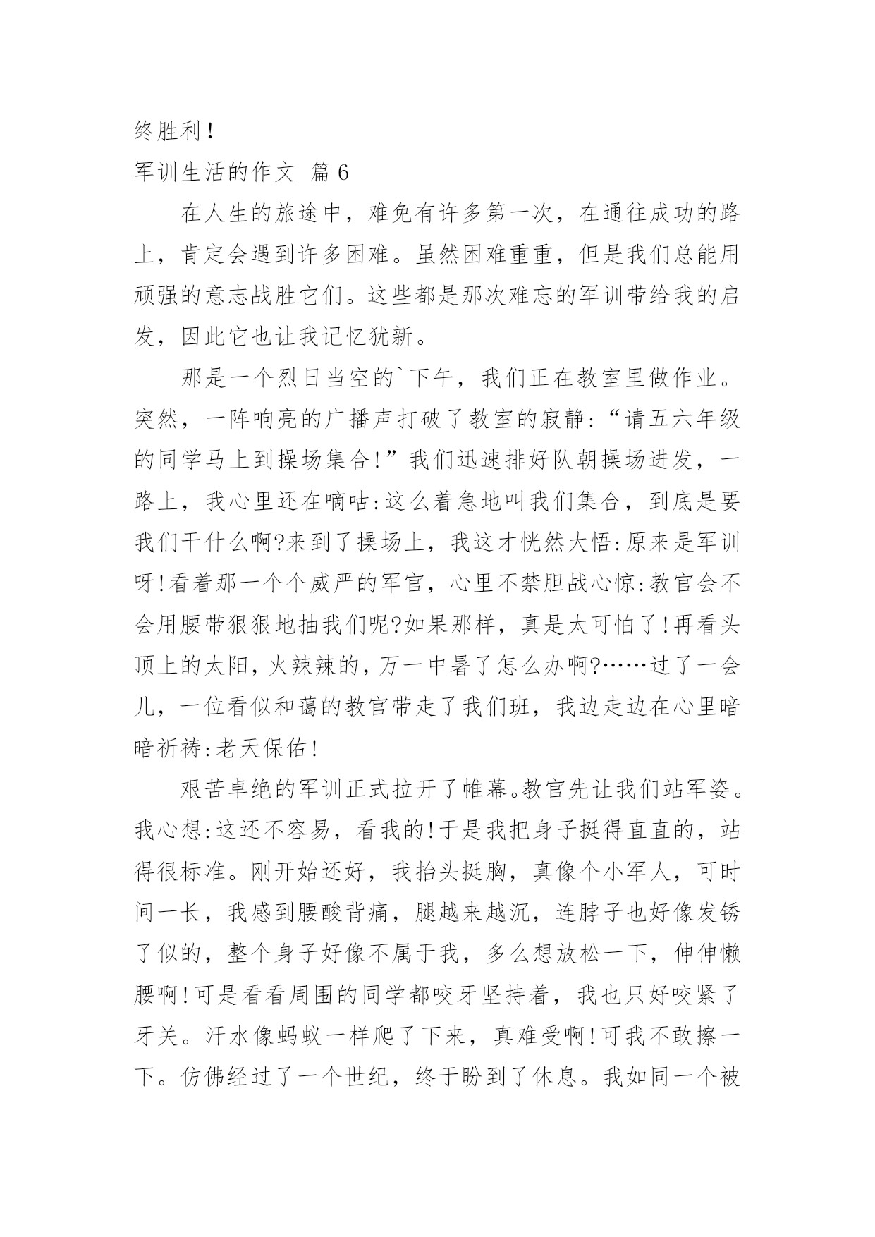 军训生活的作文【优秀】军训生活的作文在现实生活或工作学习中,大家对作文都再熟悉不过了吧,作文根据写作时限的不同可以分为限时作文和非限时作文。那么你有了解过作文吗?下面是小编为大家收集的军训生活的作文6篇,欢迎阅读与收藏。军训生活的作文篇1前几天,迎着春日的灿烂阳光,全体内蒙古小记者齐聚呼市青城公园的人民英雄纪念碑下,体验了两次别具意义的军训生活。下午三点整,年轻的孙教官准时到来。经过提前的队列编排,男女分站的两行纵队远远望去,不论是从矮到高,还是从高到矮,像阶梯似的摆在那里,孙教官风趣地夸奖说:“小记者战士还蛮正规的嘛!”军训开始了,我们首先训练立正。“两条腿并拢,两脚跟靠拢,两脚分开约60度,腰和后背要挺直,两只手贴着裤缝,脖子自然伸直,两眼目视前方…….”听着孙教官的耐心讲解,盯着他的'示范动作,有的小记者窃窃私语道:“哦!原来立正看似简单却很讲究规则,学校体育老师教的原来也不是很标准的呀!”接着,我们又学习了稍息、向左向右向后转、列队报数、原地踏步、敬礼等标准姿势。没想到这些练习起来比较乏味的几个动作,我们竟训练了整整一个下午,而且令大家自感惭愧的是,全体38名小记者能真正达到训练合格标准的还不到30名,看来,现在的中小学生太需要正规的军训活动了,在场外观看的家长们也纷纷表示:“像这样的军训活动,学校也应该经常组织开展,让孩子们懂得集体行动要统一听从指挥的重要意义。”两次军训,我不但学会了稍息、立正、敬礼等标准姿势,而且还体会到了解放军叔叔部队训练的辛苦,从而懂得了我们要从小养成积极主动、吃苦耐劳、坚定意志的好习惯,发扬军人严于律己、雷厉风行的好作风,长大后成为一名素质高端,能力出色的人才。军训生活的作文篇29月26日我们从学校出发,开始了为期五天的军训生活,军训生活与我们想象的太不一样了!为期五天的军训生活里,我们饱尝了酸甜苦辣咸,知道了军队的纪律,体验了军营的生活……在五天的军训生活中,最让我难以忘怀的是第一天的惩罚与最后一天的竞赛和告别。星期一,是教官对我们最严厉的一天,但也是印象最深刻的一天。那天早晨,我们一到军校,教官说的`第一句话就让我感到教官的严厉。特别是进了教室后,给鞠文轩的那当头一棒,更是让我们闻风丧胆。不出我的意料,教官给我们的惩罚将会是“一波未平一波又起”。果然,下午教官惩罚我们用手支撑着趴在地上,时间久了,我们便站起身来活动一下,这一活动可不要紧,被叶教官发现了!教官一怒之下,就惩罚大家做俯卧撑,开始大家只是用手掌做的,可叶教官似乎觉得这样惩罚我们还不够,便让我们改用拳头做,这让我们哪个人能吃得消呢?唉!没办法,只能照做了。不出五分钟,我们就有一大片的同学趴下了,他们中有的叫苦连天,有的擅自改成用手掌做,还有的想要挣扎着用拳头撑起来,可没有成功。我咬紧牙关,努力地用拳头支撑起身子,最终坚持了下来。这一惩罚中有不少同学哭了,但是除了几个同学外,大家都坚持到了最后,这次惩罚似乎让我学会了坚持。这天,叶教官给我们的印象坏透了!星期五,最令我紧张的是国防知识竞赛,因为我、李宁远、王新睿将要代表五(2)班出战。我们在同学们的目光下走上台。比赛开始了,台上的抢答器似乎就是筹码,决一胜负的工具。前面40分的必答题,我们班全到手了,接下去我意识到所有重任已经压在我们三个人的头上的了,我的手情不自禁地放在了抢答器上,要知道抢答题的关键,有时只在0.1秒,甚至0.01秒上,所以反应必须要快。在一番激烈的比赛后,我们班以五十分的优势获胜。接下来,我们就要与教官分别了。成老师说到这里,许多同学就早已经泣不成声了,教室里充满了抽泣声。几天来,教官给我们的严厉和温暖,都让人无法忘却,可我们要离开军校了,离开教官了,离开那浓浓的桂花香了,离开那狭小的寝室了……我们也许永远也不会再回来了,它们将成为我们永恒的美好回忆!军训使我明白了什么才是“坚持到底就是胜利!”什么才是军队的纪律,什么才是真正的军人,什么才是少年军校。军训生活的作文篇3在一个月前,我参加了人生中第一个军训,这几天火热的军训生活,让我既兴奋又疲惫,同时也让我懂得了很多道理。到了军训基地我才意识到军训的“可怕”。基地在十分美丽的乡下,这种天然的美是城市了看不到的,蔚蓝的天上不时飘来几片洁白的云朵儿,变换各种的形状任由人们想象。教官几乎每一句话都在提醒着我们:军训是来吃苦的,我们要坚强的度过这七天,努力!坚持下去!!第一天是不适应的,一天下来我们连一步也不想走了,倒到床上就睡!时光总是过的好快一转眼就天亮了我们又拖着沉重的步子走向训练场地,当时我就想:放下算了,在家里我哪受过这罪啊!但是我不想让新同学看不起我啊,他们都在坚持呢!我又怎能放下呢?就这样在我的纠结中又度过一天,随着渐渐的适应我发现军训其实也不是很累,反倒很搞笑!剩下的几天很快就过去了,军训的确是辛苦的