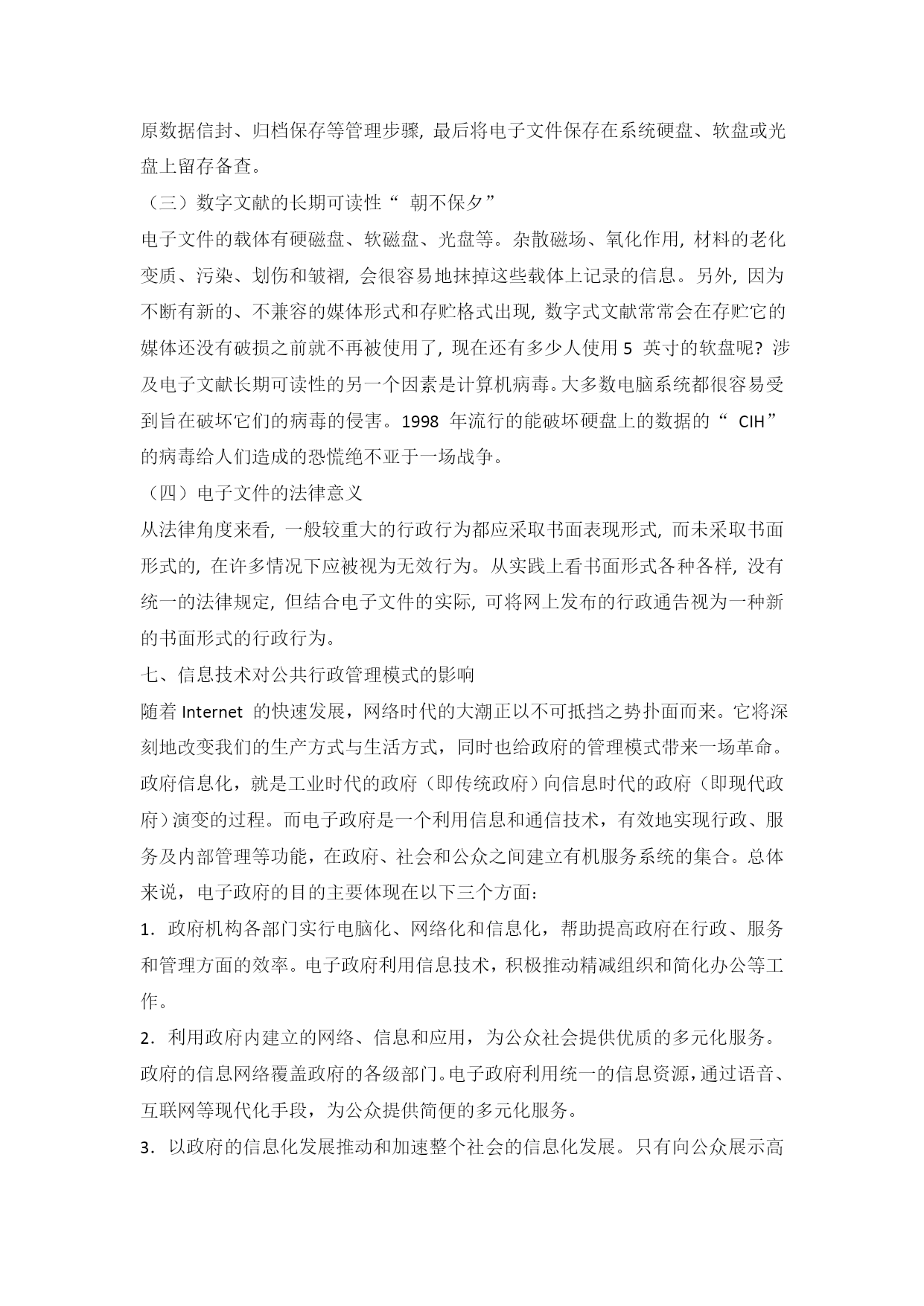 论信息技术对公共行政的影响摘要:信息技术的发展在公共行政管理模式的变革、提高行政决策的合理性和民主性、引发公共行政方法的创新和促进公共行政人员素质的提高四个方面给公共行政带来影响。应提高和强化对信息技术的认识,搞高行政人员的科技素质和加强信息技术的安全性处理,从而提高公共行政的效率,推动公共行政的进程。关键词:信息技术;公共行政;公共行政随着电子信息技术的飞速发展,特别是国际互联网在世界各国的普及,人类正步人一个全球化的、便捷高效的计算机网络化空间。任何一场科学技术的革命,都将导致社会的变革,现代信息技术的产生和发展也不例外。这场数字革命在给人类社会带来巨大进步和效率的同时,也对人类现存的制度和规则提出了新的挑战。信息技术在给传统的商业交易和经营模式带来革命性变革的同时,也要求有与之相适应的灵活、高效、人性化的公共行政体制,“电子政务”、“电子政府”、“信息化政府”等正是在这样一个大背景下应运而生的。科技进步影响行政系统,作为行政生态学的一个基本观点一直备受关注。尽管有关科技对公共行政的影响问题尚无全面系统的专门分析和深入研究,但信息技术对承担公共职责并履行公共职能的公共行政产生了全方位的冲击和深层次的震荡乃是一个不争的事实。以此为基点,本文研究当代公共行政与它所处的信息技术快速发展背景之间的关系,探讨信息技术对当代公共行政的深层作用机制。在信息时代,信息技术是最基本和最普遍的技术手段,我们正处在公共行政信息技术化的起点,预测信息技术在公共行政中带来变革的合理形态,对于我们在公共行政领域中自觉接纳和应用信息技术是非常有意义的。一、信息技术与公共行政的概述(一)信息技术信息技术(InformationTechnology,简称IT),是指利用电子计算机和现代通讯手段获取、传递、存储、处理、显示信息和分配信息的技术。(二)公共行政公共行政,就是国家行政机构依法管理社会公共事务的有效活动。而其主要功能有以下几点:提供公共产品、实现社会公平、实施管制、宏观调控。(三)信息技术对公共行政影响公共行政,就是国家行政机构依法管理社会公共事务的有效活动。而其主要功能有以下几点:提供公共产品、实现社会公平、实施管制、宏观调控。因此,公共行政对于人的生活以及国家的管理来说是必不可少的。在公共行政运行过程中涉及行政管理模式、行政组织与人员、行政公文、行政环境等因素,下面我们将就这些因素分别论述信息技术对公共行政的积极影响以及消极影响。1.信息技术对公共行政的推动促进(1)促使公共行政中管理模式的更新。为迎接信息社会的挑战,推进政府部门办公自动化、网络化、电子化、全面信息共享,从而提高公共行政的效能已成为全球范围追求的新的政府管理模式。目前,西方发达国家为提高国际竞争优势,相继推出基于网络构建的“电子化政府”,作为提升政府效率的重要措施。所谓电子化政府是指政府有效利用现代信息技术,通过不同的信息技术服务设施对政府机关、企业、社会组织和公民提供方便、快捷、高质量的公共服务,用以促进政府与社会的双向沟通。它的基本功能包括:传递信息、政府网上办公、开展政府公共关系。信息技术的这一应用实现了精简政府机构、减少政府开支、提高政府效率以及更好的开展政府公共关系。(2)促使公共行政中主体人员的自身进步。行政人员是公共行政中的主体人员,信息技术的发展与应用有利于其提高自身素质。信息技术的发展对公共行政人员的知和技能提出了更高的要求,同时信息技术带来的教育方式的更新也为行政人员学习管理识、开阔视野、全面发展节约了时间,提供了便捷的方法。有助于行政人员了解最新的公共行政管理趋势,不断地接触新鲜事物,了解世界形势,充实自己,提高个人的管理水平创造了条件。(3)更加准确定位行政目标,使行政方法更加便利。从公共行政的概念可以得知,其客体是社会公共事务,因而行政决策的目标必须围绕着社会公共事务来展开,一切应以公共产品的消费者满意为决策。因而决策过程必须民主公开,最大程度的让民众参与决策,集合众力准确把握目标,减少失误。而信息技术的应用为政府于人民提供了更多便利的沟通交流方式,有利于增强处理公共事务的凝聚力,也使群众对政府的满意度相对提高。现代信息技术的发展,使得“电子化政府”越来越完善,这就促生了新的行政方法。改善现有行政方法的信息基础和信息通讯手段。电子会议、远距离控制,分布式工作等新方式的产生大大便利了行政方法的实施。2.信息技术对公共行政的消极影响(1)增加了政府以及个人信息的不安全因素。信息技术的发展促使大量信息以及文件记录的电子化,网络化。网络中众多不安全因素如病毒,黑客等极可能导致信息的冗余,篡改或是丢失。同时对于行政公文还有诸多不利因素:文件记录的原始性、凭证性受影响。电子文件的可随意复制和编辑使其原始性难以确认;重要