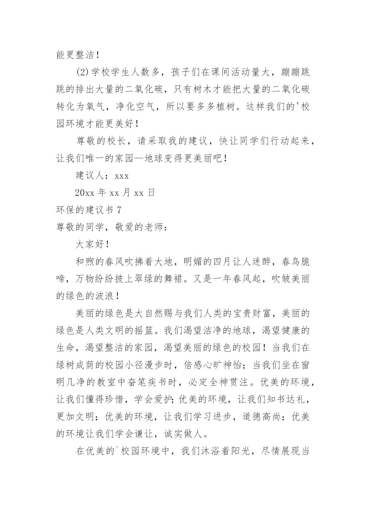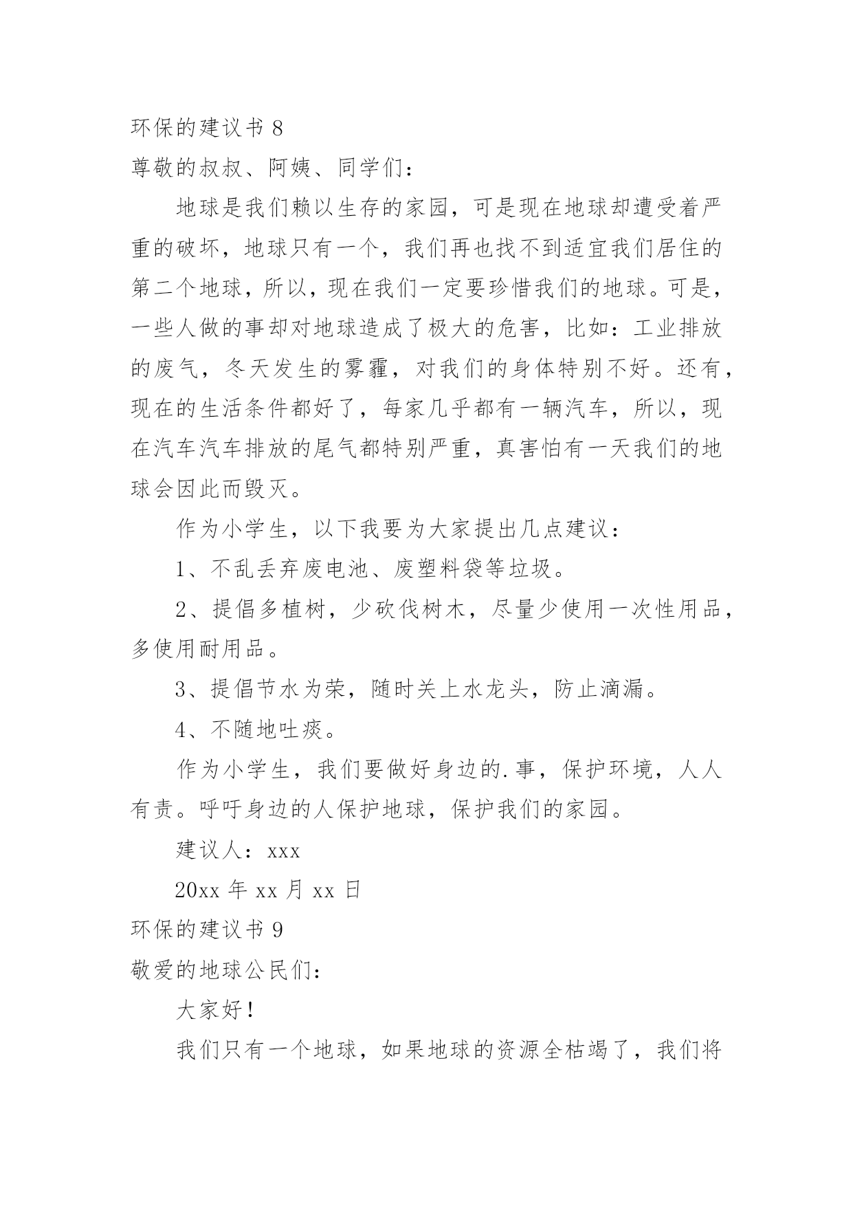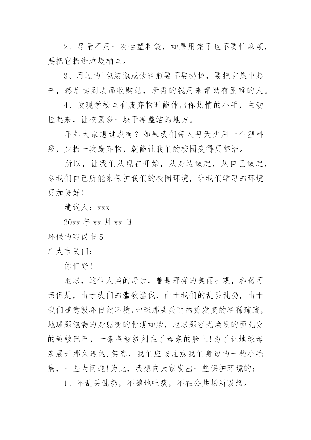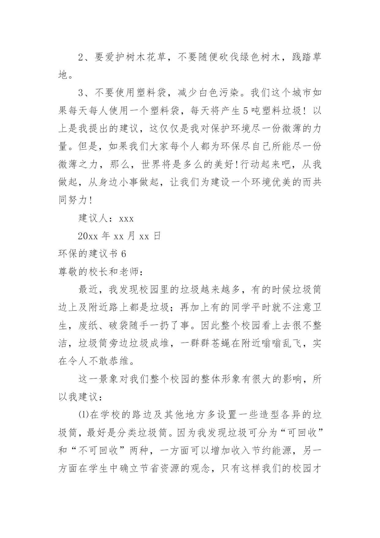 环保的建议书环保的建议书随着社会一步步向前发展,建议书在我们的视野里出现的频率越来越高,建议书是个人或团体,对整体发展或某项工作,向组织提出具体建议时使用的一种书信。还是对建议书一筹莫展吗?下面是小编收集整理的环保的建议书,希望能够帮助到大家。环保的建议书1濮阳市的市民们:你们好!今天,我给我们濮阳市些建议书,是为了我们濮阳市的环保采写的。众所周知我们濮阳市一座历史悠久的城市。上古时期帝王舜就在这里打渔。而且濮阳市一座龙城。但在这历史悠久的城市里,却拥有着不爱环保的现象。比如人们随地乱扔垃圾,不把垃圾扔进垃圾箱。还有人随地大小便,是人走到大都会闻到骚味。宠物也随地大小便,再加上人们有时在小草和鲜花上踩踏,而是他们尽早的枯萎。有的小朋友还在草坪上踢足球,把草坪能得凌乱不堪。还有的工厂乱排放污水和废气,使得我们的濮阳母亲河——濮水河受到了严重的污染,使得鱼虾不能生存而被毒死。这都是人类不爱护怀抱的缘故啊!再这样下去我们的濮阳迟早会成为一座人人都厌烦的脏城市了。虽然我们濮阳有许许多多的卫生清洁员,但是光靠他们的努力也是不行的.。如果人人都不停的制造垃圾,而不爱护我们的坏境,就是有成千上百个清洁员也是忙不过来的呀!对此我提出建议1、坚决不随地乱扔垃圾。2、不随地大小便。3、不随地吐痰。4、工厂不乱排废水废气废渣5、不在墙上乱涂乱画6、不用一次性的东西,纸张要两面用7、垃圾要扔进垃圾箱8、勤植树多造林,不随意毁坏绿色植物。我希望这些建议大家真正做到,做一个环保志愿者。只有这样,我们的家园才会更美好、更洁净。我们的濮阳才会成为一座人人都想来居住的城市,成为一座大家都称赞的文明城。建议人:xxx20xx年xx月xx日环保的建议书2郑州市环保局的叔叔阿姨:你们好!我是创新街小学六七班的一名学生。我从小就在郑州长大,家乡的发展变化大家都是有目共睹的。现在的郑州到处都可以见到“保护环境,人人有责”的'字样。在马路边上,各种各样的垃圾桶美丽极。最近,大家都提倡把可回收和不可回收的垃圾分开。可是光分开不行,还要在垃圾桶上写上可回收垃圾和不可回收的种类,不是每个人都知道可回收和不可回收垃圾是什么。如果有些人不知道就会乱丢一气,这样不仅起不到环保和垃圾分类的作用,还会给垃圾场的工作人员带来困扰。此外我还发现一个严重的问题。有一次,我和妈妈一起等公交车。开始我们是高高兴兴出门,可是当发现公交车站旁边有一个垃圾桶。里面的垃圾已经发臭,路过的行人纷纷捂着鼻子绕道走。后来,凡是有垃圾桶的,我都仔细观察有没有臭味儿。经过一段时间的观察,我发现,现在的垃圾桶都是固定的,不像以前那样可以把垃圾倒出来。因为垃圾桶是固定的,那些环卫工人早晨清垃圾的时候,只是简单的把表面的垃圾检出来底部无法清理到。由此可见,垃圾桶发臭不是因为环卫工人不负责,而是垃圾桶的设计有问题。我在此希望,为家园的美丽,为空气的清新,环保局叔叔再叫人设计一些既实用有好看的垃圾桶,不要再让臭味来污染我们的清新空气。建议人:xxx20xx年xx月xx日环保的建议书3敬爱的xx市市长:您好!自从您接管xx市以后,xx市发生了翻天覆地的变化!以前破旧的南街不在了!以前的南街,路烂得不能再烂了!只要一下雨,南街就成了“无敌丑女”,本来就很烂的街道!更是彻底的毁了容!稀泥满地!汽车从这开过!稀泥就四溅,要是旁边有路人的话,他就会被加工成“巧克力棒”——身上全是稀泥!市民们都不常在南街上逛!但是,自从您接管广汉以后,南街变了,变得漂亮,变得时尚!给我们一种焕然一新的感觉!平房变成了高楼,烂路变成了平坦宽敞的柏油马路!市民们也爱来南街逛了!逛逛商店,买些东西,都方便多了!你上任以后,不仅改变了南街!还改变了武昌路和桂花街等等!广汉真的变漂亮了!这一切都一切,我们都要感谢您——尊敬的市长!但是,我作为一个小学生!作为一个爱护环境的小学生来说,xx市还是有一些缺点:1街道的卫生管理:走在街上看着美丽的广汉,我不禁兴奋起来!好美丽到城市!这就是我的家!突然,街道旁的一堆散发着一阵阵恶臭的`垃圾引起我的注意,这严重的影响力市容啊!我边走边看,一路上,垃圾越来越多,街道变的丑陋不堪!加上垃圾堆散发出的那一阵阵恶臭,我突然感到无比难受!市长,如果我们每一个市民都能做到爱护环境卫生,不随手乱扔垃圾,那么,我们的广汉是否能变得更美丽?不仅如此,xx市存在一个较为严重,且很棘手的问题:一些不法的商贩为了节约每一个月那少的可怜的摊费,就私自占用街道,躲避城管!这种人不是没有,反而还很多,一条街,摆上几个这样的摊位,街道就变得很狭窄了!路人有时也会“无路可走!”街道的保护者在哪?城管在哪?不是没有城管,而是不法商贩太多!难道就没有人能够制服这些不法商贩吗?市长,如果我们能加强打击不法商贩的力度,街道是否会更宽敞一些?商贩们,如果你们能遵