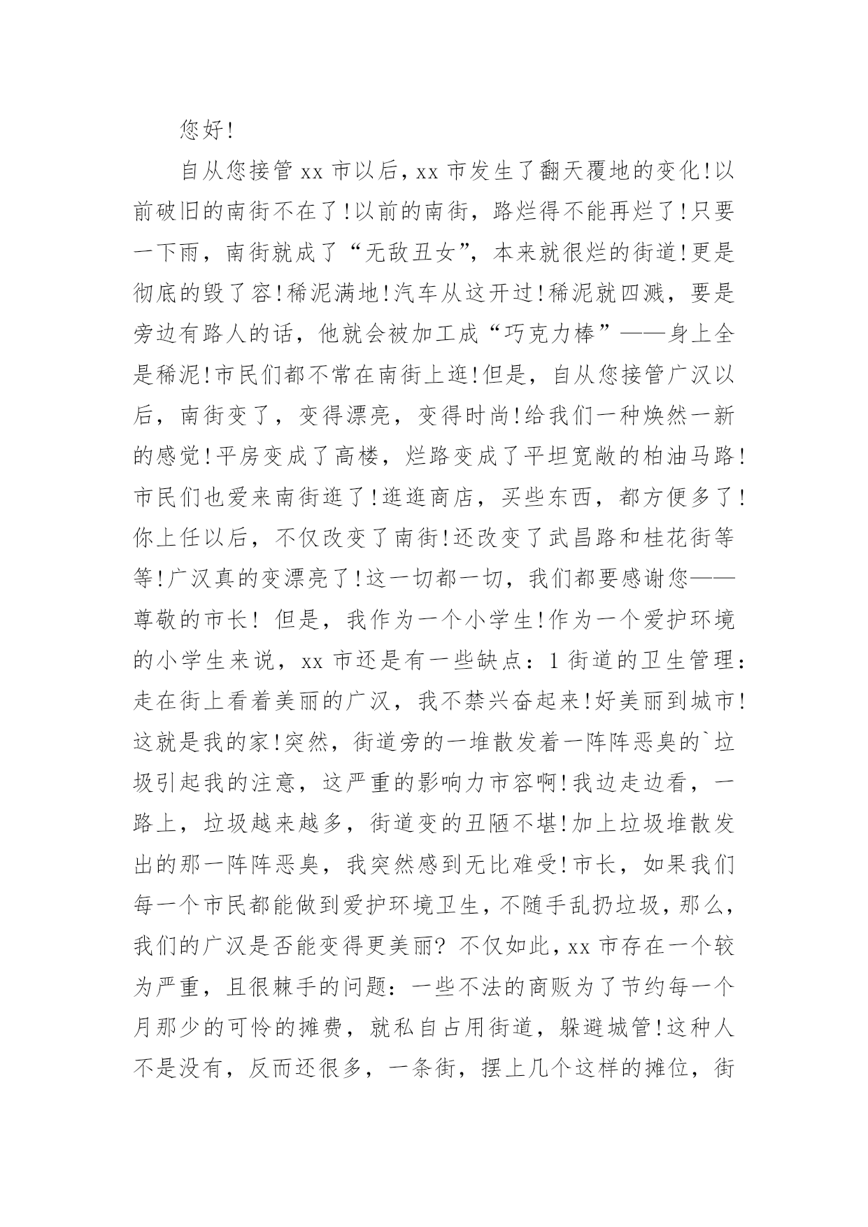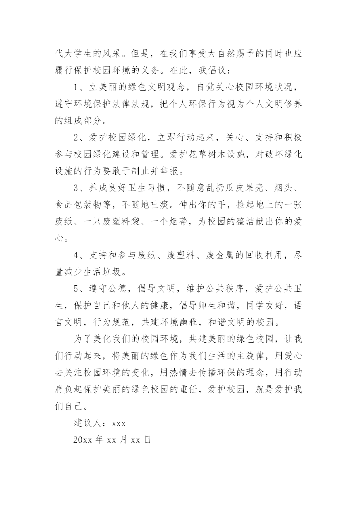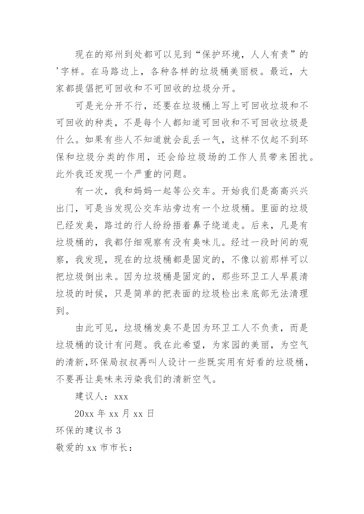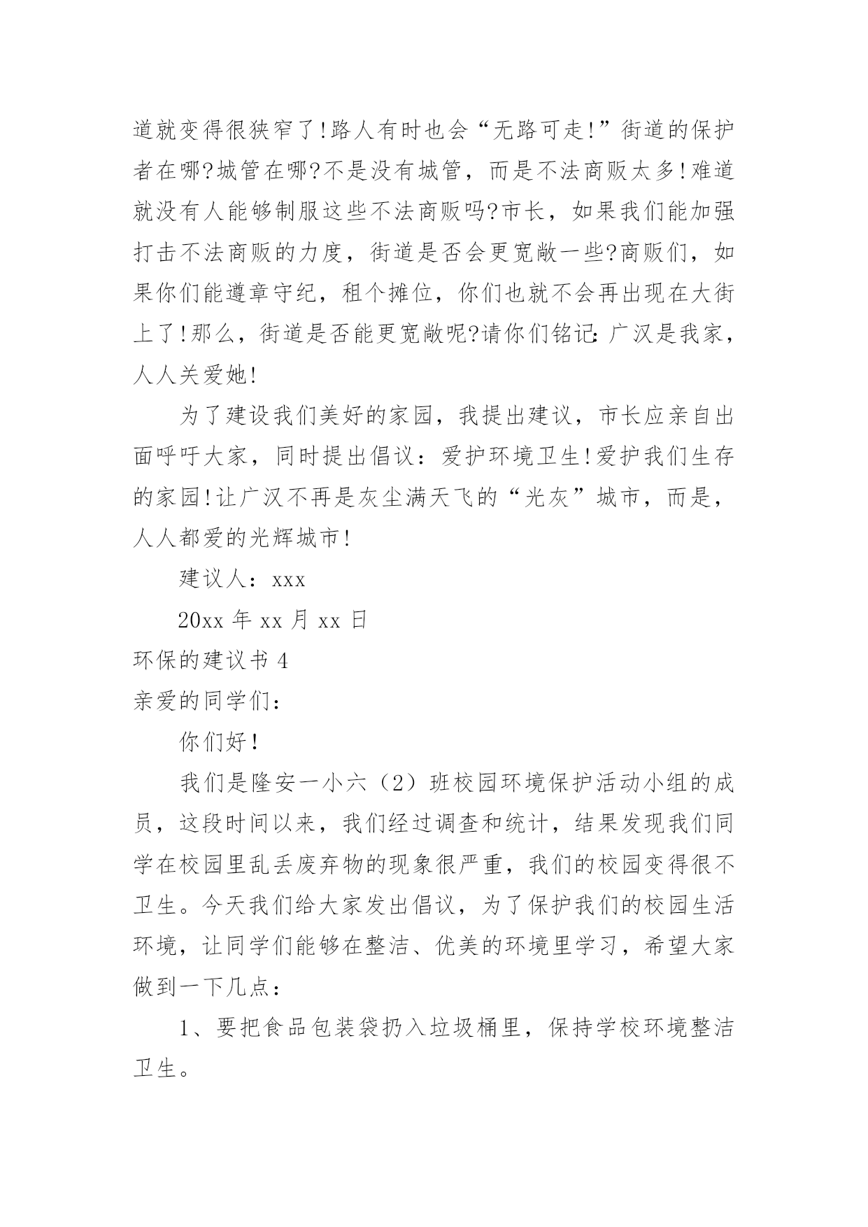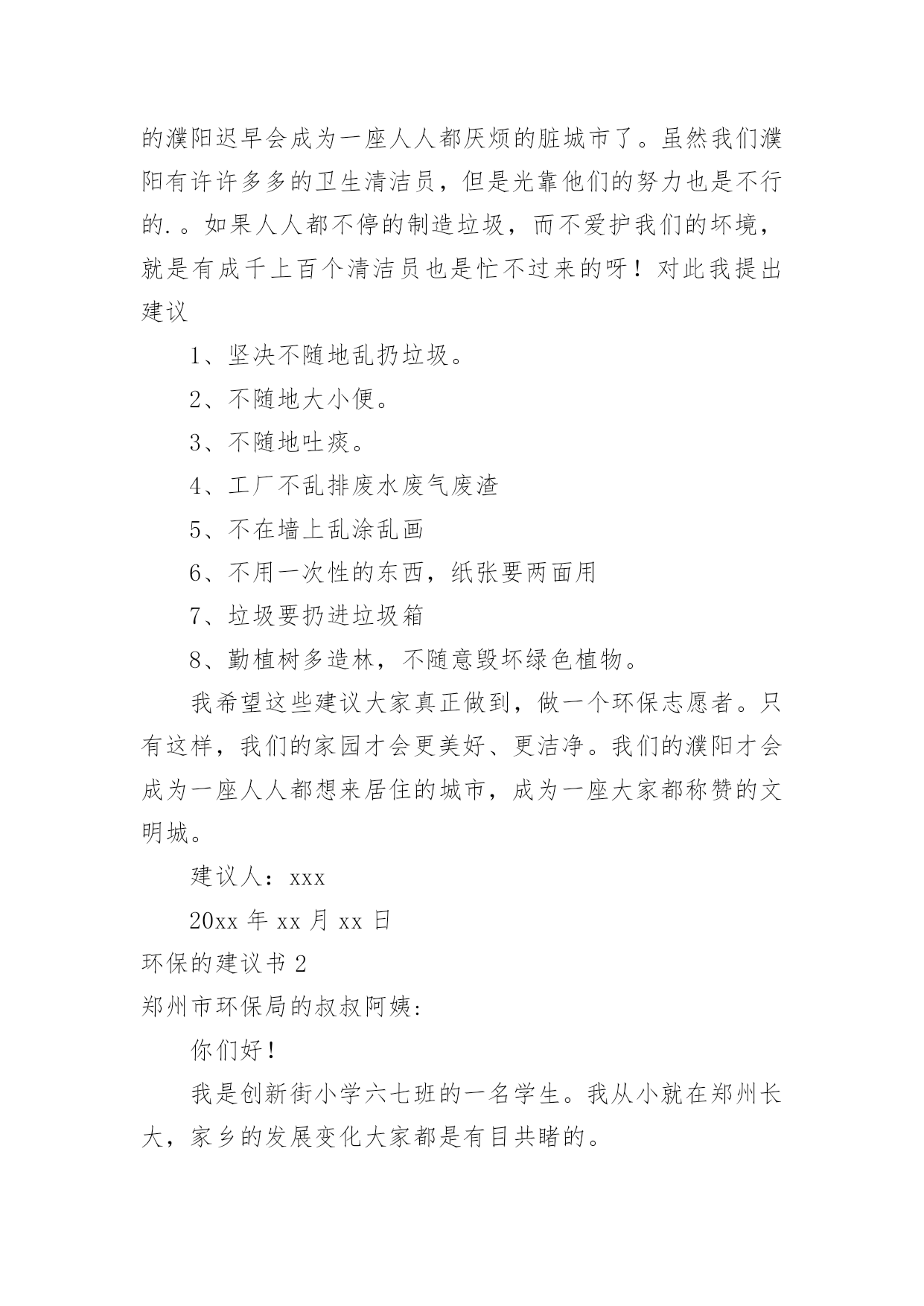 环保的建议书环保的建议书随着社会一步步向前发展,建议书在我们的视野里出现的频率越来越高,建议书是个人或团体,对整体发展或某项工作,向组织提出具体建议时使用的一种书信。还是对建议书一筹莫展吗?下面是小编收集整理的环保的建议书,希望能够帮助到大家。环保的建议书1濮阳市的市民们:你们好!今天,我给我们濮阳市些建议书,是为了我们濮阳市的环保采写的。众所周知我们濮阳市一座历史悠久的城市。上古时期帝王舜就在这里打渔。而且濮阳市一座龙城。但在这历史悠久的城市里,却拥有着不爱环保的现象。比如人们随地乱扔垃圾,不把垃圾扔进垃圾箱。还有人随地大小便,是人走到大都会闻到骚味。宠物也随地大小便,再加上人们有时在小草和鲜花上踩踏,而是他们尽早的枯萎。有的小朋友还在草坪上踢足球,把草坪能得凌乱不堪。还有的工厂乱排放污水和废气,使得我们的濮阳母亲河——濮水河受到了严重的污染,使得鱼虾不能生存而被毒死。这都是人类不爱护怀抱的缘故啊!再这样下去我们的濮阳迟早会成为一座人人都厌烦的脏城市了。虽然我们濮阳有许许多多的卫生清洁员,但是光靠他们的努力也是不行的.。如果人人都不停的制造垃圾,而不爱护我们的坏境,就是有成千上百个清洁员也是忙不过来的呀!对此我提出建议1、坚决不随地乱扔垃圾。2、不随地大小便。3、不随地吐痰。4、工厂不乱排废水废气废渣5、不在墙上乱涂乱画6、不用一次性的东西,纸张要两面用7、垃圾要扔进垃圾箱8、勤植树多造林,不随意毁坏绿色植物。我希望这些建议大家真正做到,做一个环保志愿者。只有这样,我们的家园才会更美好、更洁净。我们的濮阳才会成为一座人人都想来居住的城市,成为一座大家都称赞的文明城。建议人:xxx20xx年xx月xx日环保的建议书2郑州市环保局的叔叔阿姨:你们好!我是创新街小学六七班的一名学生。我从小就在郑州长大,家乡的发展变化大家都是有目共睹的。现在的郑州到处都可以见到“保护环境,人人有责”的'字样。在马路边上,各种各样的垃圾桶美丽极。最近,大家都提倡把可回收和不可回收的垃圾分开。可是光分开不行,还要在垃圾桶上写上可回收垃圾和不可回收的种类,不是每个人都知道可回收和不可回收垃圾是什么。如果有些人不知道就会乱丢一气,这样不仅起不到环保和垃圾分类的作用,还会给垃圾场的工作人员带来困扰。此外我还发现一个严重的问题。有一次,我和妈妈一起等公交车。开始我们是高高兴兴出门,可是当发现公交车站旁边有一个垃圾桶。里面的垃圾已经发臭,路过的行人纷纷捂着鼻子绕道走。后来,凡是有垃圾桶的,我都仔细观察有没有臭味儿。经过一段时间的观察,我发现,现在的垃圾桶都是固定的,不像以前那样可以把垃圾倒出来。因为垃圾桶是固定的,那些环卫工人早晨清垃圾的时候,只是简单的把表面的垃圾检出来底部无法清理到。由此可见,垃圾桶发臭不是因为环卫工人不负责,而是垃圾桶的设计有问题。我在此希望,为家园的美丽,为空气的清新,环保局叔叔再叫人设计一些既实用有好看的垃圾桶,不要再让臭味来污染我们的清新空气。建议人:xxx20xx年xx月xx日环保的建议书3敬爱的xx市市长:您好!自从您接管xx市以后,xx市发生了翻天覆地的变化!以前破旧的南街不在了!以前的南街,路烂得不能再烂了!只要一下雨,南街就成了“无敌丑女”,本来就很烂的街道!更是彻底的毁了容!稀泥满地!汽车从这开过!稀泥就四溅,要是旁边有路人的话,他就会被加工成“巧克力棒”——身上全是稀泥!市民们都不常在南街上逛!但是,自从您接管广汉以后,南街变了,变得漂亮,变得时尚!给我们一种焕然一新的感觉!平房变成了高楼,烂路变成了平坦宽敞的柏油马路!市民们也爱来南街逛了!逛逛商店,买些东西,都方便多了!你上任以后,不仅改变了南街!还改变了武昌路和桂花街等等!广汉真的变漂亮了!这一切都一切,我们都要感谢您——尊敬的市长!但是,我作为一个小学生!作为一个爱护环境的小学生来说,xx市还是有一些缺点:1街道的卫生管理:走在街上看着美丽的广汉,我不禁兴奋起来!好美丽到城市!这就是我的家!突然,街道旁的一堆散发着一阵阵恶臭的`垃圾引起我的注意,这严重的影响力市容啊!我边走边看,一路上,垃圾越来越多,街道变的丑陋不堪!加上垃圾堆散发出的那一阵阵恶臭,我突然感到无比难受!市长,如果我们每一个市民都能做到爱护环境卫生,不随手乱扔垃圾,那么,我们的广汉是否能变得更美丽?不仅如此,xx市存在一个较为严重,且很棘手的问题:一些不法的商贩为了节约每一个月那少的可怜的摊费,就私自占用街道,躲避城管!这种人不是没有,反而还很多,一条街,摆上几个这样的摊位,街道就变得很狭窄了!路人有时也会“无路可走!”街道的保护者在哪?城管在哪?不是没有城管,而是不法商贩太多!难道就没有人能够制服这些不法商贩吗?市长,如果我们能加强打击不法商贩的力度,街道是否会更宽敞一些?商贩们,如果你们能遵