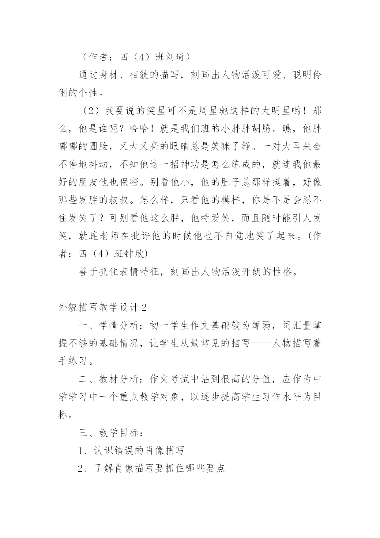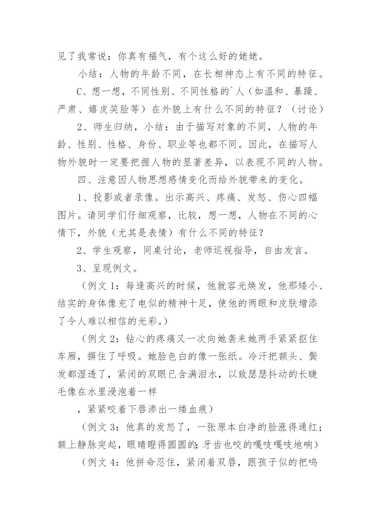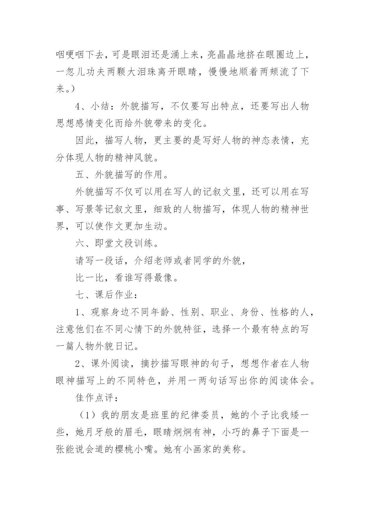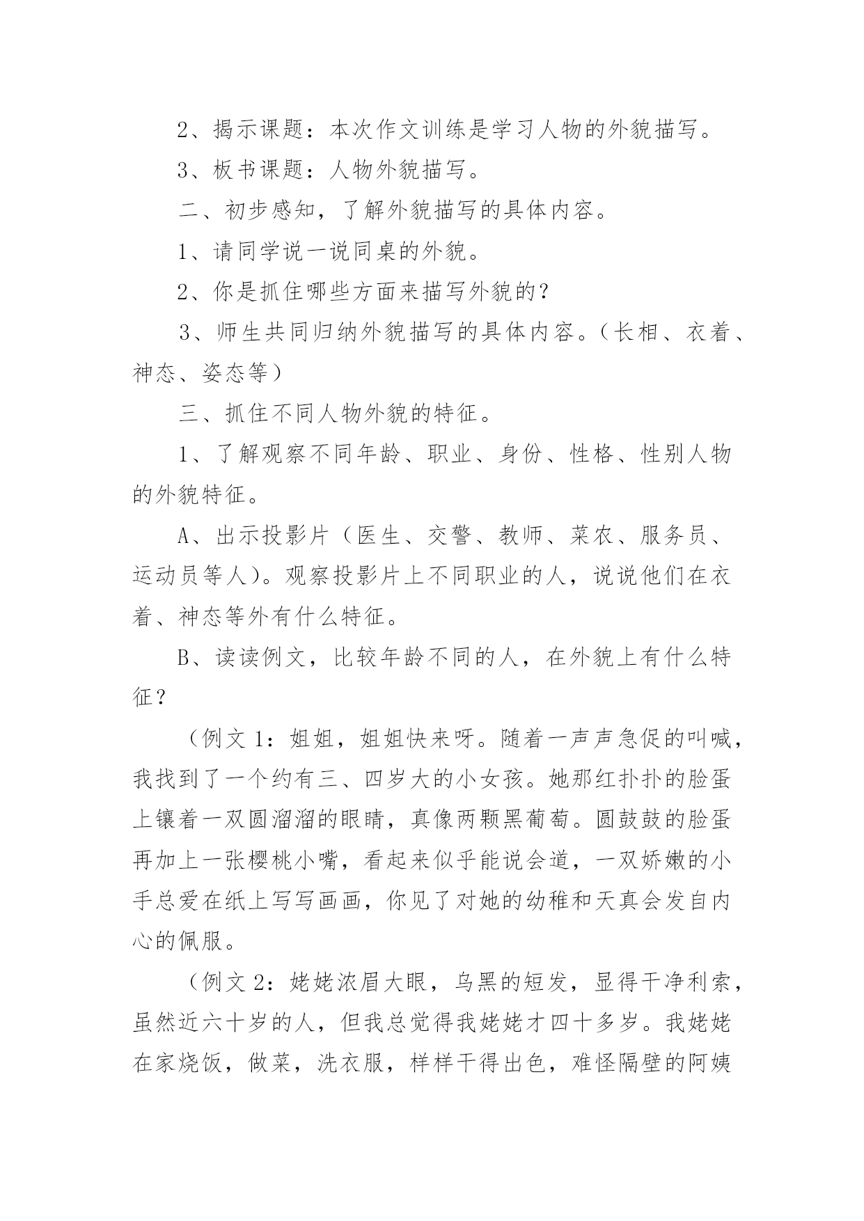 外貌描写教学设计作为一位优秀的人民教师,很有必要精心设计一份教学设计,借助教学设计可以促进我们快速成长,使教学工作更加科学化。写教学设计需要注意哪些格式呢?以下是小编收集整理的外貌描写教学设计,欢迎阅读,希望大家能够喜欢。外貌描写教学设计1设计理念:以学生为主体,以自主创新学习为目标,多角度精选例文,培养学生的发散思维;用现代手段展示图片,引导学生留心观察生活,通过比较区分人物的特征;以民主的教学方式,营造轻松和谐的课堂气氛,让学生自主学习,并进行多角度的训练,以拓宽写作思路。教学进程:一、揭题导入:1、简略介绍:写人的记叙文就是以人为写作对象,以表现人物的品质特点为目的的记叙文。要点:(1)写人的记叙文,是记叙文的一种重要类型。(2)写人要选择熟悉或仔细观察过的人,必须抓住人物的特点。(3)写人的方法:外貌描写、动作描写、语言描写、心理描写等。2、揭示课题:本次作文训练是学习人物的外貌描写。3、板书课题:人物外貌描写。二、初步感知,了解外貌描写的具体内容。1、请同学说一说同桌的外貌。2、你是抓住哪些方面来描写外貌的?3、师生共同归纳外貌描写的具体内容。(长相、衣着、神态、姿态等)三、抓住不同人物外貌的特征。1、了解观察不同年龄、职业、身份、性格、性别人物的外貌特征。A、出示投影片(医生、交警、教师、菜农、服务员、运动员等人)。观察投影片上不同职业的人,说说他们在衣着、神态等外有什么特征。B、读读例文,比较年龄不同的人,在外貌上有什么特征?(例文1:姐姐,姐姐快来呀。随着一声声急促的叫喊,我找到了一个约有三、四岁大的小女孩。她那红扑扑的脸蛋上镶着一双圆溜溜的眼睛,真像两颗黑葡萄。圆鼓鼓的脸蛋再加上一张樱桃小嘴,看起来似乎能说会道,一双娇嫩的小手总爱在纸上写写画画,你见了对她的幼稚和天真会发自内心的佩服。(例文2:姥姥浓眉大眼,乌黑的短发,显得干净利索,虽然近六十岁的人,但我总觉得我姥姥才四十多岁。我姥姥在家烧饭,做菜,洗衣服,样样干得出色,难怪隔壁的阿姨见了我常说:你真有福气,有个这么好的姥姥。小结:人物的年龄不同,在长相神态上有不同的特征。C、想一想,不同性别、不同性格的`人(如温和、暴躁、严肃、嬉皮笑脸等)在外貌上有什么不同的特征?(讨论)2、师生归纳,小结:由于描写对象的不同,人物的年龄、性别、性格、身份、职业等也都不同。因此,在描写人物外貌时一定要把握人物的显著差异,以表现不同的人物。四、注意因人物思想感情变化而给外貌带来的变化。1、投影或者录像。出示高兴、疼痛、发怒、伤心四幅图片。请同学们仔细观察,比较,想一想,人物在不同的心情下,外貌(尤其是表情)有什么不同的特征?2、学生观察,同桌讨论,老师巡视指导,自由发言。3、呈现例文。(例文1:每逢高兴的时候,他就容光焕发,他那矮小、结实的身体像充了电似的精神十足,使他的两眼和皮肤增添了令人难以相信的光彩。)(例文2:钻心的疼痛又一次向她袭来她两手紧紧抠住车厢,摒住了呼吸。她脸色白的像一张纸。冷汗把额头、鬓发都湿透了,紧闭的双眼已含满泪水,以致瑟瑟抖动的长睫毛像在水里浸泡着一样,紧紧咬着下唇渗出一缕血痕)(例文3:他真的发怒了,一张原本白净的脸涨得通红;额上静脉突起,眼睛瞪得圆圆的;牙齿也咬的嘎吱嘎吱地响)(例文4:他拼命忍住,紧闭着双唇,跟孩子似的把呜咽哽咽下去,可是眼泪还是涌上来,亮晶晶地挤在眼圈边上,一忽儿功夫两颗大泪珠离开眼睛,慢慢地顺着两颊流了下来。)4、小结:外貌描写,不仅要写出特点,还要写出人物思想感情变化而给外貌带来的变化。因此,描写人物,更主要的是写好人物的神态表情,充分体现人物的精神风貌。五、外貌描写的作用。外貌描写不仅可以用在写人的记叙文里,还可以用在写事、写景等记叙文里,细致的人物描写,体现人物的精神世界,可以使作文更加生动。六、即堂文段训练。请写一段话,介绍老师或者同学的外貌,比一比,看谁写得最像。七、课后作业:1、观察身边不同年龄、性别、职业、身份、性格的人,注意他们在不同心情下的外貌特征,选择一个最有特点的写一篇人物外貌日记。2、课外阅读,摘抄描写眼神的句子,想想作者在人物眼神描写上的不同特色,并用一两句话写出你的阅读体会。佳作点评:(1)我的朋友是班里的纪律委员,她的个子比我矮一些,她月牙般的眉毛,眼睛炯炯有神,小巧的鼻子下面是一张能说会道的樱桃小嘴。她有小画家的美称。(作者:四(4)班刘琦)通过身材、相貌的描写,刻画出人物活泼可爱、聪明伶俐的个性。(2)我要说的笑星可不是周星驰这样的大明星哟!那么,他是谁呢?哈哈!就是我们班的小胖胖胡腾。瞧,他胖嘟嘟的圆脸,又大又亮的眼睛总是笑眯了缝。一对大耳朵会不停地抖动,不知他这一招神功是怎么练成的,就连我他最好的朋友他也保密。别看他小,他的肚子总那样挺着,好像那些发胖的叔叔。怎么样,只看他的模样,