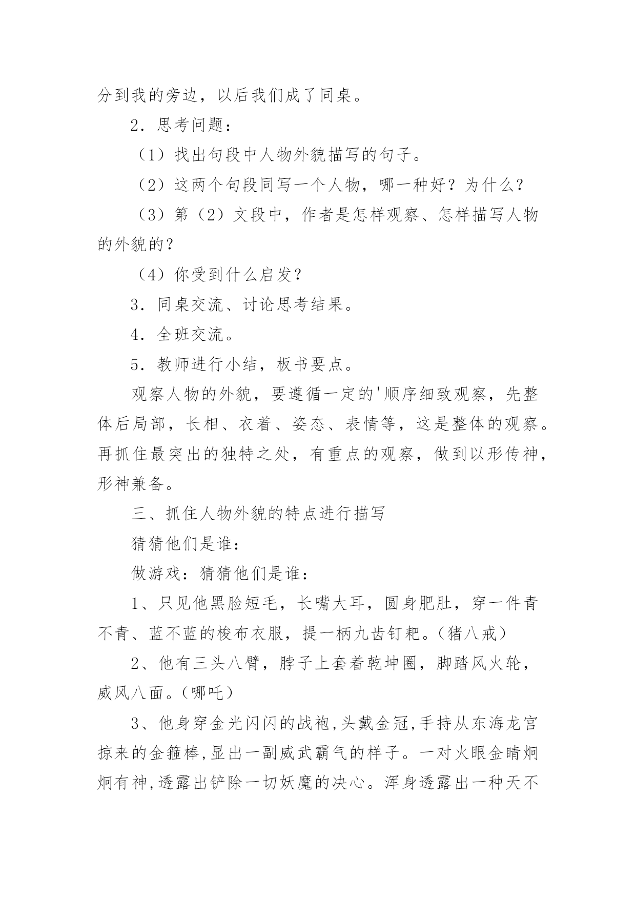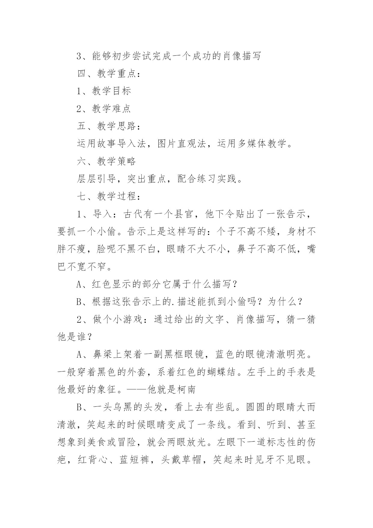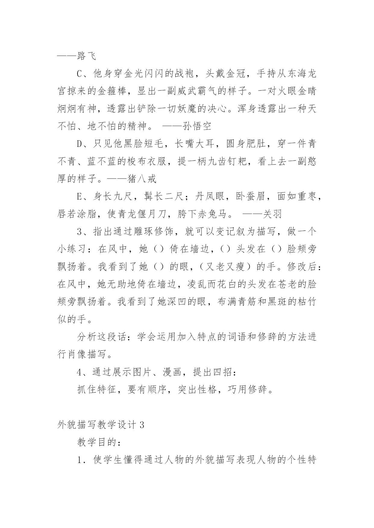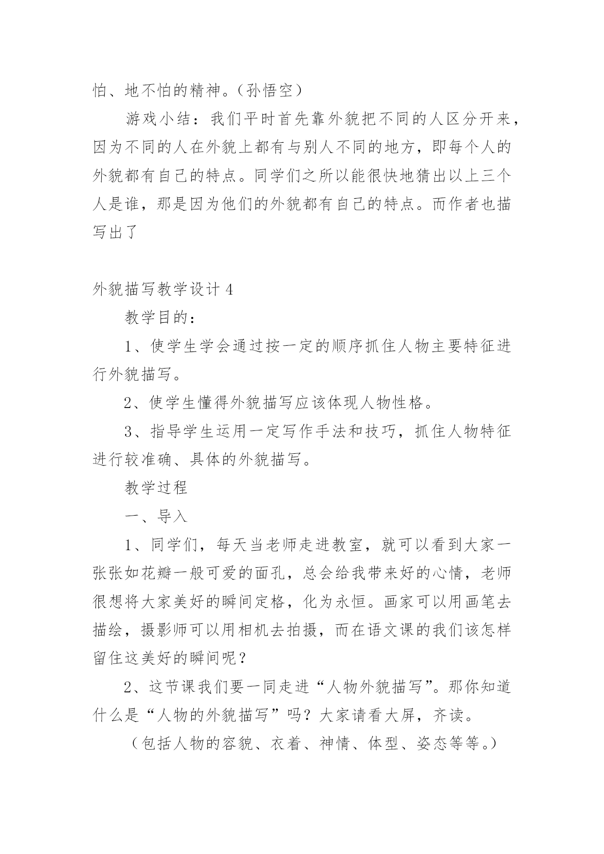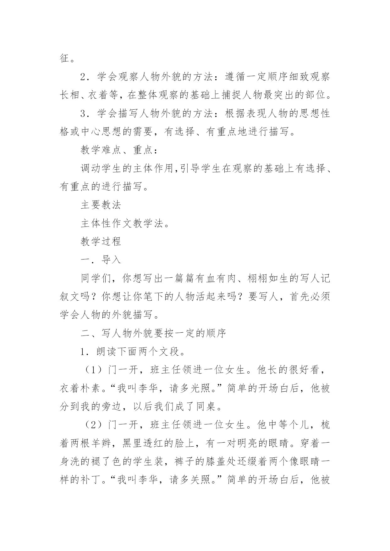 外貌描写教学设计作为一位优秀的人民教师,很有必要精心设计一份教学设计,借助教学设计可以促进我们快速成长,使教学工作更加科学化。写教学设计需要注意哪些格式呢?以下是小编收集整理的外貌描写教学设计,欢迎阅读,希望大家能够喜欢。外貌描写教学设计1设计理念:以学生为主体,以自主创新学习为目标,多角度精选例文,培养学生的发散思维;用现代手段展示图片,引导学生留心观察生活,通过比较区分人物的特征;以民主的教学方式,营造轻松和谐的课堂气氛,让学生自主学习,并进行多角度的训练,以拓宽写作思路。教学进程:一、揭题导入:1、简略介绍:写人的记叙文就是以人为写作对象,以表现人物的品质特点为目的的记叙文。要点:(1)写人的记叙文,是记叙文的一种重要类型。(2)写人要选择熟悉或仔细观察过的人,必须抓住人物的特点。(3)写人的方法:外貌描写、动作描写、语言描写、心理描写等。2、揭示课题:本次作文训练是学习人物的外貌描写。3、板书课题:人物外貌描写。二、初步感知,了解外貌描写的具体内容。1、请同学说一说同桌的外貌。2、你是抓住哪些方面来描写外貌的?3、师生共同归纳外貌描写的具体内容。(长相、衣着、神态、姿态等)三、抓住不同人物外貌的特征。1、了解观察不同年龄、职业、身份、性格、性别人物的外貌特征。A、出示投影片(医生、交警、教师、菜农、服务员、运动员等人)。观察投影片上不同职业的人,说说他们在衣着、神态等外有什么特征。B、读读例文,比较年龄不同的人,在外貌上有什么特征?(例文1:姐姐,姐姐快来呀。随着一声声急促的叫喊,我找到了一个约有三、四岁大的小女孩。她那红扑扑的脸蛋上镶着一双圆溜溜的眼睛,真像两颗黑葡萄。圆鼓鼓的脸蛋再加上一张樱桃小嘴,看起来似乎能说会道,一双娇嫩的小手总爱在纸上写写画画,你见了对她的幼稚和天真会发自内心的佩服。(例文2:姥姥浓眉大眼,乌黑的短发,显得干净利索,虽然近六十岁的人,但我总觉得我姥姥才四十多岁。我姥姥在家烧饭,做菜,洗衣服,样样干得出色,难怪隔壁的阿姨见了我常说:你真有福气,有个这么好的姥姥。小结:人物的年龄不同,在长相神态上有不同的特征。C、想一想,不同性别、不同性格的`人(如温和、暴躁、严肃、嬉皮笑脸等)在外貌上有什么不同的特征?(讨论)2、师生归纳,小结:由于描写对象的不同,人物的年龄、性别、性格、身份、职业等也都不同。因此,在描写人物外貌时一定要把握人物的显著差异,以表现不同的人物。四、注意因人物思想感情变化而给外貌带来的变化。1、投影或者录像。出示高兴、疼痛、发怒、伤心四幅图片。请同学们仔细观察,比较,想一想,人物在不同的心情下,外貌(尤其是表情)有什么不同的特征?2、学生观察,同桌讨论,老师巡视指导,自由发言。3、呈现例文。(例文1:每逢高兴的时候,他就容光焕发,他那矮小、结实的身体像充了电似的精神十足,使他的两眼和皮肤增添了令人难以相信的光彩。)(例文2:钻心的疼痛又一次向她袭来她两手紧紧抠住车厢,摒住了呼吸。她脸色白的像一张纸。冷汗把额头、鬓发都湿透了,紧闭的双眼已含满泪水,以致瑟瑟抖动的长睫毛像在水里浸泡着一样,紧紧咬着下唇渗出一缕血痕)(例文3:他真的发怒了,一张原本白净的脸涨得通红;额上静脉突起,眼睛瞪得圆圆的;牙齿也咬的嘎吱嘎吱地响)(例文4:他拼命忍住,紧闭着双唇,跟孩子似的把呜咽哽咽下去,可是眼泪还是涌上来,亮晶晶地挤在眼圈边上,一忽儿功夫两颗大泪珠离开眼睛,慢慢地顺着两颊流了下来。)4、小结:外貌描写,不仅要写出特点,还要写出人物思想感情变化而给外貌带来的变化。因此,描写人物,更主要的是写好人物的神态表情,充分体现人物的精神风貌。五、外貌描写的作用。外貌描写不仅可以用在写人的记叙文里,还可以用在写事、写景等记叙文里,细致的人物描写,体现人物的精神世界,可以使作文更加生动。六、即堂文段训练。请写一段话,介绍老师或者同学的外貌,比一比,看谁写得最像。七、课后作业:1、观察身边不同年龄、性别、职业、身份、性格的人,注意他们在不同心情下的外貌特征,选择一个最有特点的写一篇人物外貌日记。2、课外阅读,摘抄描写眼神的句子,想想作者在人物眼神描写上的不同特色,并用一两句话写出你的阅读体会。佳作点评:(1)我的朋友是班里的纪律委员,她的个子比我矮一些,她月牙般的眉毛,眼睛炯炯有神,小巧的鼻子下面是一张能说会道的樱桃小嘴。她有小画家的美称。(作者:四(4)班刘琦)通过身材、相貌的描写,刻画出人物活泼可爱、聪明伶俐的个性。(2)我要说的笑星可不是周星驰这样的大明星哟!那么,他是谁呢?哈哈!就是我们班的小胖胖胡腾。瞧,他胖嘟嘟的圆脸,又大又亮的眼睛总是笑眯了缝。一对大耳朵会不停地抖动,不知他这一招神功是怎么练成的,就连我他最好的朋友他也保密。别看他小,他的肚子总那样挺着,好像那些发胖的叔叔。怎么样,只看他的模样,