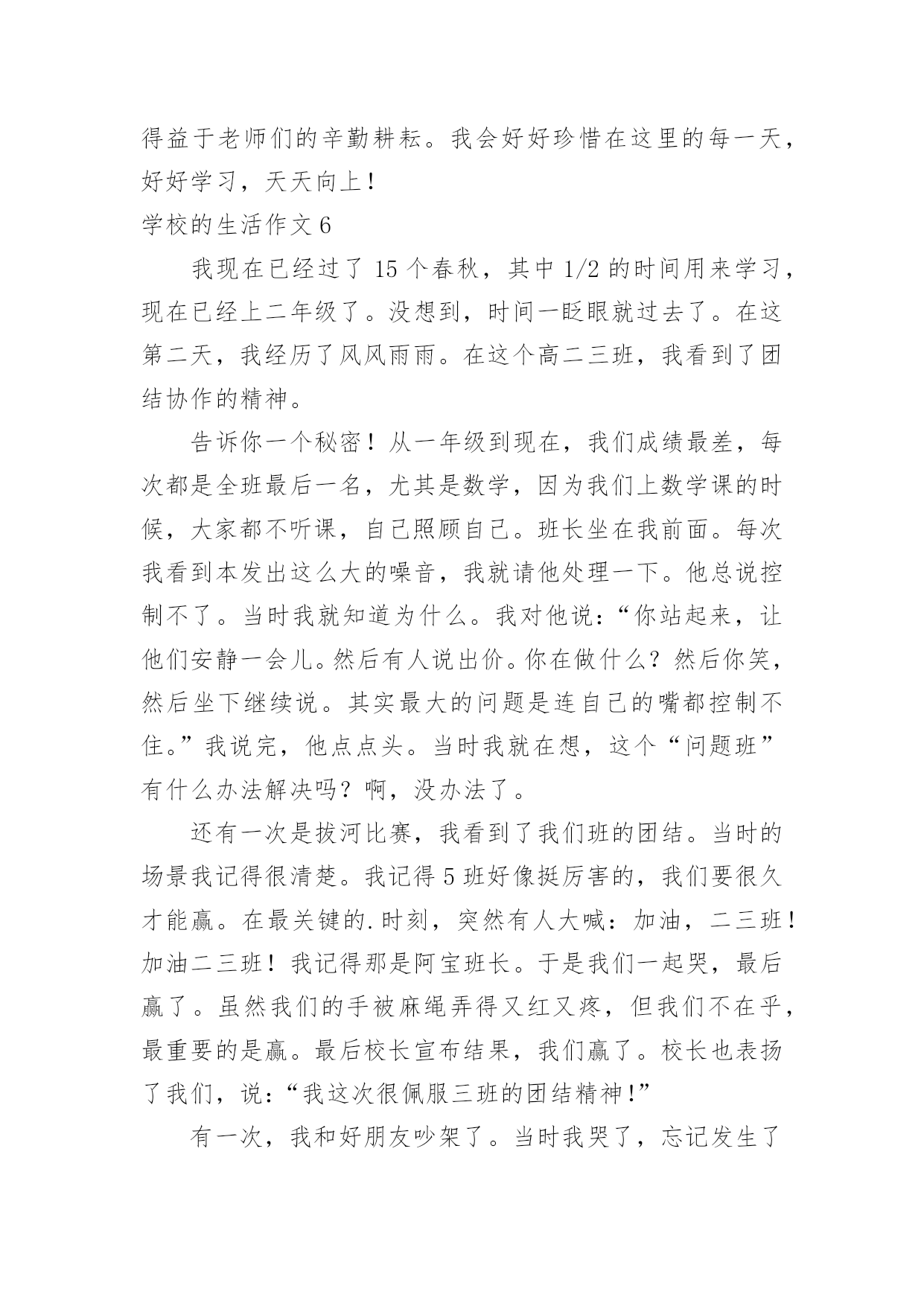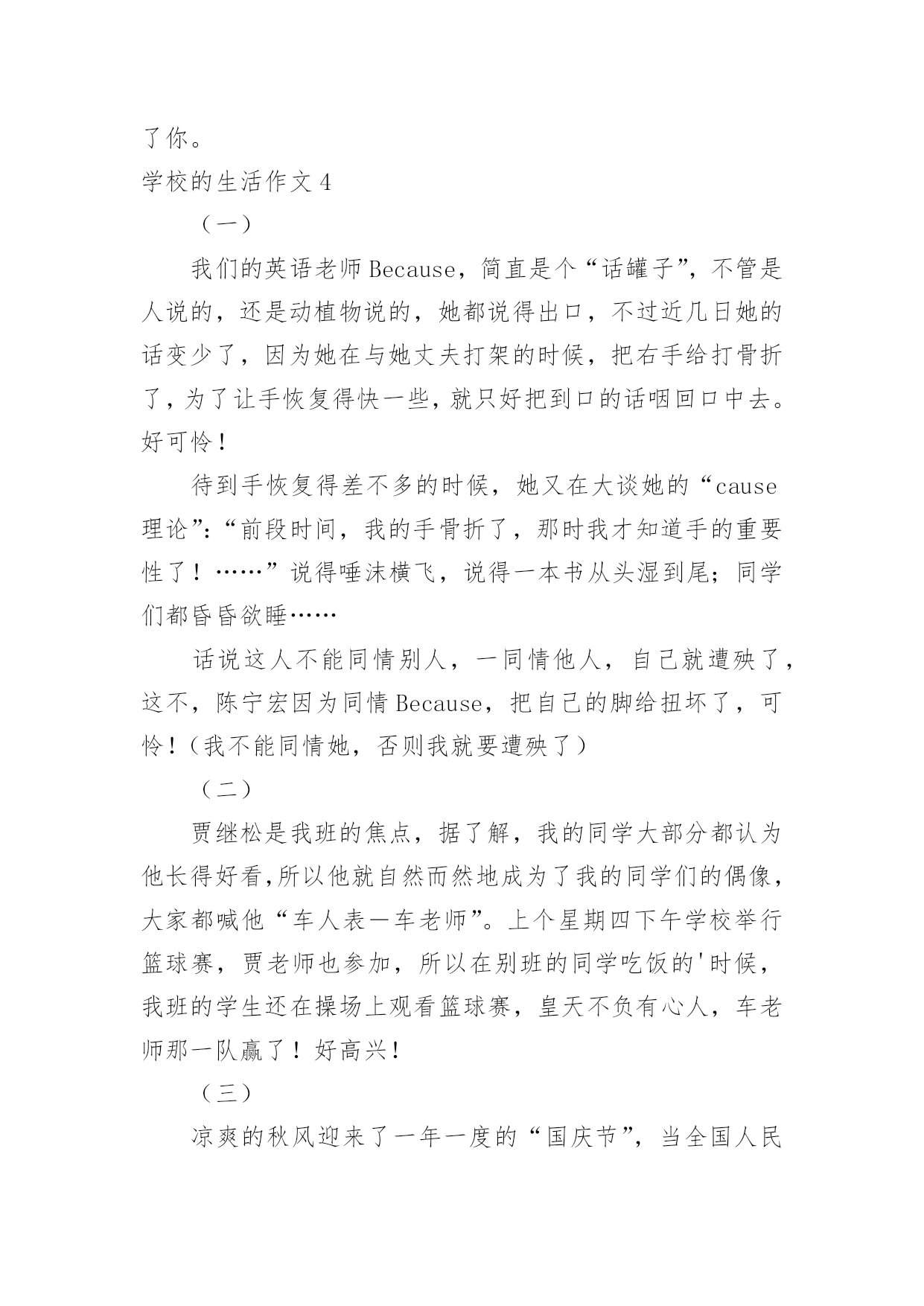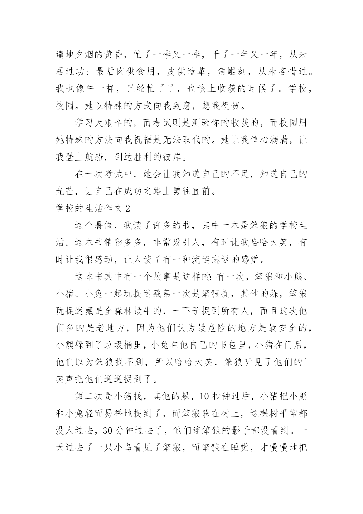 学校的生活作文学校的生活作文在平凡的学习、工作、生活中,大家最不陌生的就是作文了吧,作文根据写作时限的不同可以分为限时作文和非限时作文。为了让您在写作文时更加简单方便,下面是小编为大家收集的学校的生活作文,供大家参考借鉴,希望可以帮助到有需要的朋友。学校的生活作文1盼望着,盼望着,东风来了,考试的脚步近了。完成了一学期的学习,不知校园给了我多少欢乐与微笑。风飘飘水荡荡,掸掸身上的素衣风尘,驾起一叶扁舟,映者朝霞,来到考试的战场。试前,在校园走走,好象那些隆冬盛开的花朵在向我欢笑。一阵花香飘来,我与她撞了个满怀,那响气真清爽,那香气扑鼻而来真清爽。古人云:“一叶落而知天下秋。”是的,或许你还沉醉在夏天的阳光里,或许你还不经意的,秋天已走进了你,你也走进了秋天。虽然现在是隆冬,但临考前的校园里的一草一木仿佛把我引进了秋那硕果累累的季节,仿佛预示着我的`考试成功。是的,牛,从春播到秋收,从夏种到冬荆,从未从未停歇过;背朝吃的烈日,头顶凛冽的寒风,从未退缩过;饮的河塘水,嚼的是草禾秸,从未计较过;从满天星斗的凌晨到遍地夕烟的黄昏,忙了一季又一季,干了一年又一年,从未居过功;最后肉供食用,皮供造革,角雕刻,从未吝惜过。我也像牛一样,已经忙了了,也该上收获的时候了。学校,校园。她以特殊的方式向我致意,想我祝贺。学习大艰辛的,而考试则是测验你的收获的,而校园用她特殊的方法向我祝福是无法取代的。她让我信心满满,让我登上航船,到达胜利的彼岸。在一次考试中,她会让我知道自己的不足,知道自己的光芒,让自己在成功之路上勇往直前。学校的生活作文2这个暑假,我读了许多的书,其中一本是笨狼的学校生活。这本书精彩多多,非常吸引人,有时让我哈哈大笑,有时让我很感动,让人读了有一种流连忘返的感觉。这本书其中有一个故事是这样的:有一次,笨狼和小熊、小猪、小兔一起玩捉迷藏第一次是笨狼捉,其他的躲,笨狼玩捉迷藏是全森林最牛的,一下子捉到所有人,而且这次他们多的是老地方,因为他们认为最危险的地方是最安全的,小熊躲到了垃圾桶里,小兔在他自己的书包里,小猪在门后,他们以为笨狼找不到,所以哈哈大笑,笨狼听见了他们的`笑声把他们通通捉到了。第二次是小猪找,其他的躲,10秒钟过后,小猪把小熊和小兔轻而易举地捉到了,而笨狼躲在树上,这棵树平常都没人过去,30分钟过去了,他们连笨狼的影子都没看到。一天过去了一只小鸟看见了笨狼,而笨狼在睡觉,才慢慢地把他送回了家。看了这个故事,我的感想是:笨狼名字上有个笨字,其实他不笨,“笨”只是他的外表,可他内心很聪明。学校的生活作文3五年前,我们还是一个不懂事的孩子,日月如梭,光阴似箭,转眼间,我们已经成了一名要毕业的小学生,但我还是有点眷恋着小学的生活。忘不了,学校每一位老师的面孔,老师您用汗水哺育了我们,让我们茁壮成长,老师您不仅教我们书本上的知识,还教会我们做人的道理,您用温柔语调,教会了我们所有知识点,让我们遨游在知识的.海洋。老师,您虽然不是歌唱家,但您的谆谆教诲,我们永远也忘不了。忘不了,亲爱的同学们,是你们伴随我成长,春天,在校园里我们朗朗读书声无人听不见,夏天,我们在花丛中观察叶子发育成长,看蝴蝶互相追逐嬉戏,尽管夏天那么热,我们在操场上还是玩的不亦乐乎。秋天,凉爽的季节,我们采集叶子,做叶贴画,冬天,我们堆雪人,打雪仗。忘不了,昨天我们还在间操里,耍太极扇,练踢足球,列队操。忘不了,我们在一起玩打联合,偷地雷,我们玩的是那么尽情,快乐。啊,学校忘不了我们每天生活的脚印,放学后,还有我们那活泼的声影。啊,学校我忘不了在你身边学习生活,学校我永远忘不了你。学校的生活作文4(一)我们的英语老师Because,简直是个“话罐子”,不管是人说的,还是动植物说的,她都说得出口,不过近几日她的话变少了,因为她在与她丈夫打架的时候,把右手给打骨折了,为了让手恢复得快一些,就只好把到口的话咽回口中去。好可怜!待到手恢复得差不多的时候,她又在大谈她的“cause理论”:“前段时间,我的手骨折了,那时我才知道手的重要性了!……”说得唾沫横飞,说得一本书从头湿到尾;同学们都昏昏欲睡……话说这人不能同情别人,一同情他人,自己就遭殃了,这不,陈宁宏因为同情Because,把自己的脚给扭坏了,可怜!(我不能同情她,否则我就要遭殃了)(二)贾继松是我班的焦点,据了解,我的同学大部分都认为他长得好看,所以他就自然而然地成为了我的同学们的偶像,大家都喊他“车人表―车老师”。上个星期四下午学校举行篮球赛,贾老师也参加,所以在别班的同学吃饭的'时候,我班的学生还在操场上观看篮球赛,皇天不负有心人,车老师那一队赢了!好高兴!(三)凉爽的秋风迎来了一年一度的“国庆节”,当全国人民沉浸在快乐中的时候,我们还在教室中孜孜不倦地学习,听着老师们唱的“国歌”,把精华的知识硬塞进