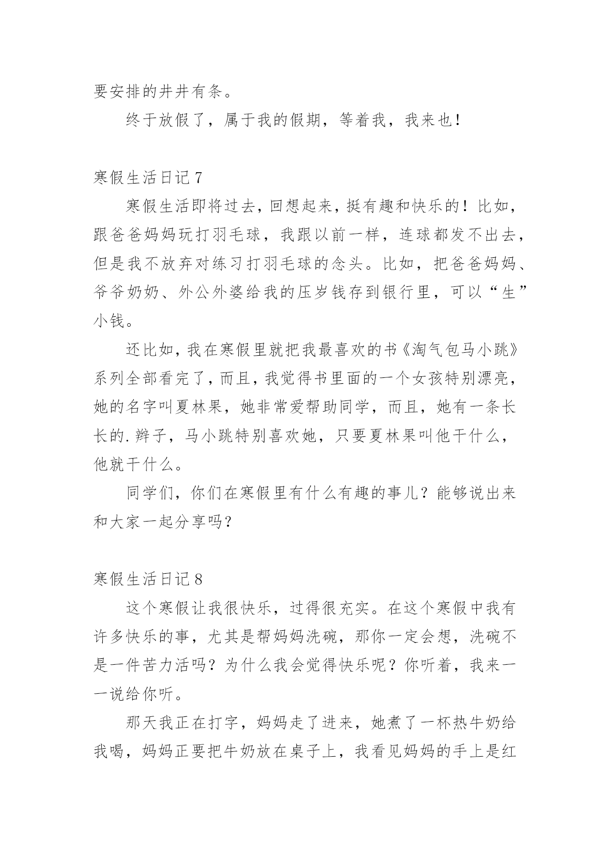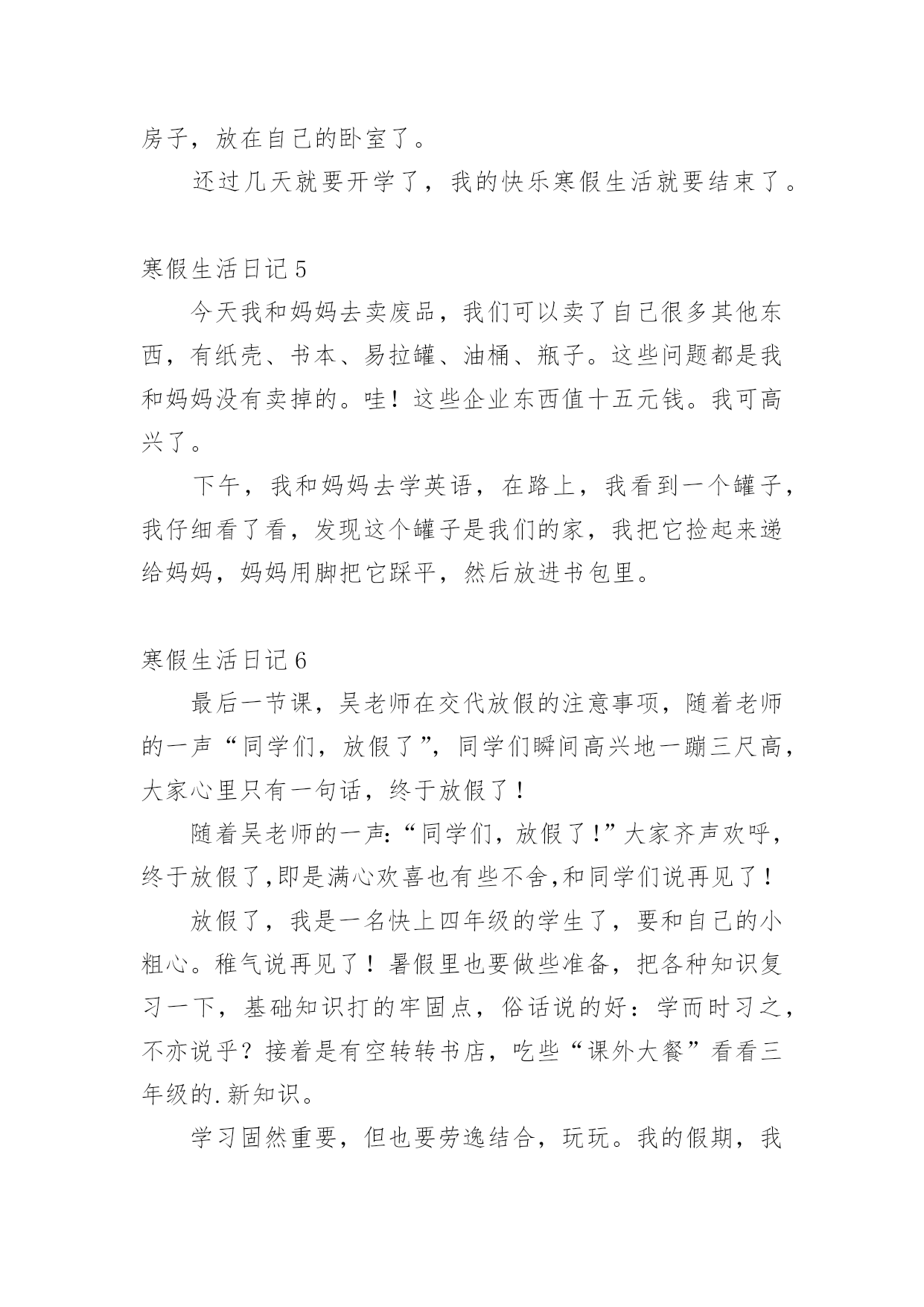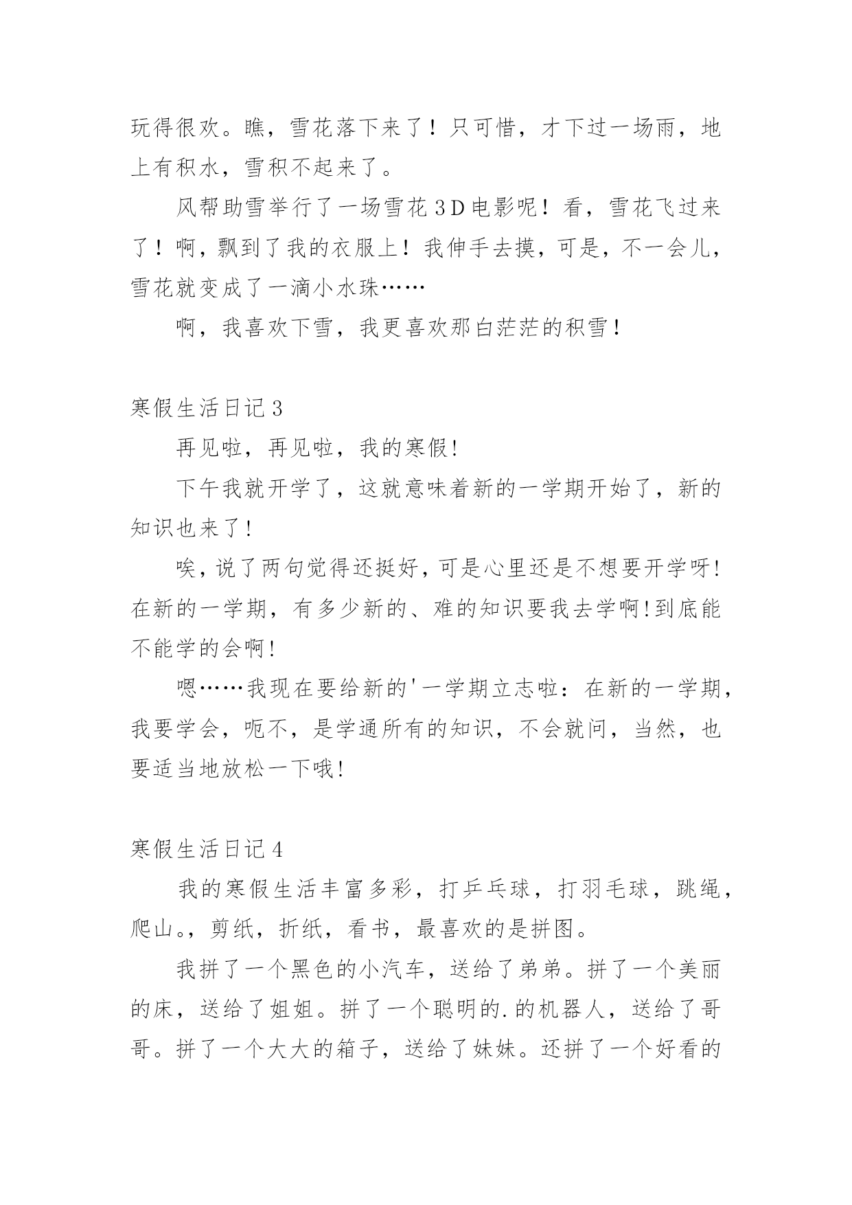 寒假生活日记寒假生活日记【热】一天终于结束了,这一天里,大家身边一定有一些有趣的见闻吧,让我们今天做个总结,写一篇日记吧。在写之前,要先考虑好内容和结构喔!以下是小编精心整理的寒假生活日记,希望对大家有所帮助。寒假生活日记1今天是放寒假的第二天,为了赶紧做好寒假作业,痛痛快快地玩,我一下子就把《寒假园地》做完了,我心中的`大石头也总算落了下来,终于可以轻松喽!我高兴地吁了一口气,去向爸爸妈妈“报喜”,本以为爸爸妈妈会替我高兴,可没料到爸爸却冷漠而严厉地说:“做这么快有什么用呢?老师布置的这些作业都是让你们一两天就完成的吗?那怎能好好地掌握暑假知识、好好复习上学期的知识呢?”我听后,觉得爸爸讲得很有道理。哎!要是早知如此,我就不会这样做了,但现在还有什么办法呢?总而言之,我以后再也不会像这次一样“犯傻”了!寒假生活日记2寒假里下了一场雪,可是雪花精灵们似乎还没玩够,这不,昨天它们又来玩了!我想:雪下得这么大,雪花们一定玩得很欢。瞧,雪花落下来了!只可惜,才下过一场雨,地上有积水,雪积不起来了。风帮助雪举行了一场雪花3D电影呢!看,雪花飞过来了!啊,飘到了我的衣服上!我伸手去摸,可是,不一会儿,雪花就变成了一滴小水珠……啊,我喜欢下雪,我更喜欢那白茫茫的积雪!寒假生活日记3再见啦,再见啦,我的寒假!下午我就开学了,这就意味着新的一学期开始了,新的知识也来了!唉,说了两句觉得还挺好,可是心里还是不想要开学呀!在新的一学期,有多少新的、难的知识要我去学啊!到底能不能学的会啊!嗯……我现在要给新的'一学期立志啦:在新的一学期,我要学会,呃不,是学通所有的知识,不会就问,当然,也要适当地放松一下哦!寒假生活日记4我的寒假生活丰富多彩,打乒乓球,打羽毛球,跳绳,爬山。,剪纸,折纸,看书,最喜欢的是拼图。我拼了一个黑色的小汽车,送给了弟弟。拼了一个美丽的床,送给了姐姐。拼了一个聪明的.的机器人,送给了哥哥。拼了一个大大的箱子,送给了妹妹。还拼了一个好看的房子,放在自己的卧室了。还过几天就要开学了,我的快乐寒假生活就要结束了。寒假生活日记5今天我和妈妈去卖废品,我们可以卖了自己很多其他东西,有纸壳、书本、易拉罐、油桶、瓶子。这些问题都是我和妈妈没有卖掉的。哇!这些企业东西值十五元钱。我可高兴了。下午,我和妈妈去学英语,在路上,我看到一个罐子,我仔细看了看,发现这个罐子是我们的家,我把它捡起来递给妈妈,妈妈用脚把它踩平,然后放进书包里。寒假生活日记6最后一节课,吴老师在交代放假的注意事项,随着老师的一声“同学们,放假了”,同学们瞬间高兴地一蹦三尺高,大家心里只有一句话,终于放假了!随着吴老师的一声:“同学们,放假了!”大家齐声欢呼,终于放假了,即是满心欢喜也有些不舍,和同学们说再见了!放假了,我是一名快上四年级的学生了,要和自己的小粗心。稚气说再见了!暑假里也要做些准备,把各种知识复习一下,基础知识打的牢固点,俗话说的好:学而时习之,不亦说乎?接着是有空转转书店,吃些“课外大餐”看看三年级的.新知识。学习固然重要,但也要劳逸结合,玩玩。我的假期,我要安排的井井有条。终于放假了,属于我的假期,等着我,我来也!寒假生活日记7寒假生活即将过去,回想起来,挺有趣和快乐的!比如,跟爸爸妈妈玩打羽毛球,我跟以前一样,连球都发不出去,但是我不放弃对练习打羽毛球的念头。比如,把爸爸妈妈、爷爷奶奶、外公外婆给我的压岁钱存到银行里,可以“生”小钱。还比如,我在寒假里就把我最喜欢的书《淘气包马小跳》系列全部看完了,而且,我觉得书里面的一个女孩特别漂亮,她的名字叫夏林果,她非常爱帮助同学,而且,她有一条长长的.辫子,马小跳特别喜欢她,只要夏林果叫他干什么,他就干什么。同学们,你们在寒假里有什么有趣的事儿?能够说出来和大家一起分享吗?寒假生活日记8这个寒假让我很快乐,过得很充实。在这个寒假中我有许多快乐的事,尤其是帮妈妈洗碗,那你一定会想,洗碗不是一件苦力活吗?为什么我会觉得快乐呢?你听着,我来一一说给你听。那天我正在打字,妈妈走了进来,她煮了一杯热牛奶给我喝,妈妈正要把牛奶放在桌子上,我看见妈妈的手上是红色的,一点点的冻疮,这让我心里一阵说不出的滋味我用自己的手去暖妈妈的手,好冷。我又看看厨房的.那些碗,对。一定是妈妈洗太多的碗,手才会这样的。于是我走到厨房拿起抹布擦起碗擦起来,这时侯我觉得好快乐,因为我可以帮妈妈做家务,这是我在寒假中最快乐的事。在这个寒假中,我知道了:不是只有笑才代表快乐,做自己喜欢的是也是一种快乐。寒假生活日记9今天上午我去姐姐家,和姐姐玩一会又学习一会,这样真好。下午我又去了爷爷奶奶家烧树枝,烤红薯。还喝了一瓶牛奶,牛奶的.一小半给可爱的小狗喝了,小狗把地上的牛奶添得干干净净。今天的日子过得好丰富啊!寒假生活日记10大家好,我叫吴奕歆。在寒假
