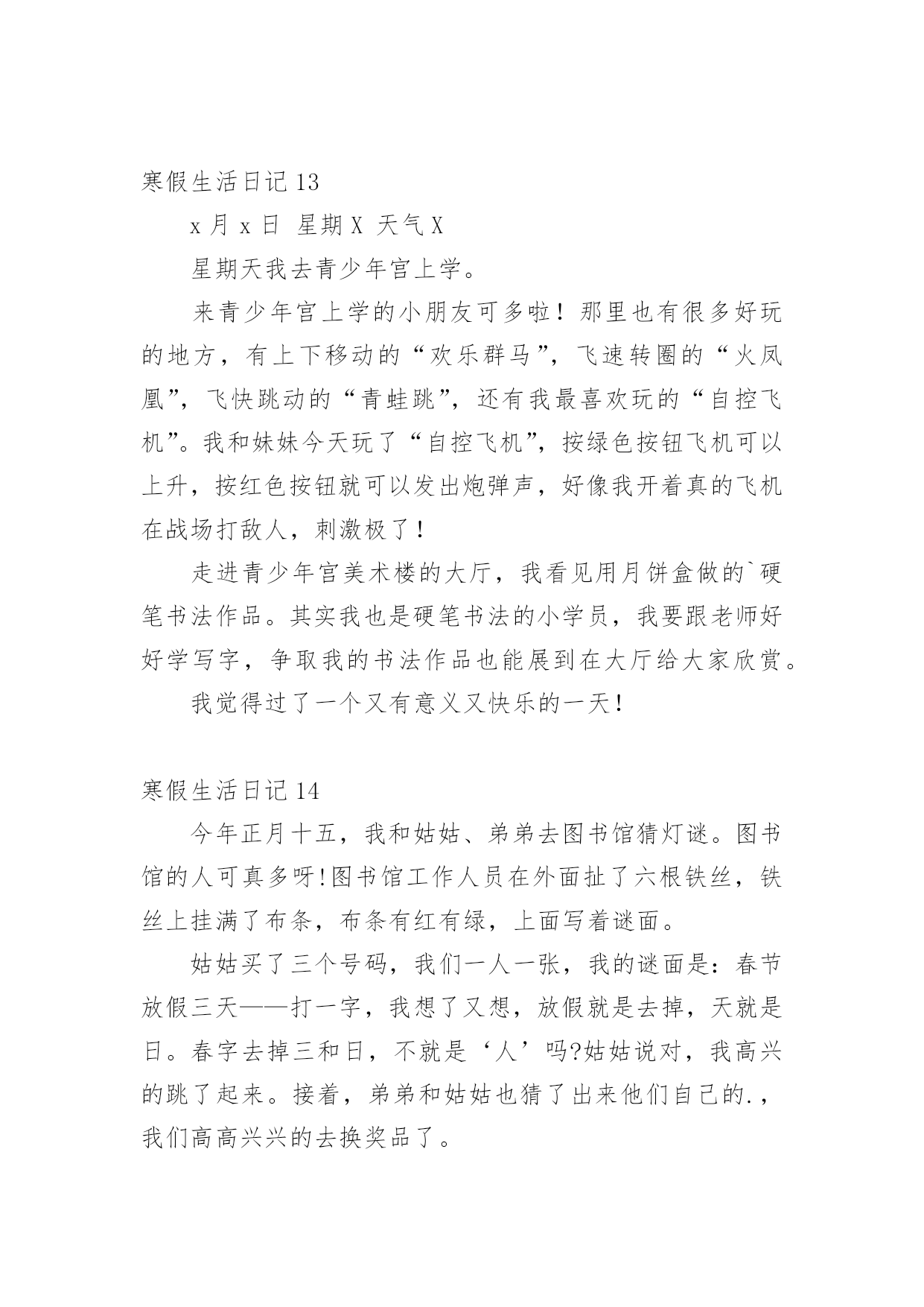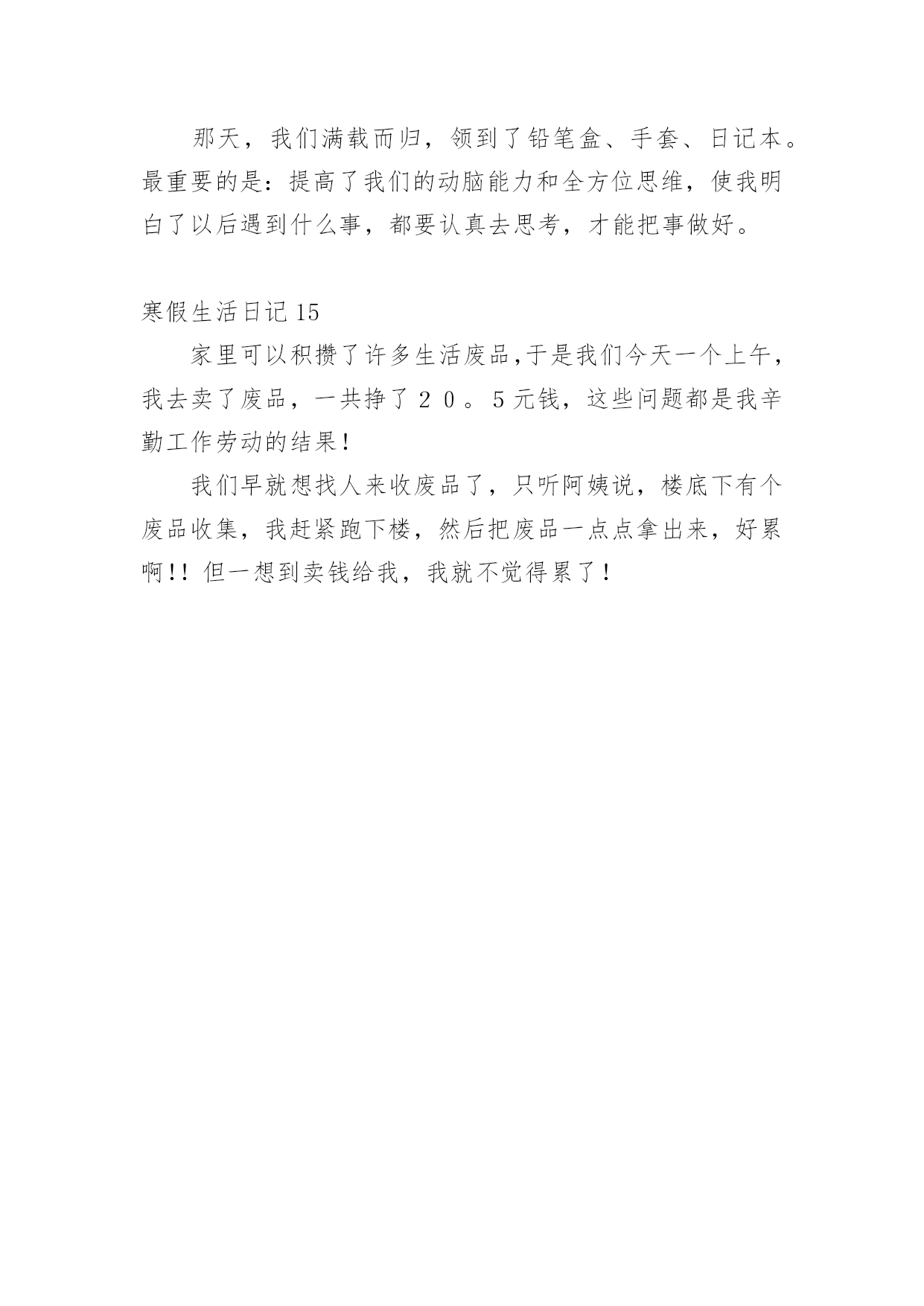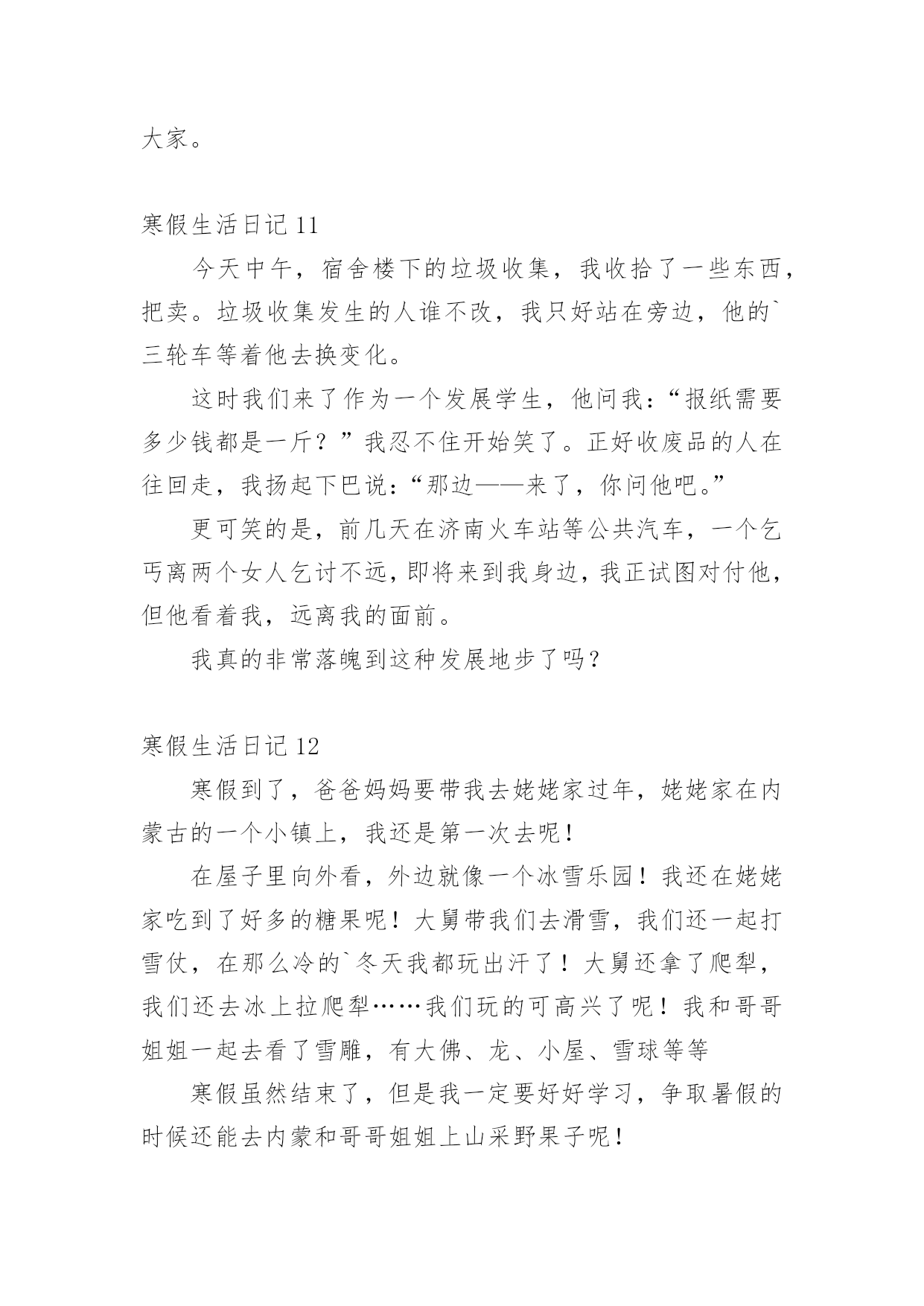 寒假生活日记寒假生活日记【热】一天终于结束了,这一天里,大家身边一定有一些有趣的见闻吧,让我们今天做个总结,写一篇日记吧。在写之前,要先考虑好内容和结构喔!以下是小编精心整理的寒假生活日记,希望对大家有所帮助。寒假生活日记1今天是放寒假的第二天,为了赶紧做好寒假作业,痛痛快快地玩,我一下子就把《寒假园地》做完了,我心中的`大石头也总算落了下来,终于可以轻松喽!我高兴地吁了一口气,去向爸爸妈妈“报喜”,本以为爸爸妈妈会替我高兴,可没料到爸爸却冷漠而严厉地说:“做这么快有什么用呢?老师布置的这些作业都是让你们一两天就完成的吗?那怎能好好地掌握暑假知识、好好复习上学期的知识呢?”我听后,觉得爸爸讲得很有道理。哎!要是早知如此,我就不会这样做了,但现在还有什么办法呢?总而言之,我以后再也不会像这次一样“犯傻”了!寒假生活日记2寒假里下了一场雪,可是雪花精灵们似乎还没玩够,这不,昨天它们又来玩了!我想:雪下得这么大,雪花们一定玩得很欢。瞧,雪花落下来了!只可惜,才下过一场雨,地上有积水,雪积不起来了。风帮助雪举行了一场雪花3D电影呢!看,雪花飞过来了!啊,飘到了我的衣服上!我伸手去摸,可是,不一会儿,雪花就变成了一滴小水珠……啊,我喜欢下雪,我更喜欢那白茫茫的积雪!寒假生活日记3再见啦,再见啦,我的寒假!下午我就开学了,这就意味着新的一学期开始了,新的知识也来了!唉,说了两句觉得还挺好,可是心里还是不想要开学呀!在新的一学期,有多少新的、难的知识要我去学啊!到底能不能学的会啊!嗯……我现在要给新的'一学期立志啦:在新的一学期,我要学会,呃不,是学通所有的知识,不会就问,当然,也要适当地放松一下哦!寒假生活日记4我的寒假生活丰富多彩,打乒乓球,打羽毛球,跳绳,爬山。,剪纸,折纸,看书,最喜欢的是拼图。我拼了一个黑色的小汽车,送给了弟弟。拼了一个美丽的床,送给了姐姐。拼了一个聪明的.的机器人,送给了哥哥。拼了一个大大的箱子,送给了妹妹。还拼了一个好看的房子,放在自己的卧室了。还过几天就要开学了,我的快乐寒假生活就要结束了。寒假生活日记5今天我和妈妈去卖废品,我们可以卖了自己很多其他东西,有纸壳、书本、易拉罐、油桶、瓶子。这些问题都是我和妈妈没有卖掉的。哇!这些企业东西值十五元钱。我可高兴了。下午,我和妈妈去学英语,在路上,我看到一个罐子,我仔细看了看,发现这个罐子是我们的家,我把它捡起来递给妈妈,妈妈用脚把它踩平,然后放进书包里。寒假生活日记6最后一节课,吴老师在交代放假的注意事项,随着老师的一声“同学们,放假了”,同学们瞬间高兴地一蹦三尺高,大家心里只有一句话,终于放假了!随着吴老师的一声:“同学们,放假了!”大家齐声欢呼,终于放假了,即是满心欢喜也有些不舍,和同学们说再见了!放假了,我是一名快上四年级的学生了,要和自己的小粗心。稚气说再见了!暑假里也要做些准备,把各种知识复习一下,基础知识打的牢固点,俗话说的好:学而时习之,不亦说乎?接着是有空转转书店,吃些“课外大餐”看看三年级的.新知识。学习固然重要,但也要劳逸结合,玩玩。我的假期,我要安排的井井有条。终于放假了,属于我的假期,等着我,我来也!寒假生活日记7寒假生活即将过去,回想起来,挺有趣和快乐的!比如,跟爸爸妈妈玩打羽毛球,我跟以前一样,连球都发不出去,但是我不放弃对练习打羽毛球的念头。比如,把爸爸妈妈、爷爷奶奶、外公外婆给我的压岁钱存到银行里,可以“生”小钱。还比如,我在寒假里就把我最喜欢的书《淘气包马小跳》系列全部看完了,而且,我觉得书里面的一个女孩特别漂亮,她的名字叫夏林果,她非常爱帮助同学,而且,她有一条长长的.辫子,马小跳特别喜欢她,只要夏林果叫他干什么,他就干什么。同学们,你们在寒假里有什么有趣的事儿?能够说出来和大家一起分享吗?寒假生活日记8这个寒假让我很快乐,过得很充实。在这个寒假中我有许多快乐的事,尤其是帮妈妈洗碗,那你一定会想,洗碗不是一件苦力活吗?为什么我会觉得快乐呢?你听着,我来一一说给你听。那天我正在打字,妈妈走了进来,她煮了一杯热牛奶给我喝,妈妈正要把牛奶放在桌子上,我看见妈妈的手上是红色的,一点点的冻疮,这让我心里一阵说不出的滋味我用自己的手去暖妈妈的手,好冷。我又看看厨房的.那些碗,对。一定是妈妈洗太多的碗,手才会这样的。于是我走到厨房拿起抹布擦起碗擦起来,这时侯我觉得好快乐,因为我可以帮妈妈做家务,这是我在寒假中最快乐的事。在这个寒假中,我知道了:不是只有笑才代表快乐,做自己喜欢的是也是一种快乐。寒假生活日记9今天上午我去姐姐家,和姐姐玩一会又学习一会,这样真好。下午我又去了爷爷奶奶家烧树枝,烤红薯。还喝了一瓶牛奶,牛奶的.一小半给可爱的小狗喝了,小狗把地上的牛奶添得干干净净。今天的日子过得好丰富啊!寒假生活日记10大家好,我叫吴奕歆。在寒假