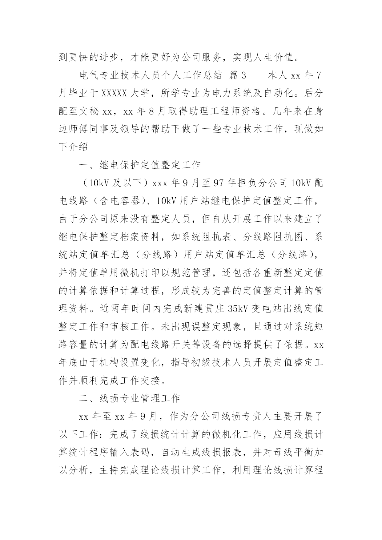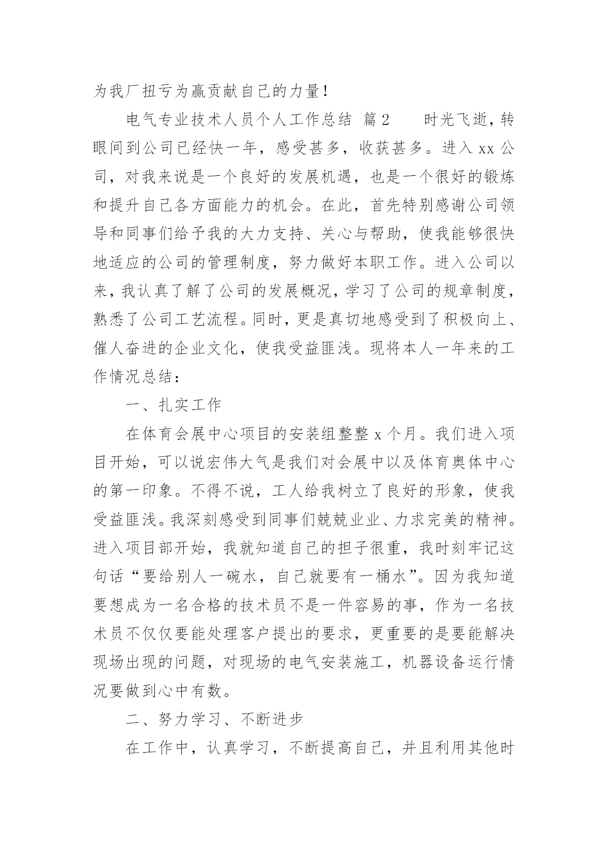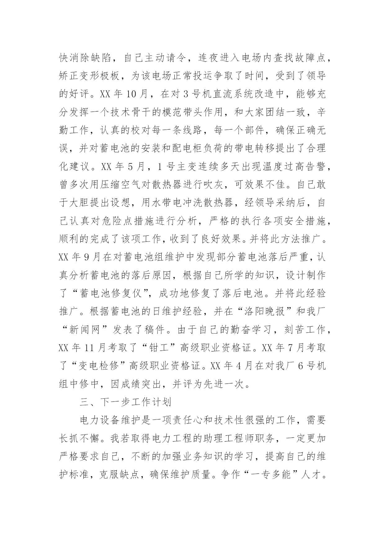 电气专业技术人员个人工作总结电气专业技术人员个人工作总结总结是对取得的成绩、存在的问题及得到的经验和教训等方面情况进行评价与描述的一种书面材料,它是增长才干的一种好办法,不如立即行动起来写一份总结吧。那么如何把总结写出新花样呢?以下是小编为大家整理的电气专业技术人员个人工作总结,供大家参考借鉴,希望可以帮助到有需要的朋友。电气专业技术人员个人工作总结篇119xx年到无线电技术学校学习家用电器维修。19xx年3月入伍,19xx年4月加入中国共产党。19xx年8月至19xx年8月考入指挥学院,学习通信载波专业。XX年8月至XX年12月,参加中央党校函授法律专业学习,获本科文凭。XX年4月,因服役期满退出现役,被洛阳移动通信代维公司聘用,任基站巡检工程师兼主任助理。XX年4月到大唐洛阳热电厂设备维修部高压配电班。一、政治思想我从19xx年参加工作以来,由于长期受部队环境的熏陶,能够坚持不断的学习邓小平理论,把马列主义,毛泽东思想作为自己的行动指南,用心去体会各项惠民政策的真正内涵,始终不移的坚持党的路线、方针、政策,同党中央保持高度一致。在大事大非面前能够保持头脑清醒,坚持党性原则。始终用一个党员的标准严格要求自己,立足本职,刻苦钻研业务技术,努力的干好本职工作。听从上级各种调遣,无论从事什么工作,都能始终如一,坚持不懈的干好本职工作。二、工作方面XX年4月,从部队转业以来,能够尽快的转变思想,努力的去适应各种工作。在移动通信公司任基站代维巡检工程师兼主任助理期间,能够严格的执行移动公司的各项维护制度,积极的配合业务部门开展好维护工作,严格的对部下进行人性化管理,从长远着手,抓好人员素质培养。带出来了一大批业务骨干,为搞好维护工作起到了重大的作用。再此期间还利用自己的专业知识,发明制作了bts监控数据上传测试仪。对开关电源进行二次下电(低电压保护功能)改造。对环境监控进行了功能开发,增加了红外线防盗功能,有效的避免了空调室外机被盗事件的'发生。受到移动公司领导的高度赞扬,多次被评为优秀员工。XX年4月到大唐洛阳热电厂高压配电班后,为使尽快适应本职工作,每天利用工作之余,找来一些电力书籍认真阅读,默画电力系统图,向老师傅请教,无论遇到什么难题总要搞个明明白白,否则寝食难安。由于自己的勤学苦练,大胆实践,不但很快胜任了本职工作,而且还成为了班里的技术骨干。无论什么工作都能冲锋在前,任劳任怨。XX年6月,6号炉电除尘一室二电场因内部短路,无法正常运行。为尽快消除缺陷,自己主动请令,连夜进入电场内查找故障点,矫正变形极板,为该电场正常投运争取了时间,受到了领导的好评。XX年10月,在对3号机直流系统改造中,能够充分发挥一个技术骨干的模范带头作用,和大家团结一致,辛勤工作,认真的校对每一条线路,每一个部件,确保正确无误,并对蓄电池的安装和配电柜负荷的带电转移提出了合理化建议。XX年5月,1号主变连续多天出现温度过高告警,曾多次用压缩空气对散热器进行吹灰,可效果不佳。自己敢于大胆提出设想,用水带电冲洗散热器,经领导采纳后,自己认真对危险点措施进行分析,严格的执行各项安全措施,顺利的完成了该项工作,收到了良好效果。并将此方法推广。XX年9月在对蓄电池组维护中发现部分蓄电池落后严重,认真分析蓄电池的落后原因,根据自己所学的知识,设计制作了“蓄电池修复仪”,成功地修复了落后电池。并将此经验推广。根据蓄电池的日维护经验,并在“洛阳晚报”和我厂“新闻网”发表了稿件。由于自己的勤奋学习,刻苦工作,XX年11月考取了“钳工”高级职业资格证。XX年7月考取了“变电检修”高级职业资格证。XX年4月在对我厂6号机组中修中,因成绩突出,并评为先进一次。三、下一步工作计划电力设备维护是一项责任心和技术性很强的工作,需要长抓不懈。我若取得电力工程的助理工程师职务,一定更加严格要求自己,不断的加强业务知识的学习,提高自己的维护标准,克服缺点,确保维护质量。争作“一专多能”人才。为我厂扭亏为赢贡献自己的力量!电气专业技术人员个人工作总结篇2时光飞逝,转眼间到公司已经快一年,感受甚多,收获甚多。进入xx公司,对我来说是一个良好的发展机遇,也是一个很好的锻炼和提升自己各方面能力的机会。在此,首先特别感谢公司领导和同事们给予我的大力支持、关心与帮助,使我能够很快地适应的公司的管理制度,努力做好本职工作。进入公司以来,我认真了解了公司的发展概况,学习了公司的规章制度,熟悉了公司工艺流程。同时,更是真切地感受到了积极向上、催人奋进的企业文化,使我受益匪浅。现将本人一年来的工作情况总结:一、扎实工作在体育会展中心项目的安装组整整x个月。我们进入项目开始,可以说宏伟大气是我们对会展中以及体育奥体中心的第一印象。不得不说,工人给我树立了良好的形象,使我受益匪浅。我深刻感受到同事们兢兢业