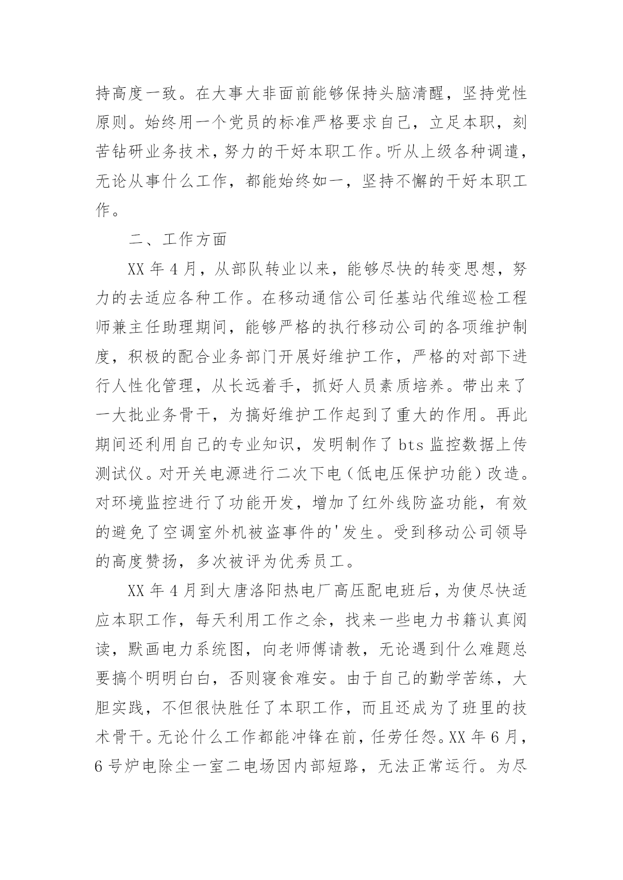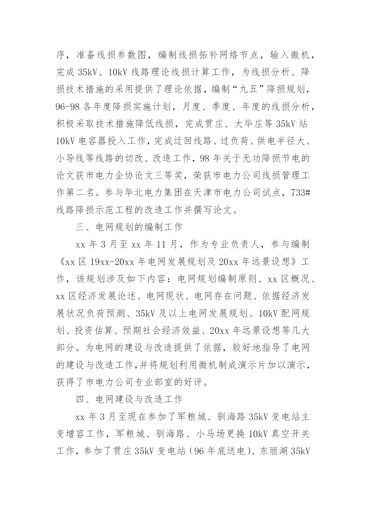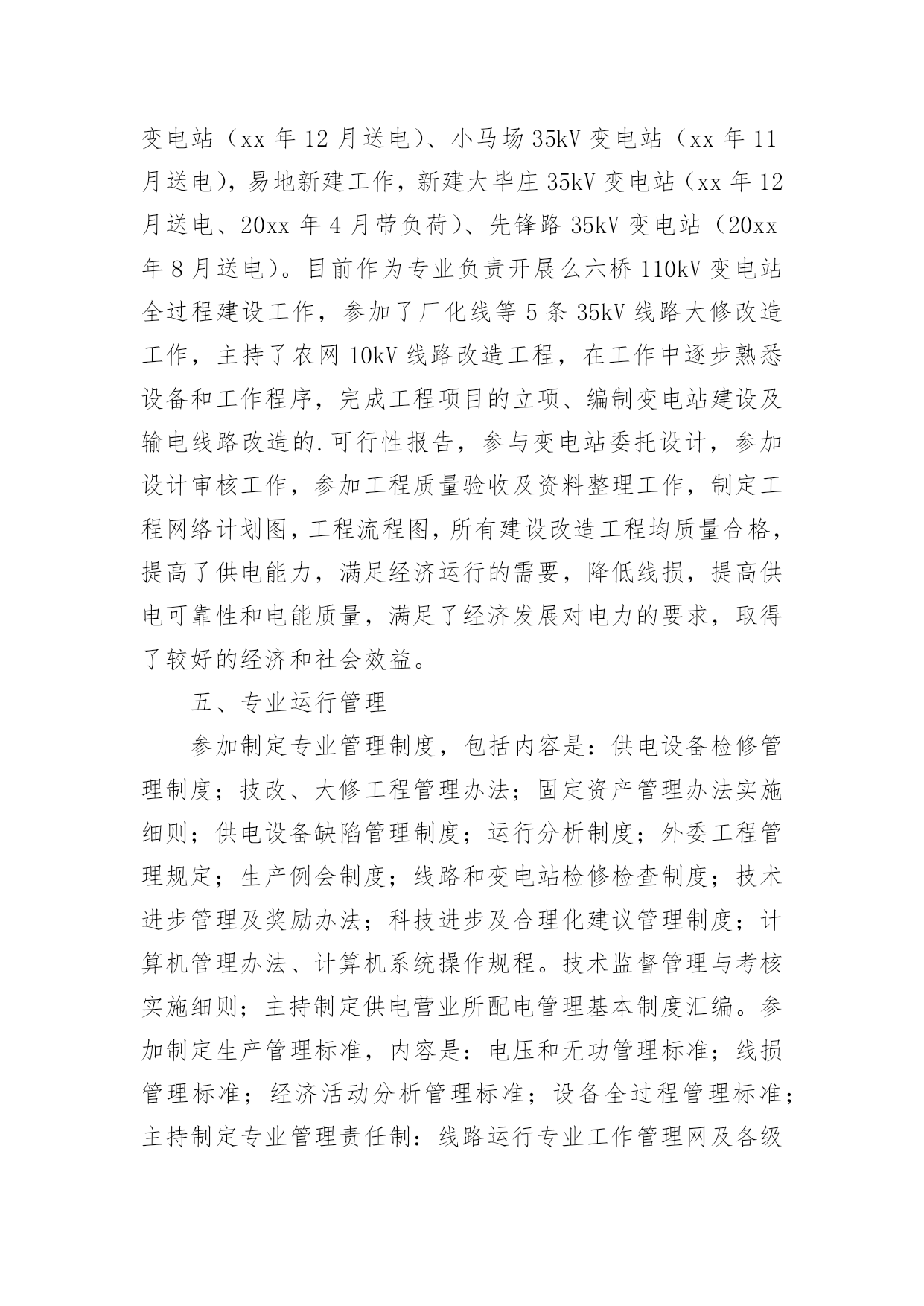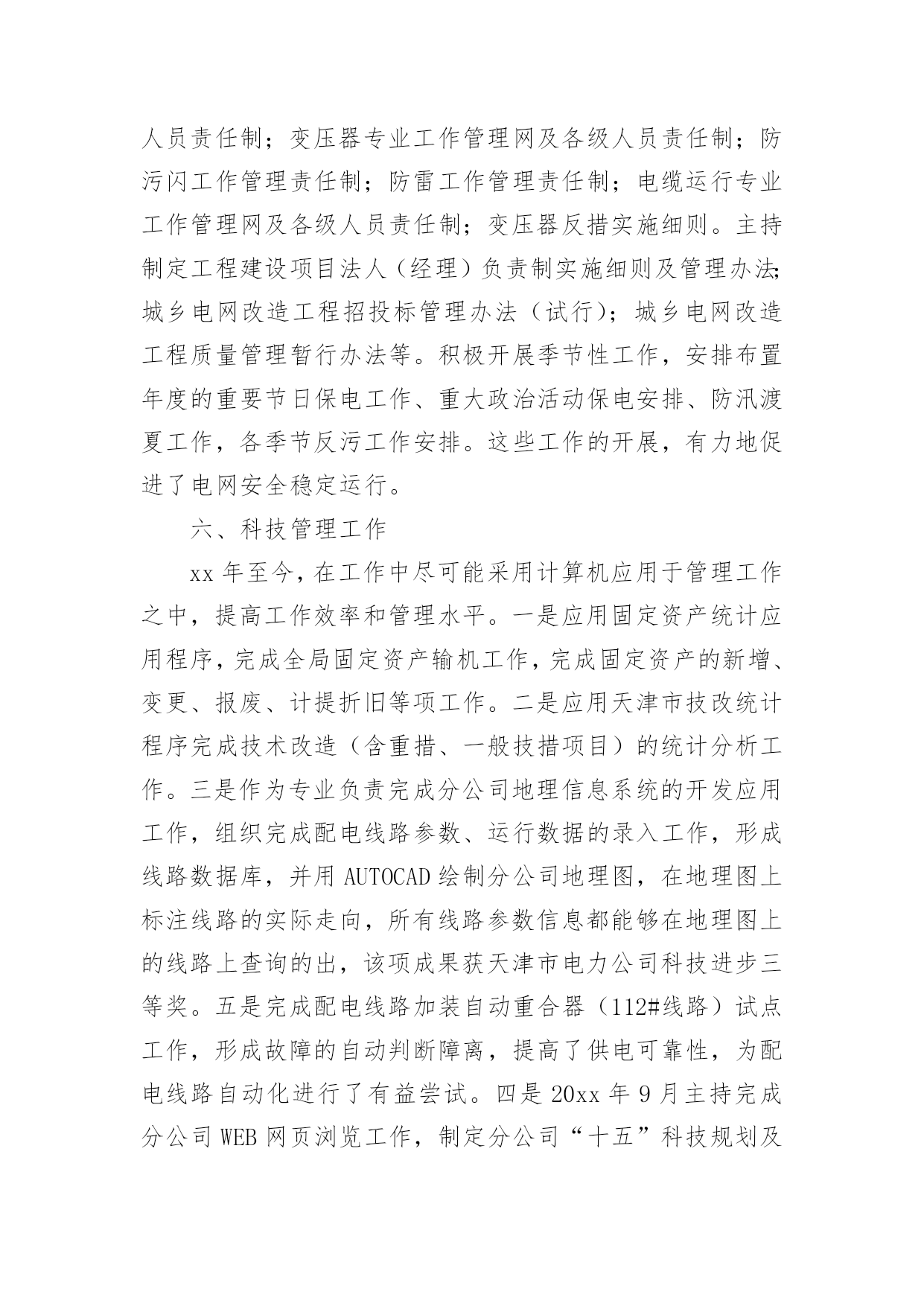 电气专业技术人员个人工作总结电气专业技术人员个人工作总结总结是对取得的成绩、存在的问题及得到的经验和教训等方面情况进行评价与描述的一种书面材料,它是增长才干的一种好办法,不如立即行动起来写一份总结吧。那么如何把总结写出新花样呢?以下是小编为大家整理的电气专业技术人员个人工作总结,供大家参考借鉴,希望可以帮助到有需要的朋友。电气专业技术人员个人工作总结篇119xx年到无线电技术学校学习家用电器维修。19xx年3月入伍,19xx年4月加入中国共产党。19xx年8月至19xx年8月考入指挥学院,学习通信载波专业。XX年8月至XX年12月,参加中央党校函授法律专业学习,获本科文凭。XX年4月,因服役期满退出现役,被洛阳移动通信代维公司聘用,任基站巡检工程师兼主任助理。XX年4月到大唐洛阳热电厂设备维修部高压配电班。一、政治思想我从19xx年参加工作以来,由于长期受部队环境的熏陶,能够坚持不断的学习邓小平理论,把马列主义,毛泽东思想作为自己的行动指南,用心去体会各项惠民政策的真正内涵,始终不移的坚持党的路线、方针、政策,同党中央保持高度一致。在大事大非面前能够保持头脑清醒,坚持党性原则。始终用一个党员的标准严格要求自己,立足本职,刻苦钻研业务技术,努力的干好本职工作。听从上级各种调遣,无论从事什么工作,都能始终如一,坚持不懈的干好本职工作。二、工作方面XX年4月,从部队转业以来,能够尽快的转变思想,努力的去适应各种工作。在移动通信公司任基站代维巡检工程师兼主任助理期间,能够严格的执行移动公司的各项维护制度,积极的配合业务部门开展好维护工作,严格的对部下进行人性化管理,从长远着手,抓好人员素质培养。带出来了一大批业务骨干,为搞好维护工作起到了重大的作用。再此期间还利用自己的专业知识,发明制作了bts监控数据上传测试仪。对开关电源进行二次下电(低电压保护功能)改造。对环境监控进行了功能开发,增加了红外线防盗功能,有效的避免了空调室外机被盗事件的'发生。受到移动公司领导的高度赞扬,多次被评为优秀员工。XX年4月到大唐洛阳热电厂高压配电班后,为使尽快适应本职工作,每天利用工作之余,找来一些电力书籍认真阅读,默画电力系统图,向老师傅请教,无论遇到什么难题总要搞个明明白白,否则寝食难安。由于自己的勤学苦练,大胆实践,不但很快胜任了本职工作,而且还成为了班里的技术骨干。无论什么工作都能冲锋在前,任劳任怨。XX年6月,6号炉电除尘一室二电场因内部短路,无法正常运行。为尽快消除缺陷,自己主动请令,连夜进入电场内查找故障点,矫正变形极板,为该电场正常投运争取了时间,受到了领导的好评。XX年10月,在对3号机直流系统改造中,能够充分发挥一个技术骨干的模范带头作用,和大家团结一致,辛勤工作,认真的校对每一条线路,每一个部件,确保正确无误,并对蓄电池的安装和配电柜负荷的带电转移提出了合理化建议。XX年5月,1号主变连续多天出现温度过高告警,曾多次用压缩空气对散热器进行吹灰,可效果不佳。自己敢于大胆提出设想,用水带电冲洗散热器,经领导采纳后,自己认真对危险点措施进行分析,严格的执行各项安全措施,顺利的完成了该项工作,收到了良好效果。并将此方法推广。XX年9月在对蓄电池组维护中发现部分蓄电池落后严重,认真分析蓄电池的落后原因,根据自己所学的知识,设计制作了“蓄电池修复仪”,成功地修复了落后电池。并将此经验推广。根据蓄电池的日维护经验,并在“洛阳晚报”和我厂“新闻网”发表了稿件。由于自己的勤奋学习,刻苦工作,XX年11月考取了“钳工”高级职业资格证。XX年7月考取了“变电检修”高级职业资格证。XX年4月在对我厂6号机组中修中,因成绩突出,并评为先进一次。三、下一步工作计划电力设备维护是一项责任心和技术性很强的工作,需要长抓不懈。我若取得电力工程的助理工程师职务,一定更加严格要求自己,不断的加强业务知识的学习,提高自己的维护标准,克服缺点,确保维护质量。争作“一专多能”人才。为我厂扭亏为赢贡献自己的力量!电气专业技术人员个人工作总结篇2时光飞逝,转眼间到公司已经快一年,感受甚多,收获甚多。进入xx公司,对我来说是一个良好的发展机遇,也是一个很好的锻炼和提升自己各方面能力的机会。在此,首先特别感谢公司领导和同事们给予我的大力支持、关心与帮助,使我能够很快地适应的公司的管理制度,努力做好本职工作。进入公司以来,我认真了解了公司的发展概况,学习了公司的规章制度,熟悉了公司工艺流程。同时,更是真切地感受到了积极向上、催人奋进的企业文化,使我受益匪浅。现将本人一年来的工作情况总结:一、扎实工作在体育会展中心项目的安装组整整x个月。我们进入项目开始,可以说宏伟大气是我们对会展中以及体育奥体中心的第一印象。不得不说,工人给我树立了良好的形象,使我受益匪浅。我深刻感受到同事们兢兢业