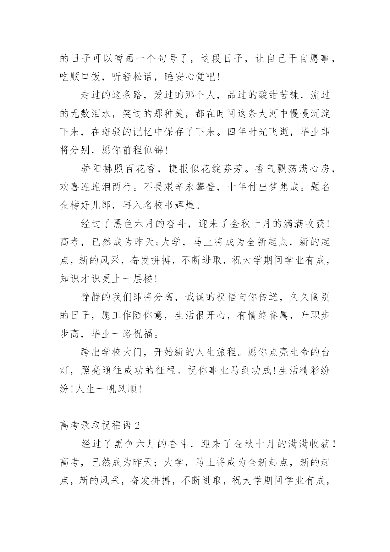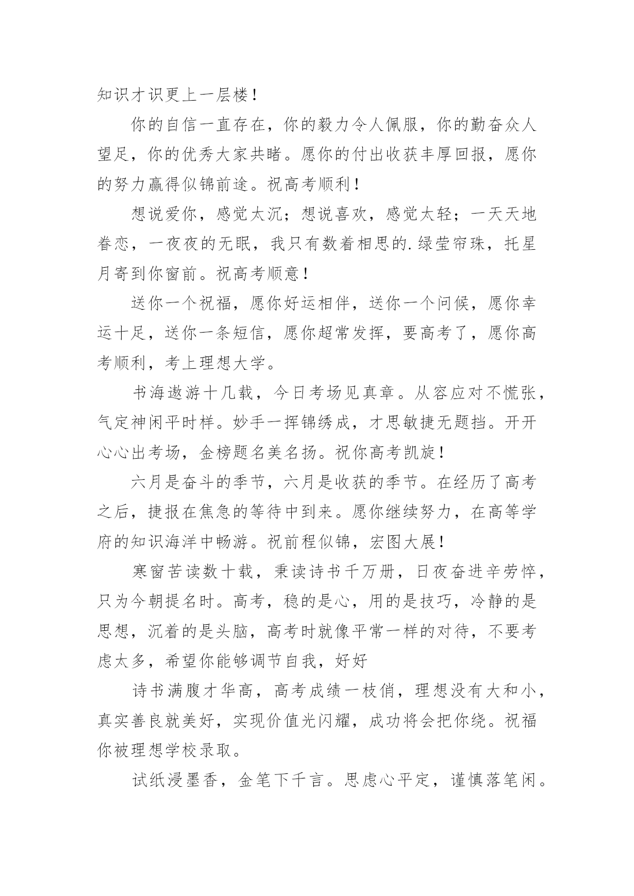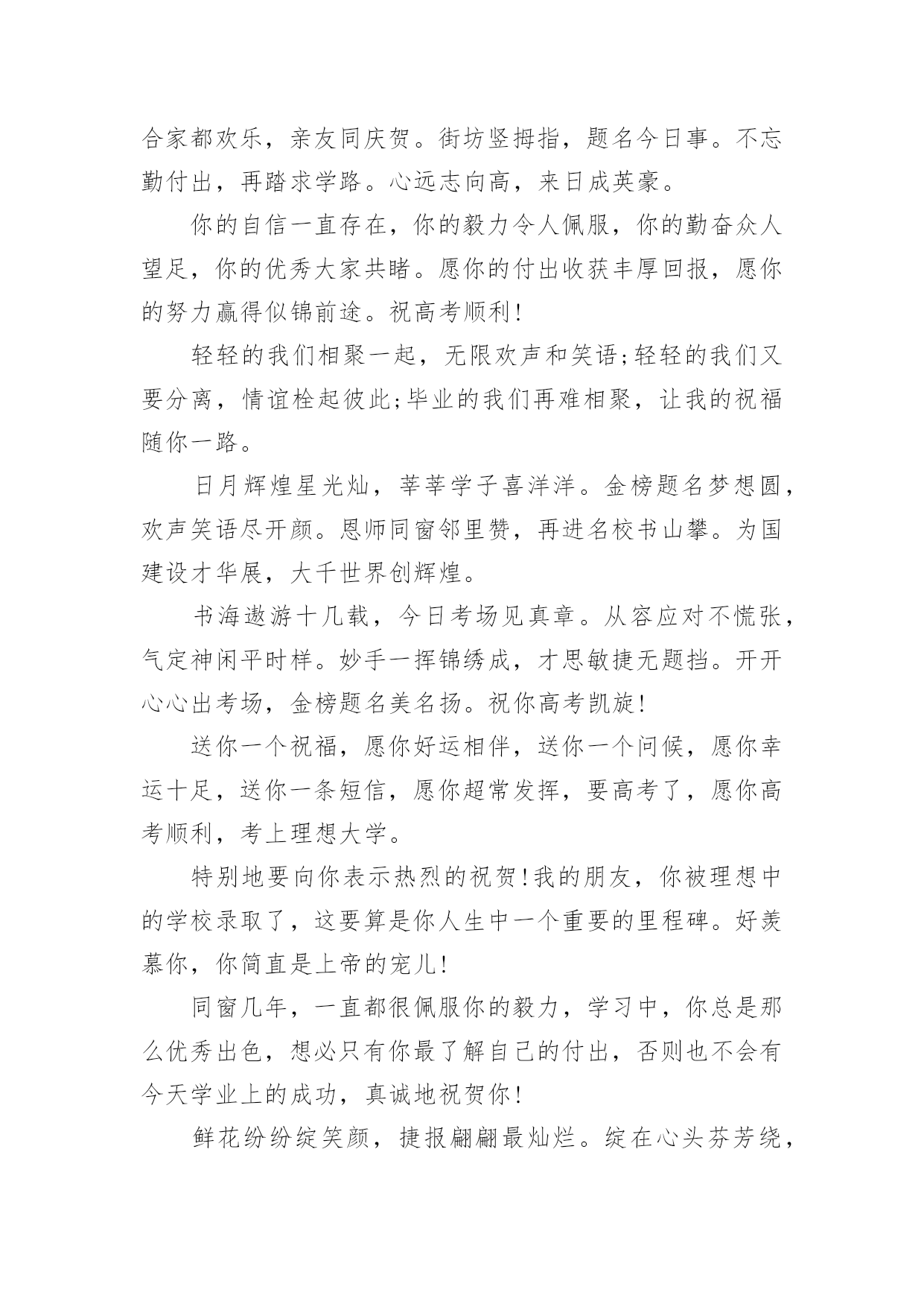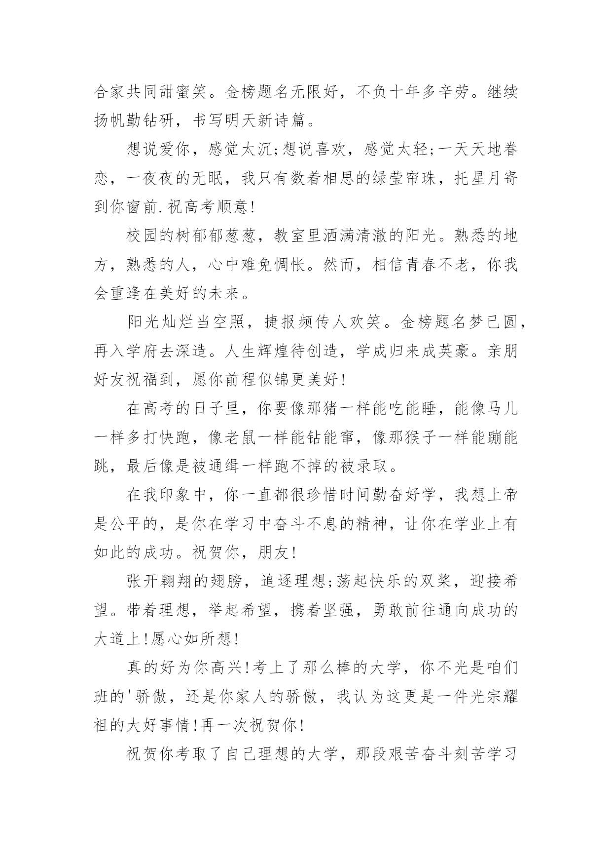 高考录取祝福语在日常学习、工作和生活中,大家都有写祝福语的经历,对祝福语很是熟悉吧,祝福语是指寄托美好祝福的话语。相信很多朋友都对写祝福语感到非常苦恼吧,下面是小编精心整理的高考录取祝福语,欢迎大家分享。高考录取祝福语1花开灿烂正盛放,香气袭人芬芳扬。捷报传来心敞亮,笑语纷纷幸福长。全家商议填志愿,再入学府长才干。关注兴趣和爱好,继续征战在明朝。愿你前程似锦。六月花开香气浓,捷报翩翩别样红。快乐蔓延数万重,亲友相贺欢喜共。举杯畅饮话成功,今朝实现求学梦。再入学府长才干,前途风光正灿烂。愿你前程似锦。六月骄阳伴花香,捷报到来携清爽。拂去心头焦和燥,送来幸福和欢笑。今日中榜功名扬,梦想实现路敞亮。乘胜扬帆再起航,铸就明天好辉煌。六月是奋斗的季节,六月是收获的季节。在经历了高考之后,捷报在焦急的等待中到来。愿你继续努力,在高等学府的知识海洋中畅游。祝前程似锦,宏图大展!六月祥云绕头顶,捷报传来喜气盈。满面春风邀同窗,合家设宴欢乐扬。把酒颜欢话梦想,立志再次书辉煌。遨游书海增才思,灿烂明朝今日始。愿你的明天灿烂辉煌。满池荷香绕,翩翩捷报到。馨香沁心脾,满面皆喜气。合家都欢乐,亲友同庆贺。街坊竖拇指,题名今日事。不忘勤付出,再踏求学路。心远志向高,来日成英豪。你的自信一直存在,你的毅力令人佩服,你的勤奋众人望足,你的优秀大家共睹。愿你的付出收获丰厚回报,愿你的努力赢得似锦前途。祝高考顺利!轻轻的我们相聚一起,无限欢声和笑语;轻轻的我们又要分离,情谊栓起彼此;毕业的我们再难相聚,让我的祝福随你一路。日月辉煌星光灿,莘莘学子喜洋洋。金榜题名梦想圆,欢声笑语尽开颜。恩师同窗邻里赞,再进名校书山攀。为国建设才华展,大千世界创辉煌。书海遨游十几载,今日考场见真章。从容应对不慌张,气定神闲平时样。妙手一挥锦绣成,才思敏捷无题挡。开开心心出考场,金榜题名美名扬。祝你高考凯旋!送你一个祝福,愿你好运相伴,送你一个问候,愿你幸运十足,送你一条短信,愿你超常发挥,要高考了,愿你高考顺利,考上理想大学。特别地要向你表示热烈的祝贺!我的朋友,你被理想中的学校录取了,这要算是你人生中一个重要的里程碑。好羡慕你,你简直是上帝的宠儿!同窗几年,一直都很佩服你的毅力,学习中,你总是那么优秀出色,想必只有你最了解自己的付出,否则也不会有今天学业上的成功,真诚地祝贺你!鲜花纷纷绽笑颜,捷报翩翩最灿烂。绽在心头芬芳绕,合家共同甜蜜笑。金榜题名无限好,不负十年多辛劳。继续扬帆勤钻研,书写明天新诗篇。想说爱你,感觉太沉;想说喜欢,感觉太轻;一天天地眷恋,一夜夜的无眠,我只有数着相思的绿莹帘珠,托星月寄到你窗前.祝高考顺意!校园的树郁郁葱葱,教室里洒满清澈的阳光。熟悉的地方,熟悉的人,心中难免惆怅。然而,相信青春不老,你我会重逢在美好的未来。阳光灿烂当空照,捷报频传人欢笑。金榜题名梦已圆,再入学府去深造。人生辉煌待创造,学成归来成英豪。亲朋好友祝福到,愿你前程似锦更美好!在高考的日子里,你要像那猪一样能吃能睡,能像马儿一样多打快跑,像老鼠一样能钻能窜,像那猴子一样能蹦能跳,最后像是被通缉一样跑不掉的被录取。在我印象中,你一直都很珍惜时间勤奋好学,我想上帝是公平的,是你在学习中奋斗不息的精神,让你在学业上有如此的成功。祝贺你,朋友!张开翱翔的翅膀,追逐理想;荡起快乐的双桨,迎接希望。带着理想,举起希望,携着坚强,勇敢前往通向成功的大道上!愿心如所想!真的好为你高兴!考上了那么棒的大学,你不光是咱们班的'骄傲,还是你家人的骄傲,我认为这更是一件光宗耀祖的大好事情!再一次祝贺你!祝贺你考取了自己理想的大学,那段艰苦奋斗刻苦学习的日子可以暂画一个句号了,这段日子,让自己干自愿事,吃顺口饭,听轻松话,睡安心觉吧!走过的这条路,爱过的那个人,品过的酸甜苦辣,流过的无数泪水,笑过的那种美,都在时间这条大河中慢慢沉淀下来,在斑驳的记忆中保存了下来。四年时光飞逝,毕业即将分别,愿你前程似锦!骄阳拂照百花香,捷报似花绽芬芳。香气飘荡满心房,欢喜连连泪两行。不畏艰辛永攀登,十年付出梦想成。题名金榜好儿郎,再入名校书辉煌。经过了黑色六月的奋斗,迎来了金秋十月的满满收获!高考,已然成为昨天;大学,马上将成为全新起点,新的起点,新的风采,奋发拼搏,不断进取,祝大学期间学业有成,知识才识更上一层楼!静静的我们即将分离,诚诚的祝福向你传送,久久阔别的日子,愿工作随你意,生活很开心,有情终眷属,升职步步高,毕业一路祝福。跨出学校大门,开始新的人生旅程。愿你点亮生命的台灯,照亮通往成功的征程。祝你事业马到功成!生活精彩纷纷!人生一帆风顺!高考录取祝福语2经过了黑色六月的奋斗,迎来了金秋十月的满满收获!高考,已然成为昨天;大学,马上将成为全新起点,新的起点,新的风采,奋发拼搏,不断进取,祝大学期间学业有成,知识才