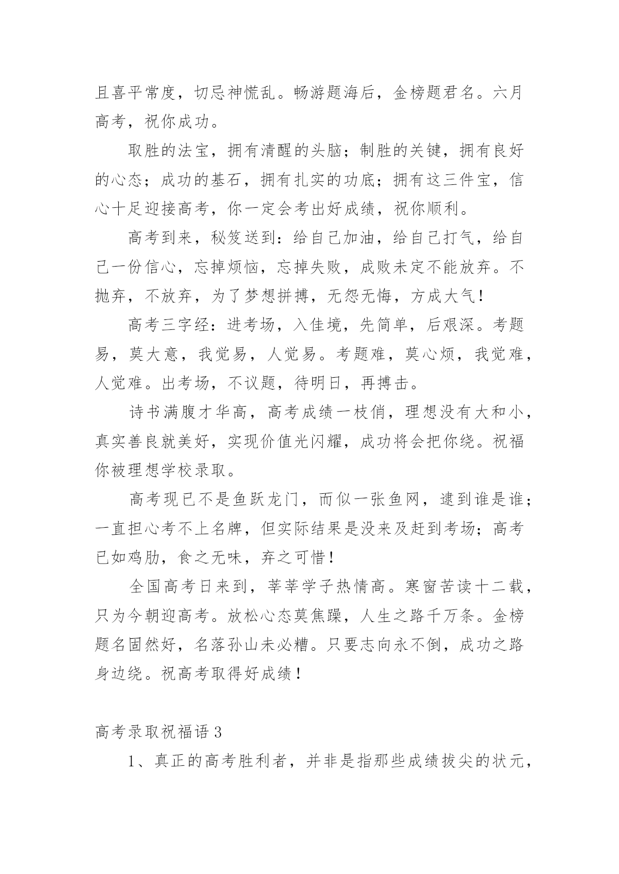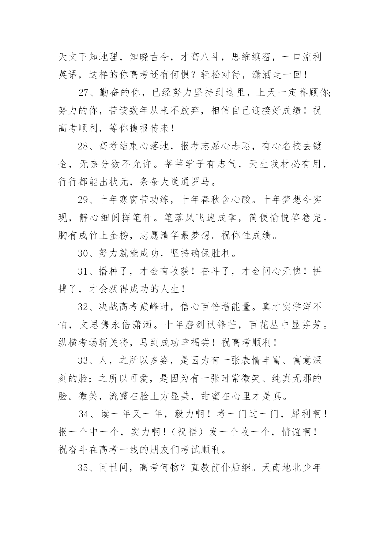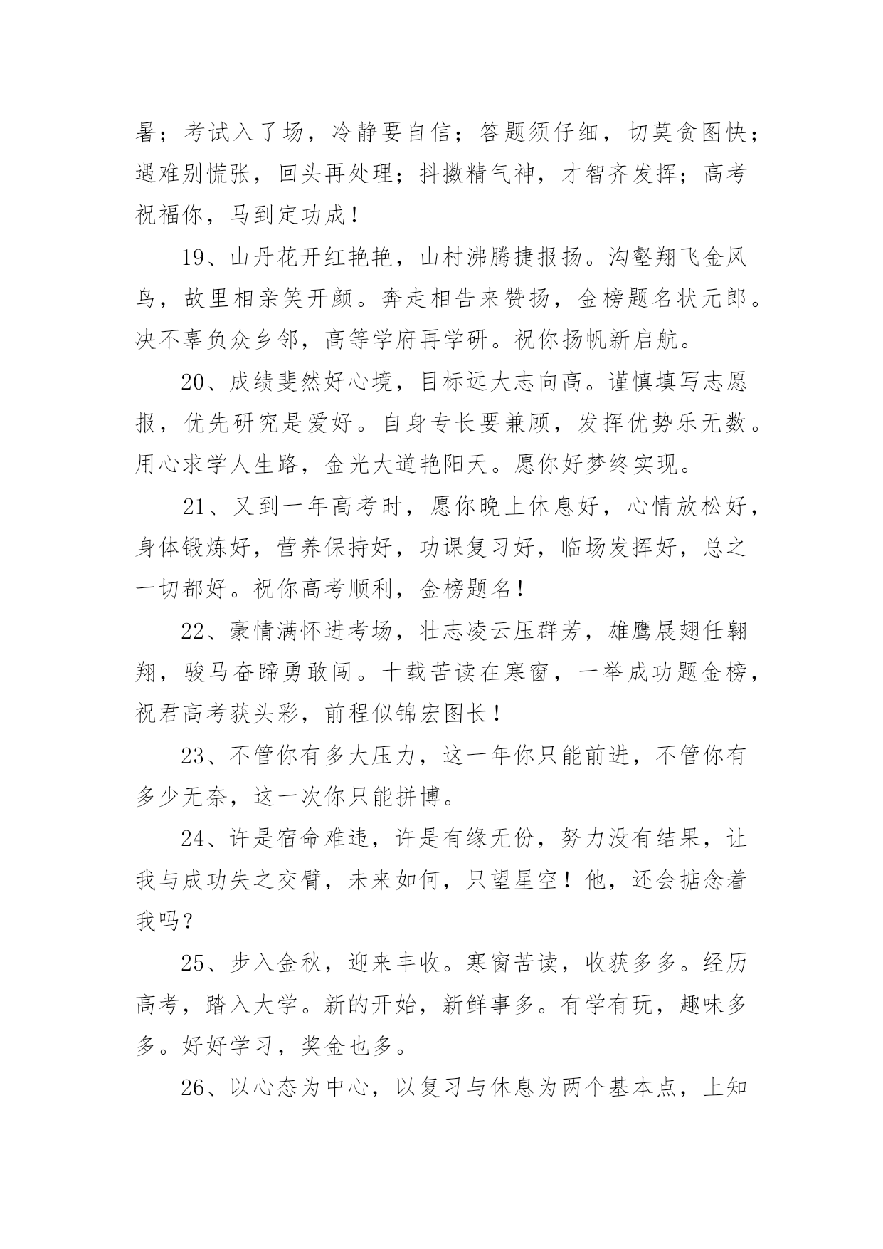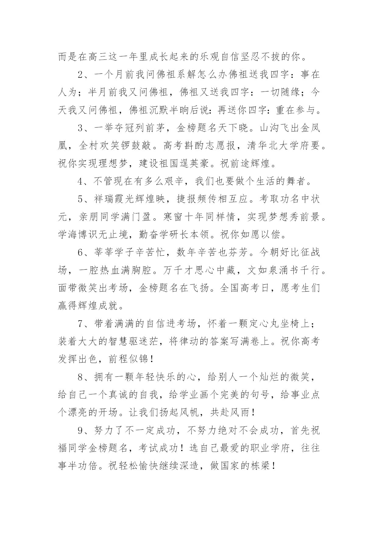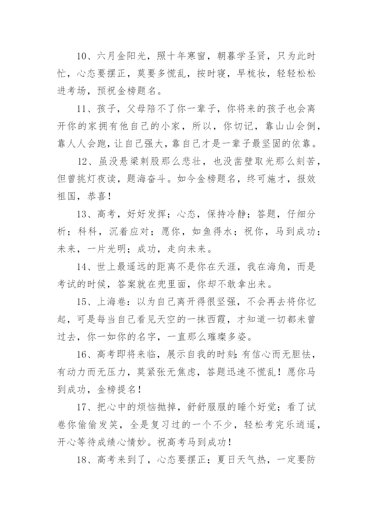 高考录取祝福语在日常学习、工作和生活中,大家都有写祝福语的经历,对祝福语很是熟悉吧,祝福语是指寄托美好祝福的话语。相信很多朋友都对写祝福语感到非常苦恼吧,下面是小编精心整理的高考录取祝福语,欢迎大家分享。高考录取祝福语1花开灿烂正盛放,香气袭人芬芳扬。捷报传来心敞亮,笑语纷纷幸福长。全家商议填志愿,再入学府长才干。关注兴趣和爱好,继续征战在明朝。愿你前程似锦。六月花开香气浓,捷报翩翩别样红。快乐蔓延数万重,亲友相贺欢喜共。举杯畅饮话成功,今朝实现求学梦。再入学府长才干,前途风光正灿烂。愿你前程似锦。六月骄阳伴花香,捷报到来携清爽。拂去心头焦和燥,送来幸福和欢笑。今日中榜功名扬,梦想实现路敞亮。乘胜扬帆再起航,铸就明天好辉煌。六月是奋斗的季节,六月是收获的季节。在经历了高考之后,捷报在焦急的等待中到来。愿你继续努力,在高等学府的知识海洋中畅游。祝前程似锦,宏图大展!六月祥云绕头顶,捷报传来喜气盈。满面春风邀同窗,合家设宴欢乐扬。把酒颜欢话梦想,立志再次书辉煌。遨游书海增才思,灿烂明朝今日始。愿你的明天灿烂辉煌。满池荷香绕,翩翩捷报到。馨香沁心脾,满面皆喜气。合家都欢乐,亲友同庆贺。街坊竖拇指,题名今日事。不忘勤付出,再踏求学路。心远志向高,来日成英豪。你的自信一直存在,你的毅力令人佩服,你的勤奋众人望足,你的优秀大家共睹。愿你的付出收获丰厚回报,愿你的努力赢得似锦前途。祝高考顺利!轻轻的我们相聚一起,无限欢声和笑语;轻轻的我们又要分离,情谊栓起彼此;毕业的我们再难相聚,让我的祝福随你一路。日月辉煌星光灿,莘莘学子喜洋洋。金榜题名梦想圆,欢声笑语尽开颜。恩师同窗邻里赞,再进名校书山攀。为国建设才华展,大千世界创辉煌。书海遨游十几载,今日考场见真章。从容应对不慌张,气定神闲平时样。妙手一挥锦绣成,才思敏捷无题挡。开开心心出考场,金榜题名美名扬。祝你高考凯旋!送你一个祝福,愿你好运相伴,送你一个问候,愿你幸运十足,送你一条短信,愿你超常发挥,要高考了,愿你高考顺利,考上理想大学。特别地要向你表示热烈的祝贺!我的朋友,你被理想中的学校录取了,这要算是你人生中一个重要的里程碑。好羡慕你,你简直是上帝的宠儿!同窗几年,一直都很佩服你的毅力,学习中,你总是那么优秀出色,想必只有你最了解自己的付出,否则也不会有今天学业上的成功,真诚地祝贺你!鲜花纷纷绽笑颜,捷报翩翩最灿烂。绽在心头芬芳绕,合家共同甜蜜笑。金榜题名无限好,不负十年多辛劳。继续扬帆勤钻研,书写明天新诗篇。想说爱你,感觉太沉;想说喜欢,感觉太轻;一天天地眷恋,一夜夜的无眠,我只有数着相思的绿莹帘珠,托星月寄到你窗前.祝高考顺意!校园的树郁郁葱葱,教室里洒满清澈的阳光。熟悉的地方,熟悉的人,心中难免惆怅。然而,相信青春不老,你我会重逢在美好的未来。阳光灿烂当空照,捷报频传人欢笑。金榜题名梦已圆,再入学府去深造。人生辉煌待创造,学成归来成英豪。亲朋好友祝福到,愿你前程似锦更美好!在高考的日子里,你要像那猪一样能吃能睡,能像马儿一样多打快跑,像老鼠一样能钻能窜,像那猴子一样能蹦能跳,最后像是被通缉一样跑不掉的被录取。在我印象中,你一直都很珍惜时间勤奋好学,我想上帝是公平的,是你在学习中奋斗不息的精神,让你在学业上有如此的成功。祝贺你,朋友!张开翱翔的翅膀,追逐理想;荡起快乐的双桨,迎接希望。带着理想,举起希望,携着坚强,勇敢前往通向成功的大道上!愿心如所想!真的好为你高兴!考上了那么棒的大学,你不光是咱们班的'骄傲,还是你家人的骄傲,我认为这更是一件光宗耀祖的大好事情!再一次祝贺你!祝贺你考取了自己理想的大学,那段艰苦奋斗刻苦学习的日子可以暂画一个句号了,这段日子,让自己干自愿事,吃顺口饭,听轻松话,睡安心觉吧!走过的这条路,爱过的那个人,品过的酸甜苦辣,流过的无数泪水,笑过的那种美,都在时间这条大河中慢慢沉淀下来,在斑驳的记忆中保存了下来。四年时光飞逝,毕业即将分别,愿你前程似锦!骄阳拂照百花香,捷报似花绽芬芳。香气飘荡满心房,欢喜连连泪两行。不畏艰辛永攀登,十年付出梦想成。题名金榜好儿郎,再入名校书辉煌。经过了黑色六月的奋斗,迎来了金秋十月的满满收获!高考,已然成为昨天;大学,马上将成为全新起点,新的起点,新的风采,奋发拼搏,不断进取,祝大学期间学业有成,知识才识更上一层楼!静静的我们即将分离,诚诚的祝福向你传送,久久阔别的日子,愿工作随你意,生活很开心,有情终眷属,升职步步高,毕业一路祝福。跨出学校大门,开始新的人生旅程。愿你点亮生命的台灯,照亮通往成功的征程。祝你事业马到功成!生活精彩纷纷!人生一帆风顺!高考录取祝福语2经过了黑色六月的奋斗,迎来了金秋十月的满满收获!高考,已然成为昨天;大学,马上将成为全新起点,新的起点,新的风采,奋发拼搏,不断进取,祝大学期间学业有成,知识才