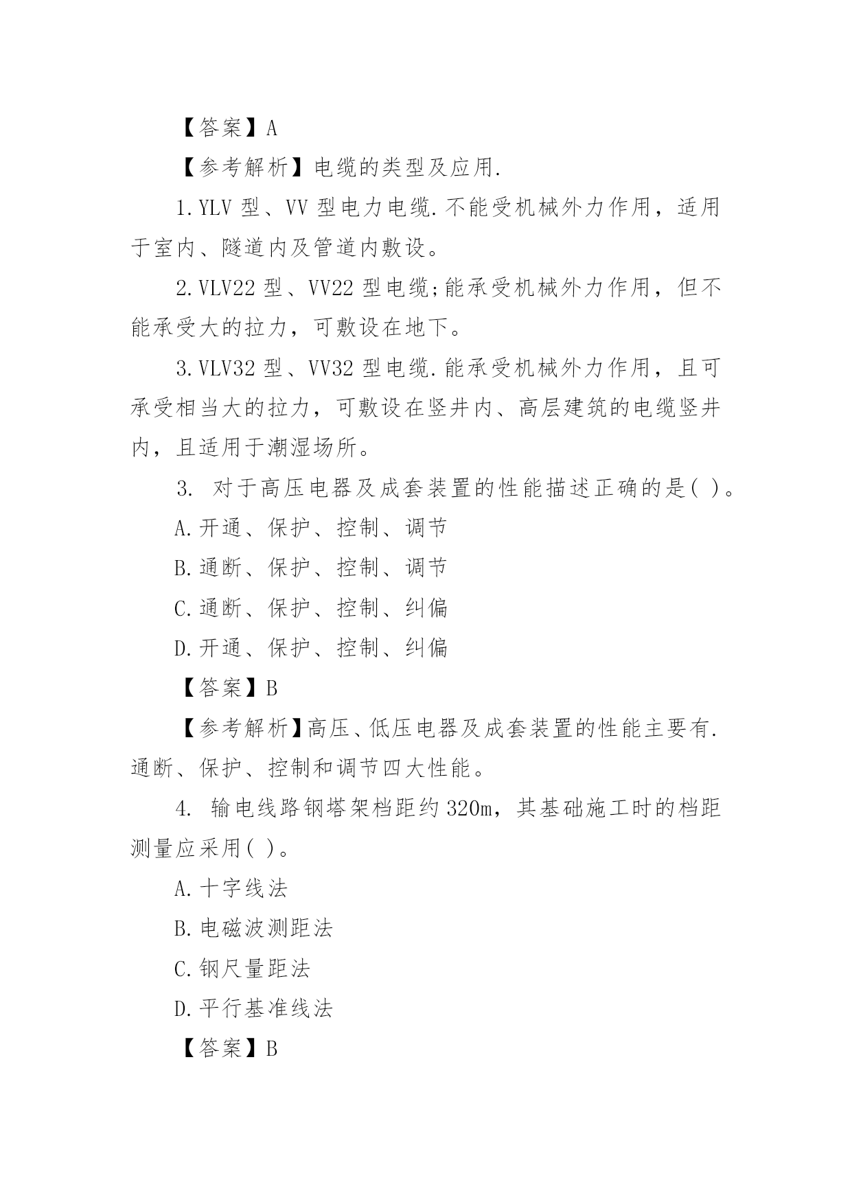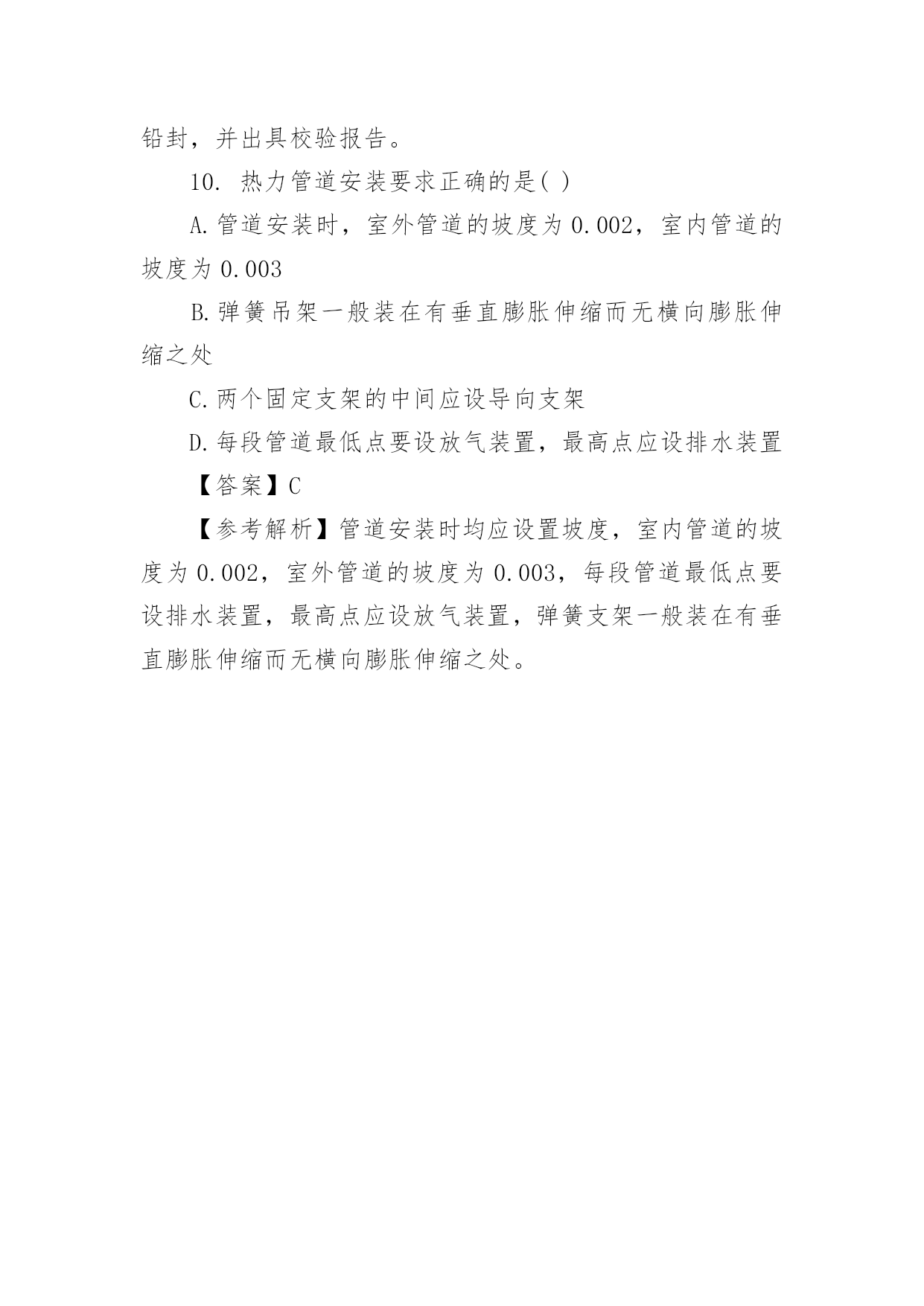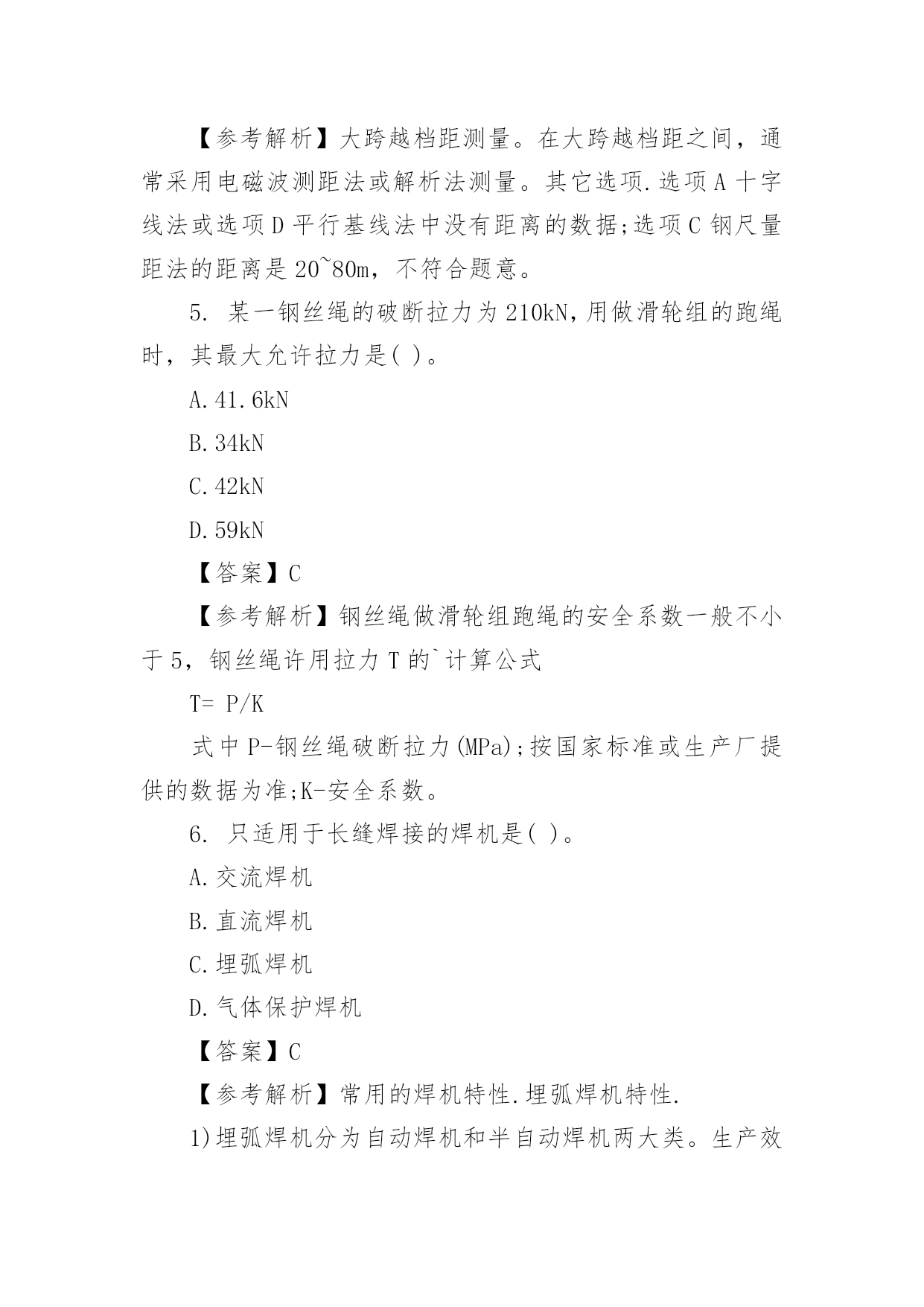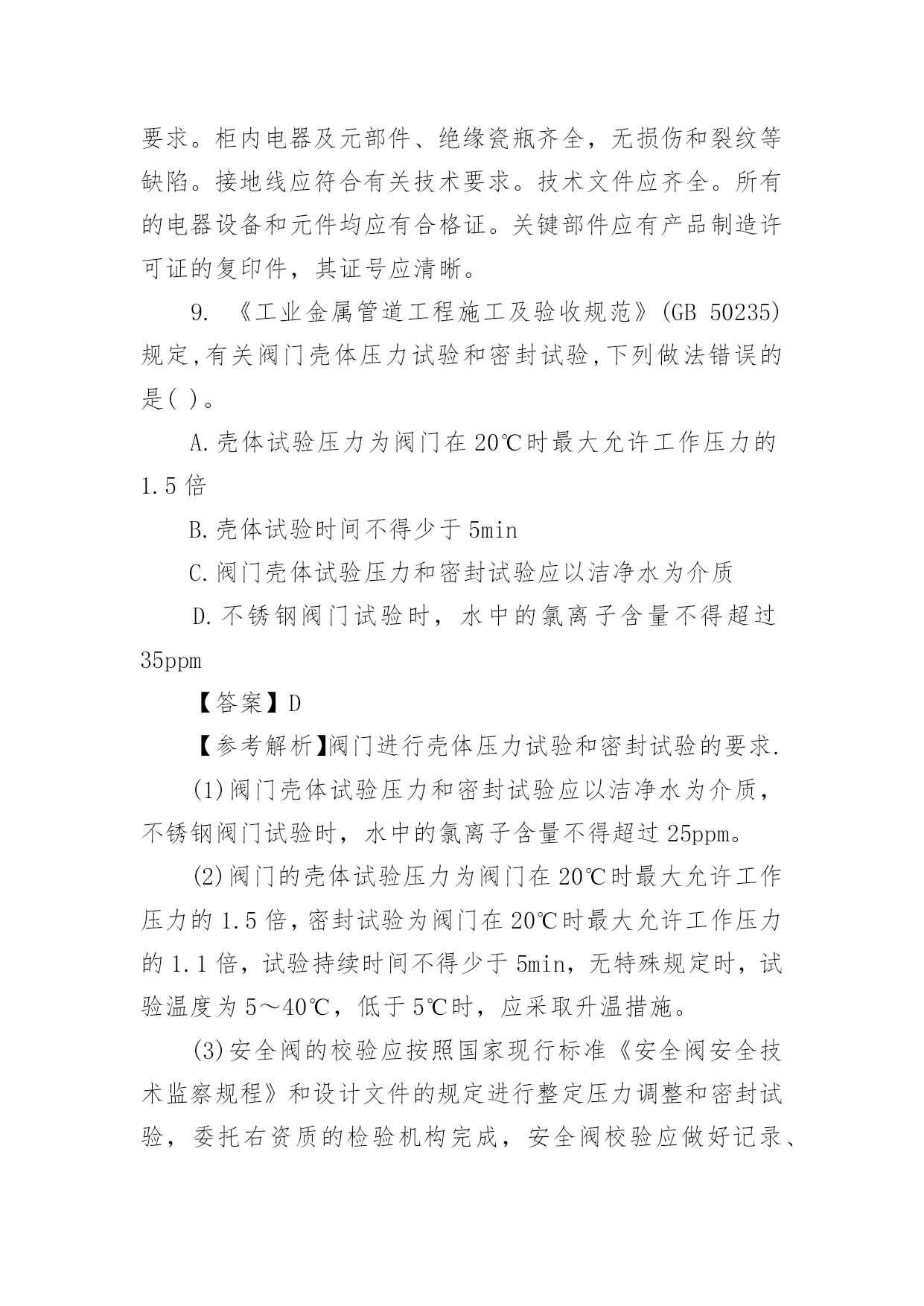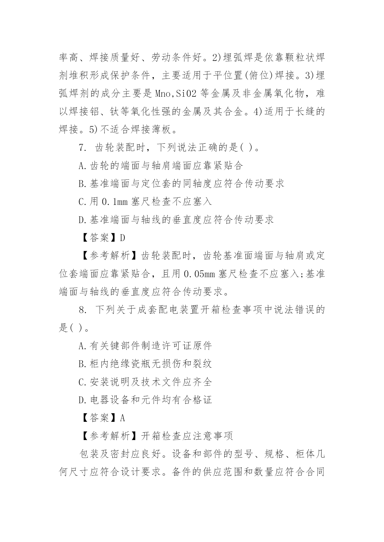 一建考试习题及答案一建考试习题及答案1.适用于低、中压空调系统及潮湿环境,但对高压及洁净空调、酸碱性环境和防排烟系统不适用的风管,一般用()制成。A.聚氨酯复合板材B.玻璃纤维复合板材C.无机玻璃钢板材D.酚醛复合板材【答案】D【参考解析】聚氨酯复合风管适用于低、中、高压洁净空调系统及潮湿环境,但对酸碱性环境和防排烟系统不适用;玻璃纤维复合风管适用于中压以下的空调系统,但对洁净空调、酸碱性环境和防排烟系统以及相对湿度90%以上的系统不适用;硬聚氯乙烯风管适用于洁净室含酸碱的排风系统;酚醛复合风管适用于低、中压空调系统及潮湿环境,但对高压及洁净空调、酸碱性环境和防排烟系统不适用。2.不能受机械外力作用,适用于室内、隧道内及管道内敷设的电力电缆是()。A.YJV型、VV型电力电缆B.YJV22型、VV22型电缆C.YJV32型、VV32型电缆D.WD-ZANYJFE型、YJV型电力电缆【答案】A【参考解析】电缆的类型及应用.1.YLV型、VV型电力电缆.不能受机械外力作用,适用于室内、隧道内及管道内敷设。2.VLV22型、VV22型电缆;能承受机械外力作用,但不能承受大的拉力,可敷设在地下。3.VLV32型、VV32型电缆.能承受机械外力作用,且可承受相当大的拉力,可敷设在竖井内、高层建筑的电缆竖井内,且适用于潮湿场所。3.对于高压电器及成套装置的性能描述正确的是()。A.开通、保护、控制、调节B.通断、保护、控制、调节C.通断、保护、控制、纠偏D.开通、保护、控制、纠偏【答案】B【参考解析】高压、低压电器及成套装置的性能主要有.通断、保护、控制和调节四大性能。4.输电线路钢塔架档距约320m,其基础施工时的档距测量应采用()。A.十字线法B.电磁波测距法C.钢尺量距法D.平行基准线法【答案】B【参考解析】大跨越档距测量。在大跨越档距之间,通常采用电磁波测距法或解析法测量。其它选项.选项A十字线法或选项D平行基线法中没有距离的数据;选项C钢尺量距法的距离是20~80m,不符合题意。5.某一钢丝绳的破断拉力为210kN,用做滑轮组的跑绳时,其最大允许拉力是()。A.41.6kNB.34kNC.42kND.59kN【答案】C【参考解析】钢丝绳做滑轮组跑绳的安全系数一般不小于5,钢丝绳许用拉力T的`计算公式T=P/K式中P-钢丝绳破断拉力(MPa);按国家标准或生产厂提供的数据为准;K-安全系数。6.只适用于长缝焊接的焊机是()。A.交流焊机B.直流焊机C.埋弧焊机D.气体保护焊机【答案】C【参考解析】常用的焊机特性.埋弧焊机特性.1)埋弧焊机分为自动焊机和半自动焊机两大类。生产效率高、焊接质量好、劳动条件好。2)埋弧焊是依靠颗粒状焊剂堆积形成保护条件,主要适用于平位置(俯位)焊接。3)埋弧焊剂的成分主要是Mno,Si02等金属及非金属氧化物,难以焊接铝、钛等氧化性强的金属及其合金。4)适用于长缝的焊接。5)不适合焊接薄板。7.齿轮装配时,下列说法正确的是()。A.齿轮的端面与轴肩端面应靠紧贴合B.基准端面与定位套的同轴度应符合传动要求C.用0.1mm塞尺检查不应塞入D.基准端面与轴线的垂直度应符合传动要求【答案】D【参考解析】齿轮装配时,齿轮基准面端面与轴肩或定位套端面应靠紧贴合,且用0.05mm塞尺检查不应塞入;基准端面与轴线的垂直度应符合传动要求。8.下列关于成套配电装置开箱检查事项中说法错误的是()。A.有关键部件制造许可证原件B.柜内绝缘瓷瓶无损伤和裂纹C.安装说明及技术文件应齐全D.电器设备和元件均有合格证【答案】A【参考解析】开箱检查应注意事项包装及密封应良好。设备和部件的型号、规格、柜体几何尺寸应符合设计要求。备件的供应范围和数量应符合合同要求。柜内电器及元部件、绝缘瓷瓶齐全,无损伤和裂纹等缺陷。接地线应符合有关技术要求。技术文件应齐全。所有的电器设备和元件均应有合格证。关键部件应有产品制造许可证的复印件,其证号应清晰。9.《工业金属管道工程施工及验收规范》(GB50235)规定,有关阀门壳体压力试验和密封试验,下列做法错误的是()。A.壳体试验压力为阀门在20℃时最大允许工作压力的1.5倍B.壳体试验时间不得少于5minC.阀门壳体试验压力和密封试验应以洁净水为介质D.不锈钢阀门试验时,水中的氯离子含量不得超过35ppm【答案】D【参考解析】阀门进行壳体压力试验和密封试验的要求.(1)阀门壳体试验压力和密封试验应以洁净水为介质,不锈钢阀门试验时,水中的氯离子含量不得超过25ppm。(2)阀门的壳体试验压力为阀门在20℃时最大允许工作压力的1.5倍,密封试验为阀门在20℃时最大允许工作压力的1.1倍,试验持续时间不得少于5min,无特殊规定时,试验温度为5~40℃,低于5℃时,应采取升温措施。(3)安全阀的校验应按照