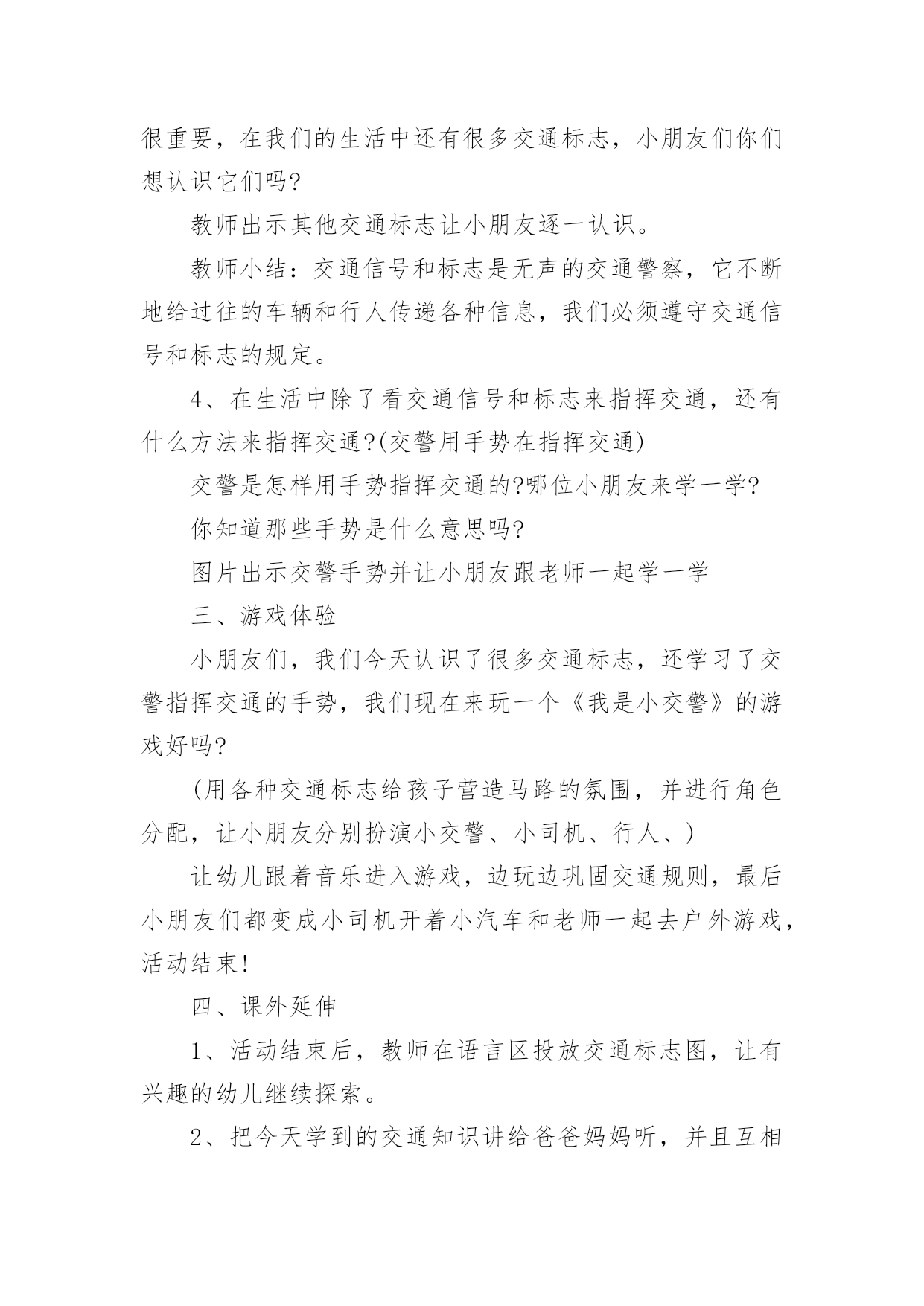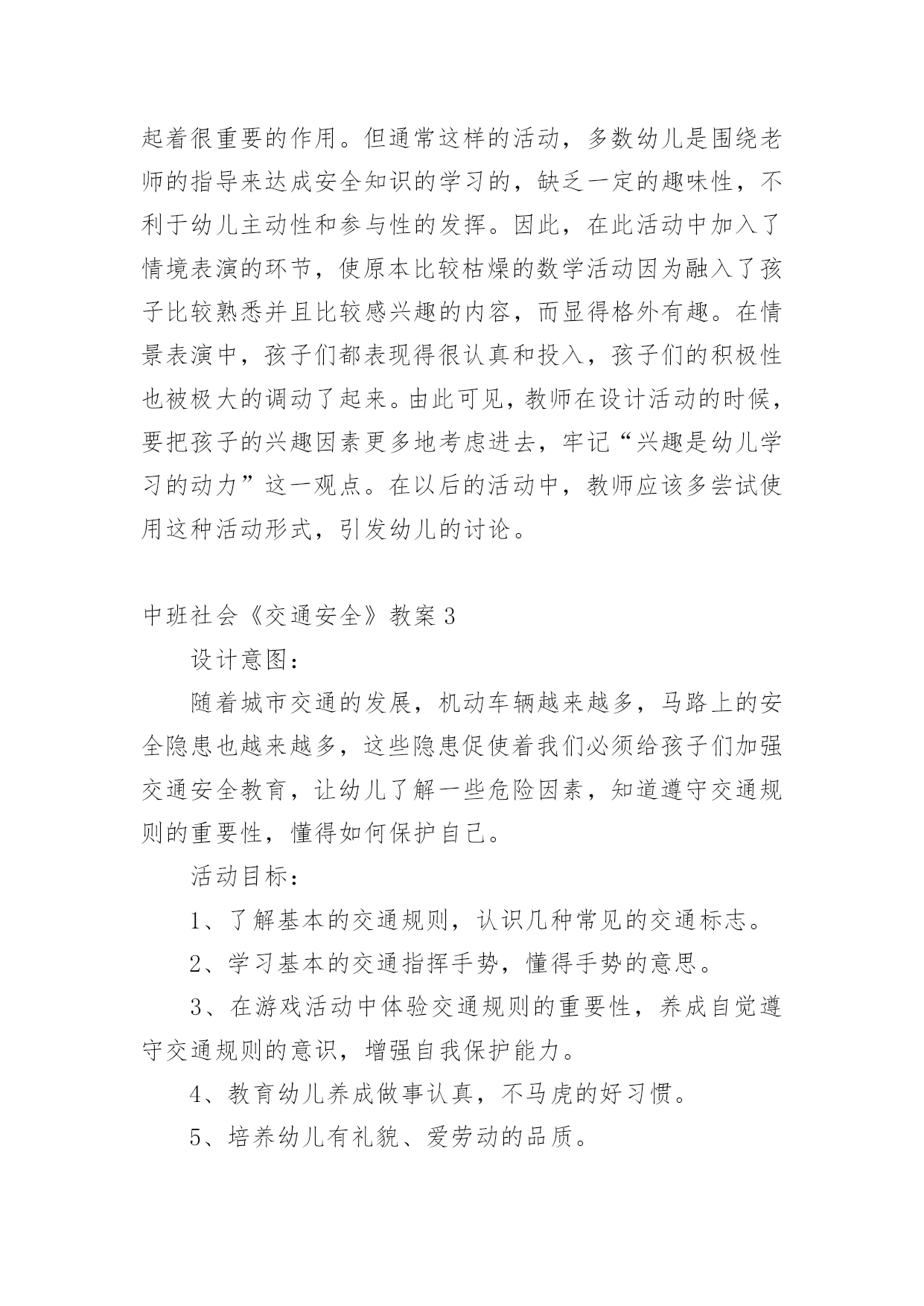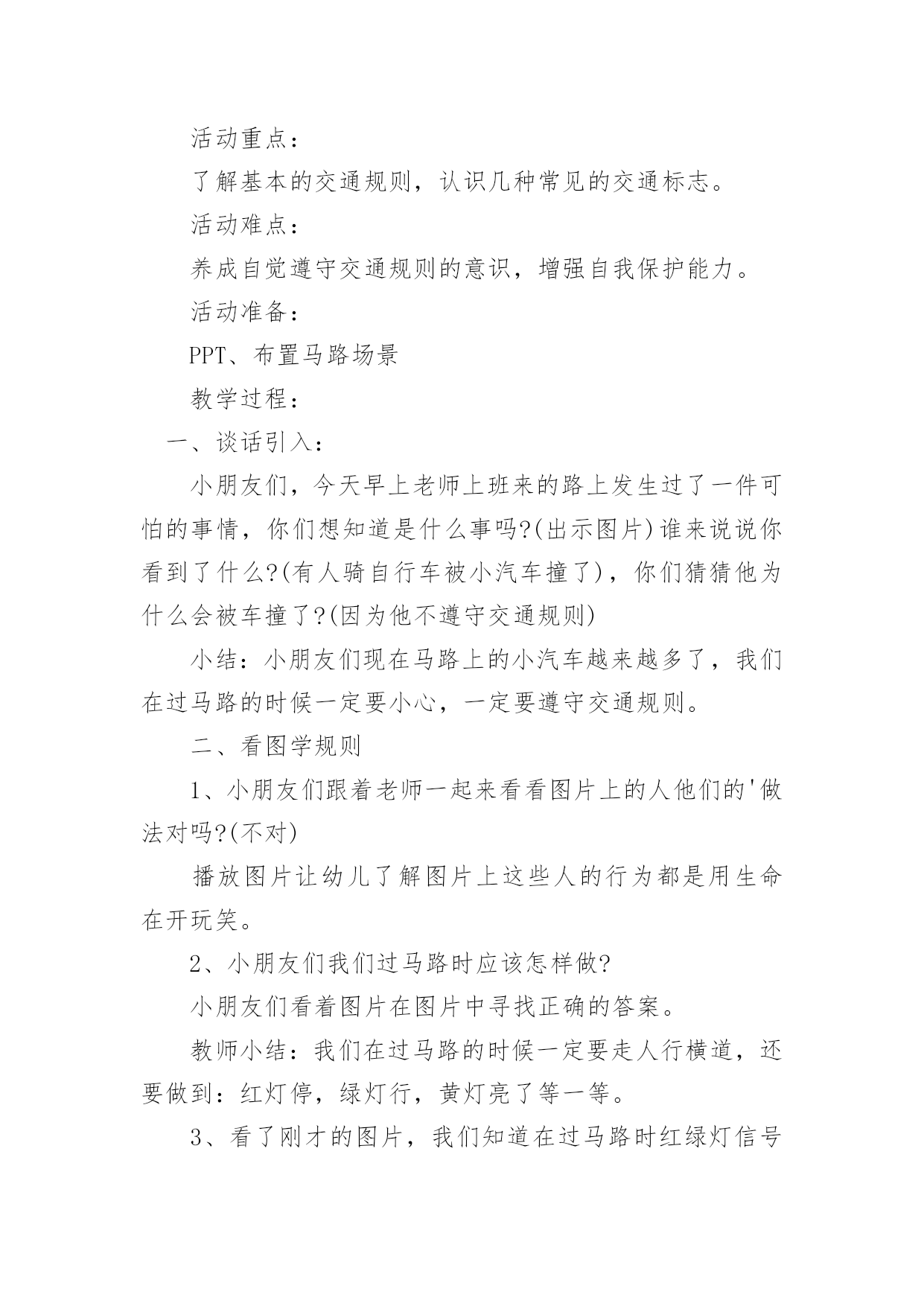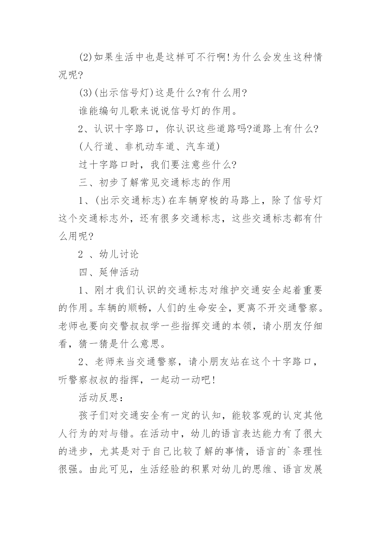 中班社会《交通安全》教案作为一名老师,通常需要用到教案来辅助教学,编写教案有利于我们科学、合理地支配课堂时间。我们应该怎么写教案呢?以下是小编精心整理的中班社会《交通安全》教案,欢迎大家借鉴与参考,希望对大家有所帮助。中班社会《交通安全》教案1设计意图:幼儿对交警叔叔很敬重,特别是他们站在马路中间指挥交通的威武形象,为了让幼儿了解交警的日常工作,知道他们工作的辛苦,从而对交警更加敬重,也为了进一步萌发幼儿守交通规则的意识,加强自我保护的意识。通过幼儿辐射到家庭和社会,努力创设“人人遵守交通规则的良好氛国”特设计本次社会实践活动《我是小交警》。活动目标:1、通过和交警交流互动,帮助幼儿了解交通安全的重要性,认识一些重要的交通标志,并学习做交通手势。2、通过实践体验活动学习交警遵守纪律、艰苦奋斗的优良品质,培养幼儿的纪律观念和团结互助、吃苦耐劳的精神,增强广大幼儿的交通文明和社会公德意识,体会到交警工作的重要性。活动准备:1、邀请交警阿姨来园参与活动。2、多媒体课件。3、幼儿交警服装。活动过程:一、集体活动。1、教师谈话,邀请交警阿姨出场,吸引幼儿兴趣。2、交警阿姨通过让幼儿观看多媒体并提问的方式,帮助幼儿了解红绿灯的'作用。3、认识常见的交通标志和信号。4、让幼儿了解简单的交通手势并学一学。5、启发幼儿探讨马路上的交通规则。问:自行车应该在什么道上行使?自行车应该怎样过马路?自行车该遵守哪些交通规则呢?小朋友们刚才观察的都很仔细,说的也很对。那老师还想问一问,在我们的生活当中自行车应该在什么道上行驶?自行车应该怎样过马路?自行车又应该遵守哪些交通规则?那行人呢?二、区域活动:带幼儿到布置好的游戏情景中,请交警阿姨指导,学当小交警并做指挥交通状。三、实践活动:教师和交警一同组织幼儿穿上交警服装去西环路上岗实践,参与交通指挥,真正的当一次小交警。中班社会《交通安全》教案2活动意图:开学了,校园安全再次成为关注焦点。新的学期你怎么上学呢?是爸爸妈妈送你,还是自己去上学呢?无论何种方式都要注意安全。活动目标:1、在交流活动中认识常见的交通标志。2、体验交通规则的重要性,自觉遵守交通规则。3、遵守社会行为规则,不做“禁止”的事。4、培养幼儿动脑思考问题、解决问题的能力。5、能积极参加游戏活动,并学会自我保护。活动准备:1、布置活动场景。2、收集各种交通标志(照片或图片)。3、字卡:交通安全、红灯停,绿灯行、人行道、非机动车道、汽车道。活动过程:一、展开联想,揭示活动主题1、出示交通事故图片,请幼儿仔细观察。提问:孩子们,刚才你们看到了什么?想到了什么?2、多么可怕的车祸,为了不让这样的事情再发生,我们一定要注意交通安全。(出示字卡“交通安全”)二、在活动中体会交通规则的重要性1、观看情景表演老师请出表演者,其余幼儿观看表演。(1)孩子们,刚才你们看到了发生了什么事情?(2)如果生活中也是这样可不行啊!为什么会发生这种情况呢?(3)(出示信号灯)这是什么?有什么用?谁能编句儿歌来说说信号灯的作用。2、认识十字路口,你认识这些道路吗?道路上有什么?(人行道、非机动车道、汽车道)过十字路口时,我们要注意些什么?三、初步了解常见交通标志的作用1、(出示交通标志)在车辆穿梭的马路上,除了信号灯这个交通标志外,还有很多交通标志,这些交通标志都有什么用呢?2、幼儿讨论四、延伸活动1、刚才我们认识的交通标志对维护交通安全起着重要的作用。车辆的顺畅,人们的生命安全,更离不开交通警察。老师也要向交警叔叔学一些指挥交通的本领,请小朋友仔细看,猜一猜是什么意思。2、老师来当交通警察,请小朋友站在这个十字路口,听警察叔叔的指挥,一起动一动吧!活动反思:孩子们对交通安全有一定的认知,能较客观的认定其他人行为的对与错。在活动中,幼儿的语言表达能力有了很大的进步,尤其是对于自己比较了解的事情,语言的`条理性很强。由此可见,生活经验的积累对幼儿的思维、语言发展起着很重要的作用。但通常这样的活动,多数幼儿是围绕老师的指导来达成安全知识的学习的,缺乏一定的趣味性,不利于幼儿主动性和参与性的发挥。因此,在此活动中加入了情境表演的环节,使原本比较枯燥的数学活动因为融入了孩子比较熟悉并且比较感兴趣的内容,而显得格外有趣。在情景表演中,孩子们都表现得很认真和投入,孩子们的积极性也被极大的调动了起来。由此可见,教师在设计活动的时候,要把孩子的兴趣因素更多地考虑进去,牢记“兴趣是幼儿学习的动力”这一观点。在以后的活动中,教师应该多尝试使用这种活动形式,引发幼儿的讨论。中班社会《交通安全》教案3设计意图:随着城市交通的发展,机动车辆越来越多,马路上的安全隐患也越来越多,这些隐患促使着我们必须给孩子们加强交通安全教育,让幼儿了解一些危险因素,知道遵守交通规则的重要性,懂得如何保护自己。活