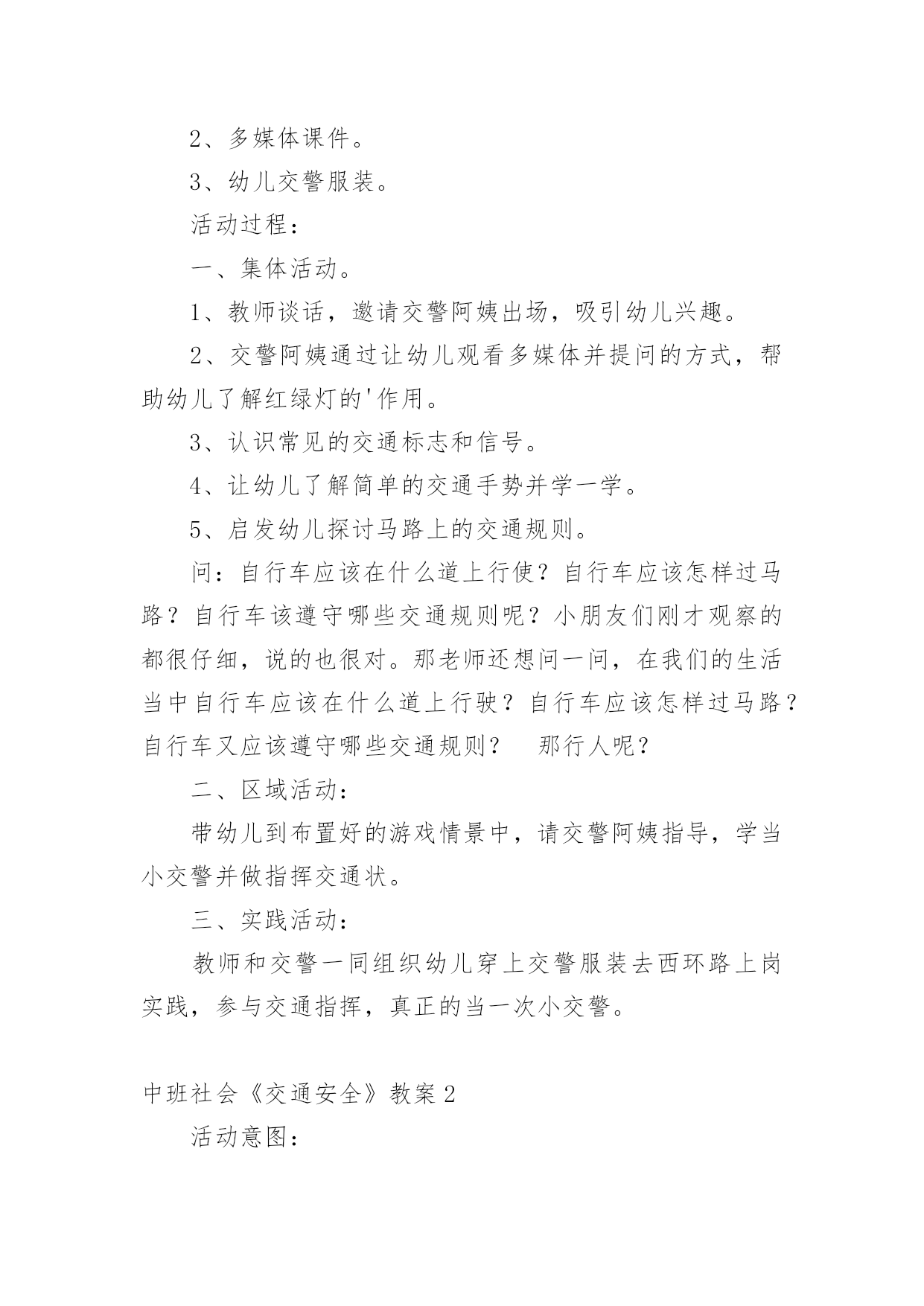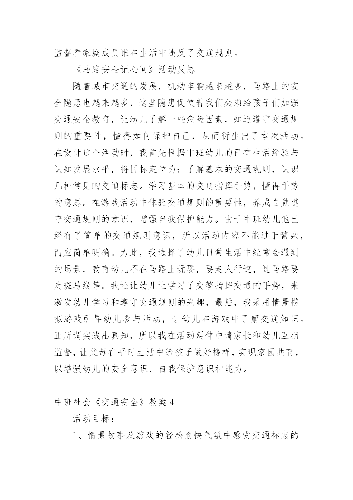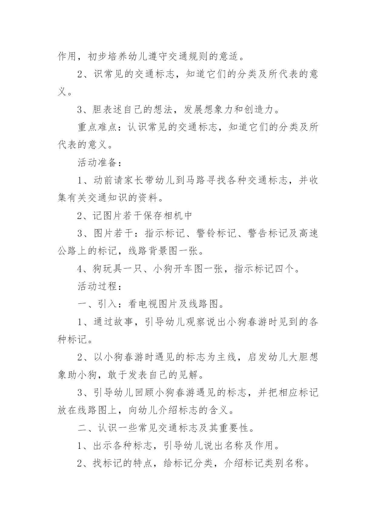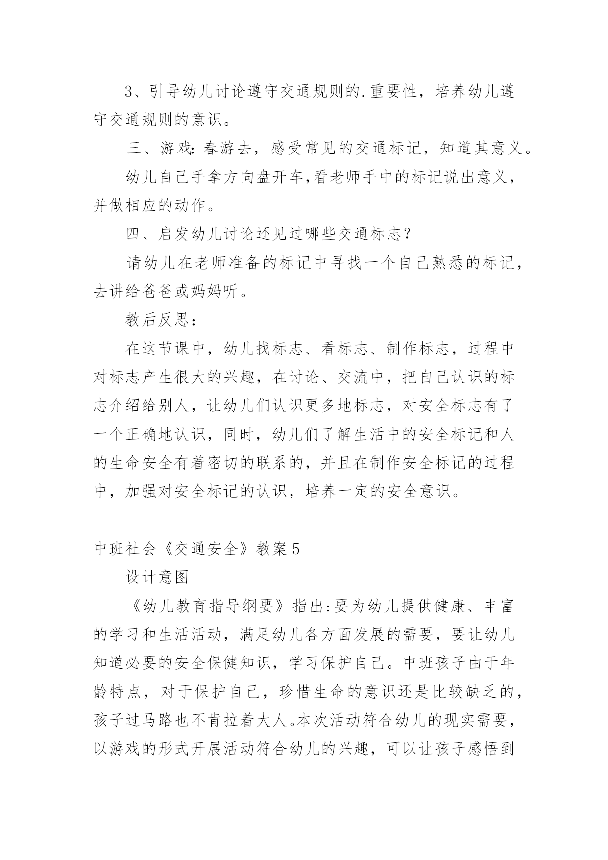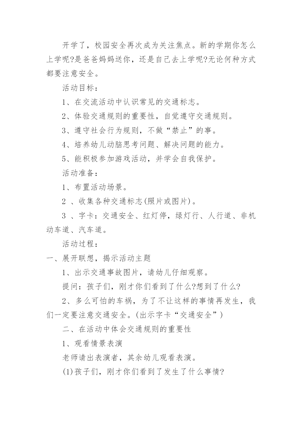 中班社会《交通安全》教案作为一名老师,通常需要用到教案来辅助教学,编写教案有利于我们科学、合理地支配课堂时间。我们应该怎么写教案呢?以下是小编精心整理的中班社会《交通安全》教案,欢迎大家借鉴与参考,希望对大家有所帮助。中班社会《交通安全》教案1设计意图:幼儿对交警叔叔很敬重,特别是他们站在马路中间指挥交通的威武形象,为了让幼儿了解交警的日常工作,知道他们工作的辛苦,从而对交警更加敬重,也为了进一步萌发幼儿守交通规则的意识,加强自我保护的意识。通过幼儿辐射到家庭和社会,努力创设“人人遵守交通规则的良好氛国”特设计本次社会实践活动《我是小交警》。活动目标:1、通过和交警交流互动,帮助幼儿了解交通安全的重要性,认识一些重要的交通标志,并学习做交通手势。2、通过实践体验活动学习交警遵守纪律、艰苦奋斗的优良品质,培养幼儿的纪律观念和团结互助、吃苦耐劳的精神,增强广大幼儿的交通文明和社会公德意识,体会到交警工作的重要性。活动准备:1、邀请交警阿姨来园参与活动。2、多媒体课件。3、幼儿交警服装。活动过程:一、集体活动。1、教师谈话,邀请交警阿姨出场,吸引幼儿兴趣。2、交警阿姨通过让幼儿观看多媒体并提问的方式,帮助幼儿了解红绿灯的'作用。3、认识常见的交通标志和信号。4、让幼儿了解简单的交通手势并学一学。5、启发幼儿探讨马路上的交通规则。问:自行车应该在什么道上行使?自行车应该怎样过马路?自行车该遵守哪些交通规则呢?小朋友们刚才观察的都很仔细,说的也很对。那老师还想问一问,在我们的生活当中自行车应该在什么道上行驶?自行车应该怎样过马路?自行车又应该遵守哪些交通规则?那行人呢?二、区域活动:带幼儿到布置好的游戏情景中,请交警阿姨指导,学当小交警并做指挥交通状。三、实践活动:教师和交警一同组织幼儿穿上交警服装去西环路上岗实践,参与交通指挥,真正的当一次小交警。中班社会《交通安全》教案2活动意图:开学了,校园安全再次成为关注焦点。新的学期你怎么上学呢?是爸爸妈妈送你,还是自己去上学呢?无论何种方式都要注意安全。活动目标:1、在交流活动中认识常见的交通标志。2、体验交通规则的重要性,自觉遵守交通规则。3、遵守社会行为规则,不做“禁止”的事。4、培养幼儿动脑思考问题、解决问题的能力。5、能积极参加游戏活动,并学会自我保护。活动准备:1、布置活动场景。2、收集各种交通标志(照片或图片)。3、字卡:交通安全、红灯停,绿灯行、人行道、非机动车道、汽车道。活动过程:一、展开联想,揭示活动主题1、出示交通事故图片,请幼儿仔细观察。提问:孩子们,刚才你们看到了什么?想到了什么?2、多么可怕的车祸,为了不让这样的事情再发生,我们一定要注意交通安全。(出示字卡“交通安全”)二、在活动中体会交通规则的重要性1、观看情景表演老师请出表演者,其余幼儿观看表演。(1)孩子们,刚才你们看到了发生了什么事情?(2)如果生活中也是这样可不行啊!为什么会发生这种情况呢?(3)(出示信号灯)这是什么?有什么用?谁能编句儿歌来说说信号灯的作用。2、认识十字路口,你认识这些道路吗?道路上有什么?(人行道、非机动车道、汽车道)过十字路口时,我们要注意些什么?三、初步了解常见交通标志的作用1、(出示交通标志)在车辆穿梭的马路上,除了信号灯这个交通标志外,还有很多交通标志,这些交通标志都有什么用呢?2、幼儿讨论四、延伸活动1、刚才我们认识的交通标志对维护交通安全起着重要的作用。车辆的顺畅,人们的生命安全,更离不开交通警察。老师也要向交警叔叔学一些指挥交通的本领,请小朋友仔细看,猜一猜是什么意思。2、老师来当交通警察,请小朋友站在这个十字路口,听警察叔叔的指挥,一起动一动吧!活动反思:孩子们对交通安全有一定的认知,能较客观的认定其他人行为的对与错。在活动中,幼儿的语言表达能力有了很大的进步,尤其是对于自己比较了解的事情,语言的`条理性很强。由此可见,生活经验的积累对幼儿的思维、语言发展起着很重要的作用。但通常这样的活动,多数幼儿是围绕老师的指导来达成安全知识的学习的,缺乏一定的趣味性,不利于幼儿主动性和参与性的发挥。因此,在此活动中加入了情境表演的环节,使原本比较枯燥的数学活动因为融入了孩子比较熟悉并且比较感兴趣的内容,而显得格外有趣。在情景表演中,孩子们都表现得很认真和投入,孩子们的积极性也被极大的调动了起来。由此可见,教师在设计活动的时候,要把孩子的兴趣因素更多地考虑进去,牢记“兴趣是幼儿学习的动力”这一观点。在以后的活动中,教师应该多尝试使用这种活动形式,引发幼儿的讨论。中班社会《交通安全》教案3设计意图:随着城市交通的发展,机动车辆越来越多,马路上的安全隐患也越来越多,这些隐患促使着我们必须给孩子们加强交通安全教育,让幼儿了解一些危险因素,知道遵守交通规则的重要性,懂得如何保护自己。活