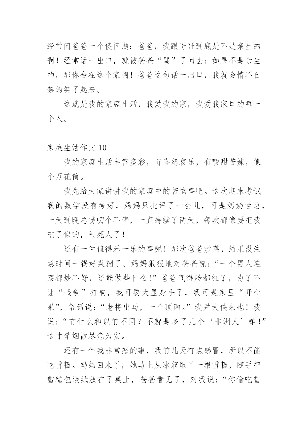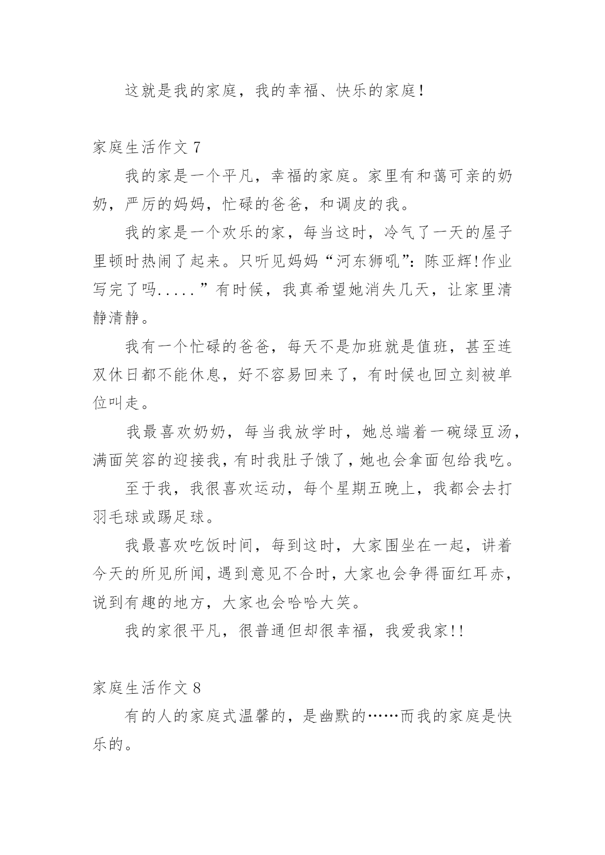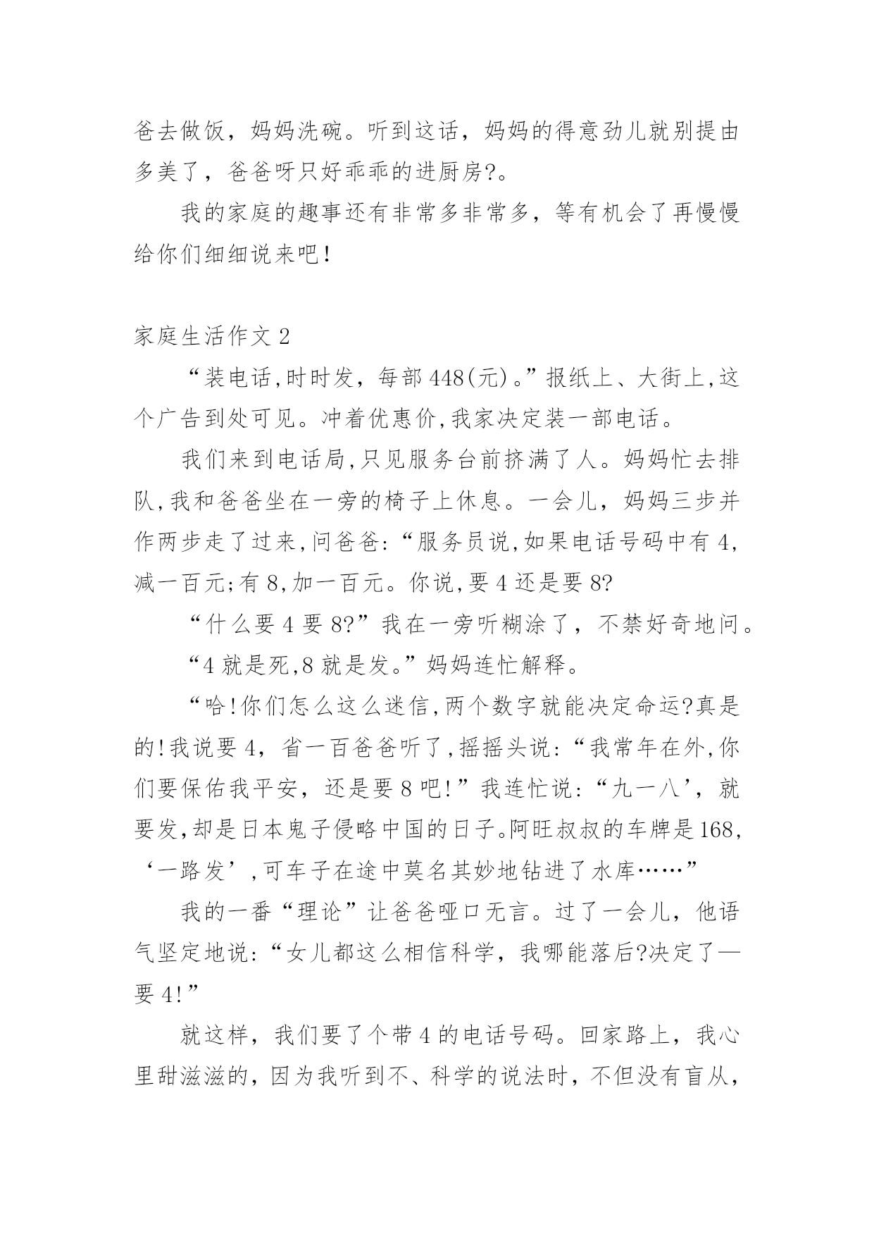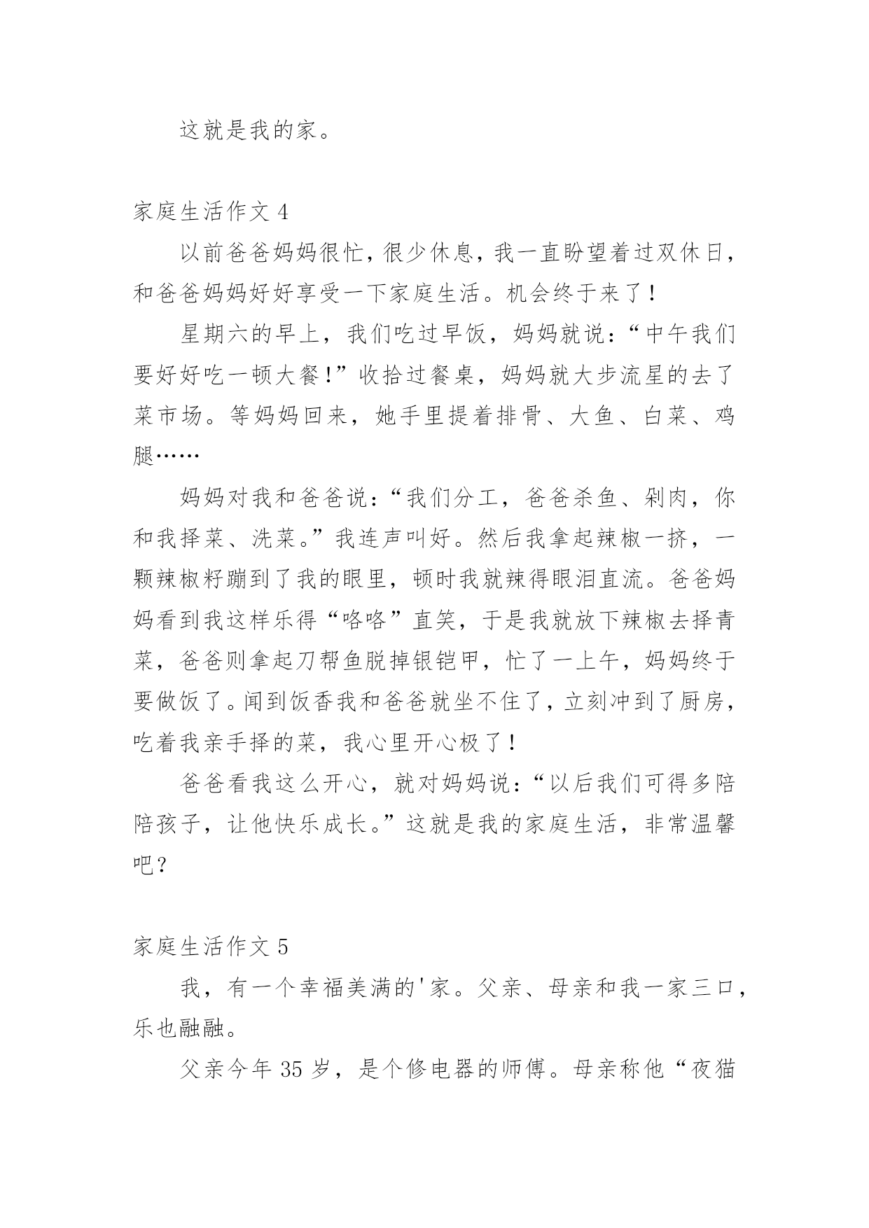 家庭生活作文【推荐】家庭生活作文在我们平凡的日常里,大家都有写作文的经历,对作文很是熟悉吧,借助作文可以提高我们的语言组织能力。怎么写作文才能避免踩雷呢?以下是小编为大家整理的家庭生活作文,欢迎阅读与收藏。家庭生活作文1在我的家庭生活中,有许须多多使人快乐的事情,这些事情仿佛是天空上的星星,每颗星都记着我家庭生活中的快乐、美好、温馨的瞬间,今天,我就摘那最耀眼的一颗星。我们家有一个规矩,谁先到家谁就先做饭,后回来的就洗完。一般都是妈妈先回家,爸爸后回家。可是,这一天爸爸与妈妈同一时间回来了。这汇麻烦就来了,到底谁去做饭了就成了”难题|了。于是引发了一场激烈的“家庭官司打战”,谁来当法官呢?当然是铁面无私、大公无私的鄙人——罗文?了。俗话说:“清官难断家务事。”判给谁,另一方都不会愿意。只好听听双方的叙述在说吧!首先,有原告妈妈来说:“法官大人,我看见被告回家时故意在楼道口站一会,拖延时间,分明是在逃避做饭。”“现在由被告为自己辨论。”“法官大人,我只是在看了一会书而已,难道也算在拖延时间吗?由没闲着。”听完两位的争论。我“宣判”最后结果。让爸爸去做饭,妈妈洗碗。听到这话,妈妈的得意劲儿就别提由多美了,爸爸呀只好乖乖的进厨房?。我的家庭的趣事还有非常多非常多,等有机会了再慢慢给你们细细说来吧!家庭生活作文2“装电话,时时发,每部448(元)。”报纸上、大街上,这个广告到处可见。冲着优惠价,我家决定装一部电话。我们来到电话局,只见服务台前挤满了人。妈妈忙去排队,我和爸爸坐在一旁的椅子上休息。一会儿,妈妈三步并作两步走了过来,问爸爸:“服务员说,如果电话号码中有4,减一百元;有8,加一百元。你说,要4还是要8?“什么要4要8?”我在一旁听糊涂了,不禁好奇地问。“4就是死,8就是发。”妈妈连忙解释。“哈!你们怎么这么迷信,两个数字就能决定命运?真是的!我说要4,省一百爸爸听了,摇摇头说:“我常年在外,你们要保佑我平安,还是要8吧!”我连忙说:“九一八’,就要发,却是日本鬼子侵略中国的日子。阿旺叔叔的车牌是168,‘一路发’,可车子在途中莫名其妙地钻进了水库……”我的一番“理论”让爸爸哑口无言。过了一会儿,他语气坚定地说:“女儿都这么相信科学,我哪能落后?决定了—要4!”就这样,我们要了个带4的电话号码。回家路上,我心里甜滋滋的,因为我听到不、科学的说法时,不但没有盲从,还用实例去剖析,最终帮爸爸消除了对“4”的疑虑。家庭生活作文3每个人都有家庭,我也不例外。我的这个家庭是温馨的,虽然有时候,还是会互相吵架,但是这种情况是很少的。我的妈妈对我很好,有时候还陪着我一起玩游戏呢!妈妈的语文不是很好,翘舌音和平舌音总分不清,引得我们都哈哈大笑。但是妈妈比我学得多,所以我又题不会的时候我就会问妈妈,妈妈总是能耐心的教我。每天中午还会陪我看电影。妈妈就像是我的姐姐。爸爸是一个大忙人,整天跑动跑西,过着早出晚归的生活。但是爸爸只要一有空就会陪我们玩,给我们做饭吃。如果时间非常充足,还会带我们吃好吃的。老哥呢,是一个超级自恋狂,不时的问我:“梓萌,看你老哥帅不帅?”瞧,他有来了!早上第一件事本应该互相打招呼,可是老哥一见到我就问我帅不帅,我都快要吐了!我的回答也只能是:“很帅”。我的老哥是狮子座,狮子座的缺点里就有一项“很自恋”。哎!我怎么会有这样一个老哥呢!老哥写作业时,总会开小差。他变魔术似的从旁边拿了一块镜子,开始整理头发。整理完,他总会问我他帅不帅。你说他自恋不自恋?而我啦,是一个粗心马虎蛋,考试的时候,我总是粗心的漏做题,而且还丢了好多分,亏死了。这就是我的家。家庭生活作文4以前爸爸妈妈很忙,很少休息,我一直盼望着过双休日,和爸爸妈妈好好享受一下家庭生活。机会终于来了!星期六的早上,我们吃过早饭,妈妈就说:“中午我们要好好吃一顿大餐!”收拾过餐桌,妈妈就大步流星的去了菜市场。等妈妈回来,她手里提着排骨、大鱼、白菜、鸡腿……妈妈对我和爸爸说:“我们分工,爸爸杀鱼、剁肉,你和我择菜、洗菜。”我连声叫好。然后我拿起辣椒一挤,一颗辣椒籽蹦到了我的眼里,顿时我就辣得眼泪直流。爸爸妈妈看到我这样乐得“咯咯”直笑,于是我就放下辣椒去择青菜,爸爸则拿起刀帮鱼脱掉银铠甲,忙了一上午,妈妈终于要做饭了。闻到饭香我和爸爸就坐不住了,立刻冲到了厨房,吃着我亲手择的菜,我心里开心极了!爸爸看我这么开心,就对妈妈说:“以后我们可得多陪陪孩子,让他快乐成长。”这就是我的家庭生活,非常温馨吧?家庭生活作文5我,有一个幸福美满的'家。父亲、母亲和我一家三口,乐也融融。父亲今年35岁,是个修电器的师傅。母亲称他“夜猫子”,白日懒洋洋地睡大觉,打雷也吵不醒。晚上,他就在铺子里修电器。因为要熬通宵,所以他的眼睛像“熊猫眼”。我经常笑他快变“国宝”,父亲不好意思地笑了。母亲“芳