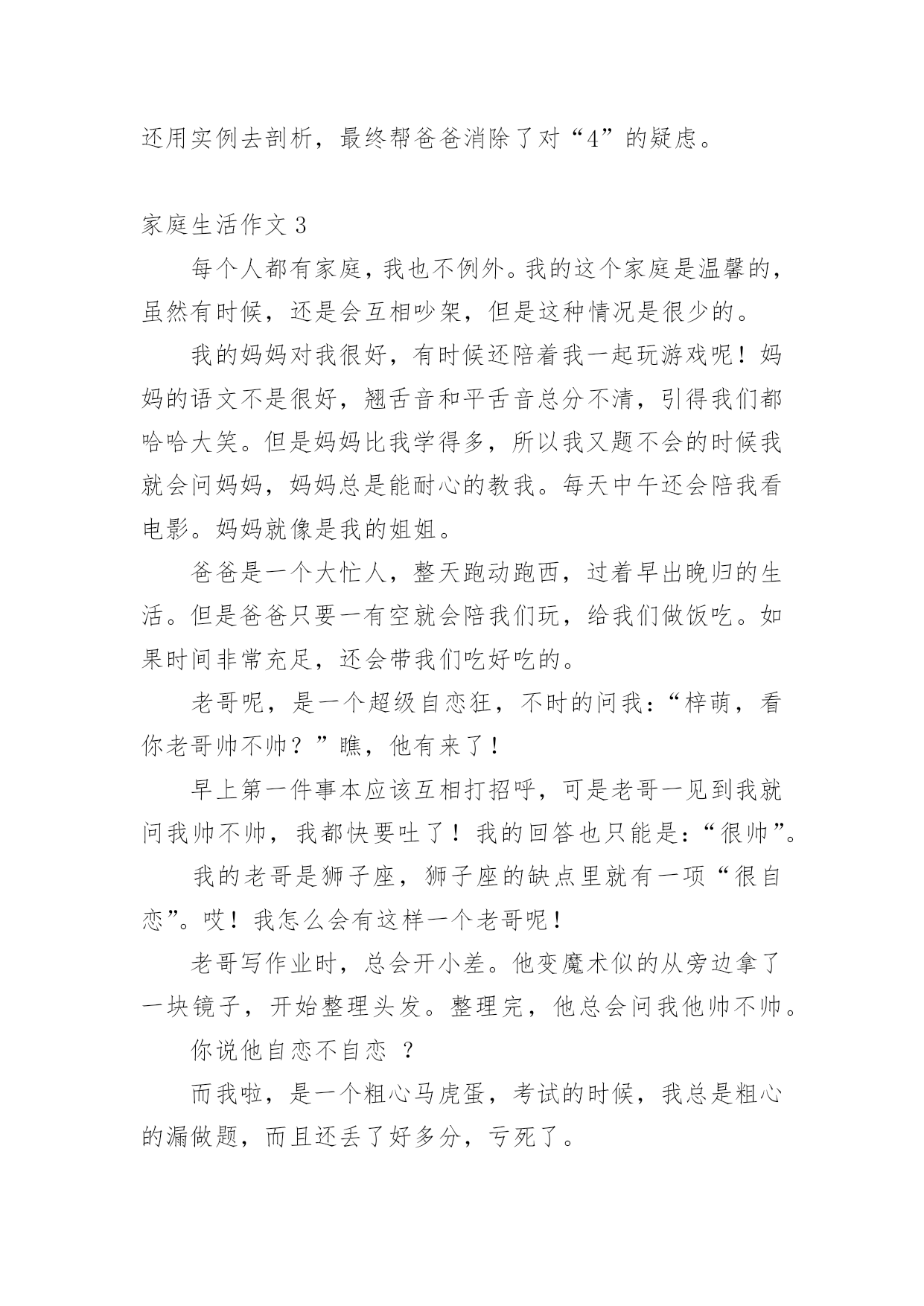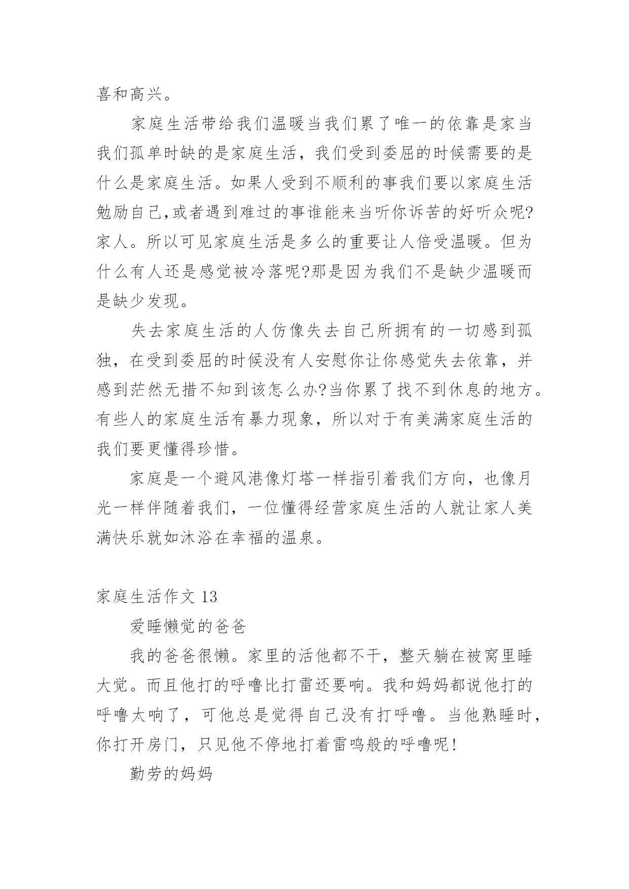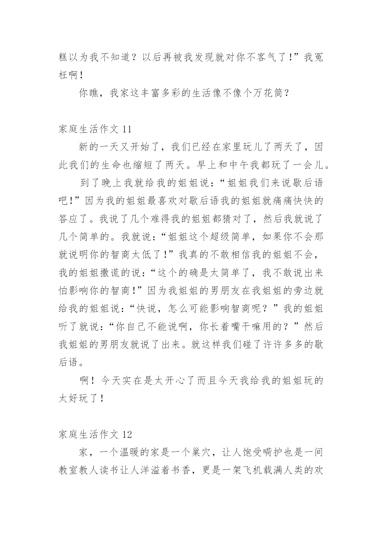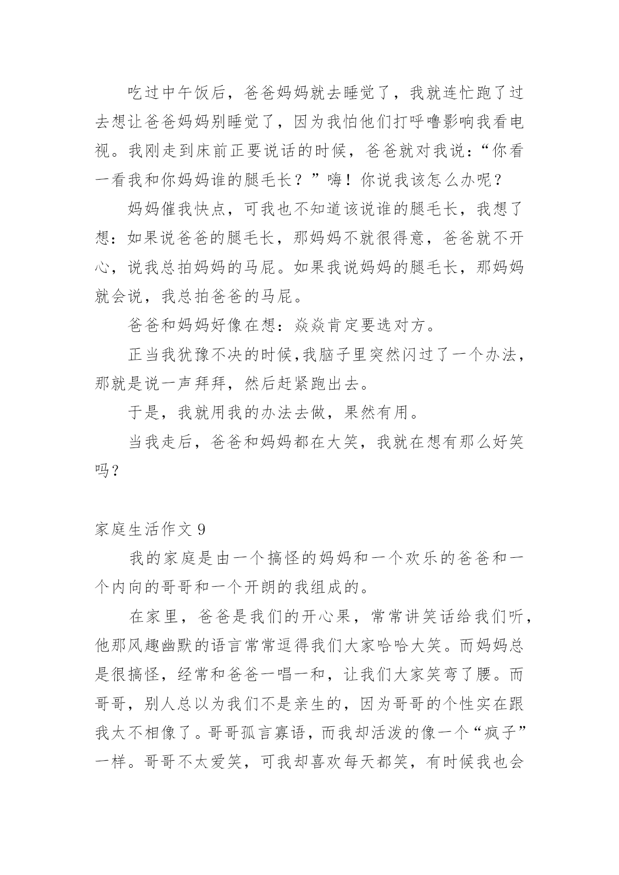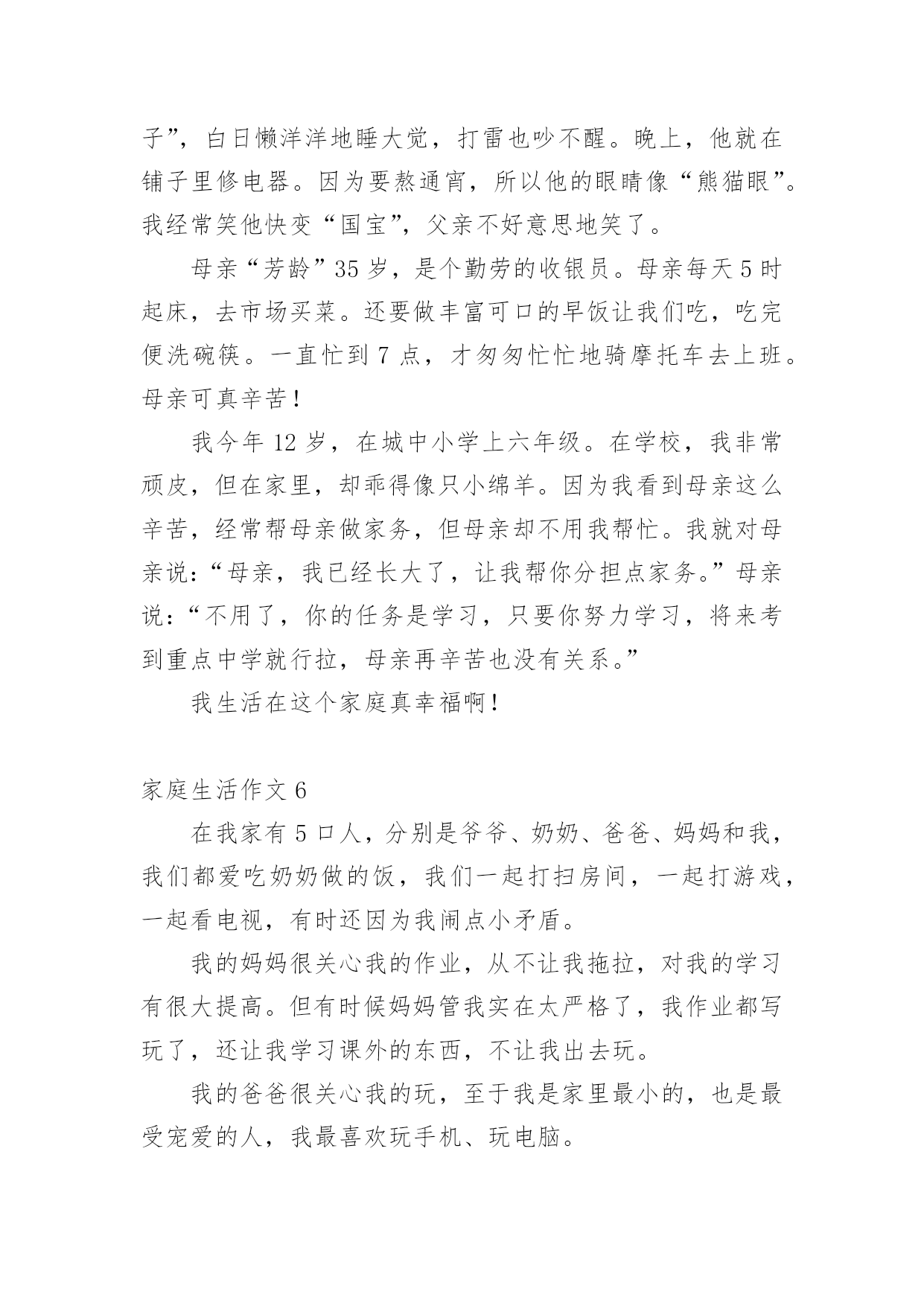 家庭生活作文【推荐】家庭生活作文在我们平凡的日常里,大家都有写作文的经历,对作文很是熟悉吧,借助作文可以提高我们的语言组织能力。怎么写作文才能避免踩雷呢?以下是小编为大家整理的家庭生活作文,欢迎阅读与收藏。家庭生活作文1在我的家庭生活中,有许须多多使人快乐的事情,这些事情仿佛是天空上的星星,每颗星都记着我家庭生活中的快乐、美好、温馨的瞬间,今天,我就摘那最耀眼的一颗星。我们家有一个规矩,谁先到家谁就先做饭,后回来的就洗完。一般都是妈妈先回家,爸爸后回家。可是,这一天爸爸与妈妈同一时间回来了。这汇麻烦就来了,到底谁去做饭了就成了”难题|了。于是引发了一场激烈的“家庭官司打战”,谁来当法官呢?当然是铁面无私、大公无私的鄙人——罗文?了。俗话说:“清官难断家务事。”判给谁,另一方都不会愿意。只好听听双方的叙述在说吧!首先,有原告妈妈来说:“法官大人,我看见被告回家时故意在楼道口站一会,拖延时间,分明是在逃避做饭。”“现在由被告为自己辨论。”“法官大人,我只是在看了一会书而已,难道也算在拖延时间吗?由没闲着。”听完两位的争论。我“宣判”最后结果。让爸爸去做饭,妈妈洗碗。听到这话,妈妈的得意劲儿就别提由多美了,爸爸呀只好乖乖的进厨房?。我的家庭的趣事还有非常多非常多,等有机会了再慢慢给你们细细说来吧!家庭生活作文2“装电话,时时发,每部448(元)。”报纸上、大街上,这个广告到处可见。冲着优惠价,我家决定装一部电话。我们来到电话局,只见服务台前挤满了人。妈妈忙去排队,我和爸爸坐在一旁的椅子上休息。一会儿,妈妈三步并作两步走了过来,问爸爸:“服务员说,如果电话号码中有4,减一百元;有8,加一百元。你说,要4还是要8?“什么要4要8?”我在一旁听糊涂了,不禁好奇地问。“4就是死,8就是发。”妈妈连忙解释。“哈!你们怎么这么迷信,两个数字就能决定命运?真是的!我说要4,省一百爸爸听了,摇摇头说:“我常年在外,你们要保佑我平安,还是要8吧!”我连忙说:“九一八’,就要发,却是日本鬼子侵略中国的日子。阿旺叔叔的车牌是168,‘一路发’,可车子在途中莫名其妙地钻进了水库……”我的一番“理论”让爸爸哑口无言。过了一会儿,他语气坚定地说:“女儿都这么相信科学,我哪能落后?决定了—要4!”就这样,我们要了个带4的电话号码。回家路上,我心里甜滋滋的,因为我听到不、科学的说法时,不但没有盲从,还用实例去剖析,最终帮爸爸消除了对“4”的疑虑。家庭生活作文3每个人都有家庭,我也不例外。我的这个家庭是温馨的,虽然有时候,还是会互相吵架,但是这种情况是很少的。我的妈妈对我很好,有时候还陪着我一起玩游戏呢!妈妈的语文不是很好,翘舌音和平舌音总分不清,引得我们都哈哈大笑。但是妈妈比我学得多,所以我又题不会的时候我就会问妈妈,妈妈总是能耐心的教我。每天中午还会陪我看电影。妈妈就像是我的姐姐。爸爸是一个大忙人,整天跑动跑西,过着早出晚归的生活。但是爸爸只要一有空就会陪我们玩,给我们做饭吃。如果时间非常充足,还会带我们吃好吃的。老哥呢,是一个超级自恋狂,不时的问我:“梓萌,看你老哥帅不帅?”瞧,他有来了!早上第一件事本应该互相打招呼,可是老哥一见到我就问我帅不帅,我都快要吐了!我的回答也只能是:“很帅”。我的老哥是狮子座,狮子座的缺点里就有一项“很自恋”。哎!我怎么会有这样一个老哥呢!老哥写作业时,总会开小差。他变魔术似的从旁边拿了一块镜子,开始整理头发。整理完,他总会问我他帅不帅。你说他自恋不自恋?而我啦,是一个粗心马虎蛋,考试的时候,我总是粗心的漏做题,而且还丢了好多分,亏死了。这就是我的家。家庭生活作文4以前爸爸妈妈很忙,很少休息,我一直盼望着过双休日,和爸爸妈妈好好享受一下家庭生活。机会终于来了!星期六的早上,我们吃过早饭,妈妈就说:“中午我们要好好吃一顿大餐!”收拾过餐桌,妈妈就大步流星的去了菜市场。等妈妈回来,她手里提着排骨、大鱼、白菜、鸡腿……妈妈对我和爸爸说:“我们分工,爸爸杀鱼、剁肉,你和我择菜、洗菜。”我连声叫好。然后我拿起辣椒一挤,一颗辣椒籽蹦到了我的眼里,顿时我就辣得眼泪直流。爸爸妈妈看到我这样乐得“咯咯”直笑,于是我就放下辣椒去择青菜,爸爸则拿起刀帮鱼脱掉银铠甲,忙了一上午,妈妈终于要做饭了。闻到饭香我和爸爸就坐不住了,立刻冲到了厨房,吃着我亲手择的菜,我心里开心极了!爸爸看我这么开心,就对妈妈说:“以后我们可得多陪陪孩子,让他快乐成长。”这就是我的家庭生活,非常温馨吧?家庭生活作文5我,有一个幸福美满的'家。父亲、母亲和我一家三口,乐也融融。父亲今年35岁,是个修电器的师傅。母亲称他“夜猫子”,白日懒洋洋地睡大觉,打雷也吵不醒。晚上,他就在铺子里修电器。因为要熬通宵,所以他的眼睛像“熊猫眼”。我经常笑他快变“国宝”,父亲不好意思地笑了。母亲“芳