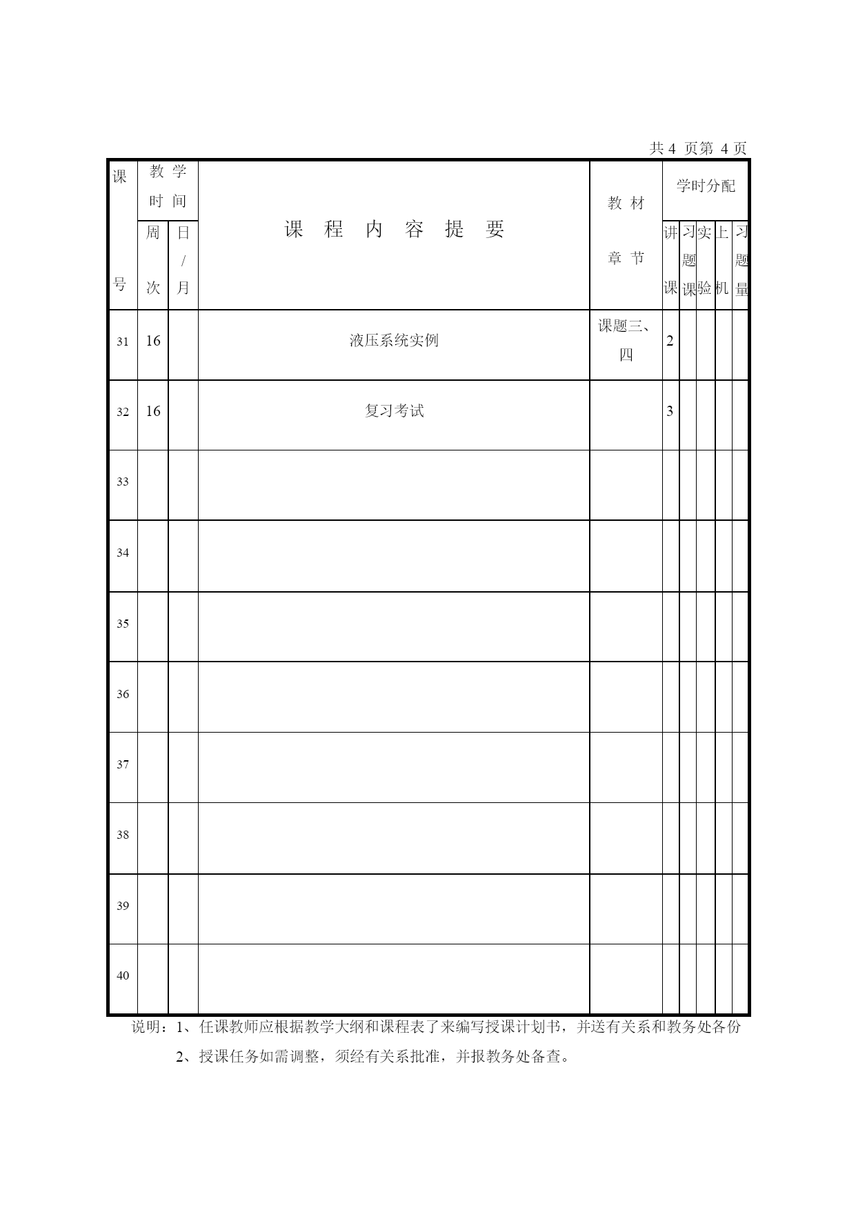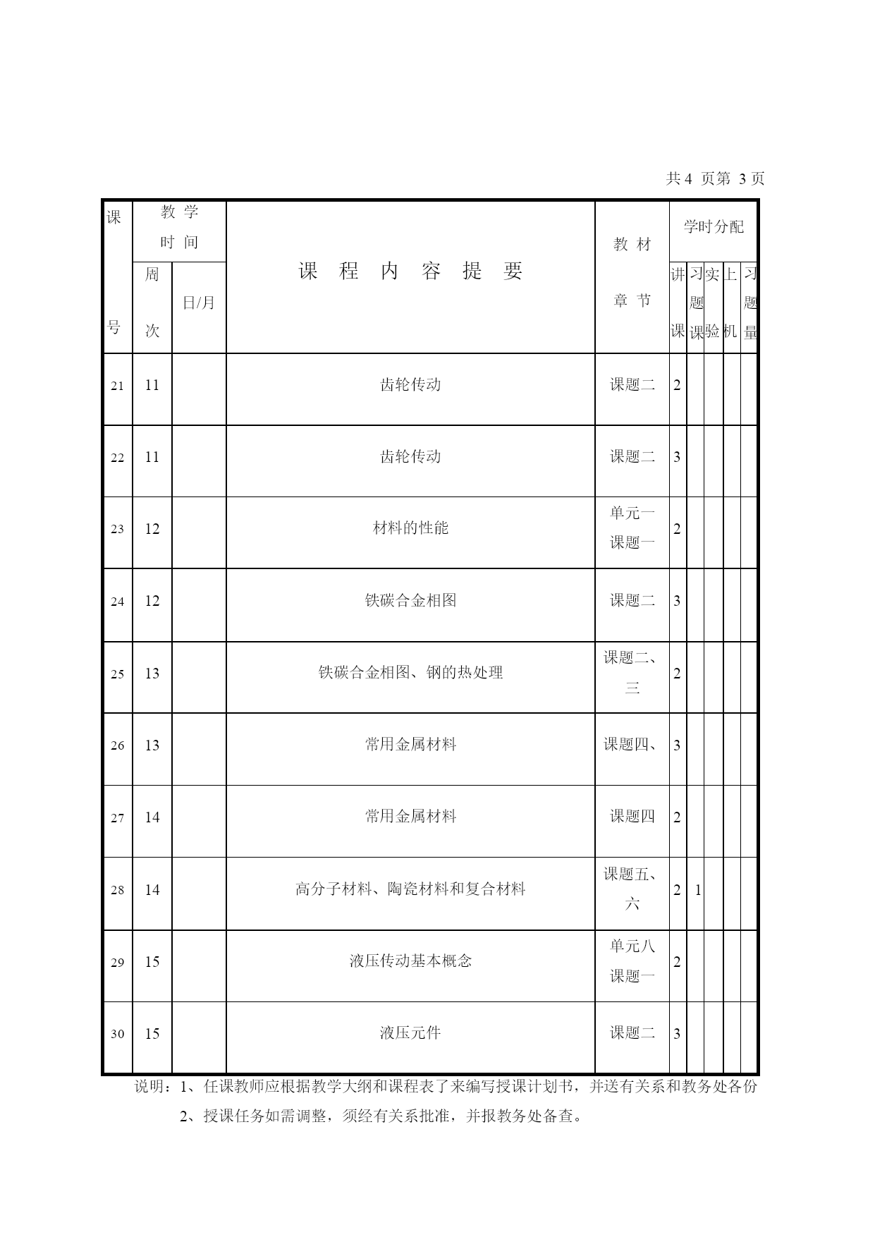 课号教学时间课程内容提要教材章节学时分配周次日/月讲课习题课实验上机习题量11绪论、静力分析基础一单元三课题一221静力分析基础二、三课题一332静力分析基础四课题一242平面力系一课题二2153平面力系二、三课题二263旋转构件的动力分析课题二2174轴向拉伸和压缩单元四课题一284轴向拉伸和压缩课题一395梁的弯曲课题二2105梁的弯曲课题二3说明:1、任课教师应根据教学大纲和课程表了来编写授课计划书,并送有关系和教务处各份2、授课任务如需调整,须经有关系批准,并报教务处备查。课号教学时间课程内容提要教材章节学时分配周次日/月讲课习题课实验上机习题量116圆轴扭转课题三2126轴系零部件轴单元五课题一3137轴承课题一、二2147轴承课题二3158常用机构平面连杆机构单元六、课题一2168平面连杆机构课题二3179平面连杆机构课题二2189凸轮机构课题三211910带传动和链传动单元七课题一22010齿轮传动课题二3说明:1、任课教师应根据教学大纲和课程表了来编写授课计划书,并送有关系和教务处各份2、授课任务如需调整,须经有关系批准,并报教务处备查。课号教学时间课程内容提要教材章节学时分配周次日/月讲课习题课实验上机习题量2111齿轮传动课题二22211齿轮传动课题二32312材料的性能单元一课题一22412铁碳合金相图课题二32513铁碳合金相图、钢的热处理课题二、三22613常用金属材料课题四、32714常用金属材料课题四22814高分子材料、陶瓷材料和复合材料课题五、六212915液压传动基本概念单元八课题一23015液压元件课题二3说明:1、任课教师应根据教学大纲和课程表了来编写授课计划书,并送有关系和教务处各份2、授课任务如需调整,须经有关系批准,并报教务处备查。课号教学时间课程内容提要教材章节学时分配周次日/月讲课习题课实验上机习题量3116液压系统实例课题三、四23216复习考试33334353637383940说明:1、任课教师应根据教学大纲和课程表了来编写授课计划书,并送有关系和教务处各份2、授课任务如需调整,须经有关系批准,并报教务处备查。