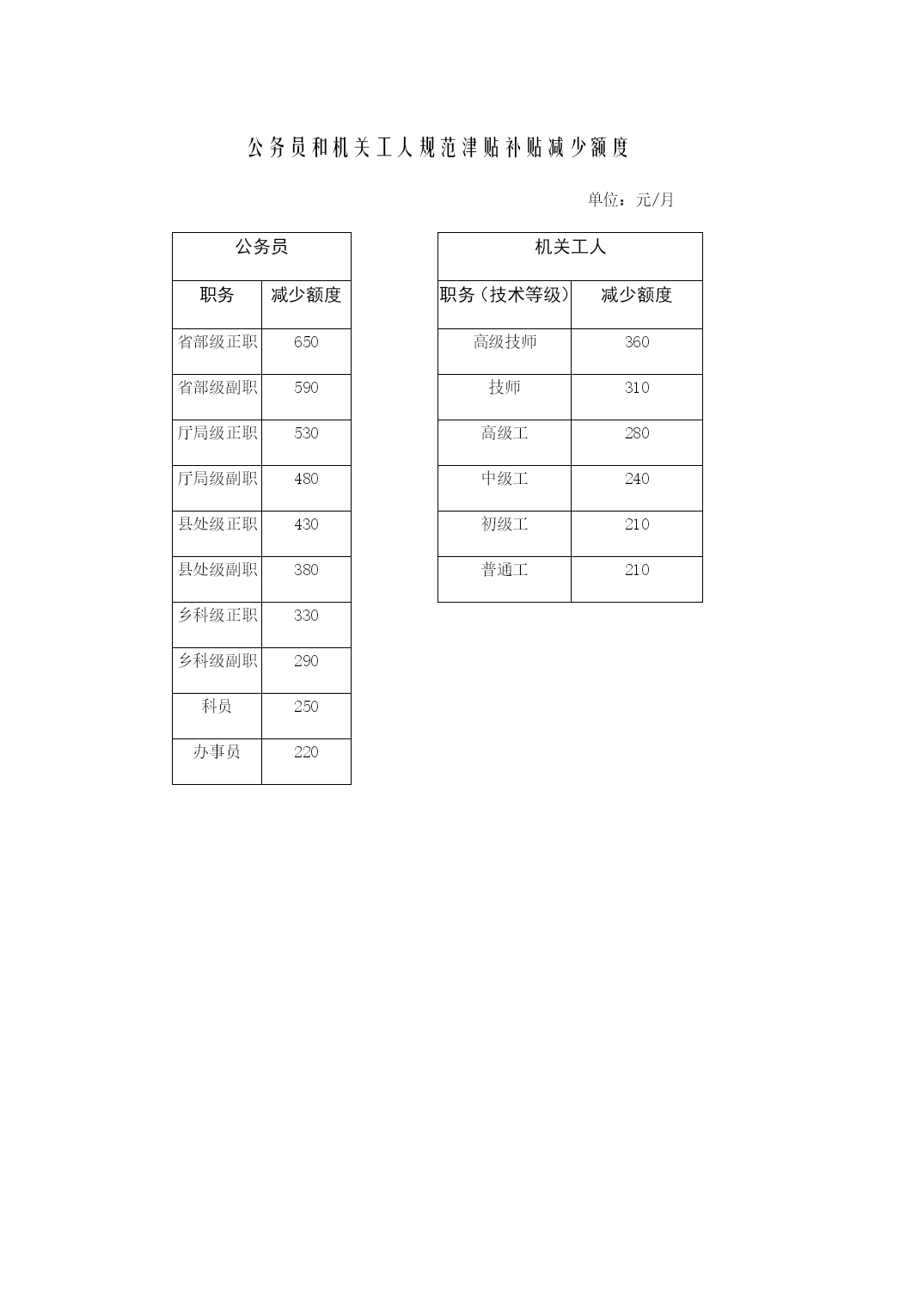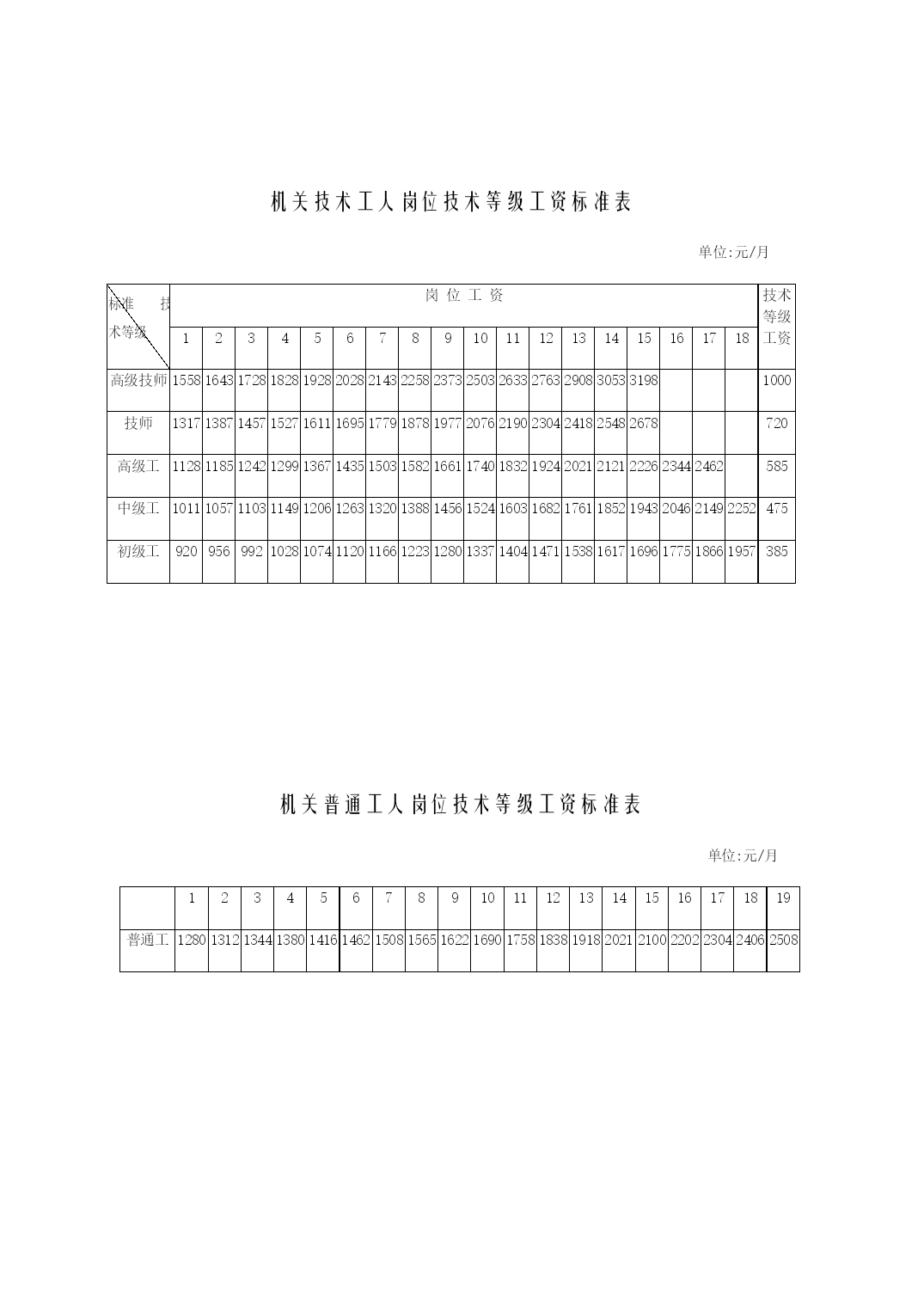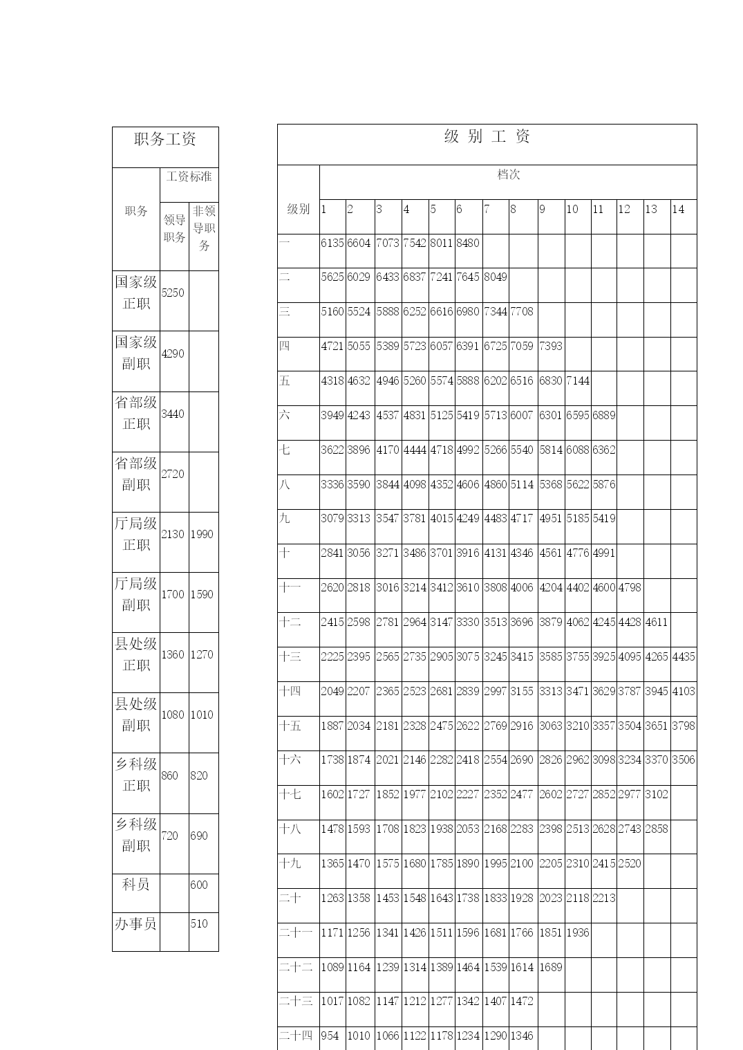 年公务员职务级别工资标准表优质资料(可以直接使用,可编辑优质资料,欢迎下载)公务员职务级别工资标准表单位:元/月职务工资职务工资标准领导职务非领导职务国家级正职5250国家级副职4290省部级正职3440省部级副职2720厅局级正职21301990厅局级副职17001590县处级正职13601270县处级副职10801010乡科级正职860820乡科级副职720690科员600办事员510级别工资级别档次1234567891011121314一613566047073754280118480二5625602964336837724176458049三51605524588862526616698073447708四472150555389572360576391672570597393五4318463249465260557458886202651668307144六39494243453748315125541957136007630165956889七36223896417044444718499252665540581460886362八33363590384440984352460648605114536856225876九30793313354737814015424944834717495151855419十28413056327134863701391641314346456147764991十一262028183016321434123610380840064204440246004798十二2415259827812964314733303513369638794062424544284611十三22252395256527352905307532453415358537553925409542654435十四20492207236525232681283929973155331334713629378739454103十五18872034218123282475262227692916306332103357350436513798十六17381874202121462282241825542690282629623098323433703506十七1602172718521977210222272352247726022727285229773102十八1478159317081823193820532168228323982513262827432858十九136514701575168017851890199521002205231024152520二十12631358145315481643173818331928202321182213二十一1171125613411426151115961681176618511936二十二108911641239131413891464153916141689二十三10171082114712121277134214071472二十四9541010106611221178123412901346二十五8999479951043109111391187二十六85189393597710191061二十七810846882918954990机关技术工人岗位技术等级工资标准表单位:元/月标准技术等级岗位工资技术等级工资123456789101112131415161718高级技师1558164317281828192820282143225823732503263327632908305331981000技师131713871457152716111695177918781977207621902304241825482678720高级工11281185124212991367143515031582166117401832192420212121222623442462585中级工101110571103114912061263132013881456152416031682176118521943204621492252475初级工920956992102810741120116612231280133714041471153816171696177518661957385机关普通工人岗位技术等级工资标准表单位:元/月12345678910111213141516171819普通工1280131213441380141614621508156516221690175818381918202121002202230424062508公务员和机关工人规范津贴补贴减少额度单位:元/月公务员机关工人职务减少额度职务(技术等